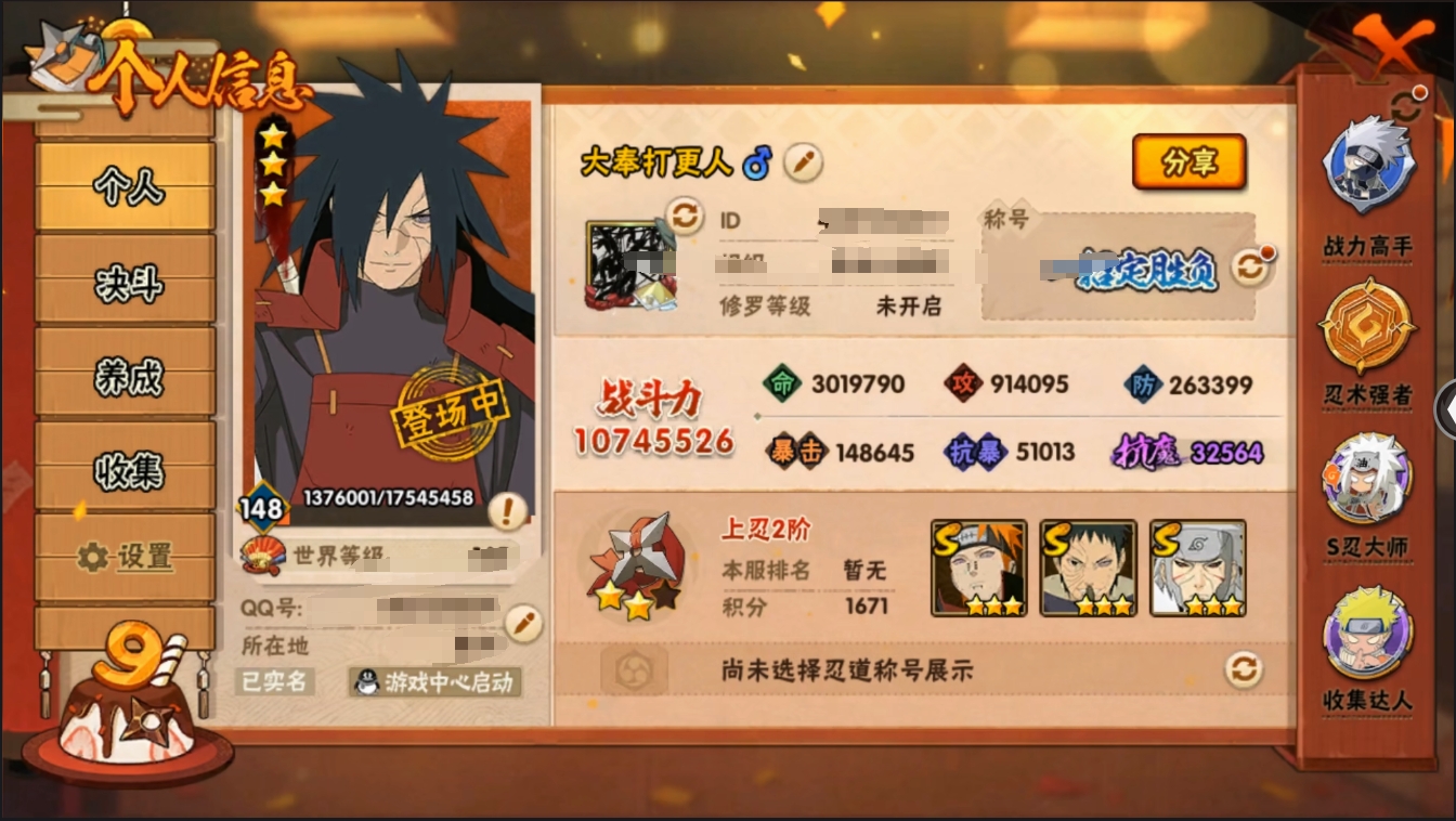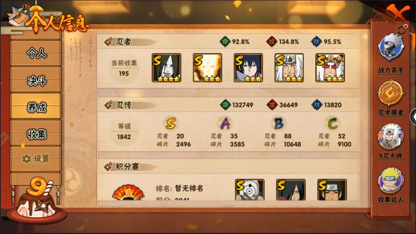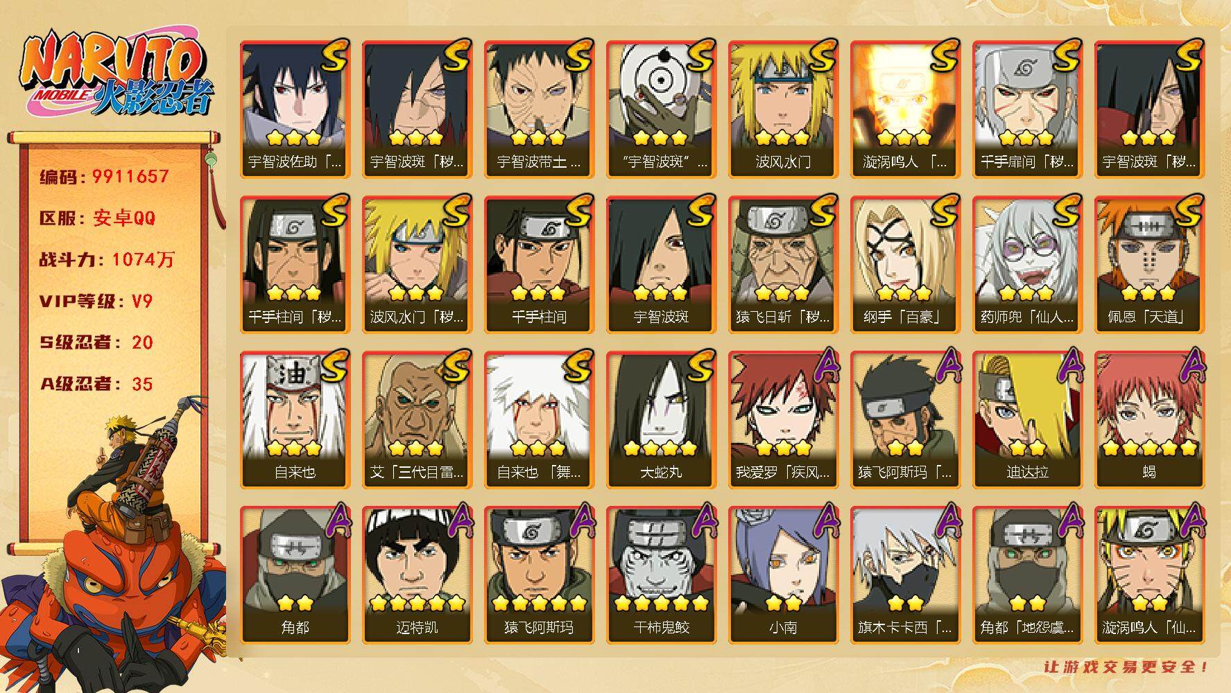 [14064355]【编号51679可秒换绑】【店长推荐捡漏号】20s级忍者数-35a级忍者数 【s级忍者】:猿飞日斩「秽土转生」3星,波风水门「秽土转生」3星,千手扉间「秽土转生」3星,千手柱间「秽土转生」3星,宇智波斑「秽土转生」3星,宇智波斑「秽土转生·解」3星,宇智波带土「忍界大战」3星,艾「三代目雷影」3星,自来也3星,自来也「舞之豪杰」3星,大蛇丸4星,纲手「百豪」3星,千手柱间3星,宇智波斑3星,波风水门3星,药师兜「仙人模式」3星,漩涡鸣人「九喇嘛连结」3星,佩恩「天道」3星,宇智波佐助「永恒万花筒」3星,宇智波斑 「白面具」3星宇智波斑「白面具」 【a级忍者】:艾「青年」2星,长门「青年」2星,波风水门「青年」2星,达鲁伊「博人传」2星,迪达拉2星,迪达拉「秽土转生」2星,大蛇丸「晓」2星,奇拉比「忍界大战」2星,飞段4星,飞段「死司凭血」3星,干柿鬼鲛5星,漩涡博人「桃式显现」2星,漩涡鸣人「仙人模式」2星,漩涡鸣人「九尾查克拉」2星,迈特凯5星,旗木卡卡西「万花筒写轮眼」2星,我爱罗「疾风传」3星,我爱罗「忍界大战」2星,蝎5星,小南2星,角都2星,角都「地怨虞」2星,猿飞阿斯玛5星,猿飞阿斯玛「秽土转生」2星,宇智波鼬2星,宇智波佐助「须佐能乎」2星,宇智波佐助「万花筒写轮眼」2星,药师兜「半蛇斗篷」2星,照美冥「五代目水影」2星,日向宁次「忍界大战」2星,猿飞木叶丸「博人传」2星,黑土「博人传」2星,秋道丁次「忍界大战」2星,千代「近松十人卫」2星,不缘2星