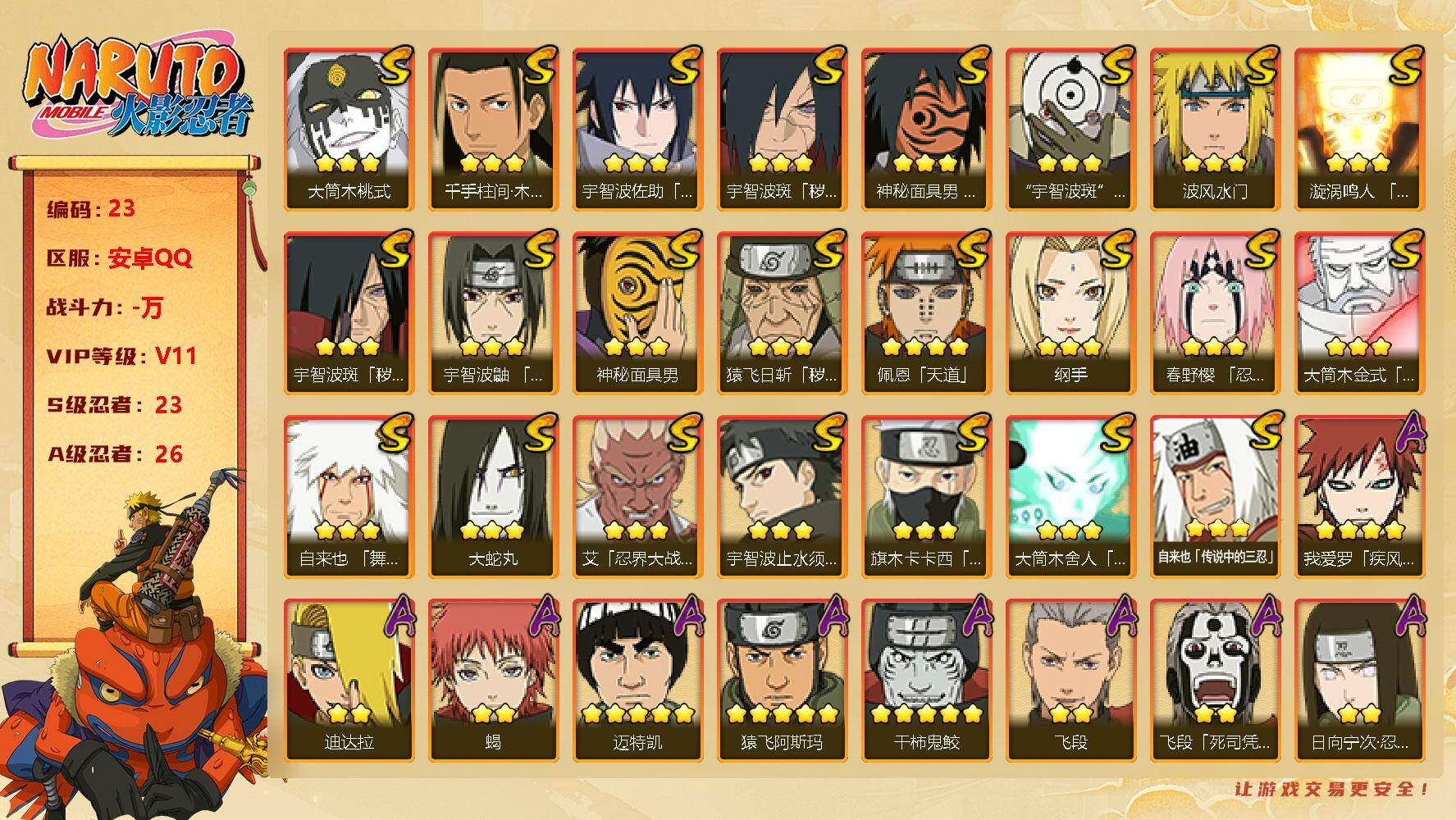 [14104258]【编号67325 可秒换绑】店长推荐特价处理精品号23s级忍者数-26a级忍者数 【s级忍者】:猿飞日斩「秽土转生」3星,宇智波斑「秽土转生」3星,宇智波斑「秽土转生·解」3星,春野樱「忍界大战」3星,艾「忍界大战」3星,宇智波鼬「须佐能乎」3星,宇智波止水「须佐能乎」3星,旗木卡卡西「须佐能乎」3星,千手柱间「木叶创立」3星,自来也「舞之豪杰」3星,大蛇丸3星,自来也「传说中的三忍」3星,纲手3星,波风水门3星,神秘面具男3星,神秘面具男「红夜之刃」3星,漩涡鸣人「九喇嘛连结」3星,佩恩「天道」4星,宇智波佐助「永恒万花筒」3星,宇智波斑 「白面具」3星宇智波斑「白面具」,大筒木金式3星,大筒木桃式3星,大筒木舍人「最终章」3星 【a级忍者】:艾「青年」2星,长门「青年」2星,迪达拉2星,飞段2星,飞段「死司凭血」2星,干柿鬼鲛5星,漩涡博人「桃式显现」2星,漩涡鸣人「九尾查克拉」2星,迈特凯5星,我爱罗「疾风传」4星,蝎2星,蝎「绯流琥」2星,角都「秽土转生」2星,猿飞阿斯玛5星,宇智波鼬2星,照美冥「五代目水影」2星,日向宁次「忍界大战」2星,日向雏田「最终章」2星,长十郎「六代目水影」2星,佩恩·六道「漂泊浪客」2星,李洛克「忍界大战」2星,黑土「博人传」2星,千手扉间「漂泊武士」2星,秋道丁次「忍界大战」2星,千代「近松十人卫」2星,宇智波泉奈2星