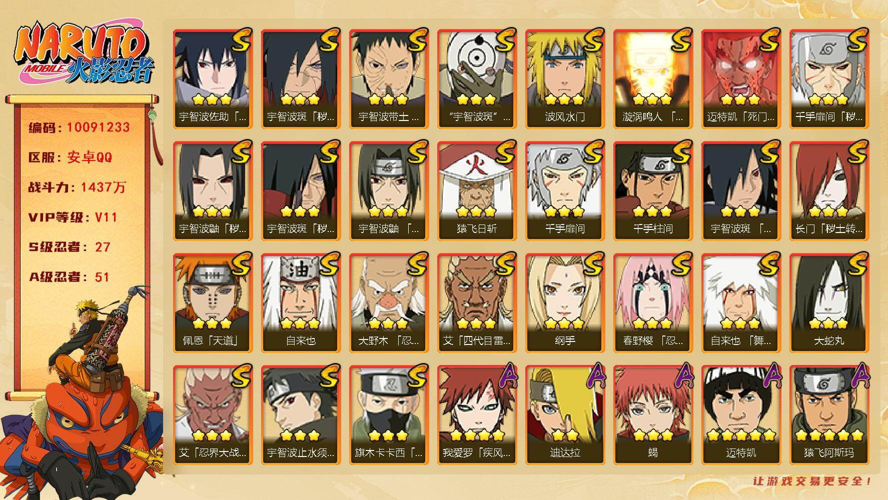 [14104867]【编号05775可秒换绑】【店长推荐捡漏号!】27s级忍者数-51a级忍者数 【s级忍者】:长门「秽土转生」3星,千手扉间「秽土转生」3星,宇智波鼬「秽土转生」3星,宇智波斑「秽土转生」3星,宇智波斑「秽土转生·解」3星,大野木「忍界大战」3星,春野樱「忍界大战」3星,宇智波带土「忍界大战」3星,艾「忍界大战」3星,宇智波鼬「须佐能乎」3星,宇智波止水「须佐能乎」3星,旗木卡卡西「须佐能乎」3星,宇智波斑「木叶创立」3星,艾「四代目雷影」3星,自来也3星,自来也「舞之豪杰」3星,大蛇丸3星,纲手3星,千手柱间3星,千手扉间3星,猿飞日斩3星,波风水门3星,漩涡鸣人「九喇嘛连结」3星,迈特凯「死门」3星,佩恩「天道」3星,宇智波佐助「永恒万花筒」3星,宇智波斑 「白面具」3星宇智波斑「白面具」 【a级忍者】:艾「青年」2星,长门「青年」2星,波风水门「青年」2星,达鲁伊「博人传」2星,迪达拉2星,迪达拉「秽土转生」2星,奇拉比2星,奇拉比「忍界大战」2星,飞段3星,飞段「死司凭血」3星,干柿鬼鲛5星,漩涡博人「桃式显现」2星,漩涡鸣人「仙人模式」2星,漩涡鸣人「九尾查克拉」2星,迈特凯5星,旗木卡卡西「万花筒写轮眼」2星,我爱罗「疾风传」4星,蝎3星,蝎「绯流琥」2星,小南2星,小南「新春限定」2星,小南「夏日泳装」2星,角都「地怨虞」2星,角都「晓创生」2星,角都「秽土转生」2星,猿飞阿斯玛5星,宇智波止水2星,宇智波止水「新春限定」2星,宇智波鼬2星,宇智波鼬「夏日限定」2星,宇智波佐助「须佐能乎」2星,药师兜「半蛇斗篷」2星,照美冥「五代目水影」2星,日向宁次「忍界大战」2星,日向雏田「最终章」2星,长十郎「六代目水影」2星,纲手「侠隐江湖」2星,神秘面具男「忍者之路」2星,佩恩·六道「漂泊浪客」2星,李洛克「忍界大战」2星,猿飞木叶丸「博人传」2星,黑土「博人传」2星,春野樱「百豪」2星,秋道丁次「忍界大战」2星,千代「近松十人卫」2星,不缘2星,不风2星,加藤断2
