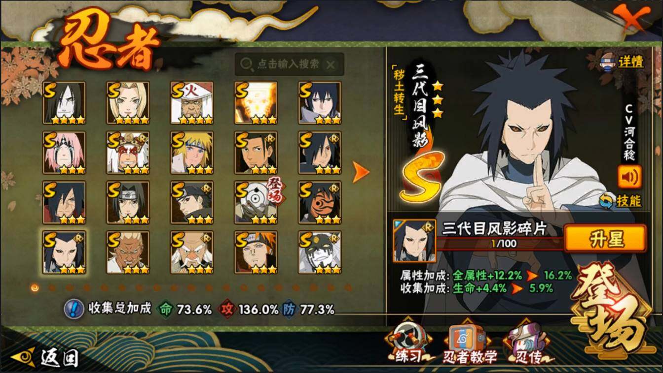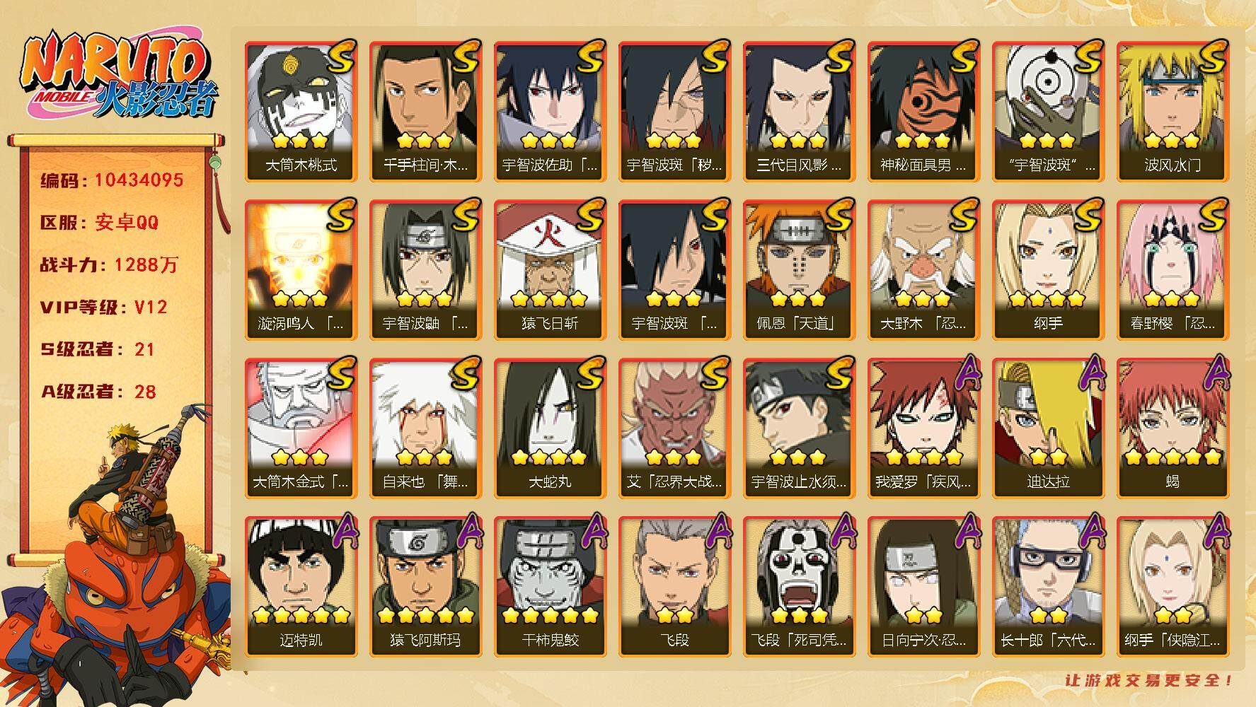 [14105600]【编号01984 可秒换绑】店长推荐特价处理精品号21s级忍者数-28a级忍者数 【s级忍者】:三代目风影「秽土转生」3星,宇智波斑「秽土转生·解」3星,大野木「忍界大战」3星,春野樱「忍界大战」3星,艾「忍界大战」3星,宇智波鼬「须佐能乎」3星,宇智波止水「须佐能乎」3星,宇智波斑「木叶创立」3星,千手柱间「木叶创立」3星,自来也「舞之豪杰」3星,大蛇丸4星,纲手4星,猿飞日斩4星,波风水门3星,神秘面具男「红夜之刃」3星,漩涡鸣人「九喇嘛连结」3星,佩恩「天道」3星,宇智波佐助「永恒万花筒」3星,宇智波斑 「白面具」3星宇智波斑「白面具」,大筒木金式3星,大筒木桃式3星 【a级忍者】:艾「青年」2星,长门「青年」2星,波风水门「青年」2星,迪达拉2星,飞段2星,飞段「死司凭血」3星,飞段「恶灵之影」2星,干柿鬼鲛5星,漩涡博人「桃式显现」2星,迈特凯5星,我爱罗「疾风传」4星,蝎5星,小南「新春限定」2星,猿飞阿斯玛5星,宇智波鼬2星,宇智波佐助「须佐能乎」2星,照美冥「侠隐江湖」2星,照美冥「五代目水影」2星,日向宁次「忍界大战」2星,日向雏田「最终章」2星,长十郎「六代目水影」2星,纲手「侠隐江湖」2星,神秘面具男「忍者之路」2星,佩恩·六道「漂泊浪客」2星,李洛克「忍界大战」2星,黑土「博人传」2星,秋道丁次「忍界大战」2星,千代「近松十人卫」2星