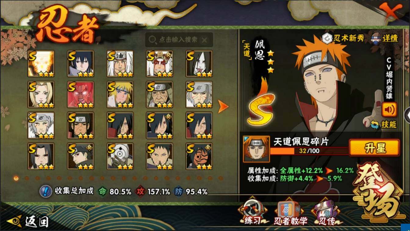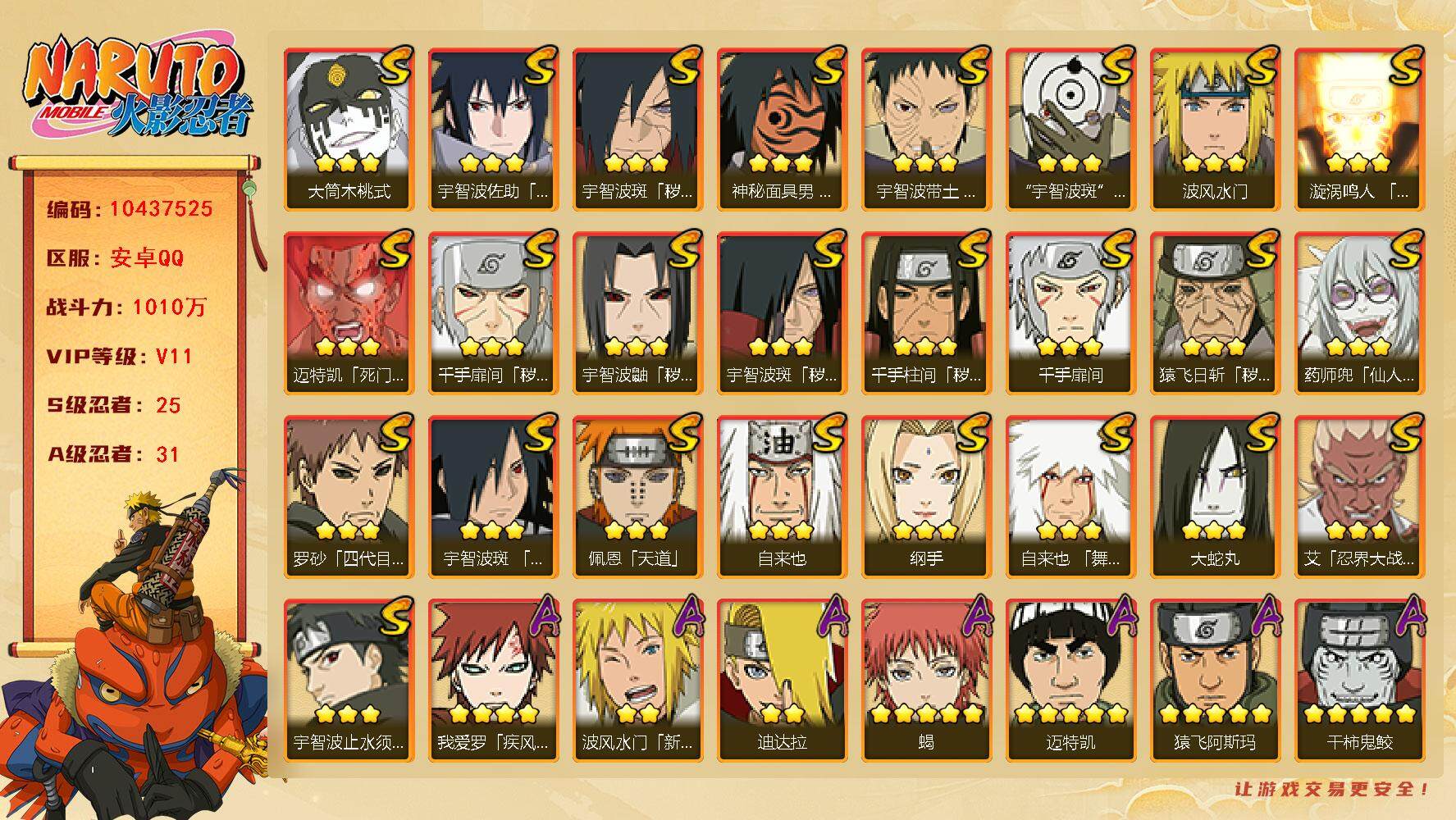 [14105735]【编号06368】25s级忍者数-31a级忍者数 【s级忍者】:猿飞日斩「秽土转生」3星,千手扉间「秽土转生」3星,千手柱间「秽土转生」3星,宇智波鼬「秽土转生」3星,宇智波斑「秽土转生」3星,宇智波斑「秽土转生·解」3星,宇智波带土「忍界大战」3星,艾「忍界大战」3星,宇智波止水「须佐能乎」3星,宇智波斑「木叶创立」3星,罗砂「四代目风影」3星,自来也3星,自来也「舞之豪杰」3星,大蛇丸3星,纲手3星,千手扉间3星,波风水门3星,药师兜「仙人模式」3星,神秘面具男「红夜之刃」3星,漩涡鸣人「九喇嘛连结」3星,迈特凯「死门」3星,佩恩「天道」3星,宇智波佐助「永恒万花筒」3星,宇智波斑 「白面具」3星宇智波斑「白面具」,大筒木桃式3星 【a级忍者】:艾「青年」2星,长门「青年」2星,波风水门「青年」2星,波风水门「新春限定」2星,达鲁伊「博人传」2星,迪达拉2星,迪达拉「秽土转生」2星,大蛇丸「晓」2星,奇拉比2星,奇拉比「忍界大战」2星,飞段3星,飞段「死司凭血」2星,干柿鬼鲛5星,漩涡博人「桃式显现」2星,漩涡鸣人「九尾查克拉」2星,迈特凯5星,旗木卡卡西「万花筒写轮眼」2星,我爱罗「疾风传」4星,蝎5星,猿飞阿斯玛5星,宇智波鼬3星,宇智波佐助「须佐能乎」2星,宇智波佐助「万花筒写轮眼」2星,照美冥「五代目水影」2星,日向宁次「忍界大战」2星,日向雏田「最终章」2星,长十郎「六代目水影」2星,李洛克「忍界大战」2星,黑土「博人传」2星,千手扉间「漂泊武士」2星,不缘2星