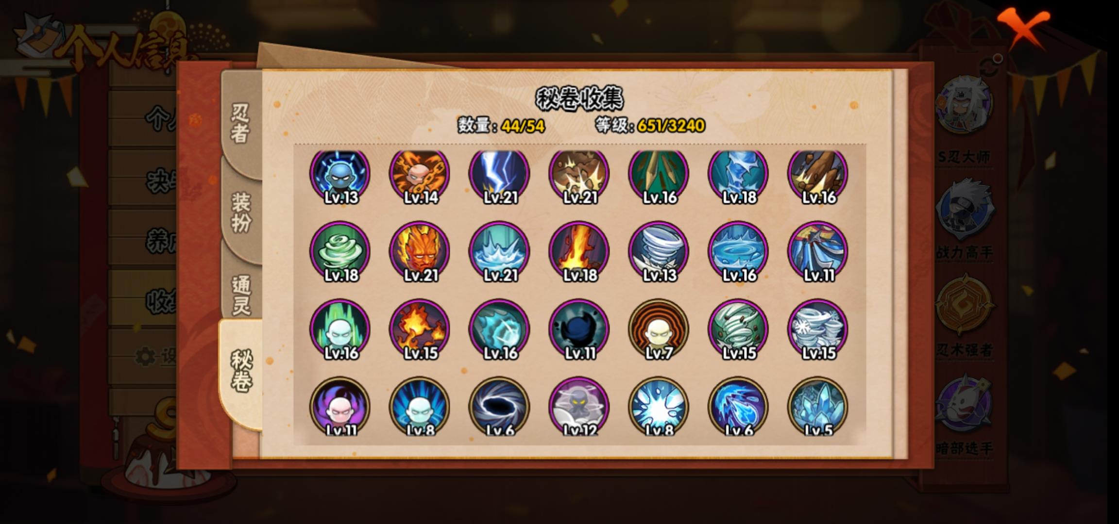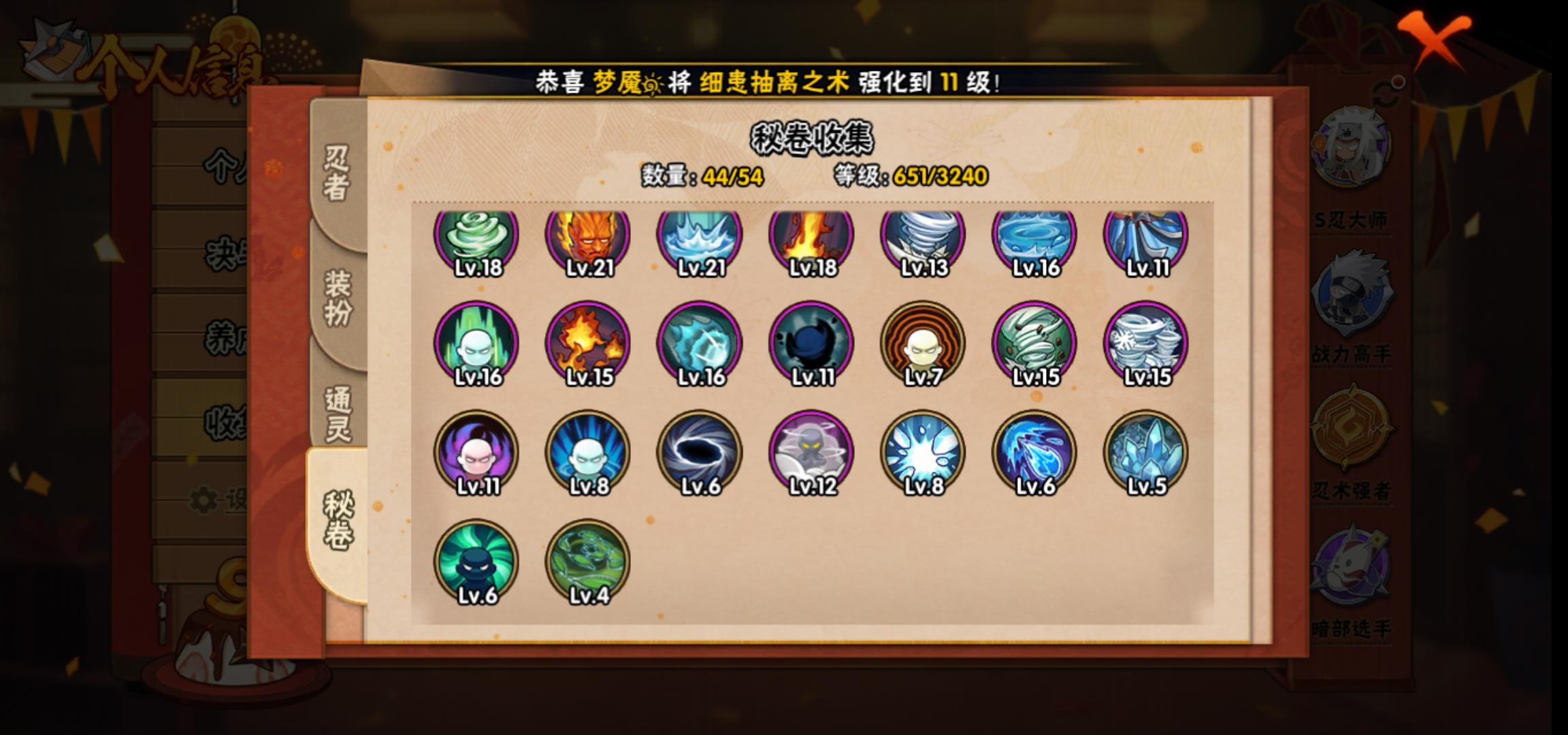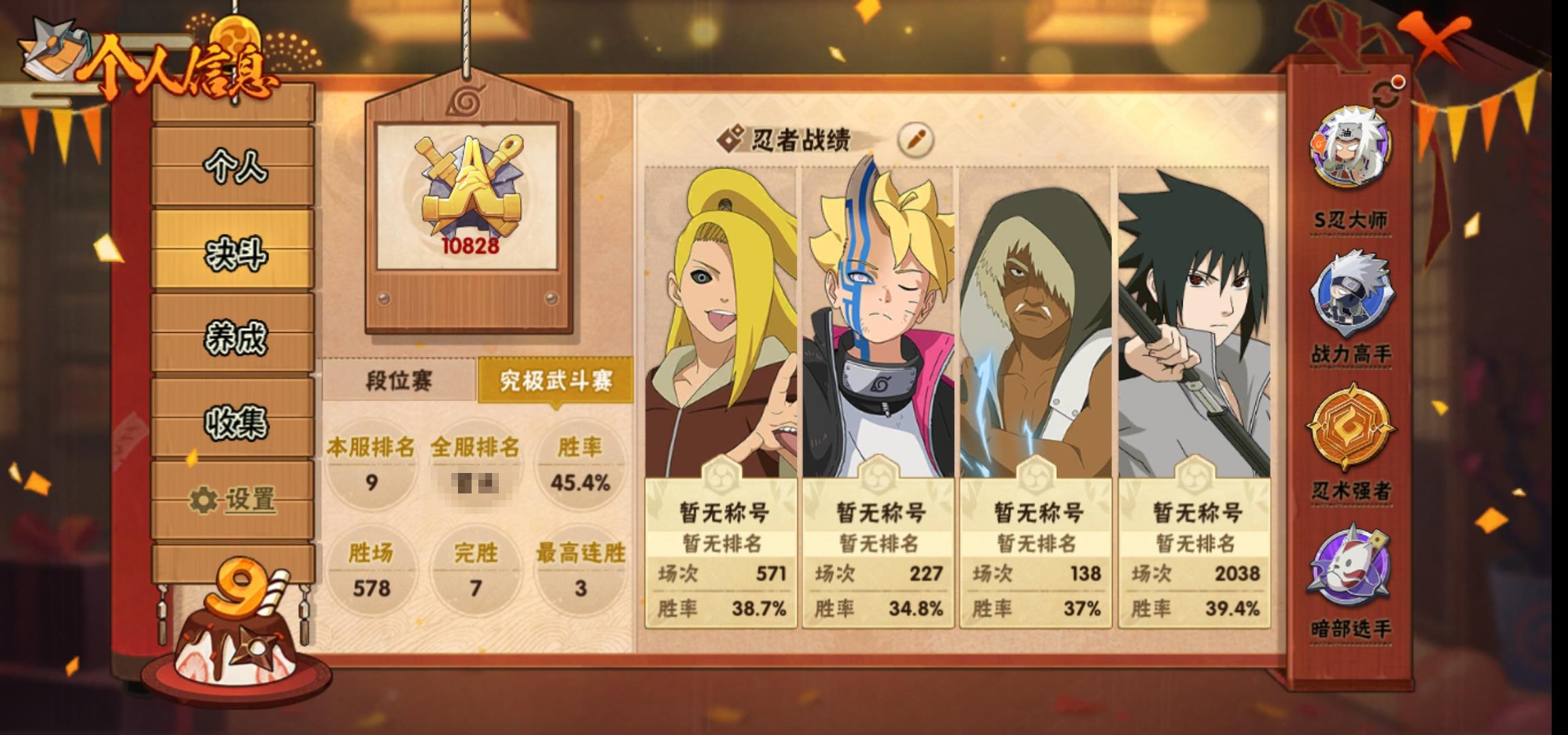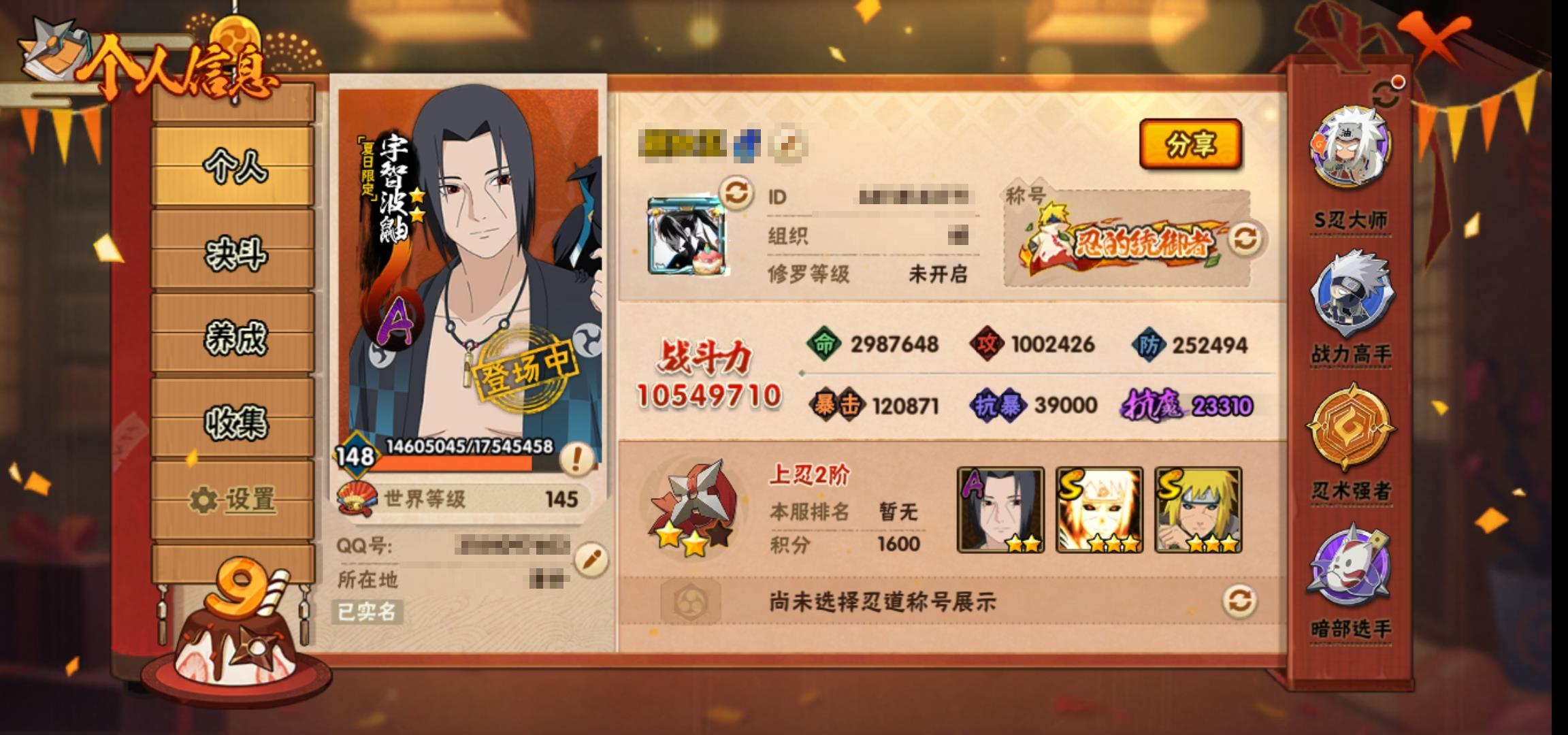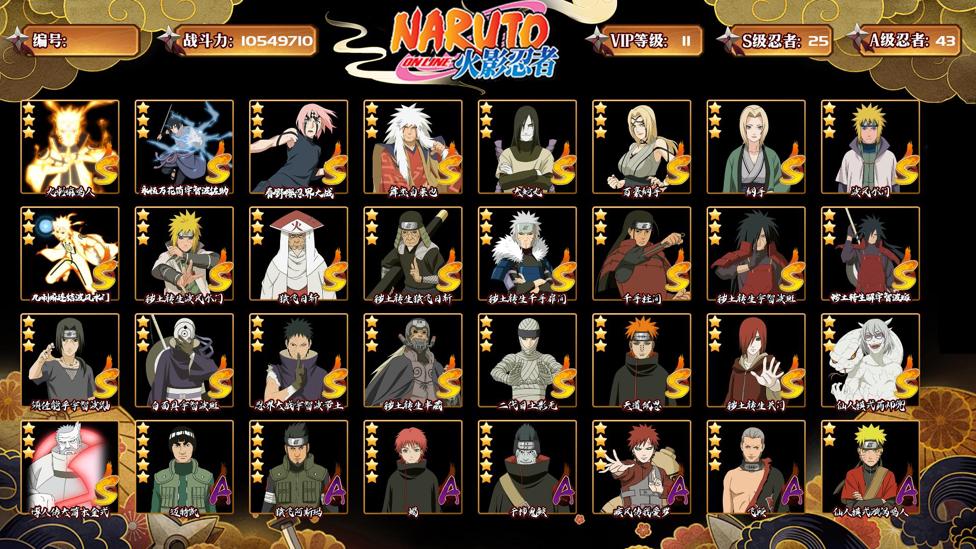 [14153262]0ao4r7 号 vip11,1054w战力,s忍25个,a忍43个,本服排名513,战区排名未上榜,通灵兽21个,6时装,上忍2阶,忍者星数532