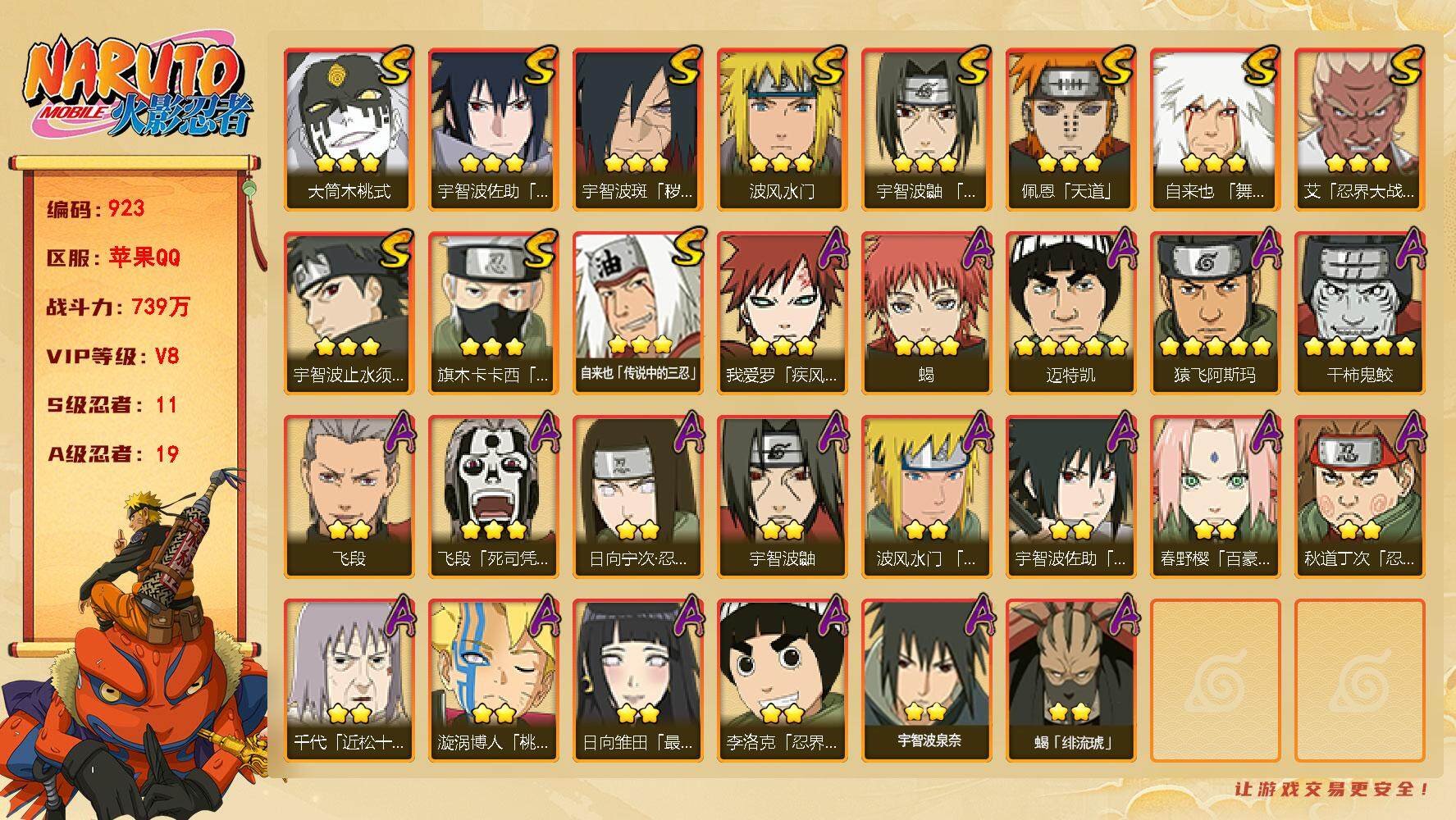 [14171153]v8 739万战力 11s忍-19a忍 tt1253 【s级忍者】:宇智波斑「秽土转生·解」3星,艾「忍界大战」3星,宇智波鼬「须佐能乎」3星,宇智波止水「须佐能乎」3星,旗木卡卡西「须佐能乎」3星,自来也「舞之豪杰」3星,自来也「传说中的三忍」3星,波风水门3星,佩恩「天道」3星,宇智波佐助「永恒万花筒」3星,大筒木桃式3星 【a级忍者】:波风水门「青年」2星,飞段2星,飞段「死司凭血」3星,干柿鬼鲛5星,漩涡博人「桃式显现」2星,迈特凯5星,我爱罗「疾风传」3星,蝎3星,蝎「绯流琥」2星,猿飞阿斯玛5星,宇智波鼬2星,宇智波佐助「须佐能乎」2星,日向宁次「忍界大战」2星,日向雏田「最终章」2星,李洛克「忍界大战」2星,春野樱「百豪」2星,秋道丁次「忍界大战」2星,千代「近松十人卫」2星,宇智波泉奈2星