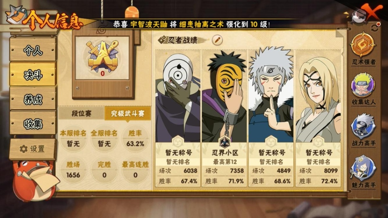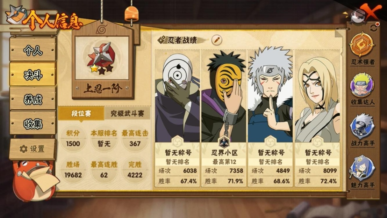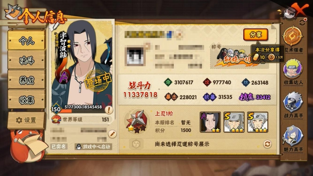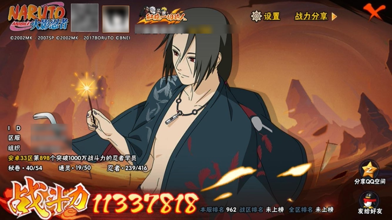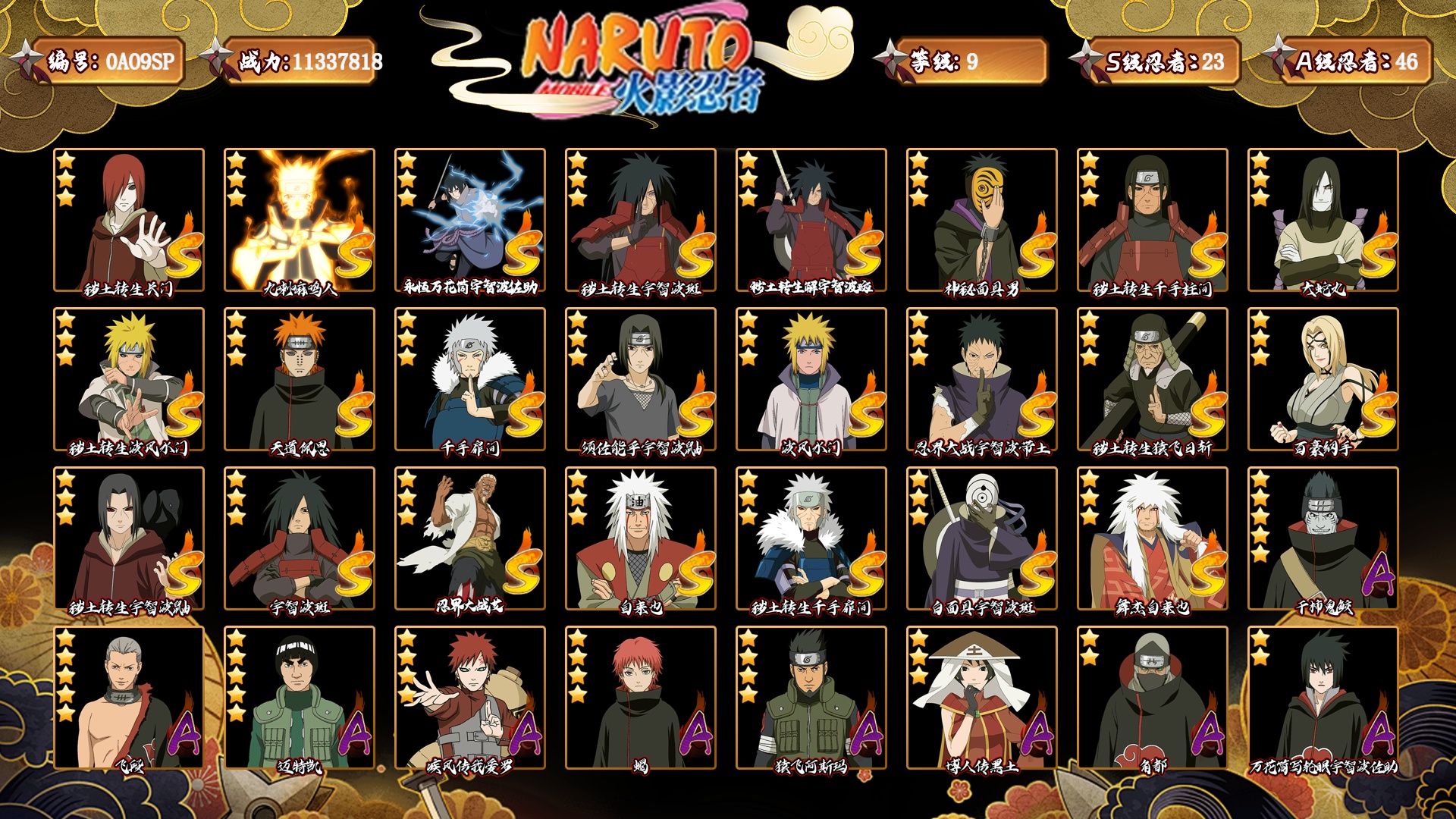 [14183796]0ao9sp 号,vip9,战力:11337818,s忍者数量:23,a忍者数量:46,本服排名:962,战区排名:未上榜,通灵兽数量:19,时装数:15,段位:上忍1阶,忍者星数:611