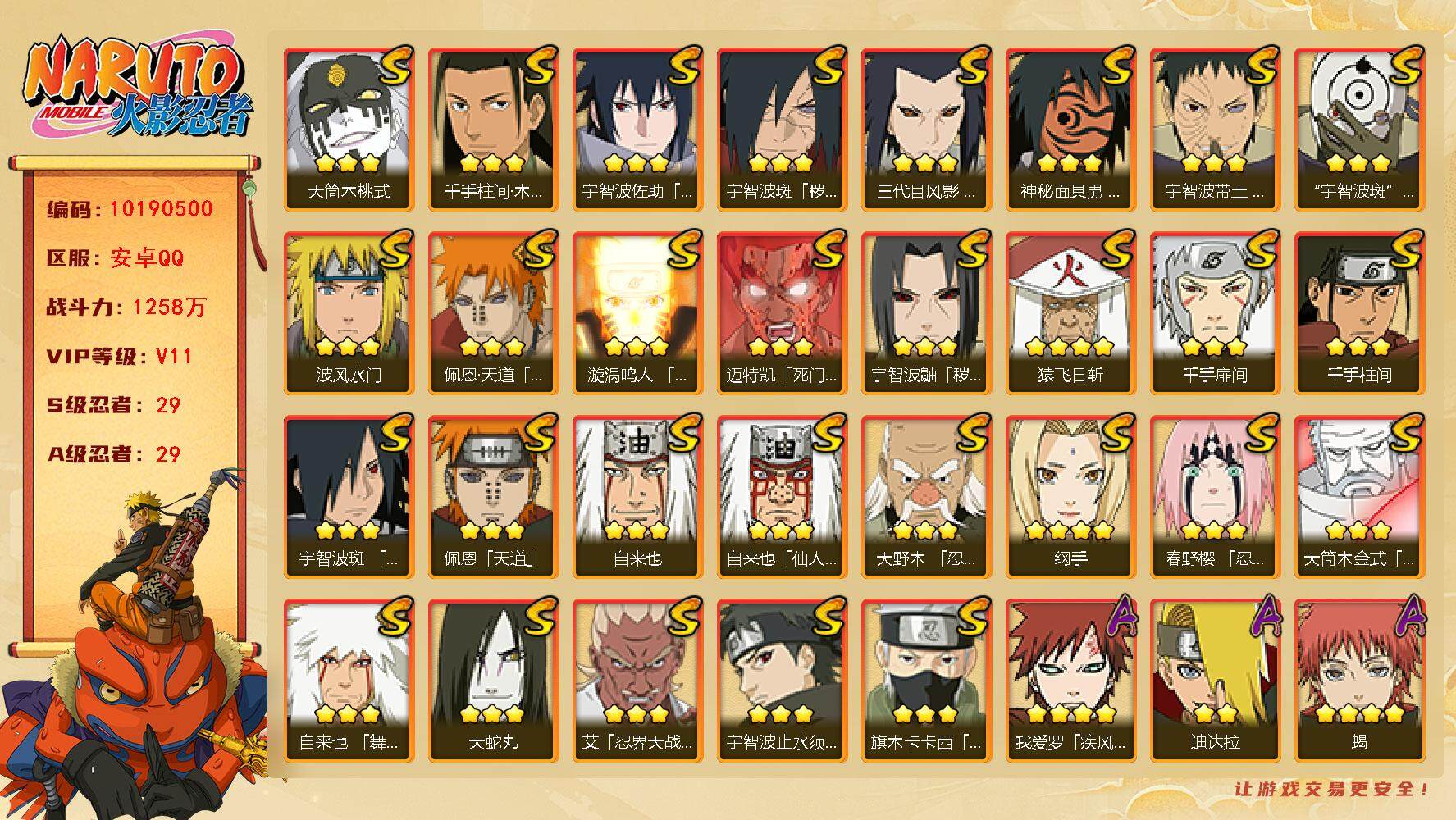 [14186167]【编号02932 可秒换绑】【店长推荐捡漏号】29s级忍者数-29a级忍者数 【s级忍者】:三代目风影「秽土转生」3星,宇智波鼬「秽土转生」3星,宇智波斑「秽土转生·解」3星,大野木「忍界大战」3星,春野樱「忍界大战」3星,宇智波带土「忍界大战」3星,艾「忍界大战」3星,宇智波止水「须佐能乎」3星,旗木卡卡西「须佐能乎」3星,宇智波斑「木叶创立」3星,千手柱间「木叶创立」3星,自来也3星,自来也「仙人模式」3星,自来也「舞之豪杰」3星,大蛇丸3星,纲手4星,千手柱间3星,千手扉间3星,猿飞日斩4星,波风水门3星,神秘面具男「红夜之刃」3星,漩涡鸣人「九喇嘛连结」3星,迈特凯「死门」3星,佩恩「天道」3星,佩恩·天道「超」3星,宇智波佐助「永恒万花筒」3星,宇智波斑 「白面具」3星宇智波斑「白面具」,大筒木金式3星,大筒木桃式3星 【a级忍者】:艾「青年」2星,长门「青年」2星,波风水门「青年」2星,达鲁伊「博人传」2星,迪达拉2星,奇拉比2星,飞段3星,飞段「死司凭血」2星,干柿鬼鲛5星,漩涡博人「桃式显现」2星,漩涡鸣人「仙人模式」2星,迈特凯5星,桃地再不斩「漂泊武士」2星,我爱罗「疾风传」4星,蝎4星,小南「新春限定」2星,小南「漂泊浪客」2星,猿飞阿斯玛5星,宇智波鼬2星,宇智波佐助「须佐能乎」2星,宇智波佐助「万花筒写轮眼」2星,日向宁次「忍界大战」2星,长十郎「六代目水影」2星,佩恩·六道「漂泊浪客」2星,李洛克「忍界大战」2星,春野樱「百豪」2星,秋道丁次「忍界大战」2星,千代「近松十人卫」2星,宇智波泉奈2星