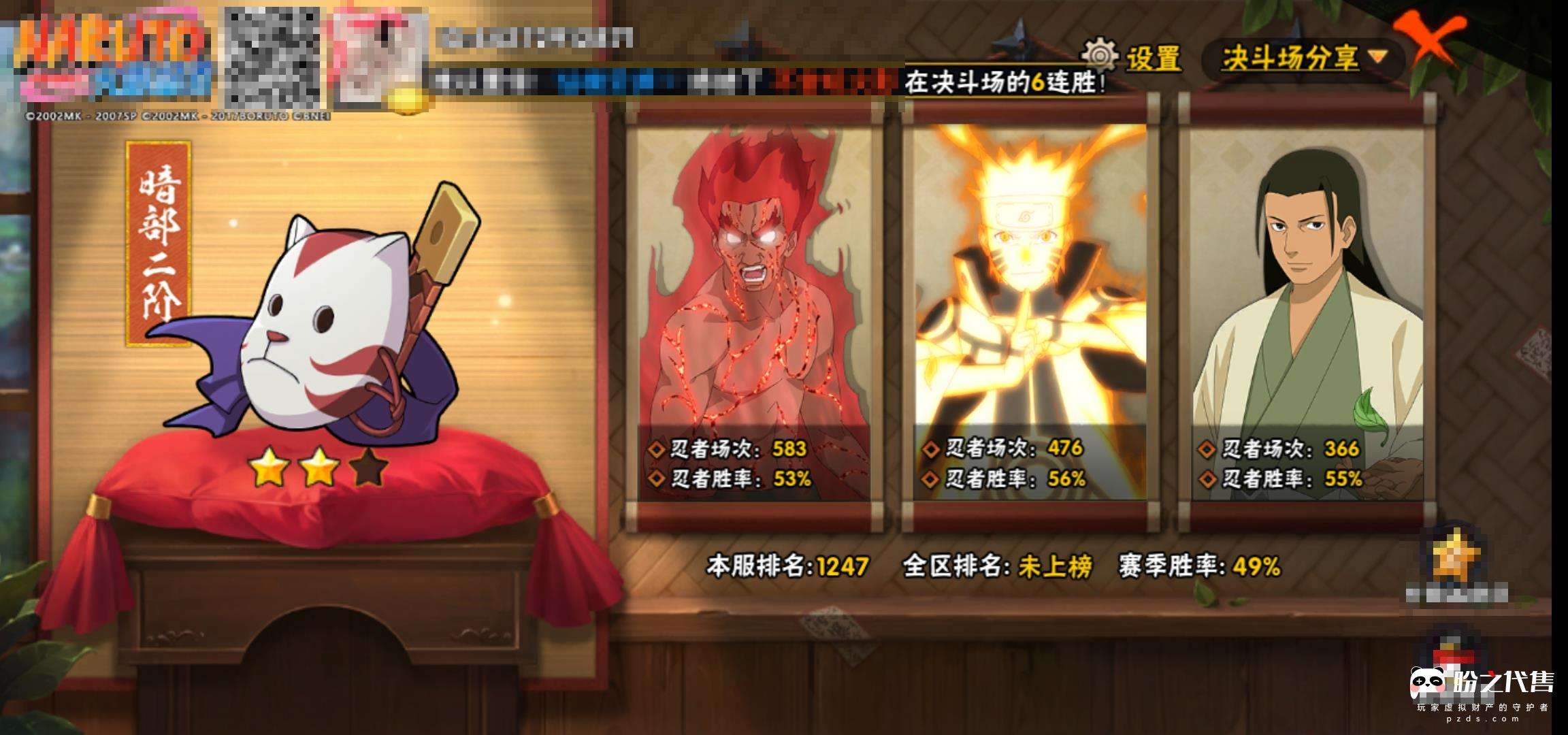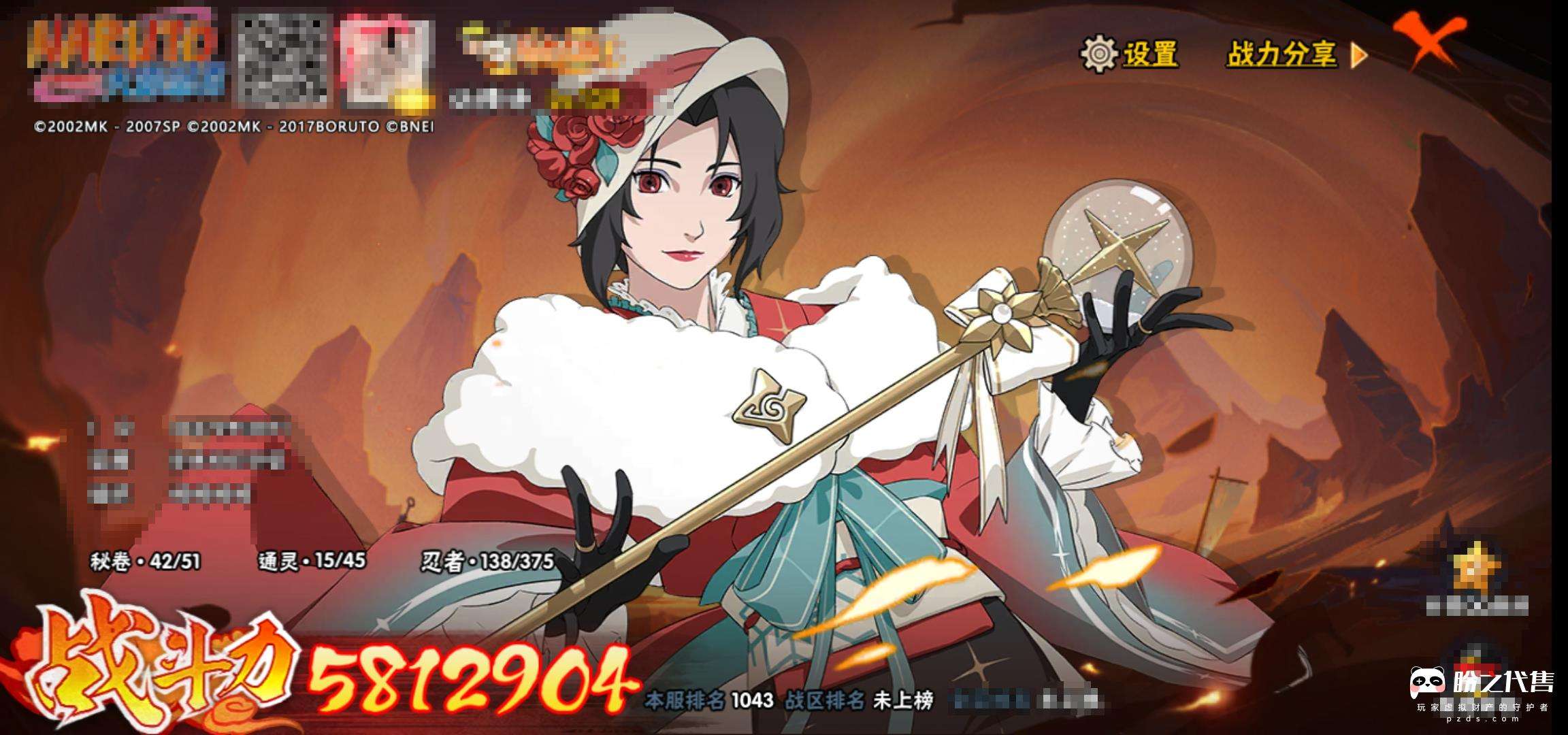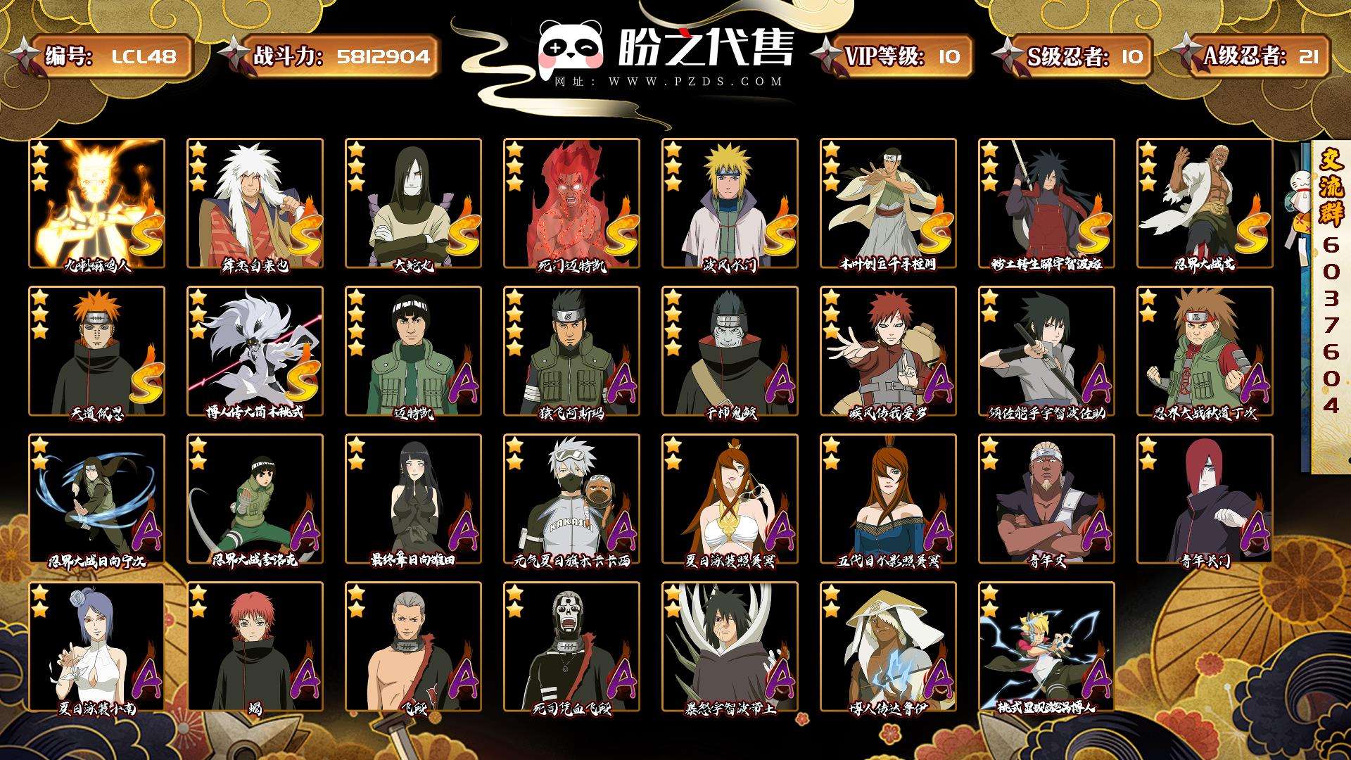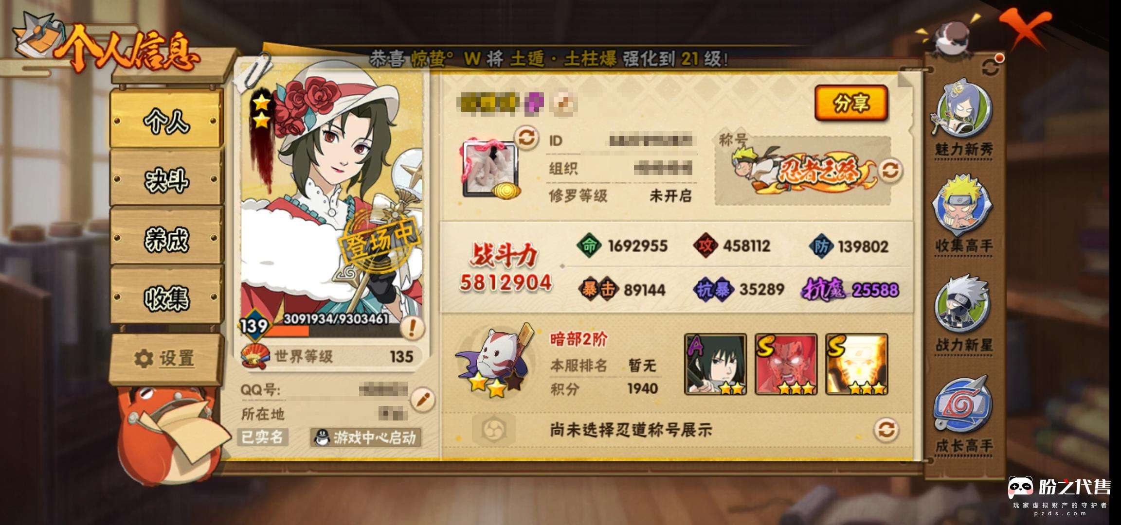 [5237278]【操作系统】roid 【游戏区服】安卓qq 【vip等级】10 【战力值】5812904 【段位】暗部2阶 【战力排名】本服排名:1043,战区排名:未上榜 【忍者星数】310 【s忍】九喇嘛连结漩涡鸣人,舞之豪杰自来也,大蛇丸,死门迈特凯,波风水门,木叶创立千手柱间,秽土转生·解宇智波斑,忍界大战艾,天道佩恩,大筒木桃式 【a忍】迈特凯,猿飞阿斯玛,干柿鬼鲛,疾风传我爱罗,须佐能乎宇智波佐助,忍界大战秋道丁次,忍界大战日向宁次,忍界大战李洛克,最终章日向雏田,元气夏日旗木卡卡西,夏日泳装照美冥,五代目水影照美冥,青年艾,青年长门,夏日泳装小南,蝎,飞段,死司凭血飞段,暴怒宇智波带土,五代目雷影达鲁伊,桃式显现漩涡博人