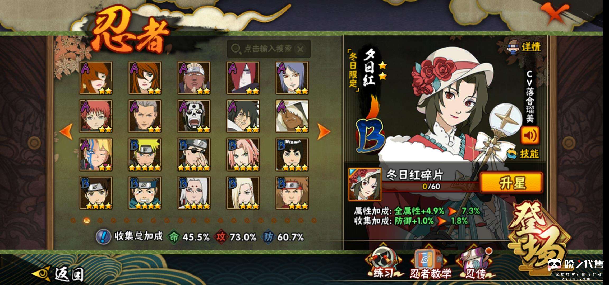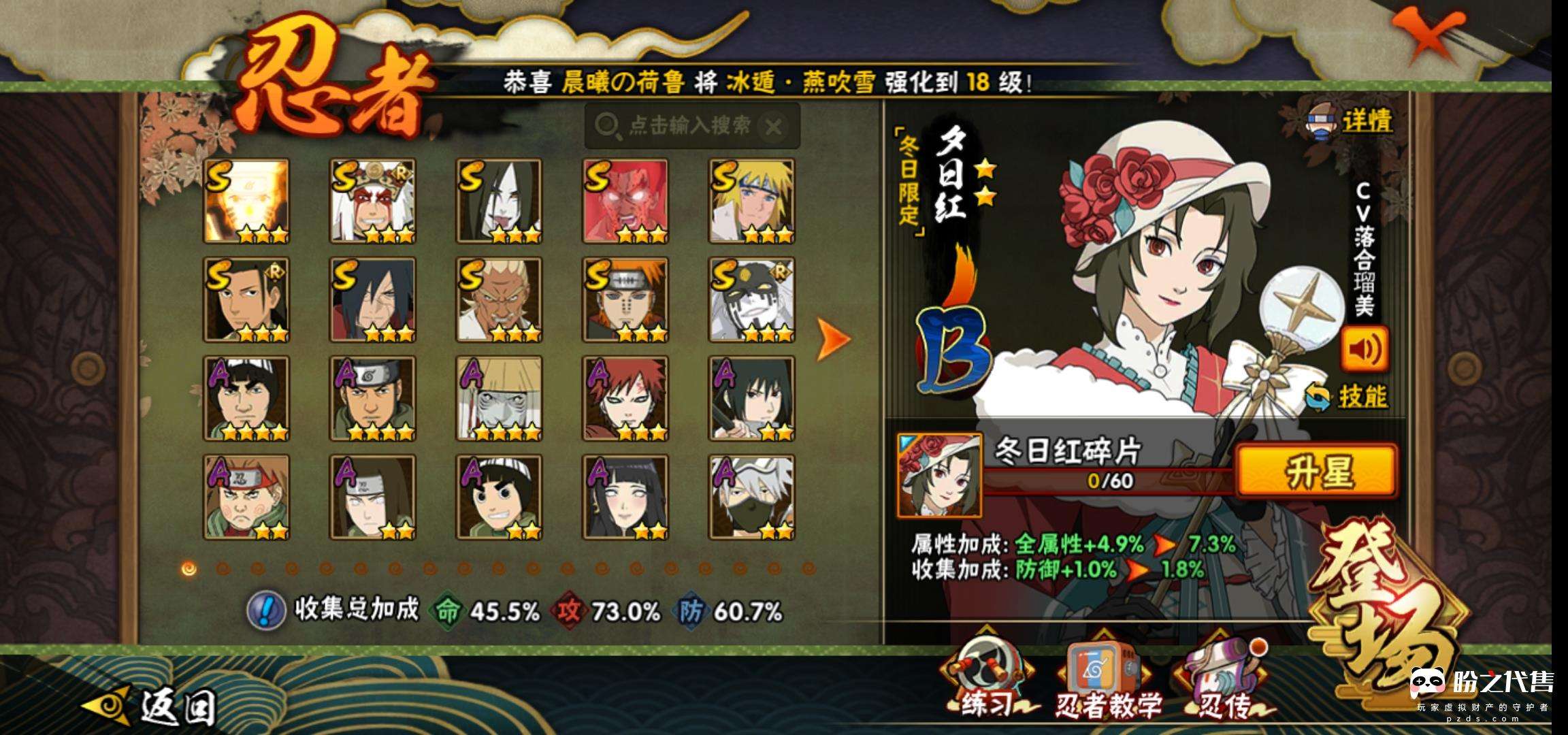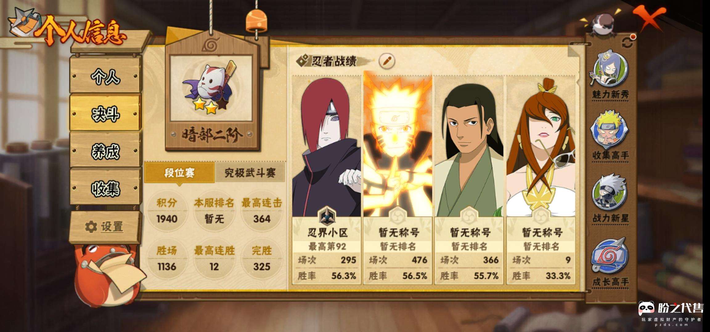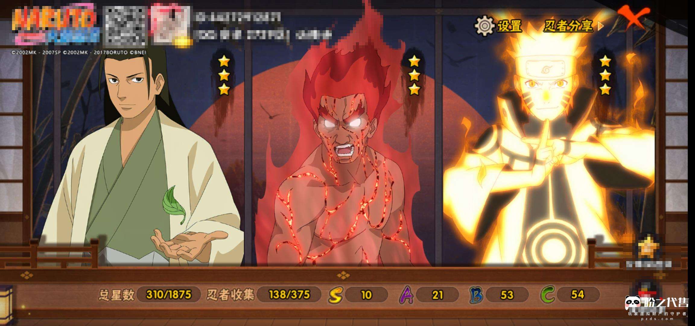 [5237278]【操作系统】roid 【游戏区服】安卓qq 【vip等级】10 【战力值】5812904 【段位】暗部2阶 【战力排名】本服排名:1043,战区排名:未上榜 【忍者星数】310 【s忍】九喇嘛连结漩涡鸣人,舞之豪杰自来也,大蛇丸,死门迈特凯,波风水门,木叶创立千手柱间,秽土转生·解宇智波斑,忍界大战艾,天道佩恩,大筒木桃式 【a忍】迈特凯,猿飞阿斯玛,干柿鬼鲛,疾风传我爱罗,须佐能乎宇智波佐助,忍界大战秋道丁次,忍界大战日向宁次,忍界大战李洛克,最终章日向雏田,元气夏日旗木卡卡西,夏日泳装照美冥,五代目水影照美冥,青年艾,青年长门,夏日泳装小南,蝎,飞段,死司凭血飞段,暴怒宇智波带土,五代目雷影达鲁伊,桃式显现漩涡博人