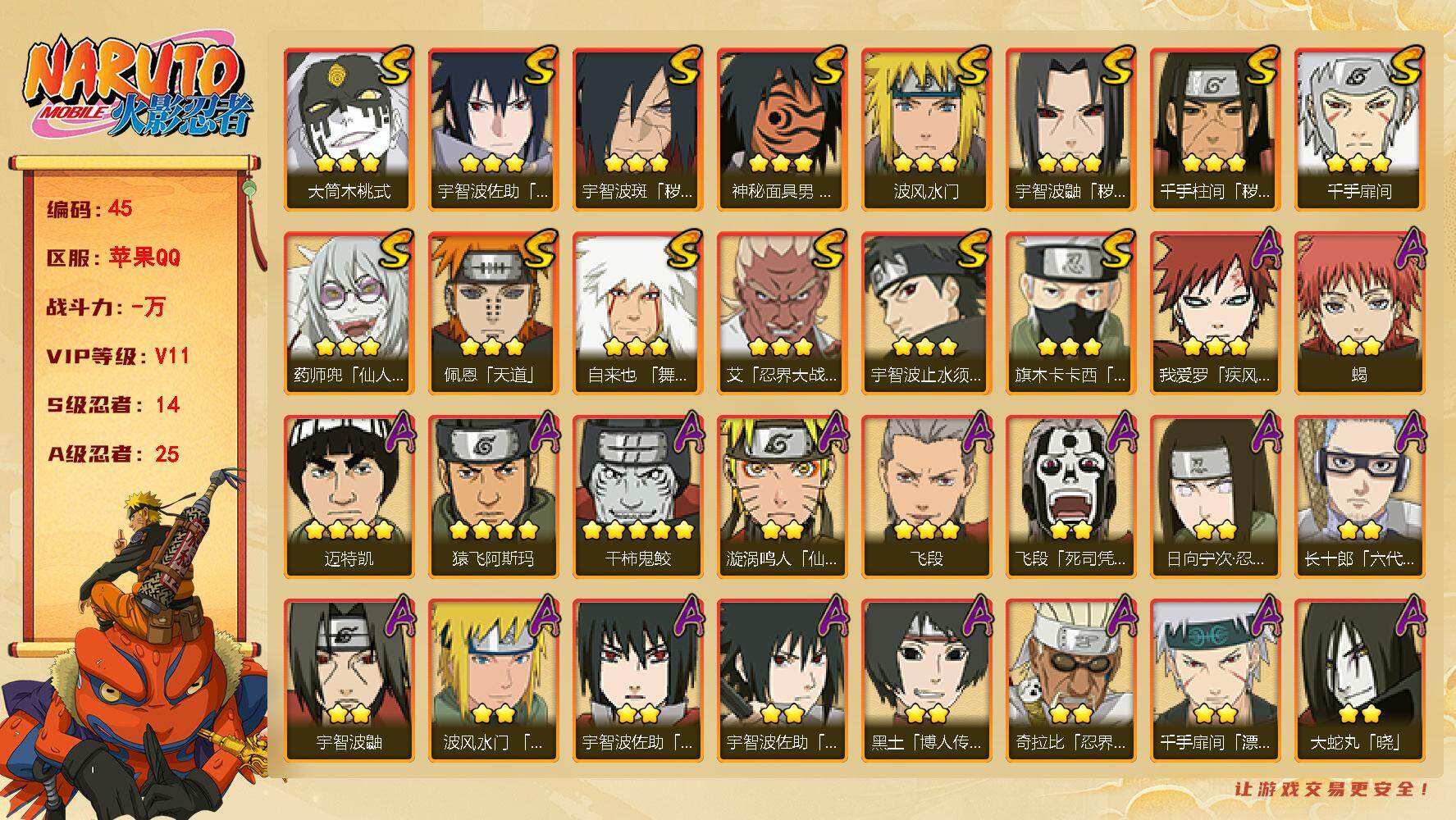 [14215629]v11 14s忍 25a忍 600w战力 金式78片 ll4160 【s级忍者】:千手柱间「秽土转生」3星,宇智波鼬「秽土转生」3星,宇智波斑「秽土转生·解」3星,艾「忍界大战」3星,宇智波止水「须佐能乎」3星,旗木卡卡西「须佐能乎」3星,自来也「舞之豪杰」3星,千手扉间3星,波风水门3星,药师兜「仙人模式」3星,神秘面具男「红夜之刃」3星,佩恩「天道」3星,宇智波佐助「永恒万花筒」3星,大筒木桃式3星 【a级忍者】:波风水门「青年」2星,大蛇丸「晓」2星,奇拉比「忍界大战」2星,飞段3星,飞段「死司凭血」2星,干柿鬼鲛5星,干柿鬼鲛「鲛肌融合」2星,漩涡博人「桃式显现」2星,漩涡鸣人「仙人模式」2星,迈特凯4星,我爱罗「疾风传」3星,我爱罗「忍界大战」2星,蝎2星,猿飞阿斯玛4星,宇智波鼬2星,宇智波佐助「须佐能乎」2星,宇智波佐助「万花筒写轮眼」2星,药师兜「半蛇斗篷」2星,日向宁次「忍界大战」2星,长十郎「六代目水影」2星,李洛克「忍界大战」2星,黑土「博人传」2星,千手扉间「漂泊武士」2星,秋道丁次「忍界大战」2星,千代「近松十人卫」2星