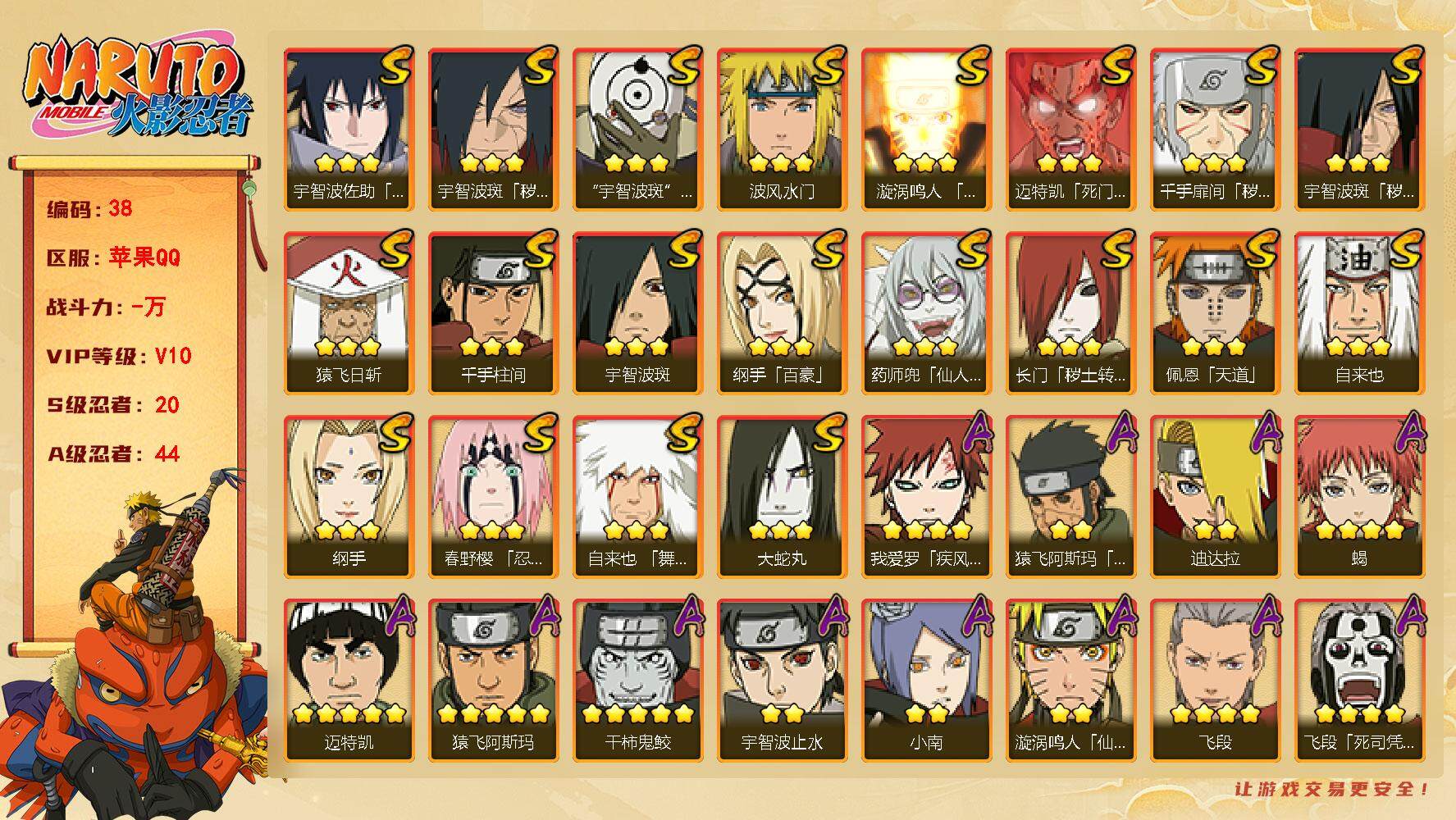 [14218296]v10 20s忍 44a忍战力1129万 卡卡西94片 无80片ll4412 【s级忍者】:长门「秽土转生」3星,千手扉间「秽土转生」3星,宇智波斑「秽土转生」3星,宇智波斑「秽土转生·解」3星,春野樱「忍界大战」3星,自来也3星,自来也「舞之豪杰」3星,大蛇丸3星,纲手3星,纲手「百豪」3星,千手柱间3星,猿飞日斩3星,宇智波斑3星,波风水门3星,药师兜「仙人模式」3星,漩涡鸣人「九喇嘛连结」3星,迈特凯「死门」3星,佩恩「天道」3星,宇智波佐助「永恒万花筒」3星,宇智波斑 「白面具」3星宇智波斑「白面具」 【a级忍者】:艾「青年」2星,长门「青年」2星,波风水门「青年」2星,达鲁伊「博人传」2星,迪达拉2星,迪达拉「秽土转生」2星,大蛇丸「晓」2星,奇拉比2星,奇拉比「忍界大战」2星,飞段4星,飞段「死司凭血」4星,干柿鬼鲛5星,漩涡鸣人「仙人模式」2星,漩涡鸣人「九尾查克拉」2星,迈特凯5星,旗木卡卡西「幻之真容」2星,我爱罗「疾风传」4星,我爱罗「忍界大战」2星,蝎4星,小南2星,小南「漂泊浪客」2星,猿飞阿斯玛5星,猿飞阿斯玛「秽土转生」2星,宇智波止水2星,宇智波止水「新春限定」2星,宇智波鼬2星,宇智波鼬「新春限定」2星,宇智波佐助「须佐能乎」2星,宇智波佐助「疾风传咒印」2星,宇智波佐助「万花筒写轮眼」2星,药师兜「半蛇斗篷」2星,照美冥「侠隐江湖」2星,照美冥「五代目水影」2星,日向宁次「忍界大战」2星,日向雏田「最终章」2星,长十郎「六代目水影」2星,佩恩·六道「漂泊浪客」2星,猿飞木叶丸「博人传」2星,黑土「博人传」2星,春野樱「百豪」2星,秋道丁次「忍界大战」2星,千代「近松十人卫」2星,不缘2星,志村团藏2星