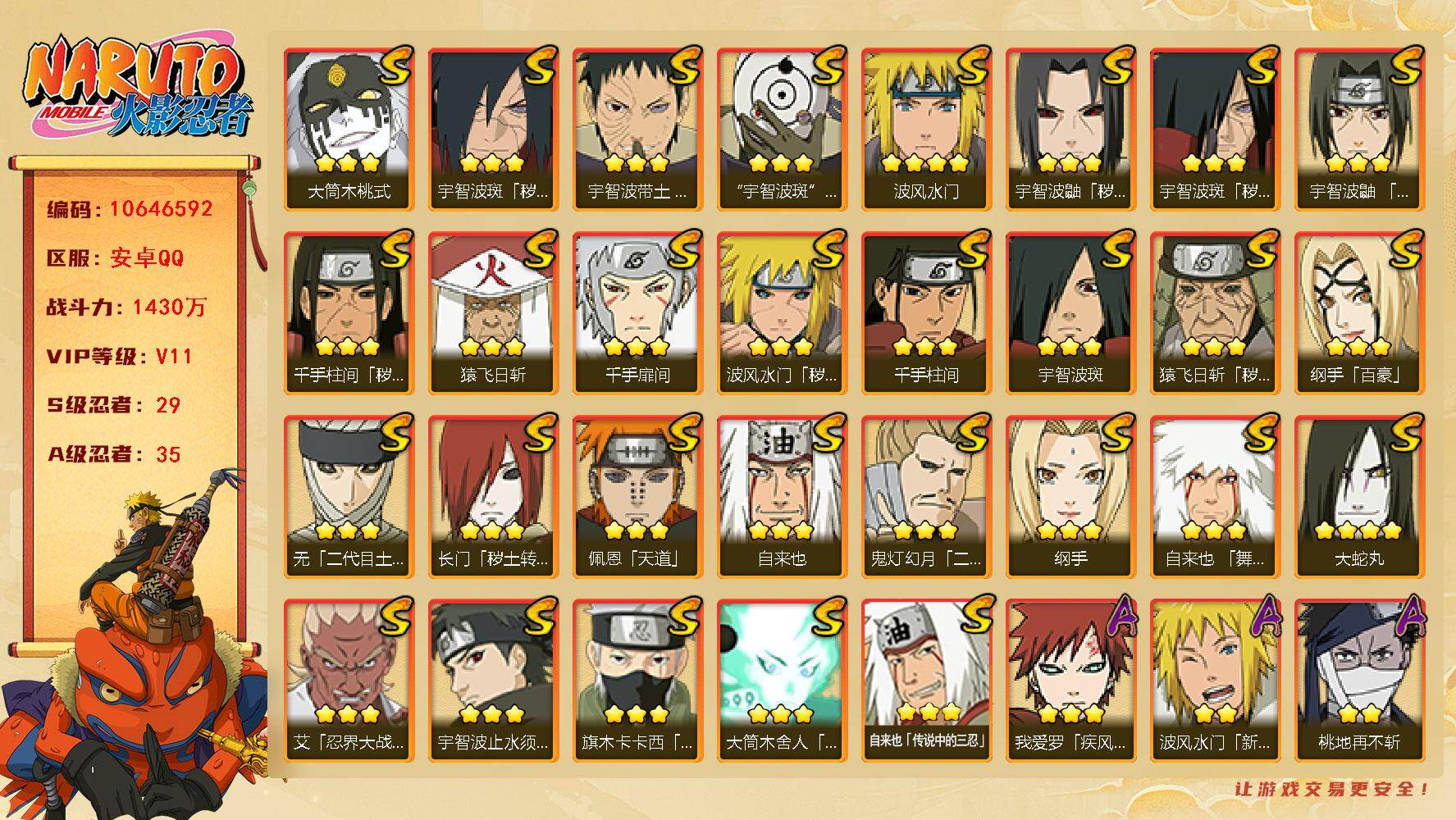 [14223560]【编号47566】29s级忍者数-35a级忍者数 【s级忍者】:长门「秽土转生」3星,猿飞日斩「秽土转生」3星,波风水门「秽土转生」3星,千手柱间「秽土转生」3星,宇智波鼬「秽土转生」3星,宇智波斑「秽土转生」3星,宇智波斑「秽土转生·解」3星,宇智波带土「忍界大战」3星,艾「忍界大战」3星,宇智波鼬「须佐能乎」3星,宇智波止水「须佐能乎」3星,旗木卡卡西「须佐能乎」3星,无「二代目土影」3星,鬼灯幻月「二代目水影」3星,自来也3星,自来也「舞之豪杰」3星,大蛇丸4星,自来也「传说中的三忍」3星,纲手3星,纲手「百豪」3星,千手柱间3星,千手扉间3星,猿飞日斩3星,宇智波斑3星,波风水门4星,佩恩「天道」3星,宇智波斑 「白面具」3星宇智波斑「白面具」,大筒木桃式3星,大筒木舍人「最终章」3星 【a级忍者】:波风水门「青年」2星,波风水门「新春限定」2星,迪达拉2星,大蛇丸「晓」2星,奇拉比「忍界大战」2星,飞段3星,飞段「死司凭血」3星,干柿鬼鲛5星,漩涡博人「桃式显现」2星,漩涡鸣人「仙人模式」2星,迈特凯5星,旗木卡卡西「万花筒写轮眼」2星,桃地再不斩2星,我爱罗「疾风传」3星,蝎3星,蝎「绯流琥」2星,小南2星,角都2星,角都「秽土转生」2星,猿飞阿斯玛5星,宇智波止水2星,宇智波鼬2星,宇智波鼬「新春限定」2星,宇智波佐助「须佐能乎」2星,宇智波佐助「万花筒写轮眼」2星,药师兜「半蛇斗篷」2星,日向宁次「忍界大战」2星,李洛克「忍界大战」2星,猿飞木叶丸「博人传」2星,黑土「博人传」2星,春野樱「百豪」2星,秋道丁次「忍界大战」2星,千代「近松十人卫」2星,神农「羁绊」2星,宇智波泉奈2星