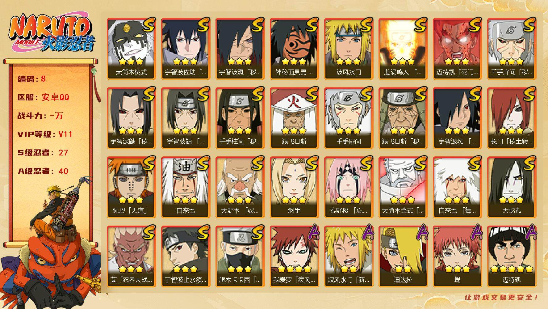 [14225622]【编号84842 可秒换绑】店长推荐特价处理精品号27s级忍者数-40a级忍者数 【s级忍者】:长门「秽土转生」3星,猿飞日斩「秽土转生」3星,千手扉间「秽土转生」3星,千手柱间「秽土转生」3星,宇智波鼬「秽土转生」3星,宇智波斑「秽土转生·解」3星,大野木「忍界大战」3星,春野樱「忍界大战」3星,艾「忍界大战」3星,宇智波鼬「须佐能乎」3星,宇智波止水「须佐能乎」3星,旗木卡卡西「须佐能乎」3星,宇智波斑「木叶创立」3星,自来也3星,自来也「舞之豪杰」3星,大蛇丸3星,纲手3星,千手扉间3星,猿飞日斩3星,波风水门3星,神秘面具男「红夜之刃」3星,漩涡鸣人「九喇嘛连结」3星,迈特凯「死门」3星,佩恩「天道」3星,宇智波佐助「永恒万花筒」3星,大筒木金式3星,大筒木桃式3星 【a级忍者】:艾「青年」3星,长门「青年」2星,波风水门「青年」2星,波风水门「新春限定」2星,达鲁伊「博人传」2星,迪达拉2星,迪达拉「秽土转生」2星,奇拉比2星,奇拉比「忍界大战」2星,飞段3星,飞段「死司凭血」2星,干柿鬼鲛5星,漩涡博人「桃式显现」2星,迈特凯5星,旗木卡卡西「万花筒写轮眼」2星,桃地再不斩「漂泊武士」2星,我爱罗「疾风传」4星,蝎3星,蝎「绯流琥」2星,小南「漂泊浪客」2星,猿飞阿斯玛5星,宇智波止水2星,宇智波止水「新春限定」2星,宇智波鼬2星,宇智波鼬「新春限定」2星,宇智波佐助「须佐能乎」2星,宇智波佐助「万花筒写轮眼」2星,药师兜「半蛇斗篷」2星,照美冥「五代目水影」2星,日向宁次「忍界大战」2星,长十郎「六代目水影」2星,佩恩·六道「漂泊浪客」2星,李洛克「忍界大战」2星,黑土「博人传」2星,千手扉间「漂泊武士」2星,春野樱「百豪」2星,秋道丁次「忍界大战」2星,千代「近松十人卫」2星,不缘2星,宇智波泉奈2星