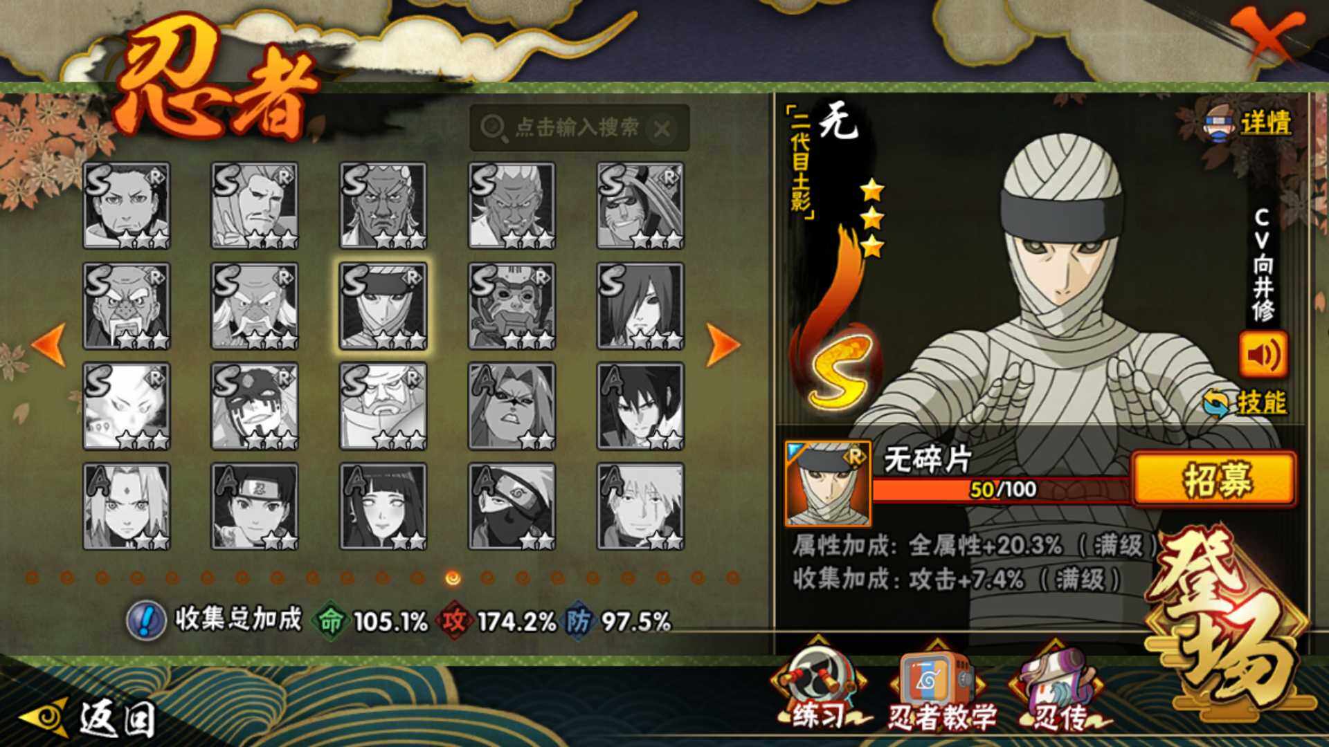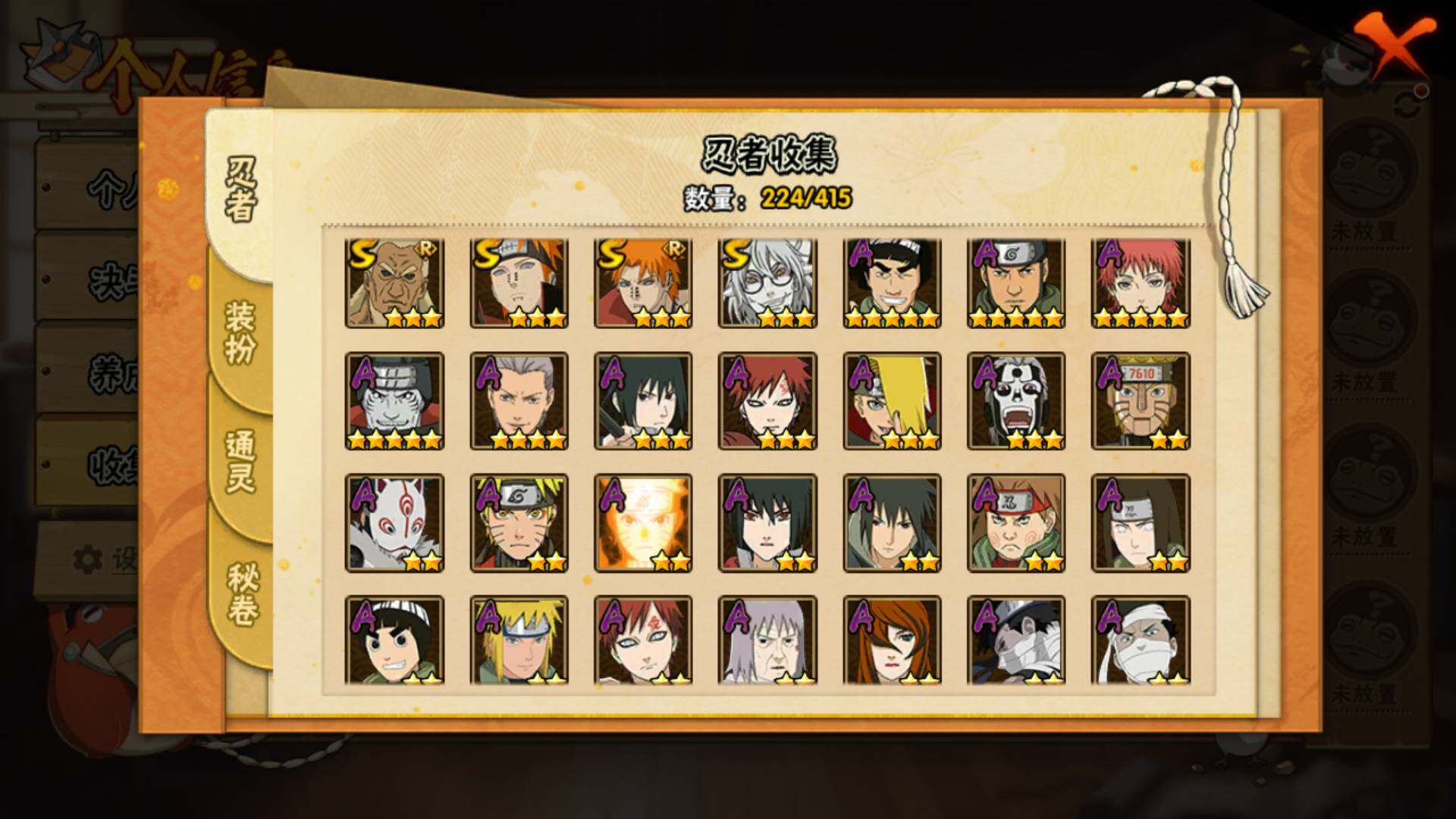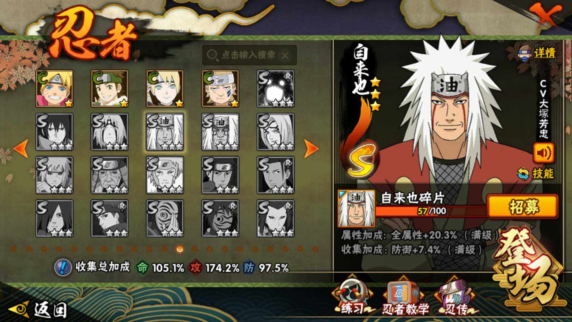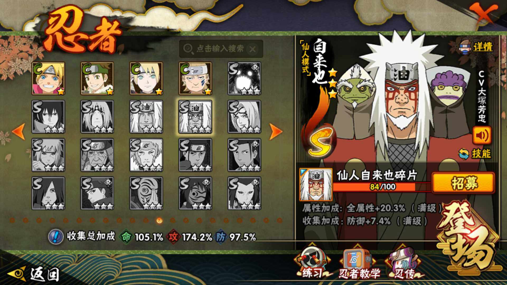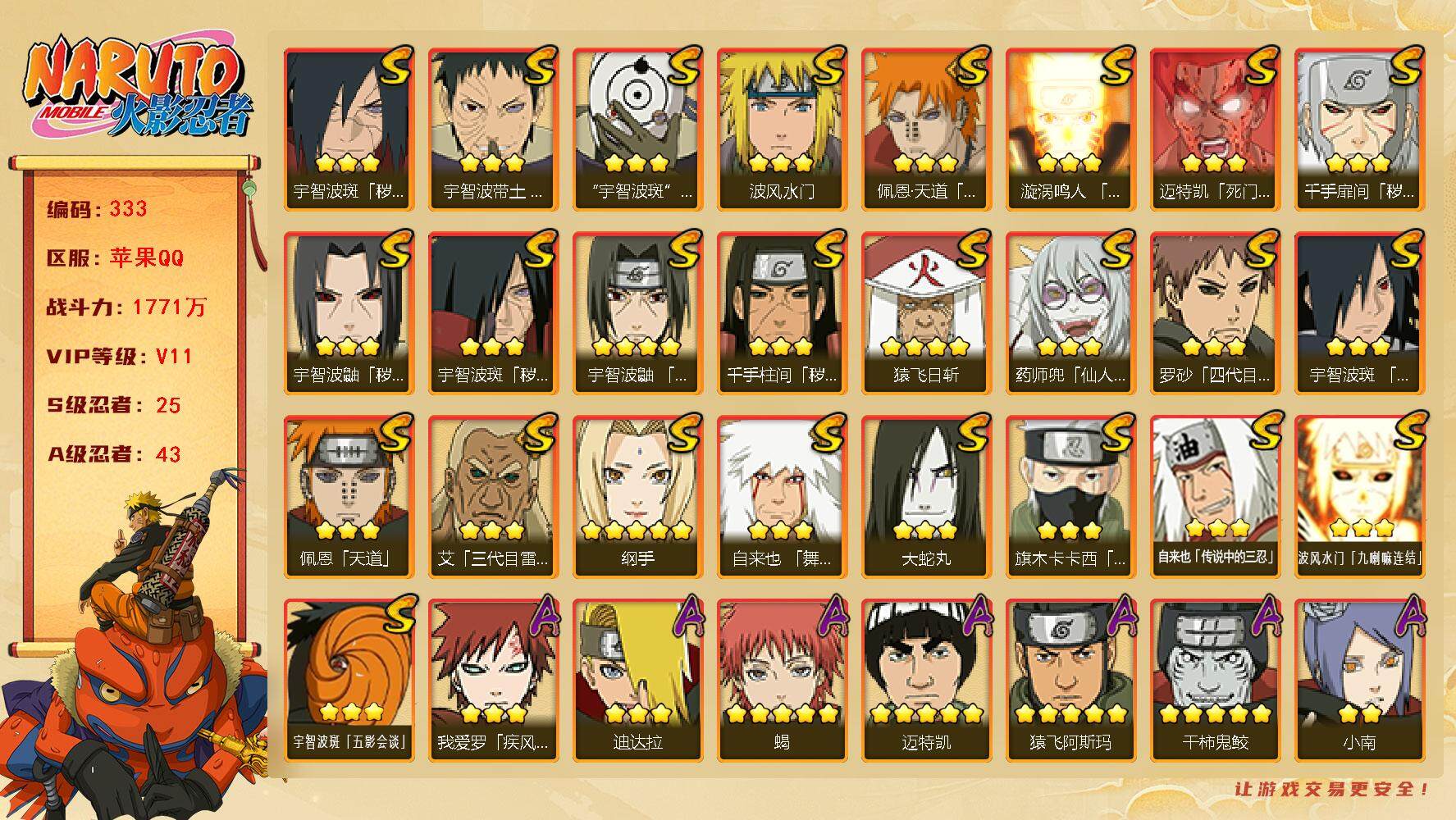 [14249203]v11 1771万战力 25s-43a 自来也57片 仙人自来也84片 大野木53片 无50片 ll5461 【s级忍者】:千手扉间「秽土转生」3星,千手柱间「秽土转生」3星,宇智波鼬「秽土转生」3星,宇智波斑「秽土转生」3星,宇智波斑「秽土转生·解」3星,宇智波带土「忍界大战」3星,宇智波鼬「须佐能乎」4星,旗木卡卡西「须佐能乎」3星,宇智波斑「木叶创立」3星,罗砂「四代目风影」3星,艾「三代目雷影」3星,自来也「舞之豪杰」3星,大蛇丸3星,自来也「传说中的三忍」3星,纲手5星,猿飞日斩4星,波风水门3星,药师兜「仙人模式」3星,漩涡鸣人「九喇嘛连结」3星,迈特凯「死门」3星,佩恩「天道」3星,佩恩·天道「超」3星,宇智波斑 「白面具」3星宇智波斑「白面具」,波风水门「九喇嘛连结」3星,宇智波斑「五影会谈」3星 【a级忍者】:艾「青年」2星,波风水门「青年」2星,达鲁伊「博人传」2星,迪达拉3星,迪达拉「秽土转生」2星,大蛇丸「晓」2星,奇拉比2星,奇拉比「忍界大战」2星,飞段4星,飞段「死司凭血」3星,干柿鬼鲛5星,漩涡博人「桃式显现」2星,漩涡鸣人「仙人模式」2星,漩涡鸣人「九尾查克拉」2星,机械鸣人「初始形态」2星,迈特凯5星,桃地再不斩「漂泊武士」2星,桃地再不斩「秽土转生」2星,我爱罗「疾风传」3星,我爱罗「忍界大战」2星,蝎5星,蝎「绯流琥」2星,小南2星,猿飞阿斯玛5星,宇智波鼬2星,宇智波佐助「须佐能乎」3星,宇智波佐助「万花筒写轮眼」2星,照美冥「五代目水影」2星,日向宁次「忍界大战」2星,神秘面具男「忍者之路」2星,李洛克「忍界大战」2星,猿飞木叶丸「博人传」2星,黑土「博人传」2星,千手扉间「漂泊武士」2星,秋道丁次「忍界大战」2星,千代「近松十人卫」2星,神农「羁绊」2星,土台「忍界大战」2星,不风2星,加藤断2星,宇智波泉奈2星,大野木「侠隐江湖」2星,巳月「仙人模式」2星