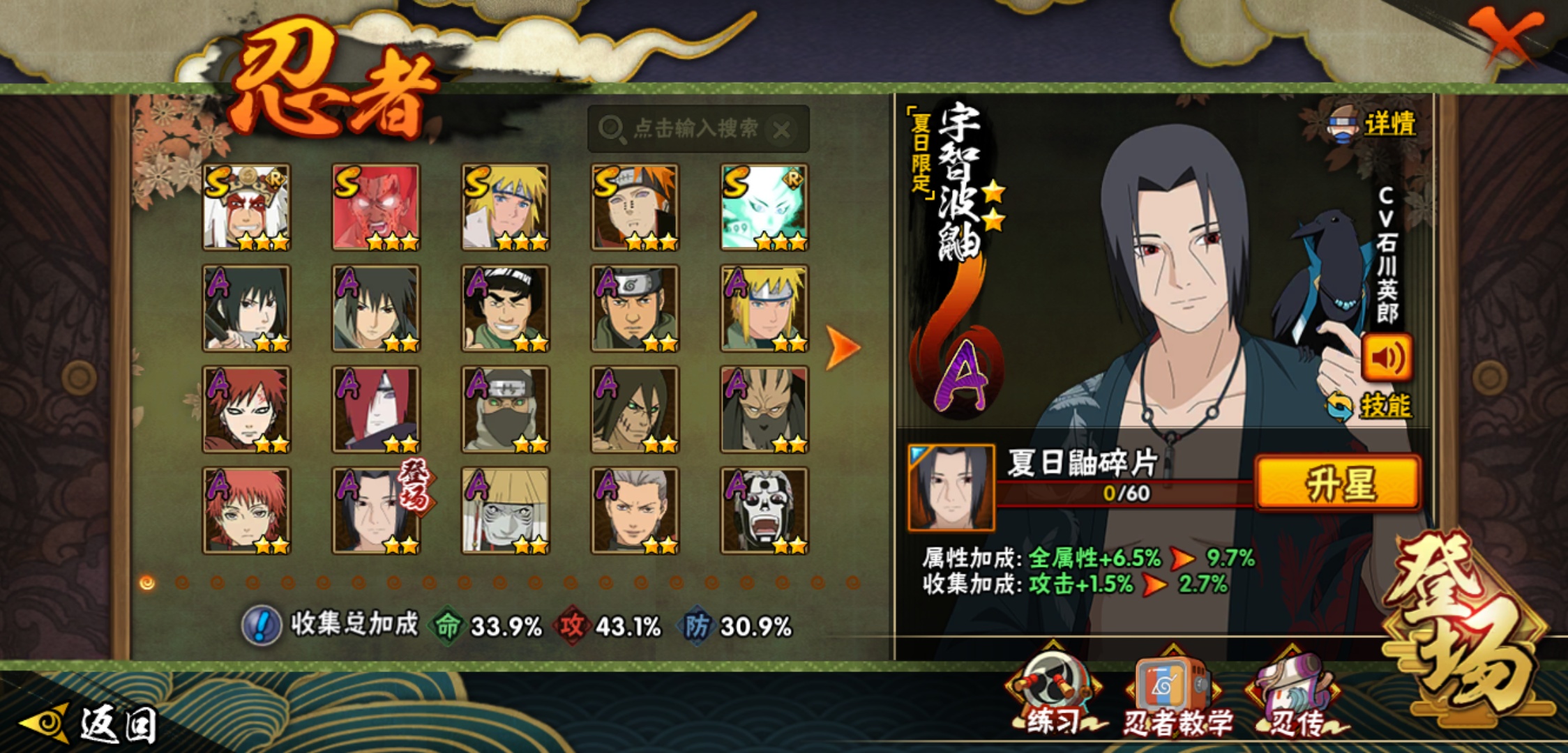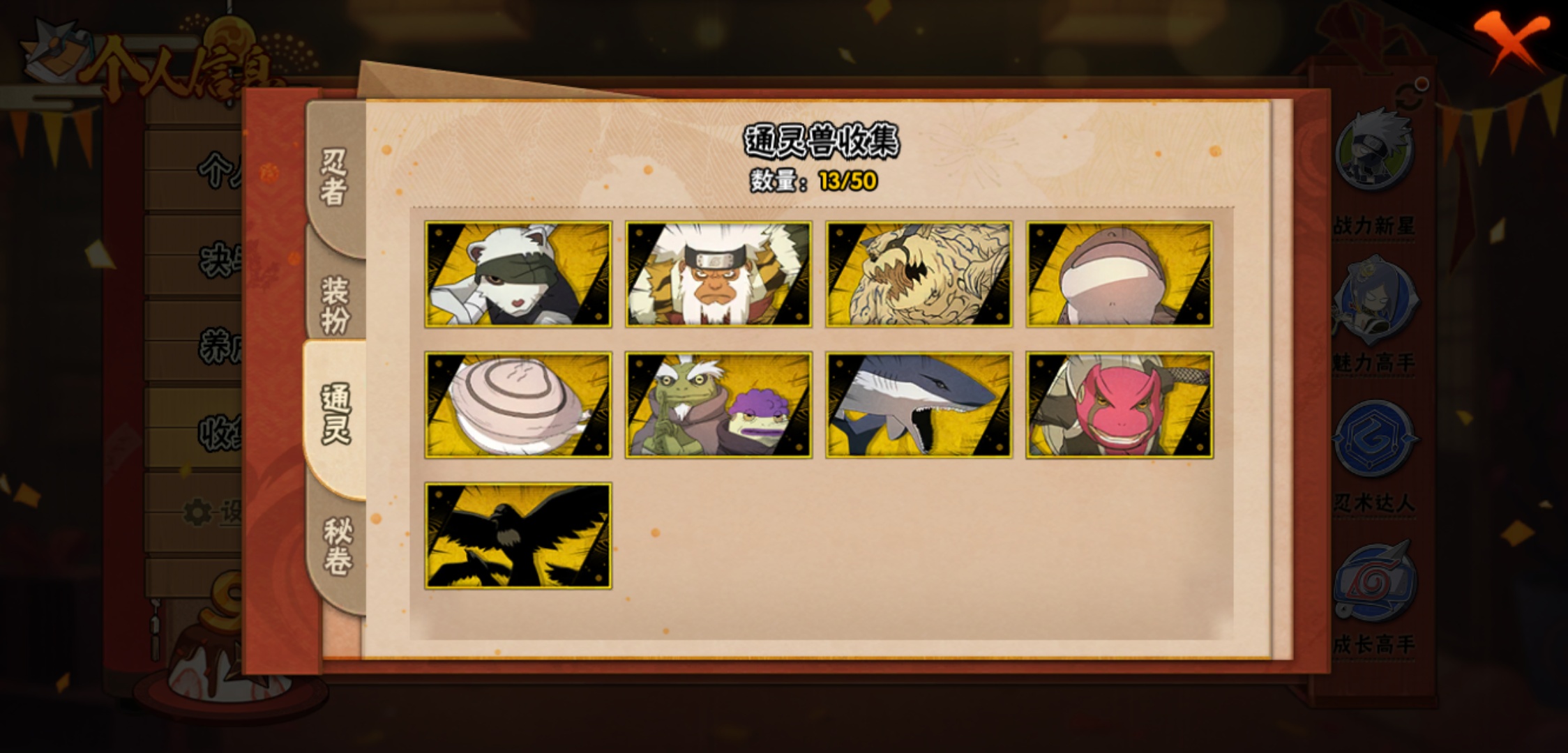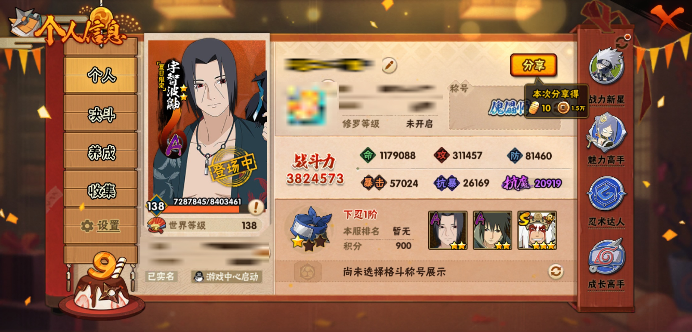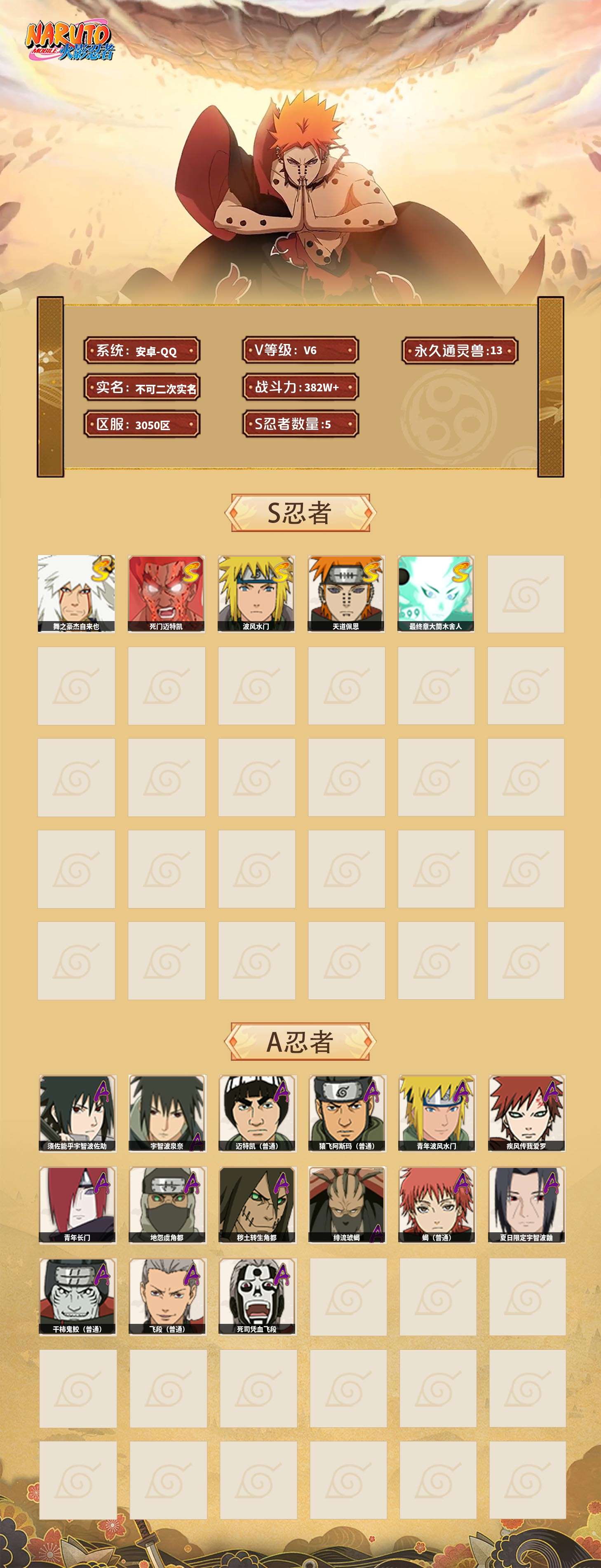 【火影忍者】【lyhy8864】战斗力:382w;段位:下忍1阶;本服排名:2659;vip:v6级;s忍:5个;a忍:15个;通灵兽:13个,s忍:舞之豪杰自来也|死门迈特凯|波风水门|天道佩恩|最终章大筒木舍人__a忍:须佐能乎宇智波佐助|宇智波泉奈|迈特凯(普通)|猿飞阿斯玛(普通)|青年波风水门|疾风传我爱罗|青年长门|地怨虞角都|秽土转生角都|绯流琥蝎|蝎(普通)|夏日限定宇智波鼬|干柿鬼鲛(普通)|飞段(普通)|死司凭血飞段__通灵兽:忍犬(普通)|蓝蛇|蛤蟆吉|忍龟|镰鼬|猿魔|砂之守鹤|山椒鱼|蜃|蛤蟆仙人|鲛鲨|蛤蟆健|乌鸦(普通)