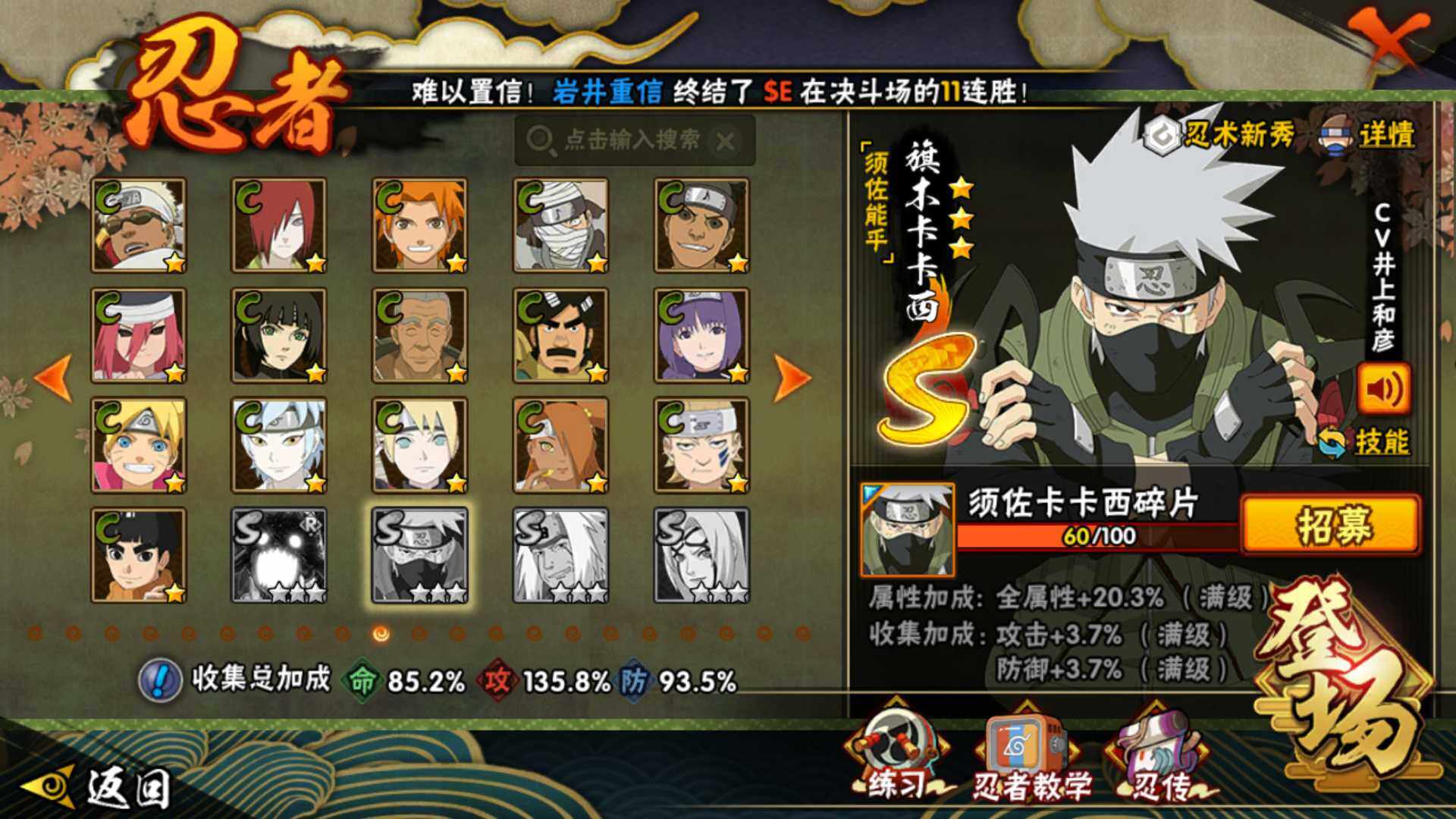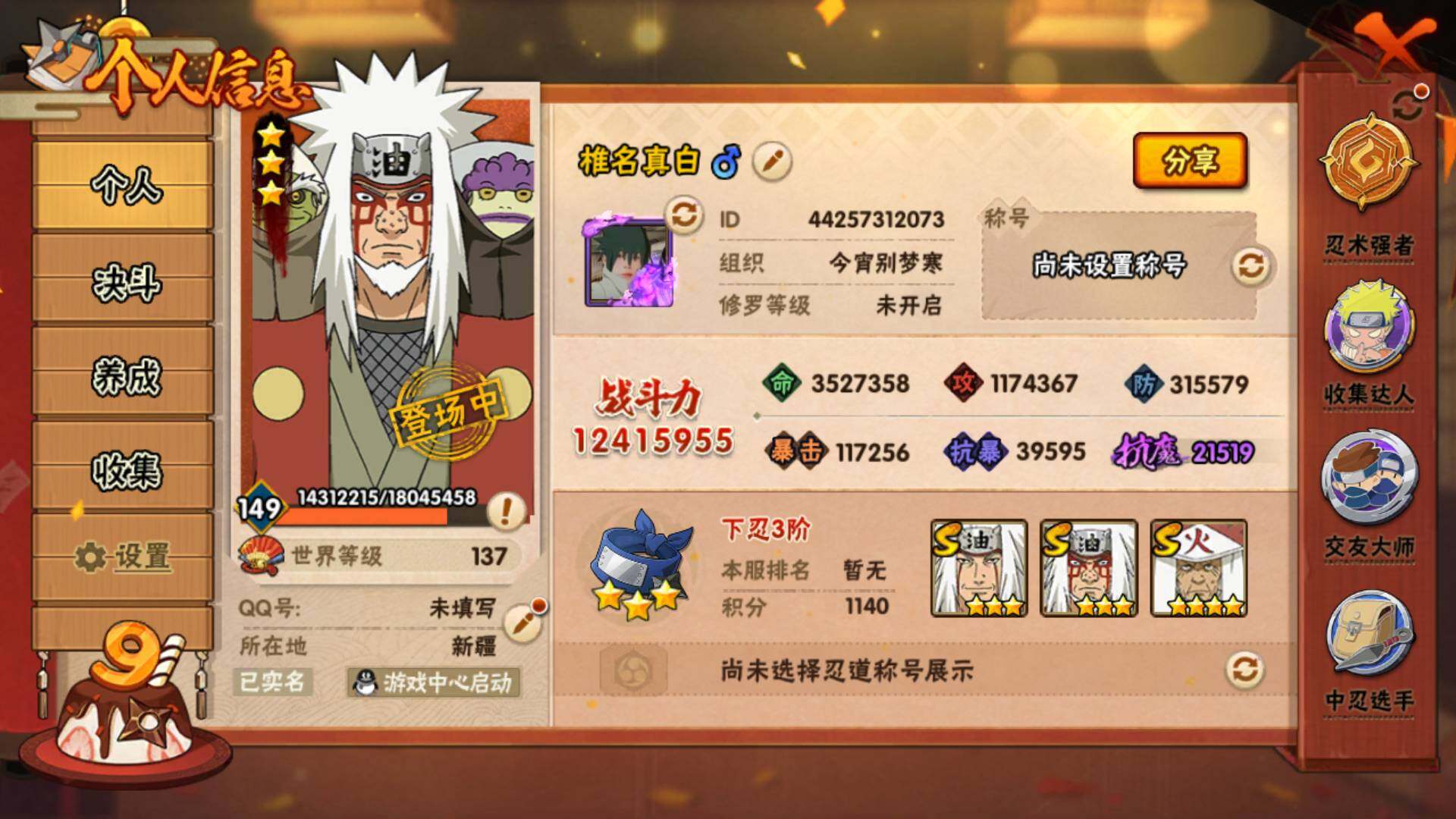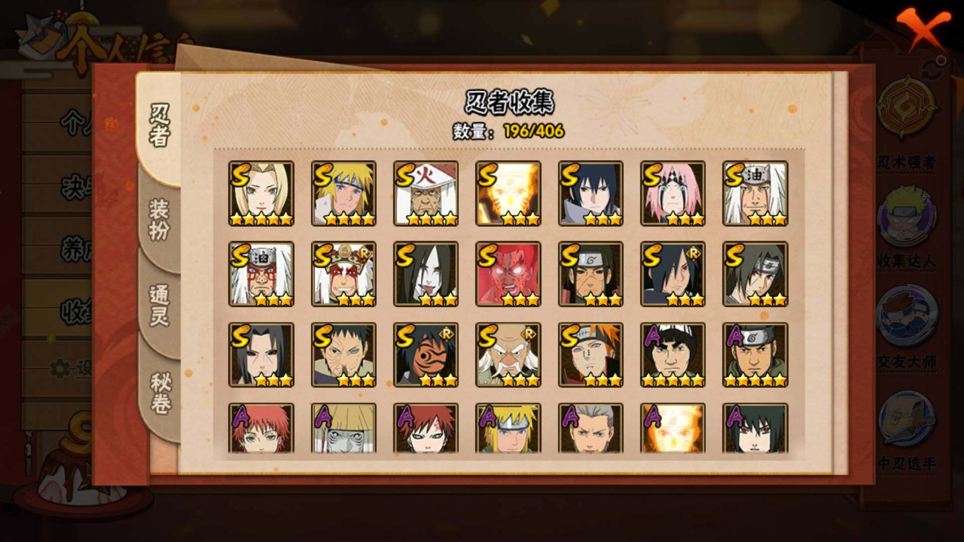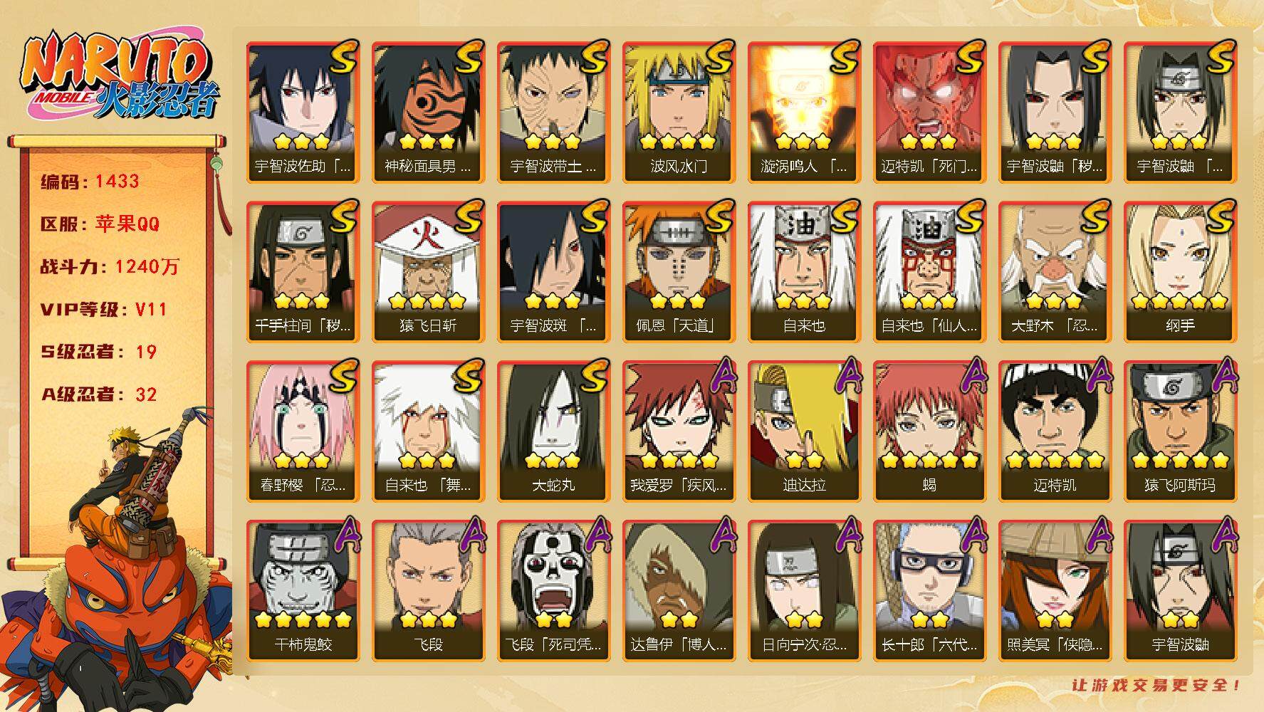 [14282363]v11 19s 32a 1240万战力 须佐卡卡西60片 传说自来也79片 秽土解斑50片 白面具63片 忍战艾68片 鬼灯幻月58片 大野木75片 zp3144 【s级忍者】:千手柱间「秽土转生」3星,宇智波鼬「秽土转生」3星,大野木「忍界大战」3星,春野樱「忍界大战」3星,宇智波带土「忍界大战」3星,宇智波鼬「须佐能乎」3星,宇智波斑「木叶创立」3星,自来也3星,自来也「仙人模式」3星,自来也「舞之豪杰」3星,大蛇丸3星,纲手5星,猿飞日斩4星,波风水门4星,神秘面具男「红夜之刃」3星,漩涡鸣人「九喇嘛连结」3星,迈特凯「死门」3星,佩恩「天道」3星,宇智波佐助「永恒万花筒」3星 【a级忍者】:艾「青年」2星,长门「青年」2星,波风水门「青年」3星,达鲁伊「博人传」2星,迪达拉2星,迪达拉「秽土转生」2星,奇拉比2星,奇拉比「忍界大战」2星,飞段3星,飞段「死司凭血」2星,干柿鬼鲛5星,漩涡鸣人「九尾查克拉」2星,迈特凯5星,桃地再不斩「秽土转生」2星,我爱罗「疾风传」4星,蝎5星,蝎「绯流琥」2星,猿飞阿斯玛5星,宇智波鼬2星,宇智波佐助「须佐能乎」2星,宇智波佐助「万花筒写轮眼」2星,照美冥「侠隐江湖」2星,照美冥「五代目水影」2星,日向宁次「忍界大战」2星,长十郎「六代目水影」2星,佩恩·六道「漂泊浪客」2星,李洛克「忍界大战」2星,千手扉间「漂泊武士」2星,秋道丁次「忍界大战」2星,千代「近松十人卫」2星,宇智波泉奈2星,不动2星