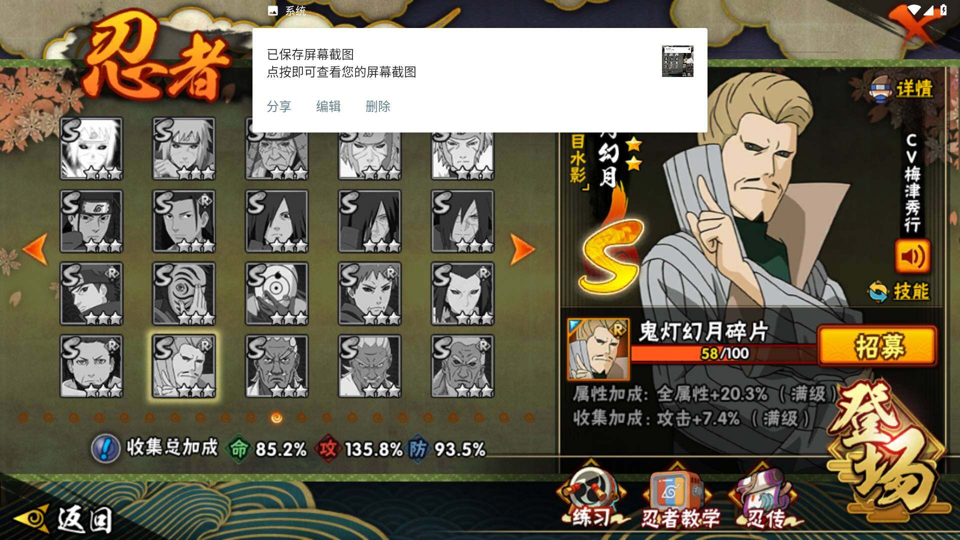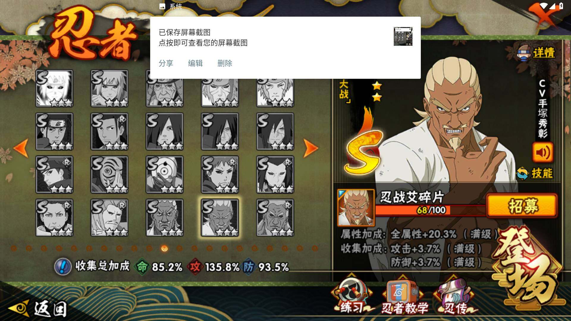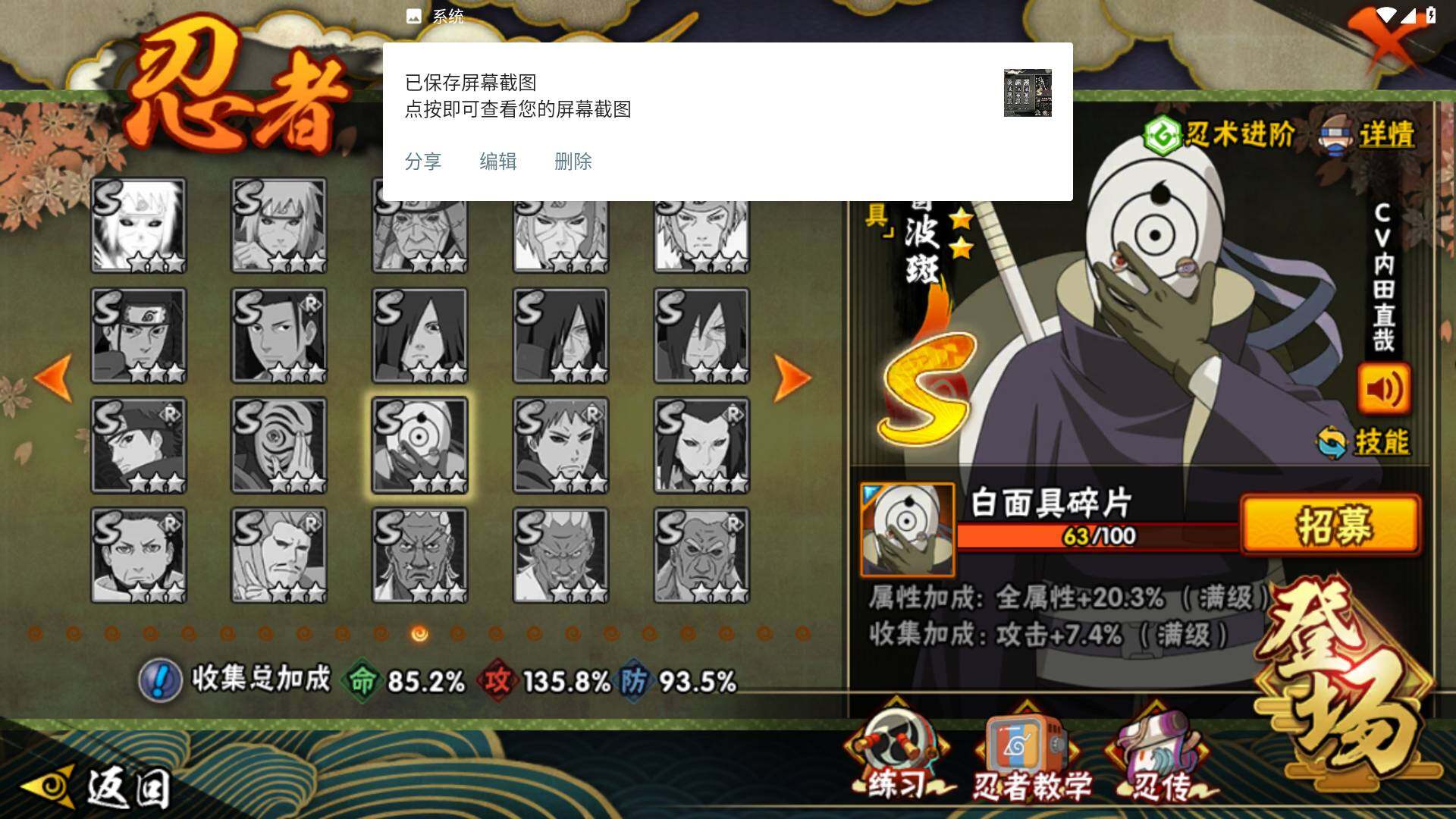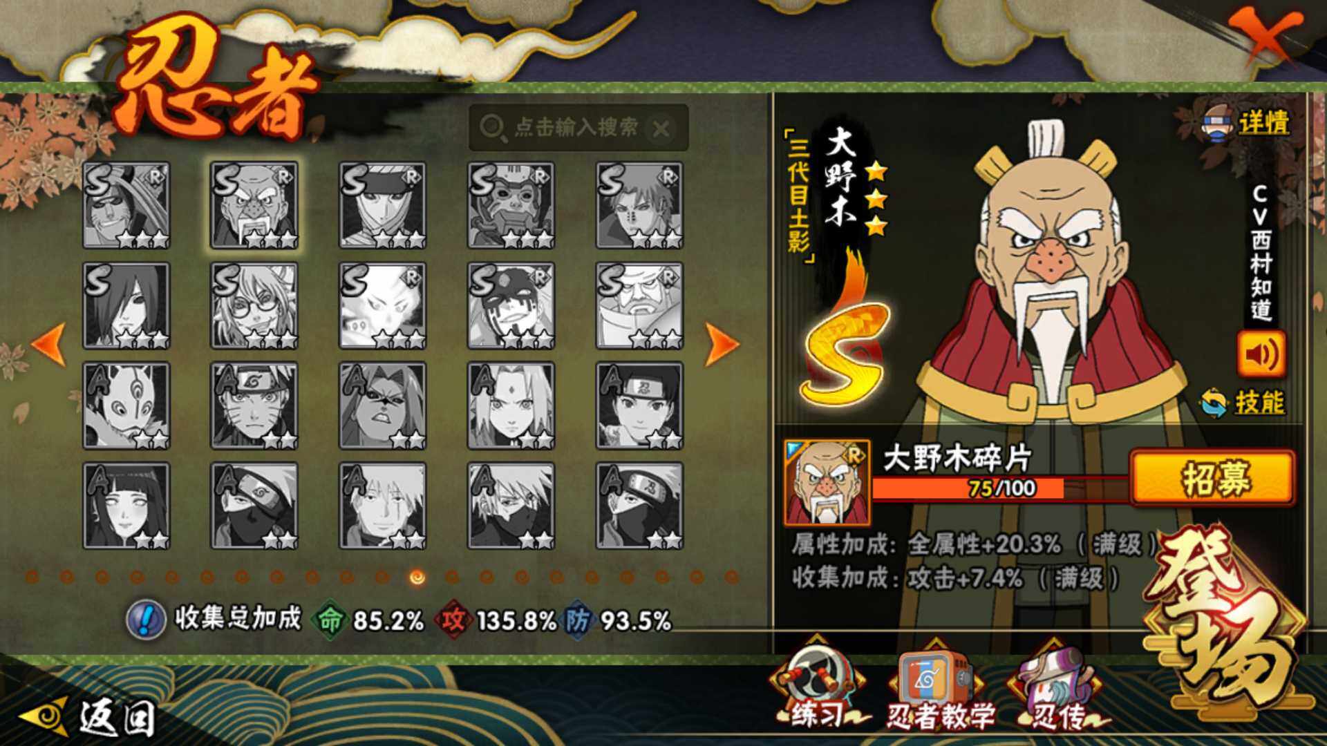 [14282363]v11 19s 32a 1240万战力 须佐卡卡西60片 传说自来也79片 秽土解斑50片 白面具63片 忍战艾68片 鬼灯幻月58片 大野木75片 zp3144 【s级忍者】:千手柱间「秽土转生」3星,宇智波鼬「秽土转生」3星,大野木「忍界大战」3星,春野樱「忍界大战」3星,宇智波带土「忍界大战」3星,宇智波鼬「须佐能乎」3星,宇智波斑「木叶创立」3星,自来也3星,自来也「仙人模式」3星,自来也「舞之豪杰」3星,大蛇丸3星,纲手5星,猿飞日斩4星,波风水门4星,神秘面具男「红夜之刃」3星,漩涡鸣人「九喇嘛连结」3星,迈特凯「死门」3星,佩恩「天道」3星,宇智波佐助「永恒万花筒」3星 【a级忍者】:艾「青年」2星,长门「青年」2星,波风水门「青年」3星,达鲁伊「博人传」2星,迪达拉2星,迪达拉「秽土转生」2星,奇拉比2星,奇拉比「忍界大战」2星,飞段3星,飞段「死司凭血」2星,干柿鬼鲛5星,漩涡鸣人「九尾查克拉」2星,迈特凯5星,桃地再不斩「秽土转生」2星,我爱罗「疾风传」4星,蝎5星,蝎「绯流琥」2星,猿飞阿斯玛5星,宇智波鼬2星,宇智波佐助「须佐能乎」2星,宇智波佐助「万花筒写轮眼」2星,照美冥「侠隐江湖」2星,照美冥「五代目水影」2星,日向宁次「忍界大战」2星,长十郎「六代目水影」2星,佩恩·六道「漂泊浪客」2星,李洛克「忍界大战」2星,千手扉间「漂泊武士」2星,秋道丁次「忍界大战」2星,千代「近松十人卫」2星,宇智波泉奈2星,不动2星