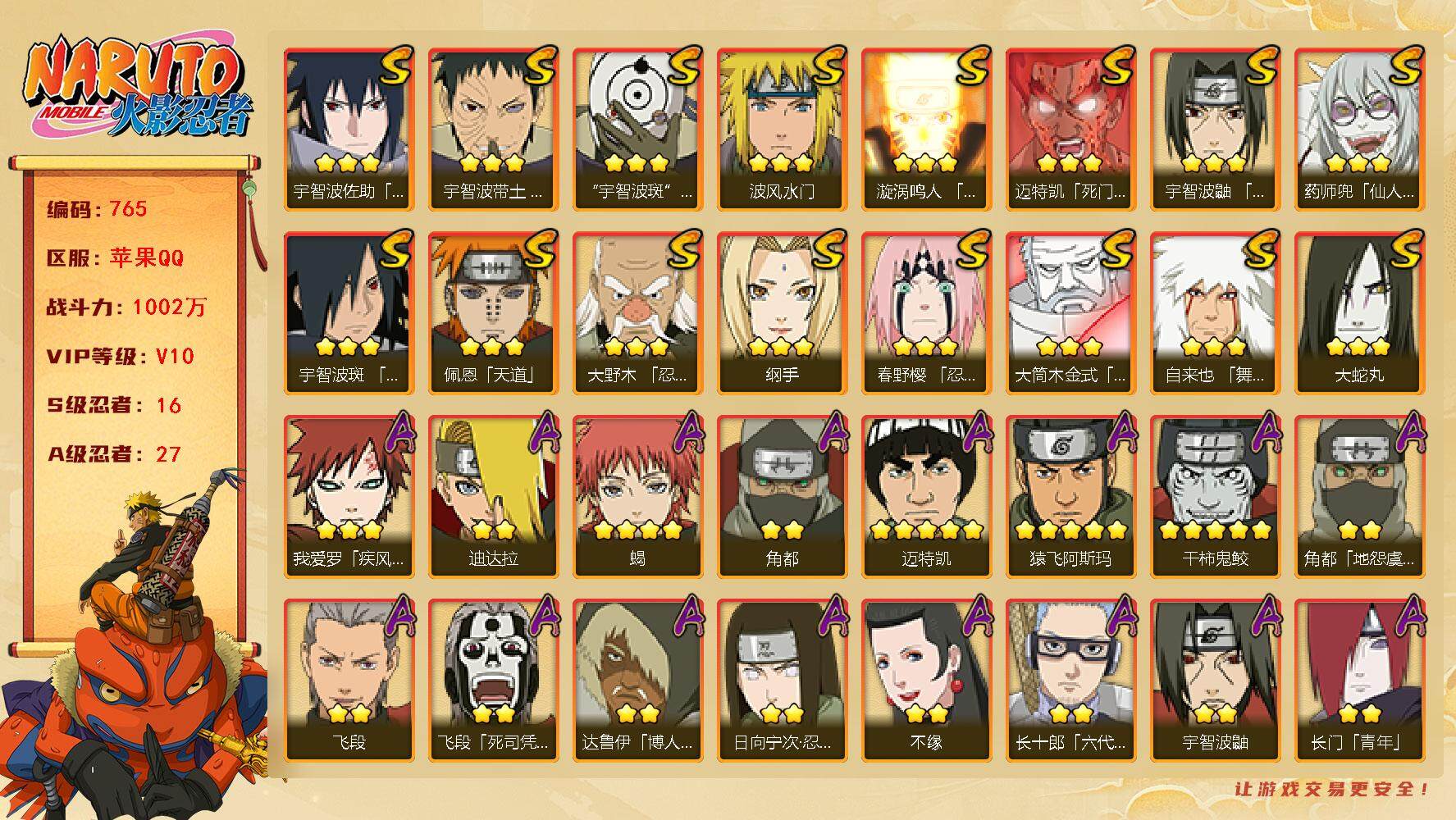 [14287333]v10 16s 27a 1002万战力 有熊猫 须佐卡卡西94片 秽土日斩52片 日斩73片 zp3065 脱榜需要稳定设备 【s级忍者】:大野木「忍界大战」3星,春野樱「忍界大战」3星,宇智波带土「忍界大战」3星,宇智波鼬「须佐能乎」3星,宇智波斑「木叶创立」3星,自来也「舞之豪杰」3星,大蛇丸3星,纲手3星,波风水门3星,药师兜「仙人模式」3星,漩涡鸣人「九喇嘛连结」3星,迈特凯「死门」3星,佩恩「天道」3星,宇智波佐助「永恒万花筒」3星,宇智波斑 「白面具」3星宇智波斑「白面具」,大筒木金式3星 【a级忍者】:艾「青年」2星,长门「青年」2星,波风水门「青年」2星,达鲁伊「博人传」2星,迪达拉2星,飞段2星,飞段「死司凭血」2星,干柿鬼鲛5星,迈特凯5星,我爱罗「疾风传」3星,蝎4星,角都2星,角都「地怨虞」2星,猿飞阿斯玛5星,宇智波鼬2星,宇智波佐助「须佐能乎」2星,宇智波佐助「万花筒写轮眼」2星,照美冥「五代目水影」2星,日向宁次「忍界大战」2星,日向雏田「最终章」2星,长十郎「六代目水影」2星,佩恩·六道「漂泊浪客」2星,黑土「博人传」2星,秋道丁次「忍界大战」2星,千代「近松十人卫」2星,不缘2星,宇智波泉奈2星