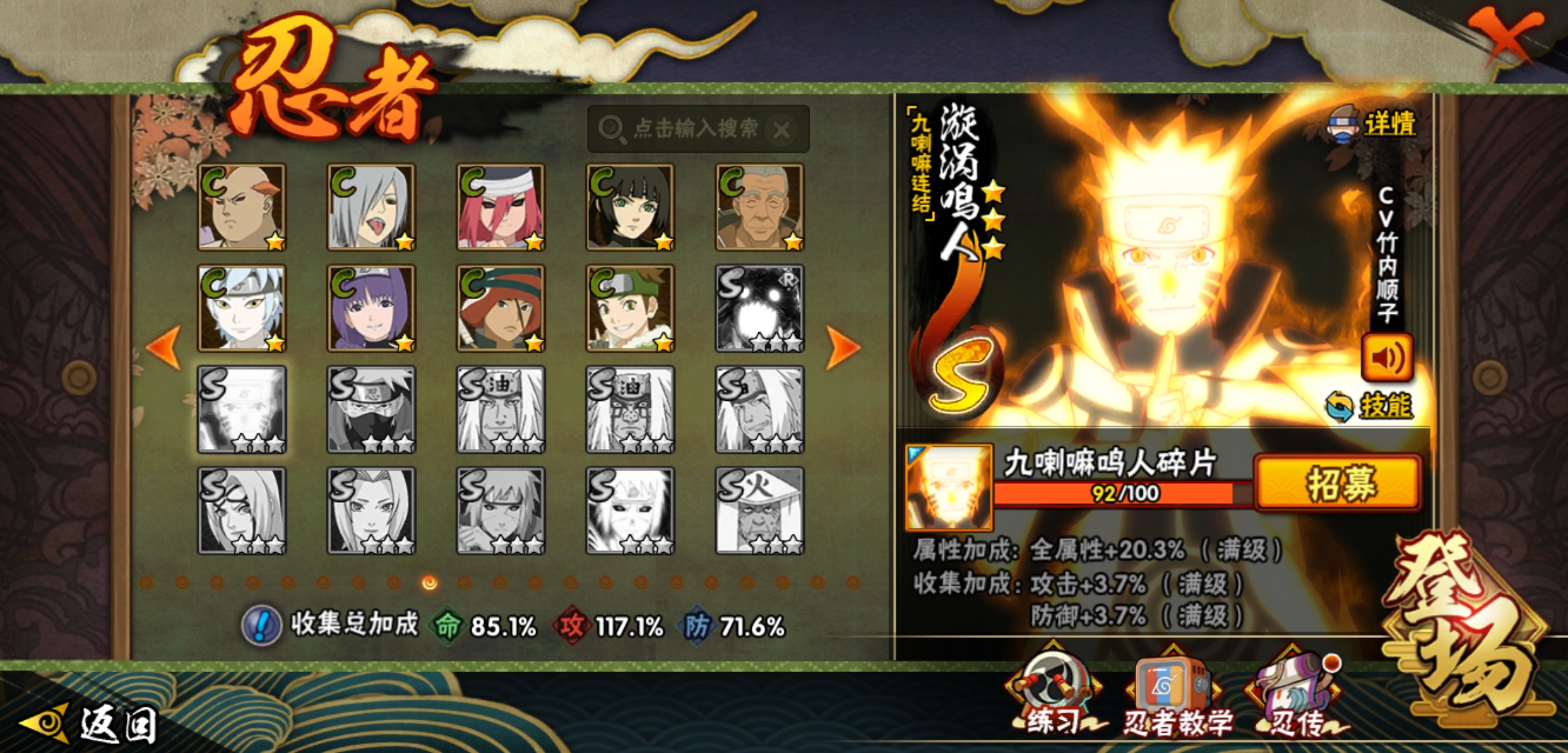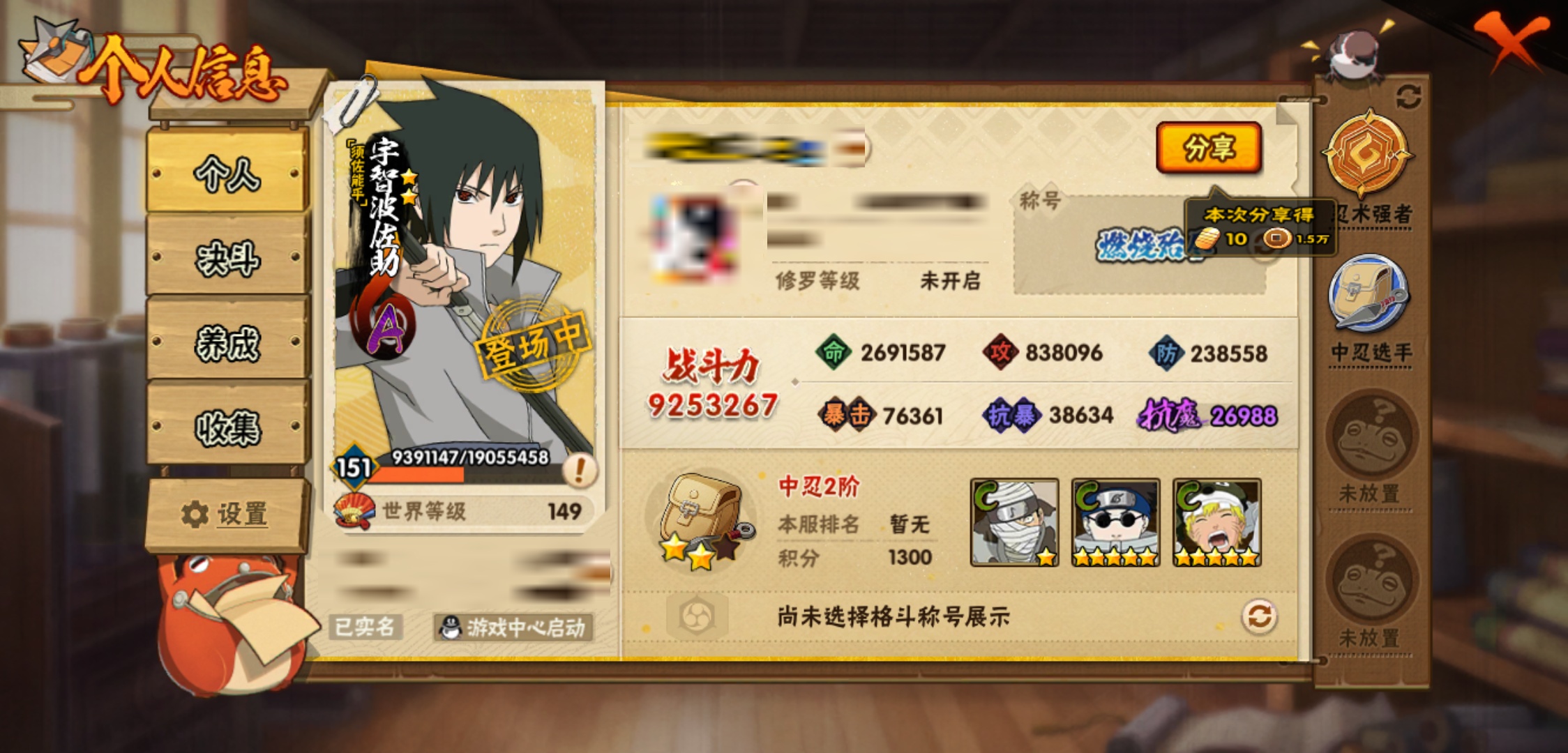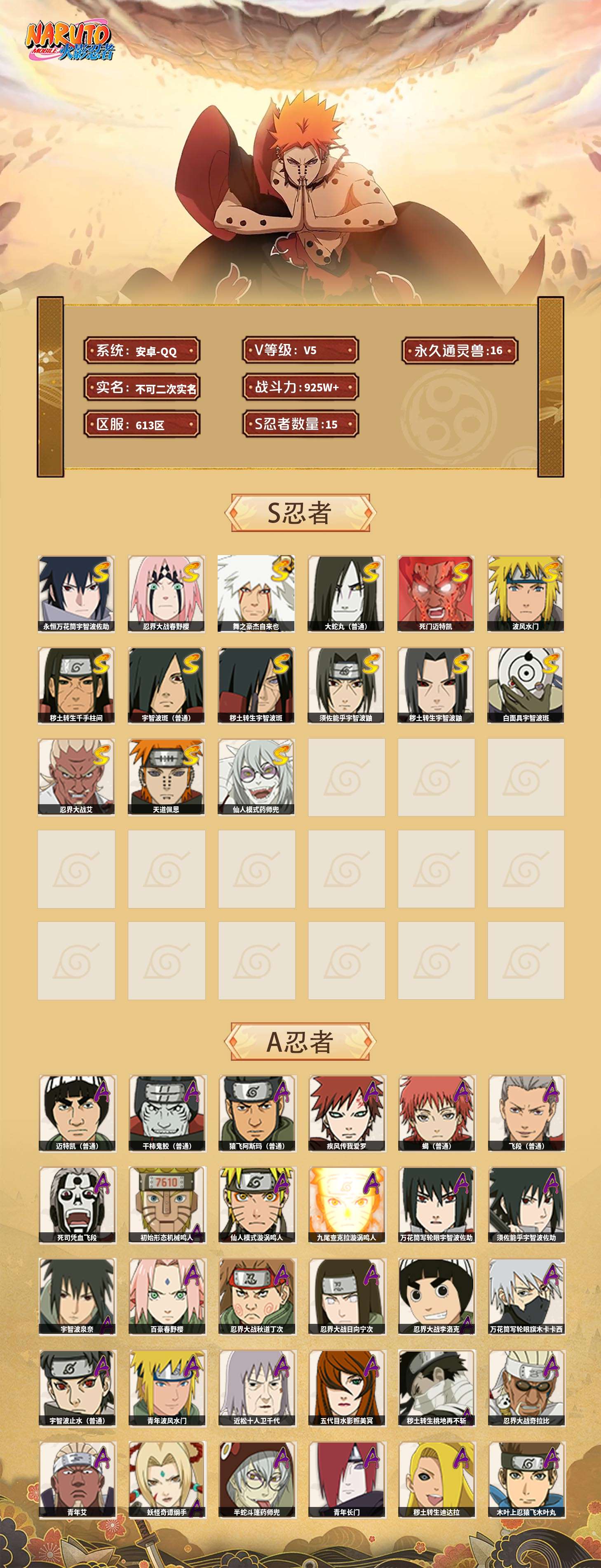 【火影忍者】【lyhy8909】战斗力:925w;段位:中忍2阶;本服排名:1134;vip:v5级;s忍:15个;a忍:34个;通灵兽:16个,s忍:永恒万花筒宇智波佐助|忍界大战春野樱|舞之豪杰自来也|大蛇丸(普通)|死门迈特凯|波风水门|秽土转生千手柱间|宇智波斑(普通)|秽土转生宇智波斑|须佐能乎宇智波鼬|秽土转生宇智波鼬|白面具宇智波斑|忍界大战艾|天道佩恩|仙人模式药师兜__a忍:迈特凯(普通) 5星|干柿鬼鲛(普通) 5星|猿飞阿斯玛(普通) 4星|疾风传我爱罗 4星|蝎(普通) 3星|飞段(普通) 3星|死司凭血飞段 3星|初始形态机械鸣人|仙人模式漩涡鸣人|九尾查克拉漩涡鸣人|万花筒写轮眼宇智波佐助|须佐能乎宇智波佐助|宇智波泉奈|百豪春野樱|忍界大战秋道丁次|忍界大战日向宁次|忍界大战李洛克|万花筒写轮眼旗木卡卡西|宇智波止水(普通)|青年波风水门|近松十人卫千代|五代目水影照美冥|秽土转生桃地再不斩|忍界大战奇拉比|青年艾|妖怪奇谭纲手|半蛇斗篷药师兜|青年长门|秽土转生迪达拉|木叶上忍猿飞木叶丸|五代目雷影达鲁伊|六代目水影长十郎|桃式显现漩涡博人|四代目土影黑土__通灵兽:忍犬(普通)|蓝蛇|蛤蟆吉|忍龟|镰鼬|猿魔|山椒鱼|蜃|蛤蟆仙人|鲛鲨|蛤蟆健|乌鸦(普通)|蛤蟆龙|蛤蟆广|砂之守鹤|梦貘