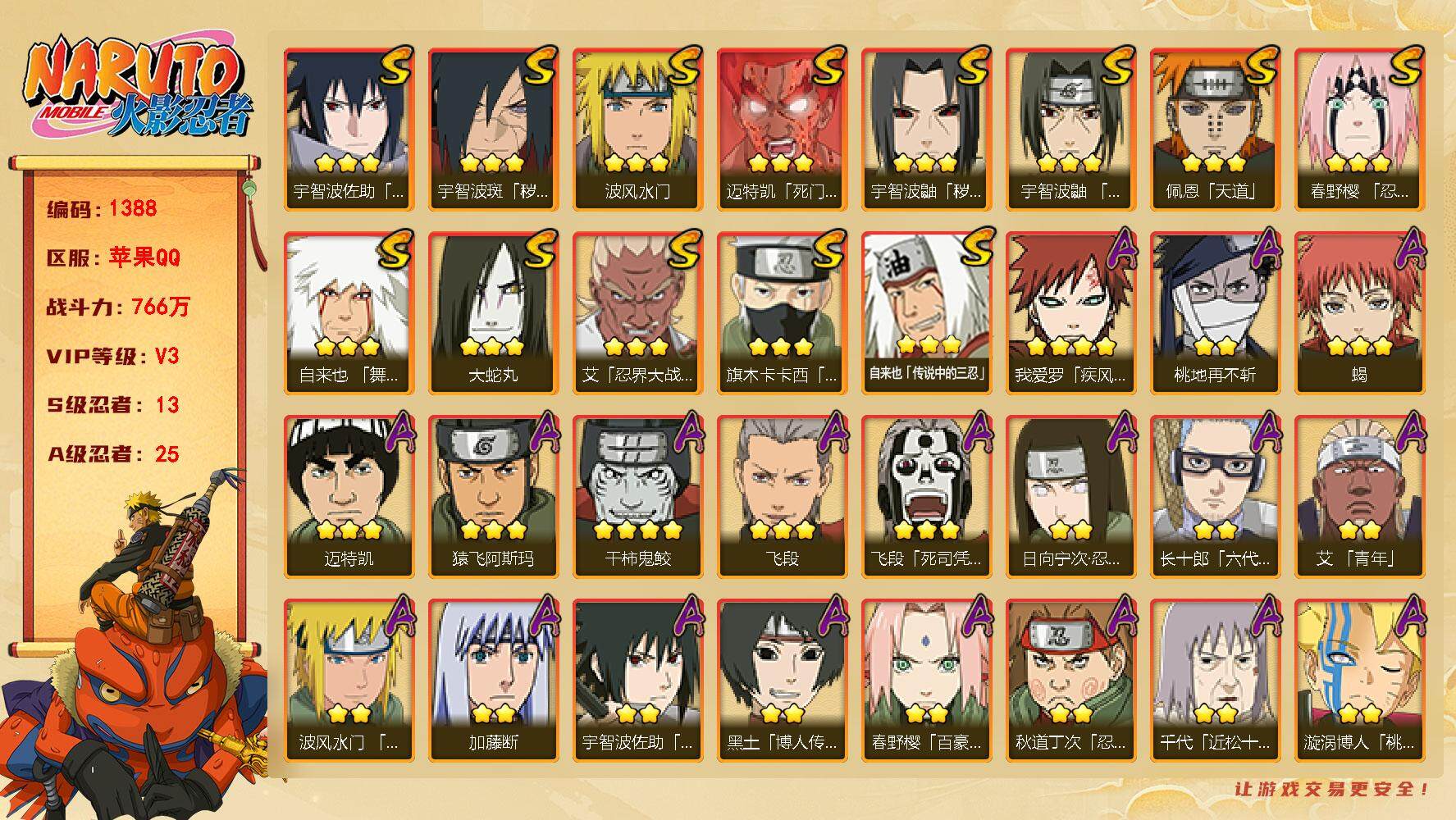 [14309565]v3,766w战力,13s忍,25a忍,me1700 【s级忍者】:宇智波鼬「秽土转生」3星,宇智波斑「秽土转生·解」3星,春野樱「忍界大战」3星,艾「忍界大战」3星,宇智波鼬「须佐能乎」3星,旗木卡卡西「须佐能乎」3星,自来也「舞之豪杰」3星,大蛇丸3星,自来也「传说中的三忍」3星,波风水门3星,迈特凯「死门」3星,佩恩「天道」3星,宇智波佐助「永恒万花筒」3星 【a级忍者】:艾「青年」2星,波风水门「青年」2星,飞段3星,飞段「死司凭血」3星,干柿鬼鲛4星,漩涡博人「桃式显现」2星,迈特凯3星,旗木卡卡西「幻之真容」2星,桃地再不斩2星,桃地再不斩「秽土转生」2星,我爱罗「疾风传」4星,蝎3星,蝎「绯流琥」2星,猿飞阿斯玛3星,宇智波佐助「须佐能乎」2星,日向宁次「忍界大战」2星,长十郎「六代目水影」2星,李洛克「忍界大战」2星,黑土「博人传」2星,春野樱「百豪」2星,秋道丁次「忍界大战」2星,千代「近松十人卫」2星,加藤断2星,宇智波泉奈2星,不动2星