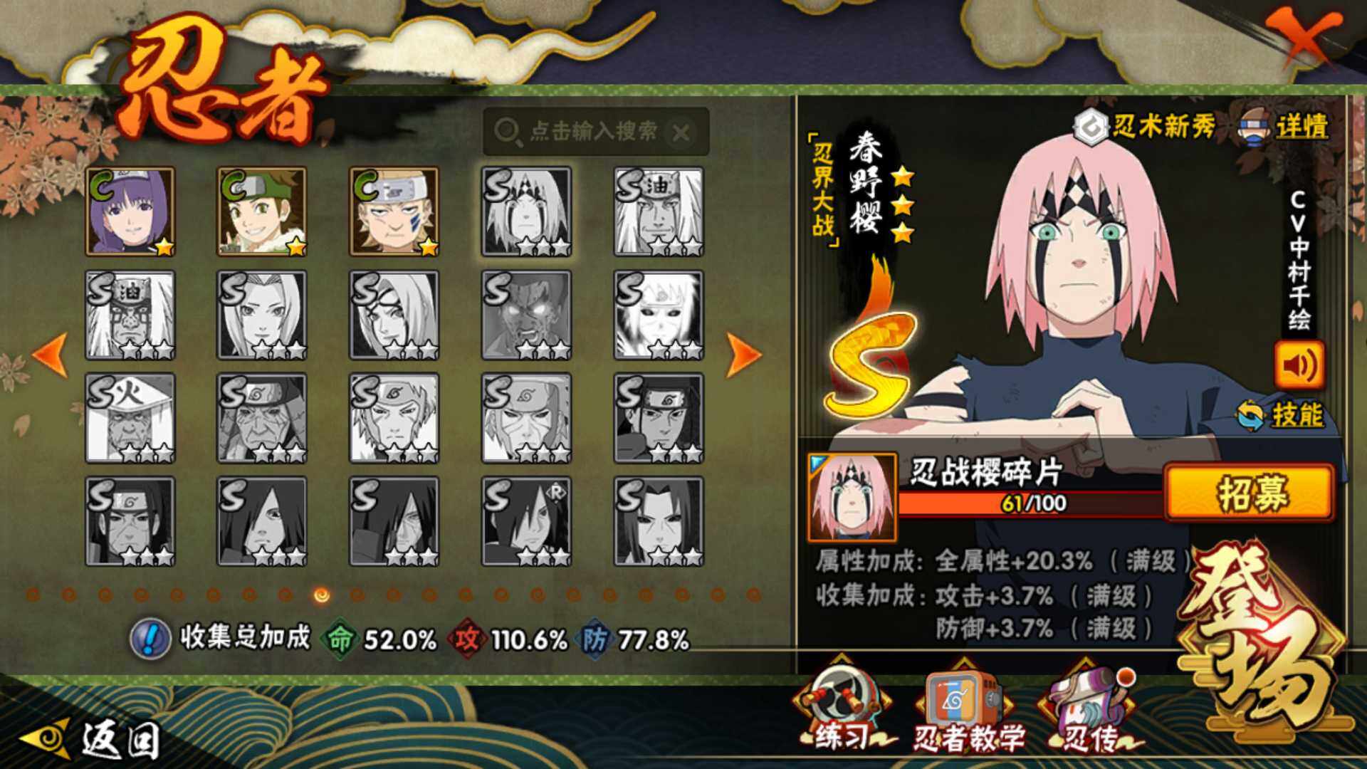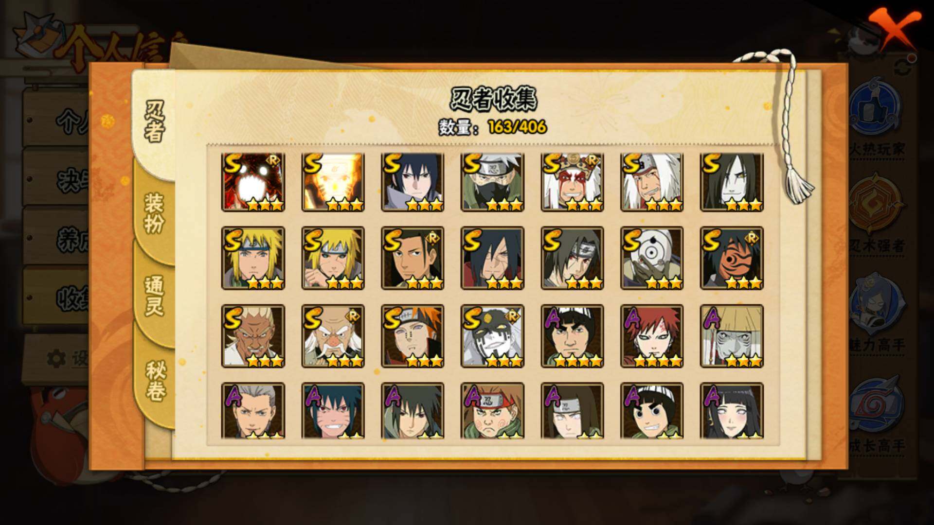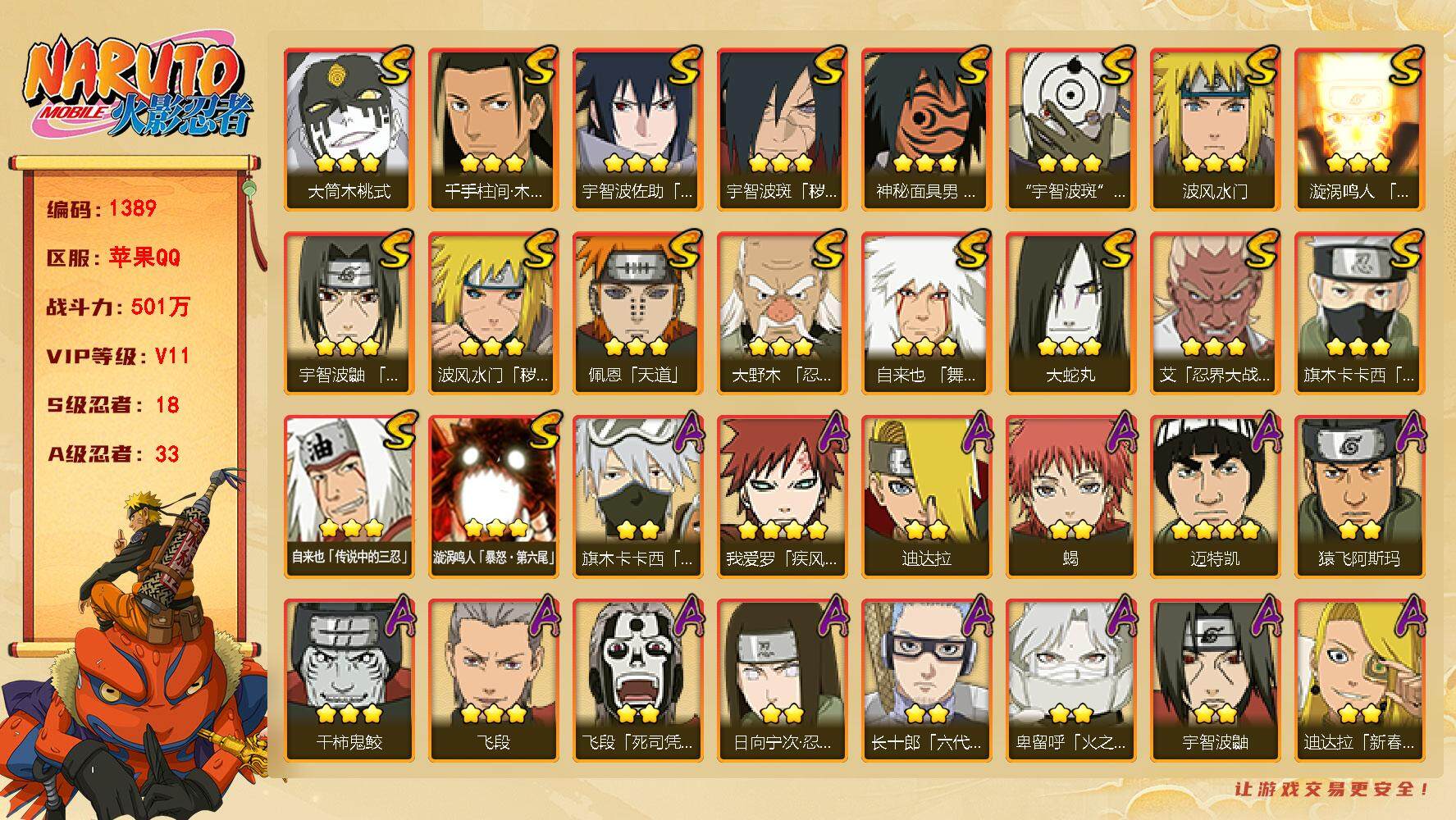 [14311340]v11,501w战力,18s忍,33a忍,忍战樱61片,死门凯58片,须佐止水65片,博人传金氏80片,最终章舍人60片,me1701 【s级忍者】:波风水门「秽土转生」3星,宇智波斑「秽土转生·解」3星,大野木「忍界大战」3星,艾「忍界大战」3星,宇智波鼬「须佐能乎」3星,旗木卡卡西「须佐能乎」3星,千手柱间「木叶创立」3星,自来也「舞之豪杰」3星,大蛇丸3星,自来也「传说中的三忍」3星,波风水门3星,神秘面具男「红夜之刃」3星,漩涡鸣人「九喇嘛连结」3星,佩恩「天道」3星,宇智波佐助「永恒万花筒」3星,宇智波斑 「白面具」3星宇智波斑「白面具」,大筒木桃式3星,漩涡鸣人「暴怒·第六尾」3星 【a级忍者】:艾「青年」2星,波风水门「青年」2星,迪达拉2星,迪达拉「新春限定」2星,大蛇丸「晓」2星,飞段3星,飞段「死司凭血」2星,干柿鬼鲛3星,漩涡博人「桃式显现」2星,迈特凯4星,旗木卡卡西「元气夏日」2星,旗木卡卡西「幻之真容」2星,我爱罗「疾风传」4星,蝎2星,蝎「绯流琥」2星,小南「漂泊浪客」2星,角都「晓创生」2星,角都「秽土转生」2星,猿飞阿斯玛2星,宇智波鼬2星,药师兜「侠影江湖」2星,照美冥「五代目水影」2星,日向宁次「忍界大战」2星,日向雏田「最终章」2星,宇智波带土「漂泊浪客」2星,长十郎「六代目水影」2星,卑留呼「火之意志继承者」2星,神秘面具男「忍者之路」2星,佩恩·六道「漂泊浪客」2星,李洛克「忍界大战」2星,秋道丁次「忍界大战」2星,神农「羁绊」2星,宇智波泉奈2星