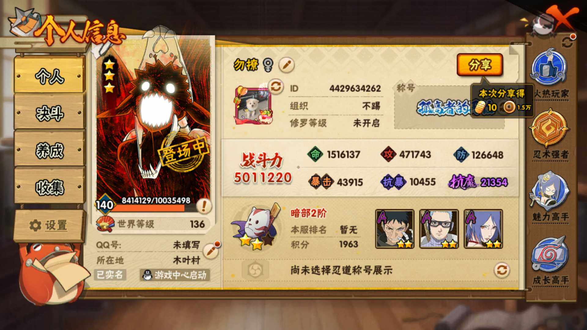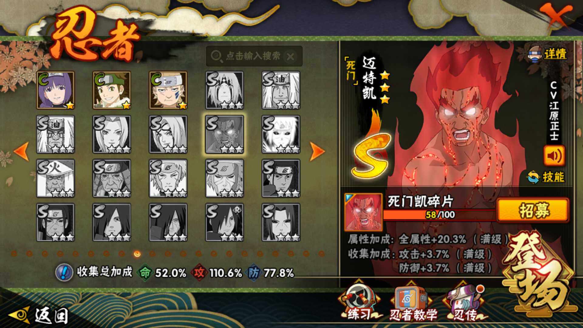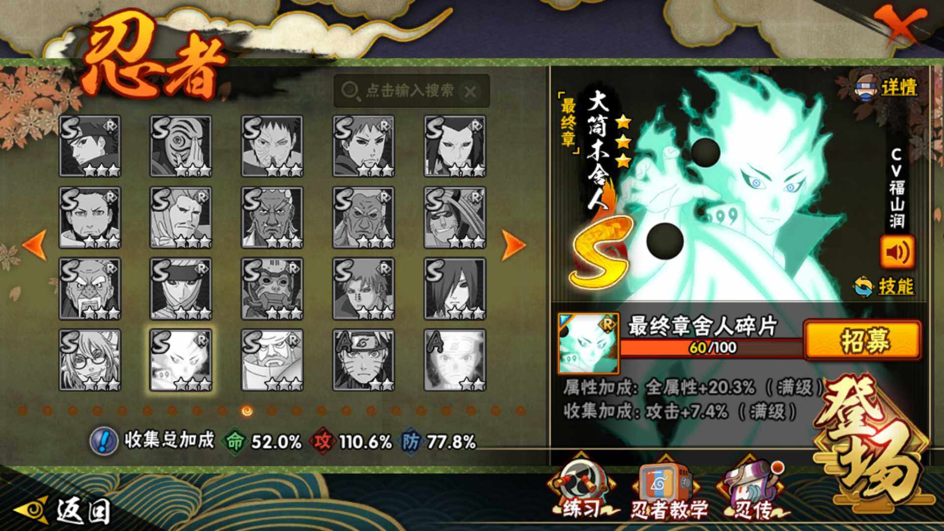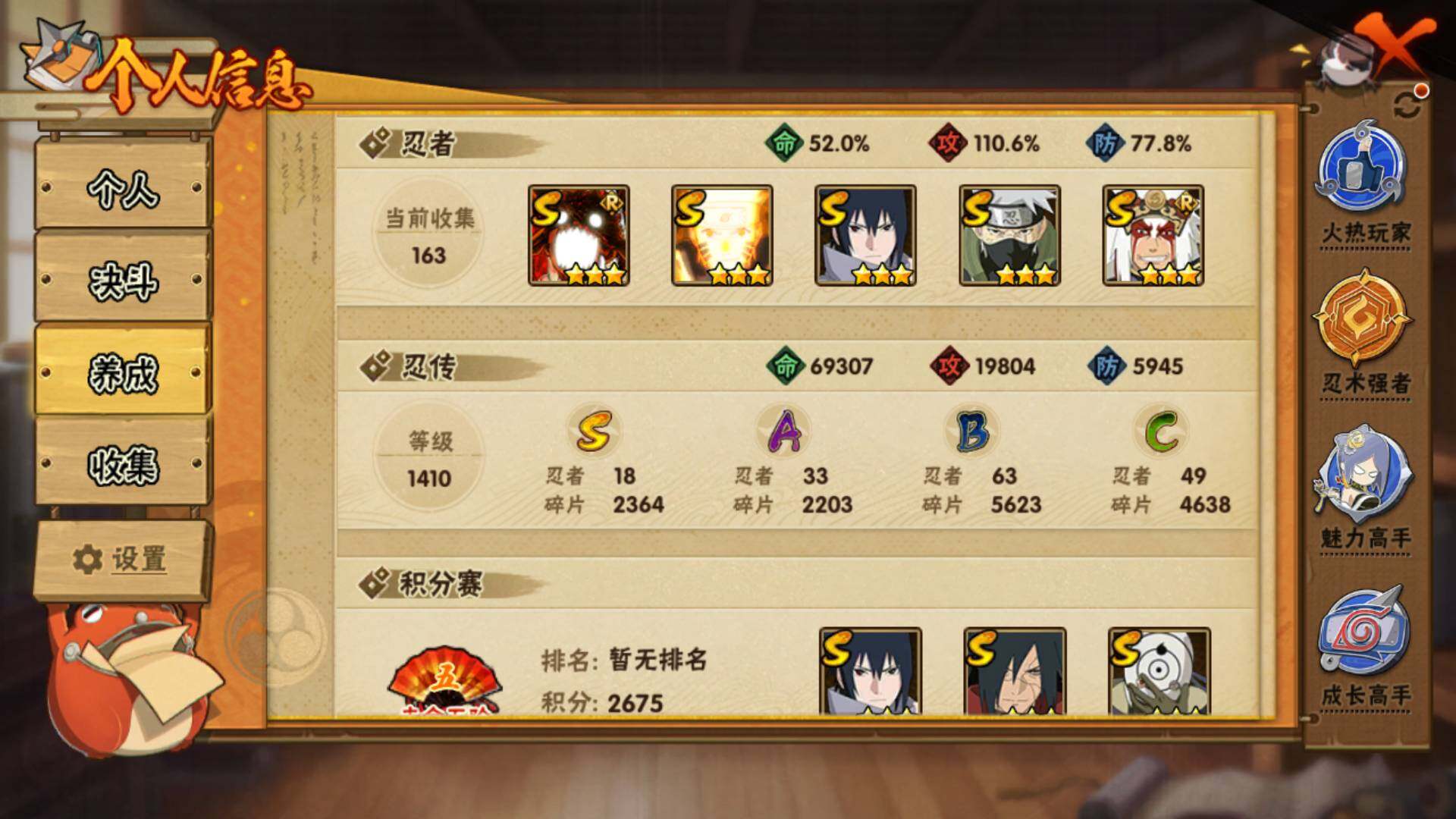 [14311340]v11,501w战力,18s忍,33a忍,忍战樱61片,死门凯58片,须佐止水65片,博人传金氏80片,最终章舍人60片,me1701 【s级忍者】:波风水门「秽土转生」3星,宇智波斑「秽土转生·解」3星,大野木「忍界大战」3星,艾「忍界大战」3星,宇智波鼬「须佐能乎」3星,旗木卡卡西「须佐能乎」3星,千手柱间「木叶创立」3星,自来也「舞之豪杰」3星,大蛇丸3星,自来也「传说中的三忍」3星,波风水门3星,神秘面具男「红夜之刃」3星,漩涡鸣人「九喇嘛连结」3星,佩恩「天道」3星,宇智波佐助「永恒万花筒」3星,宇智波斑 「白面具」3星宇智波斑「白面具」,大筒木桃式3星,漩涡鸣人「暴怒·第六尾」3星 【a级忍者】:艾「青年」2星,波风水门「青年」2星,迪达拉2星,迪达拉「新春限定」2星,大蛇丸「晓」2星,飞段3星,飞段「死司凭血」2星,干柿鬼鲛3星,漩涡博人「桃式显现」2星,迈特凯4星,旗木卡卡西「元气夏日」2星,旗木卡卡西「幻之真容」2星,我爱罗「疾风传」4星,蝎2星,蝎「绯流琥」2星,小南「漂泊浪客」2星,角都「晓创生」2星,角都「秽土转生」2星,猿飞阿斯玛2星,宇智波鼬2星,药师兜「侠影江湖」2星,照美冥「五代目水影」2星,日向宁次「忍界大战」2星,日向雏田「最终章」2星,宇智波带土「漂泊浪客」2星,长十郎「六代目水影」2星,卑留呼「火之意志继承者」2星,神秘面具男「忍者之路」2星,佩恩·六道「漂泊浪客」2星,李洛克「忍界大战」2星,秋道丁次「忍界大战」2星,神农「羁绊」2星,宇智波泉奈2星