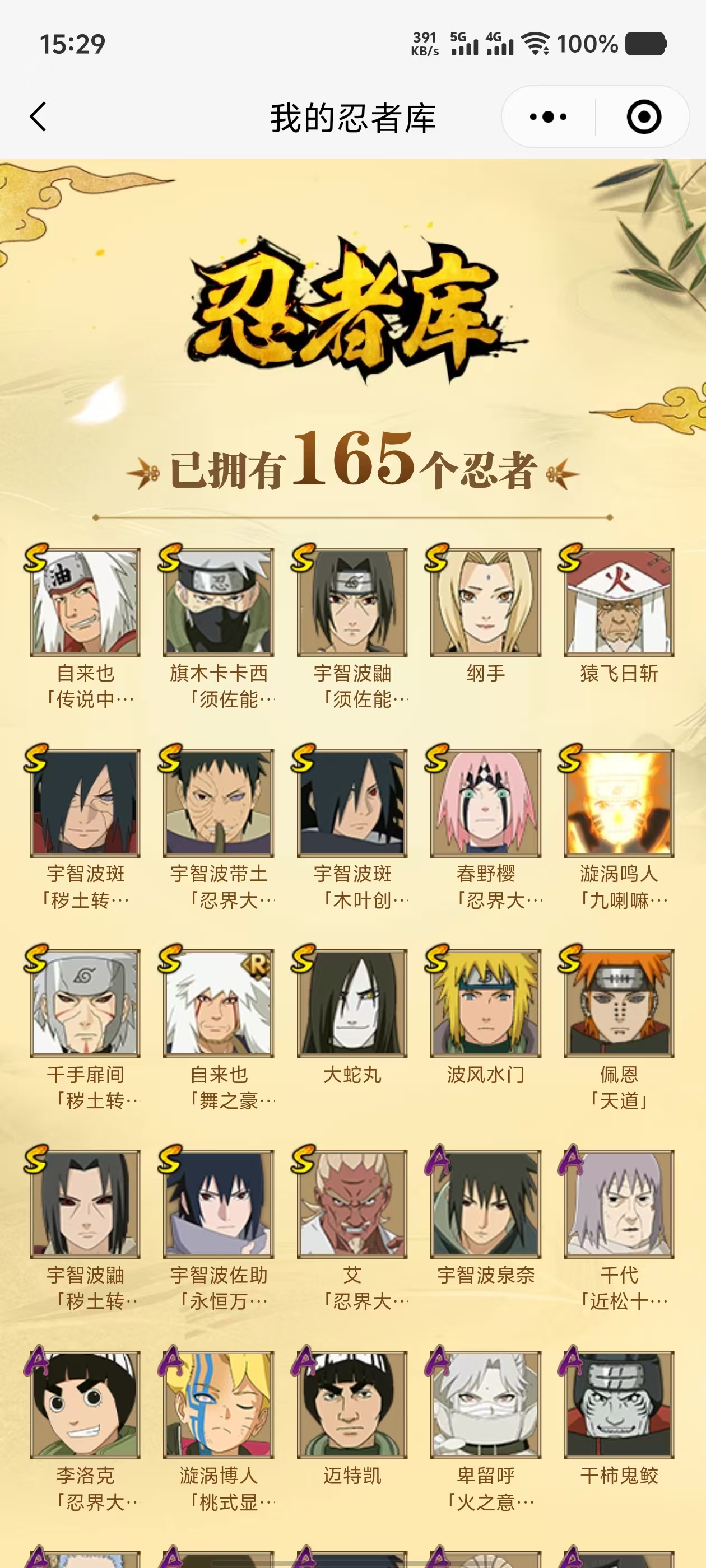2200815-18s忍/30a忍/战力832w/v9/区服1497 【s忍者】 艾「忍界大战」,宇智波斑「秽土转生·解」,宇智波佐助「永恒万花筒」,春野樱「忍界大战」,漩涡鸣人「九喇嘛连结」,宇智波斑「木叶创立」,宇智波带土「忍界大战」,自来也「舞之豪杰」,旗木卡卡西「须佐能乎」,自来也「传说中的三忍」,宇智波鼬「秽土转生」,千手扉间「秽土转生」,宇智波鼬「须佐能乎」,佩恩「天道」,猿飞日