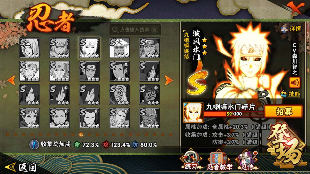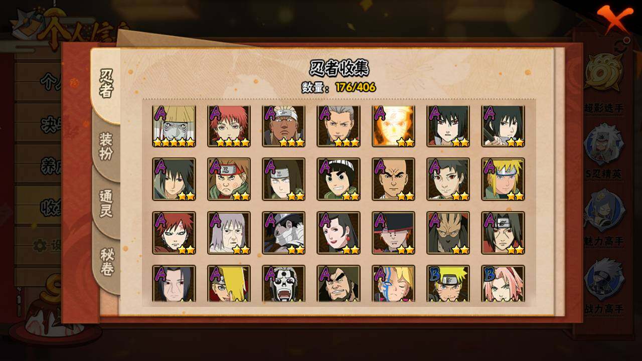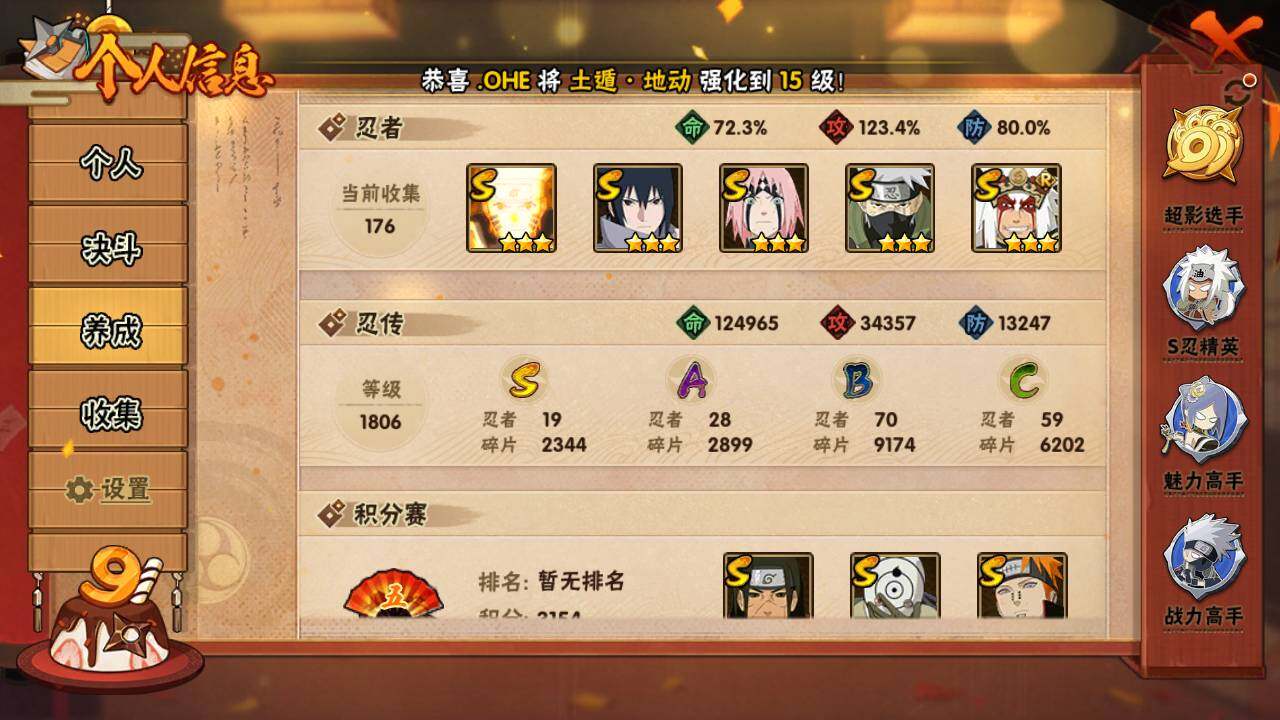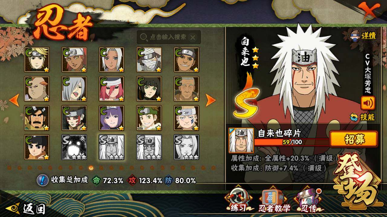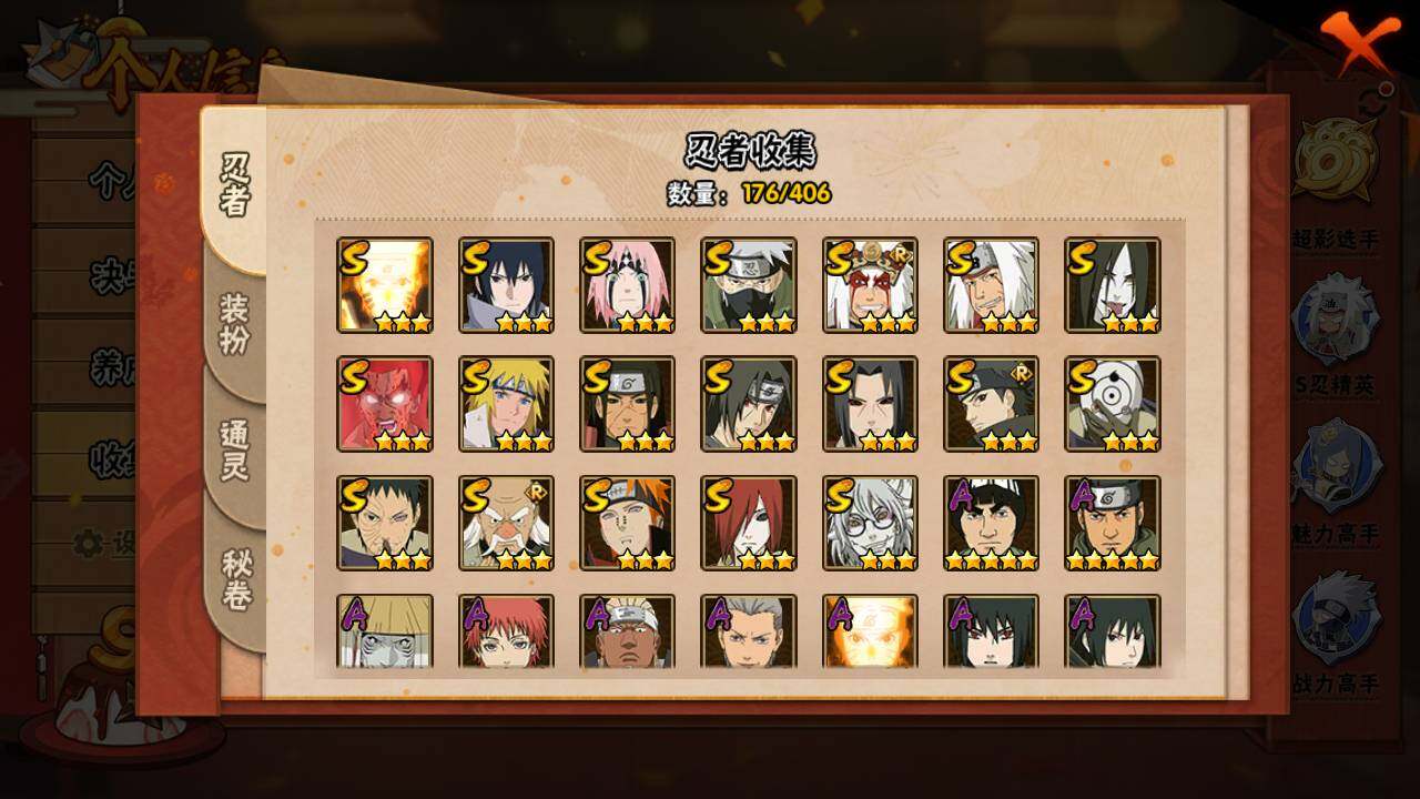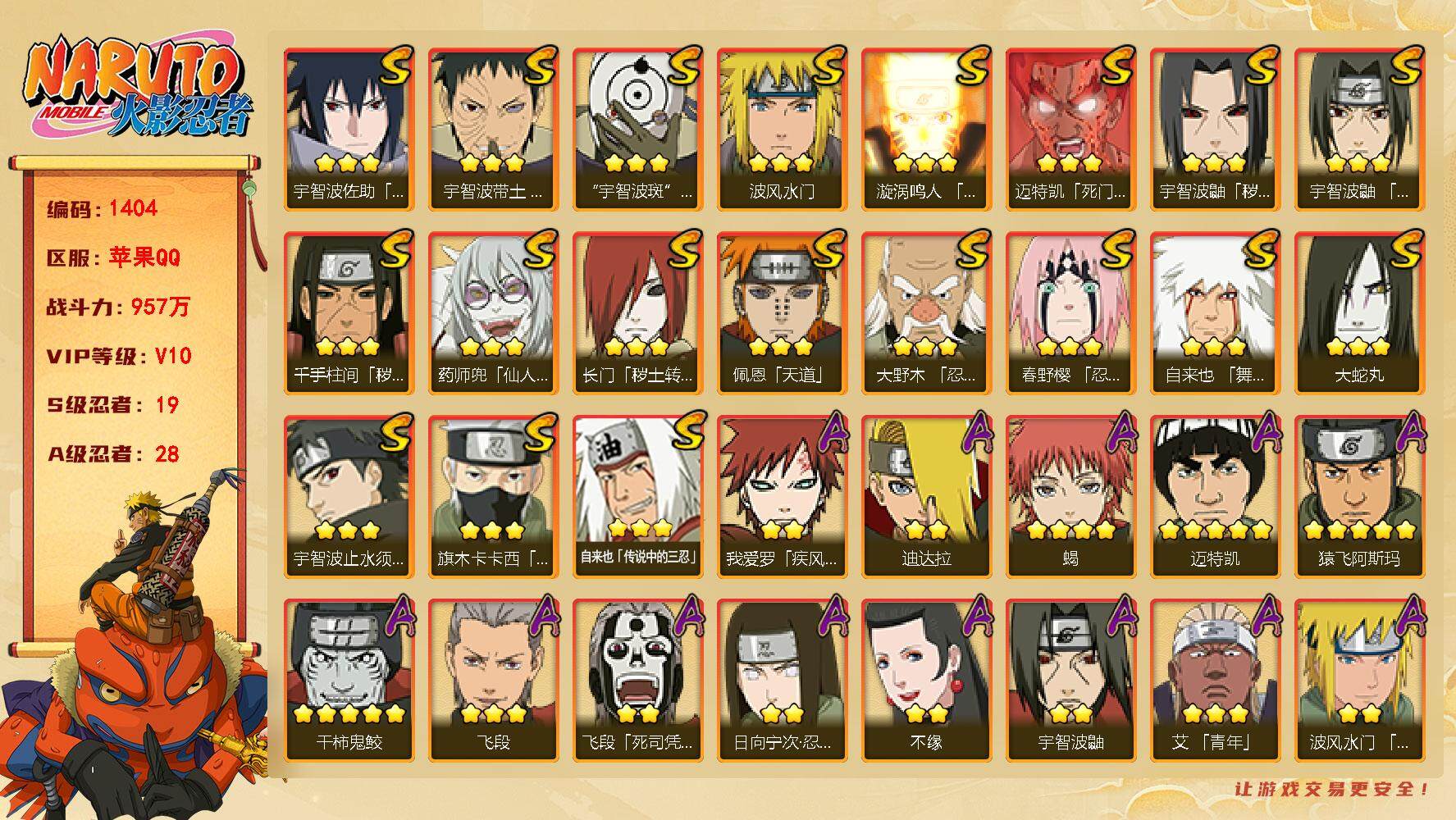 [14323133]v10 957万战力 19s级忍者数-28a级忍者数 自来也59片九喇嘛水门59片 创立柱间89片ll5185 【s级忍者】:长门「秽土转生」3星,千手柱间「秽土转生」3星,宇智波鼬「秽土转生」3星,大野木「忍界大战」3星,春野樱「忍界大战」3星,宇智波带土「忍界大战」3星,宇智波鼬「须佐能乎」3星,宇智波止水「须佐能乎」3星,旗木卡卡西「须佐能乎」3星,自来也「舞之豪杰」3星,大蛇丸3星,自来也「传说中的三忍」3星,波风水门3星,药师兜「仙人模式」3星,漩涡鸣人「九喇嘛连结」3星,迈特凯「死门」3星,佩恩「天道」3星,宇智波佐助「永恒万花筒」3星,宇智波斑 「白面具」3星宇智波斑「白面具」 【a级忍者】:艾「青年」3星,波风水门「青年」2星,迪达拉2星,飞段3星,飞段「死司凭血」2星,干柿鬼鲛5星,漩涡博人「桃式显现」2星,漩涡鸣人「九尾查克拉」2星,迈特凯5星,桃地再不斩「秽土转生」2星,我爱罗「疾风传」2星,蝎4星,蝎「绯流琥」2星,猿飞阿斯玛5星,宇智波止水「新春限定」2星,宇智波鼬2星,宇智波鼬「夏日限定」2星,宇智波佐助「须佐能乎」2星,宇智波佐助「万花筒写轮眼」2星,日向宁次「忍界大战」2星,佩恩·六道「漂泊浪客」2星,李洛克「忍界大战」2星,秋道丁次「忍界大战」2星,千代「近松十人卫」2星,神农「羁绊」2星,不缘2星,地陆2星,宇智波泉奈2星