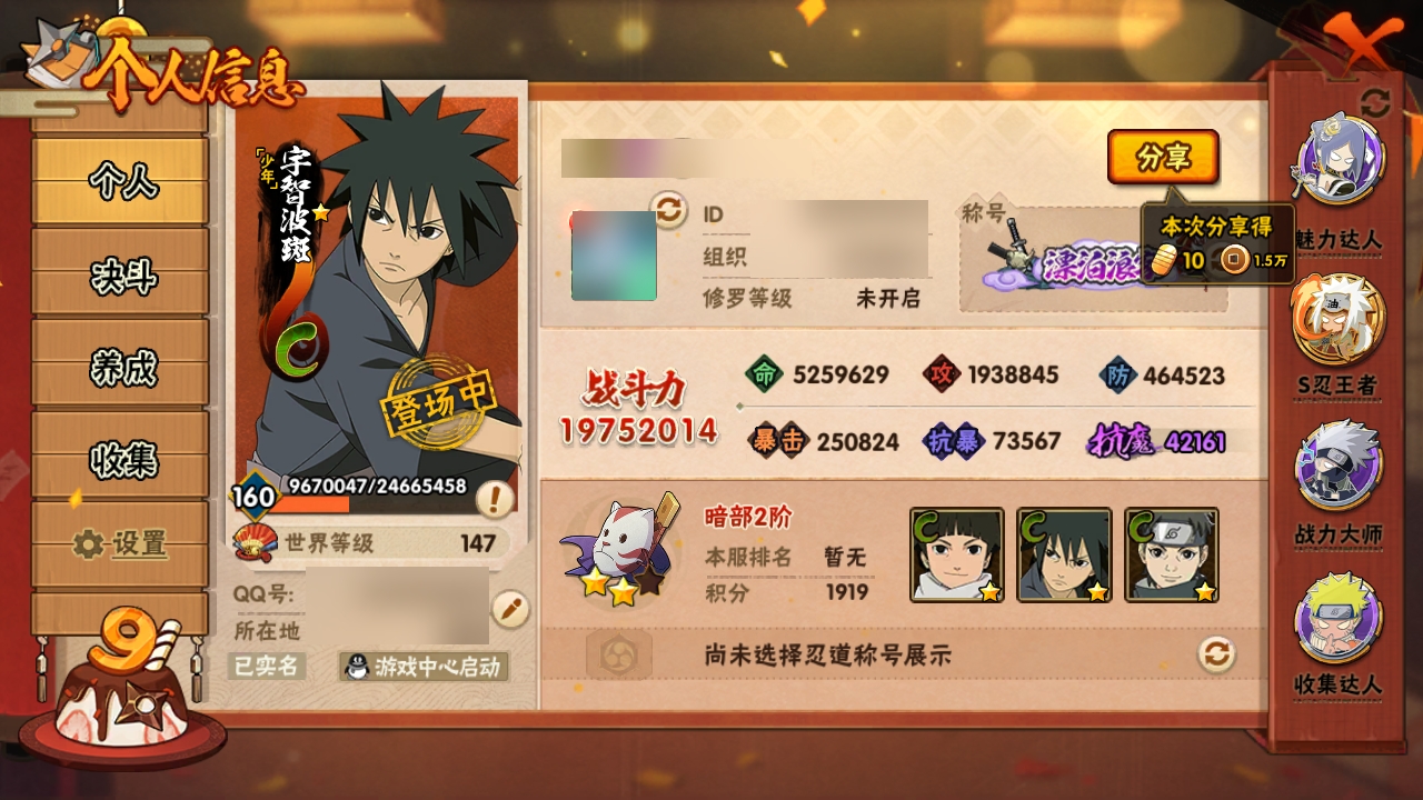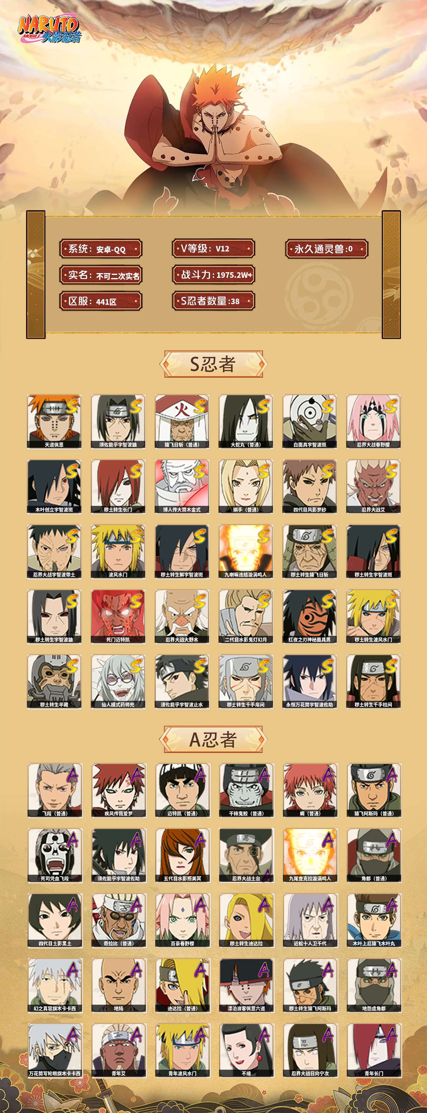 【火影忍者】【lyhy8946】s忍数量:38,a忍数量:54,s忍:天道佩恩 4星|须佐能乎宇智波鼬 4星|猿飞日斩(普通) 4星|大蛇丸(普通) 4星|白面具宇智波斑|忍界大战春野樱|木叶创立宇智波斑|秽土转生长门|博人传大筒木金式|纲手(普通)|四代目风影罗砂|忍界大战艾|忍界大战宇智波带土|波风水门|秽土转生解宇智波斑|九喇嘛连结漩涡鸣人|秽土转生猿飞日斩|秽土转生宇智波斑|秽土转生宇智波鼬|死门迈特凯|忍界大战大野木|二代目水影鬼灯幻月|红夜之刃神秘面具男|秽土转生波风水门|秽土转生半藏|仙人模式药师兜|须佐能乎宇智波止水|秽土转生千手扉间|永恒万花筒宇智波佐助|秽土转生千手柱间|自来也(普通)|秽土转生金角银角|宇智波斑(普通)|超佩恩天道|舞之豪杰自来也|须佐能乎旗木卡卡西|传说中的三忍自来也|九喇嘛连结波风水门,a忍:飞段(普通) 5星|疾风传我爱罗 5星|迈特凯(普通) 5星|干柿鬼鲛(普通) 5星|蝎(普通) 5星|猿飞阿斯玛(普通) 5星|死司凭血飞段 5星|须佐能乎宇智波佐助 3星|五代目水影照美冥 3星|忍界大战土台 3星|九尾查克拉漩涡鸣人|角都(普通)|四代目土影黑土|奇拉比(普通)|百豪春野樱|秽土转生迪达拉|近松十人卫千代|木叶上忍猿飞木叶丸|幻之真容旗木卡卡西|地陆|迪达拉(普通)|漂泊浪客佩恩六道|秽土转生猿飞阿斯玛|地怨虞角都|万花筒写轮眼旗木卡卡西|青年艾|青年波风水门|不缘|忍界大战日向宁次|青年长门|万花筒写轮眼宇智波佐助|六代目水影长十郎|半蛇斗篷药师兜|不风|加藤断|五代目雷影达鲁伊|小南(普通)|仙人模式漩涡鸣人|晓大蛇丸|宇智波鼬(普通)|志村团藏|最终章日向雏田|忍界大战秋道丁次|忍界大战奇拉比|忍界大战我爱罗|宇智波止水(普通)|桃式显现漩涡博人|忍界大战李洛克|不动|绯流琥蝎|宇智波泉奈|漂泊浪客宇智波带土|秽土转生桃地再不斩|侠隐江湖大野木1,战斗力:1975w;vip:v12级