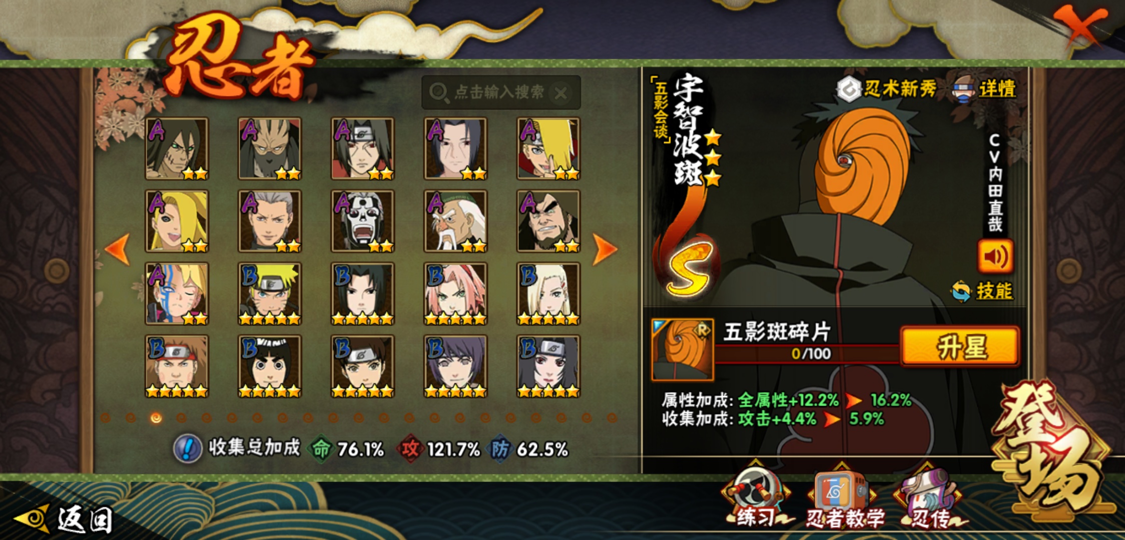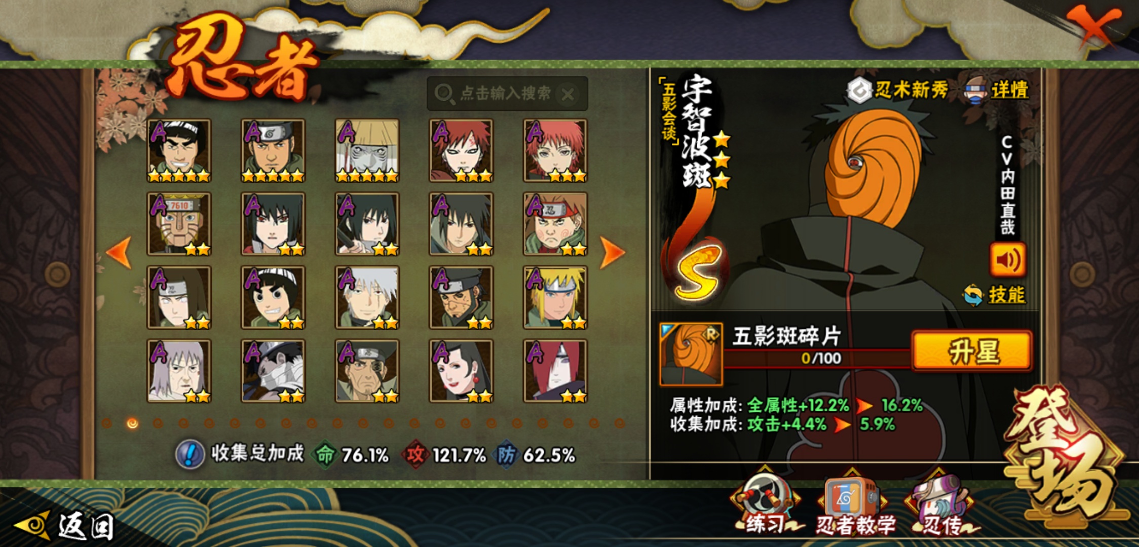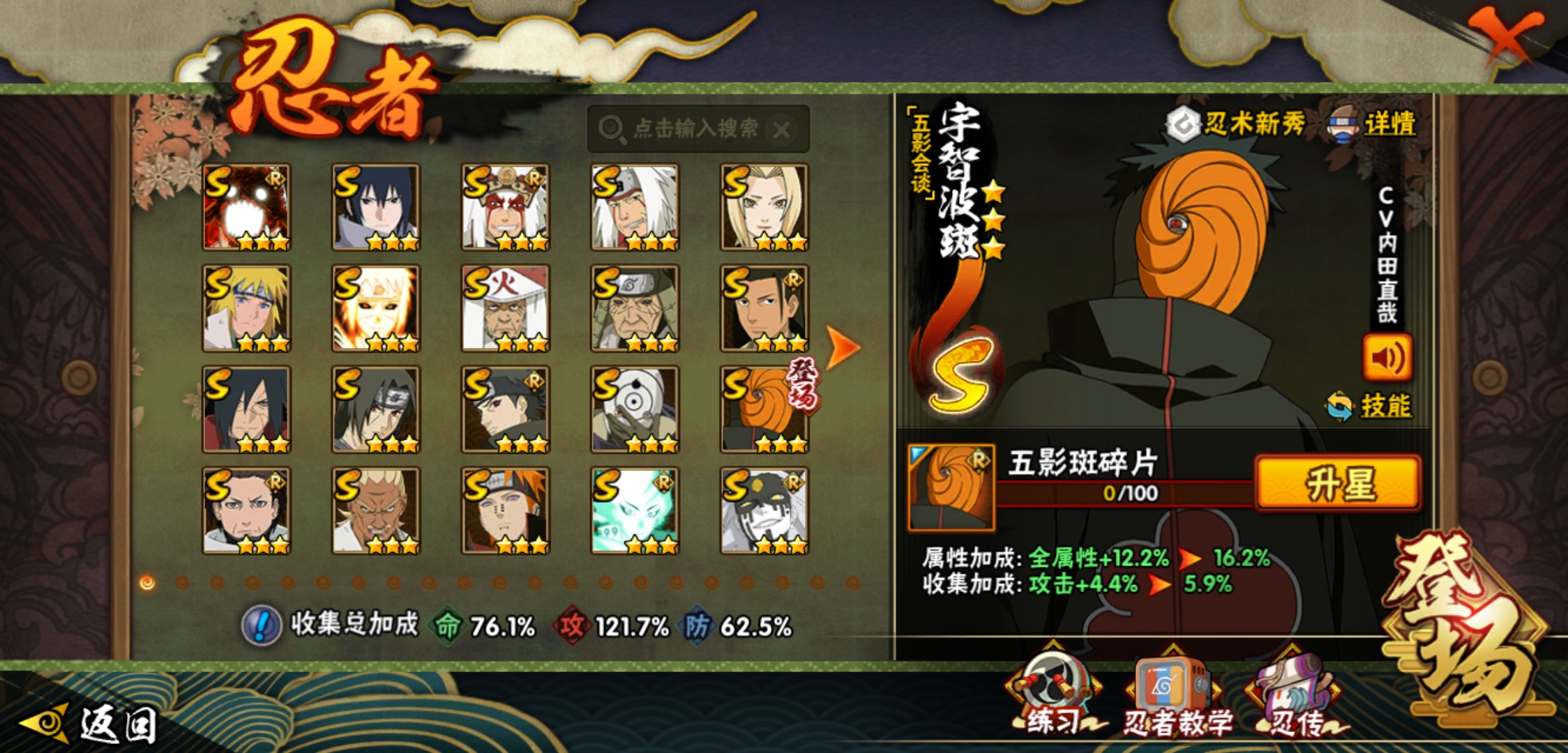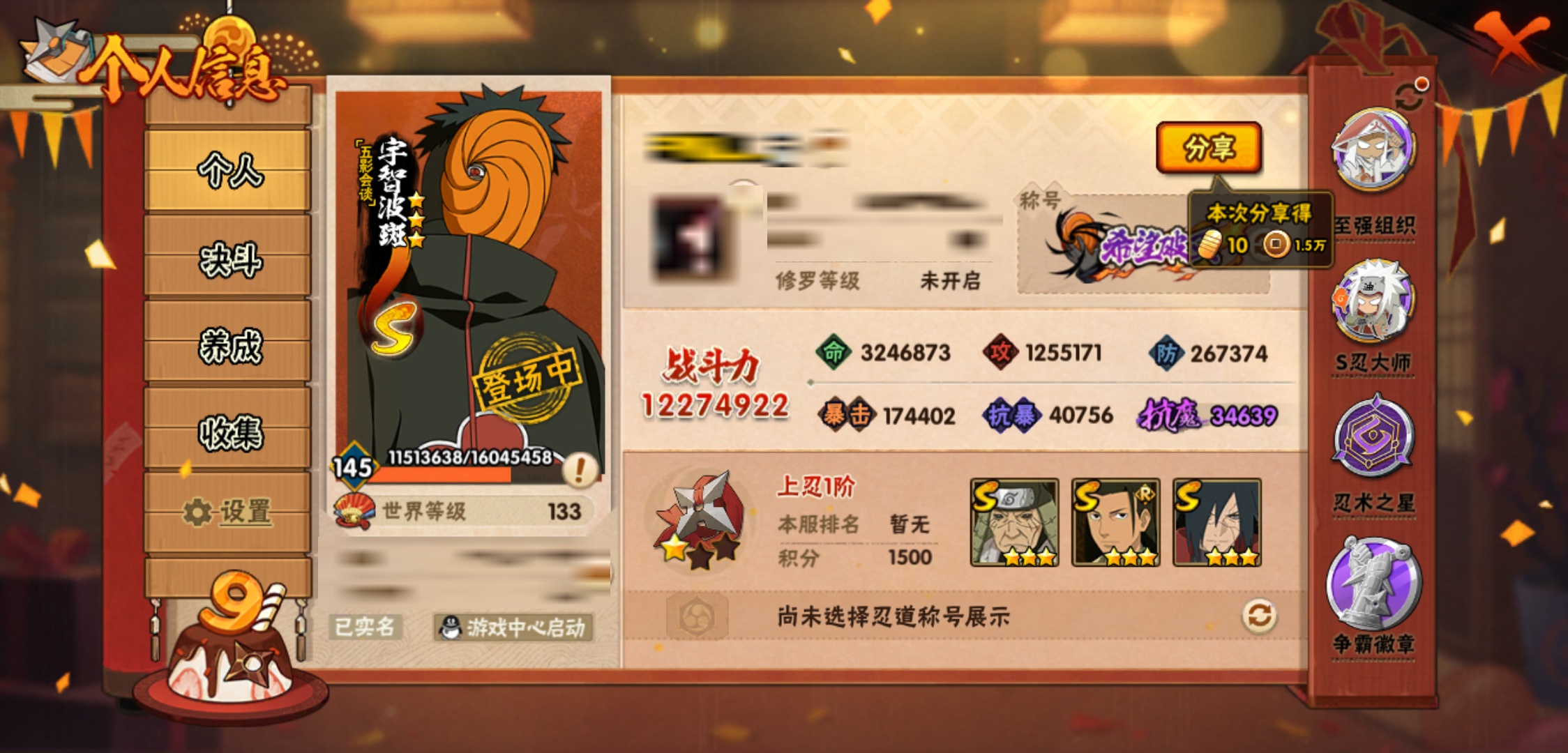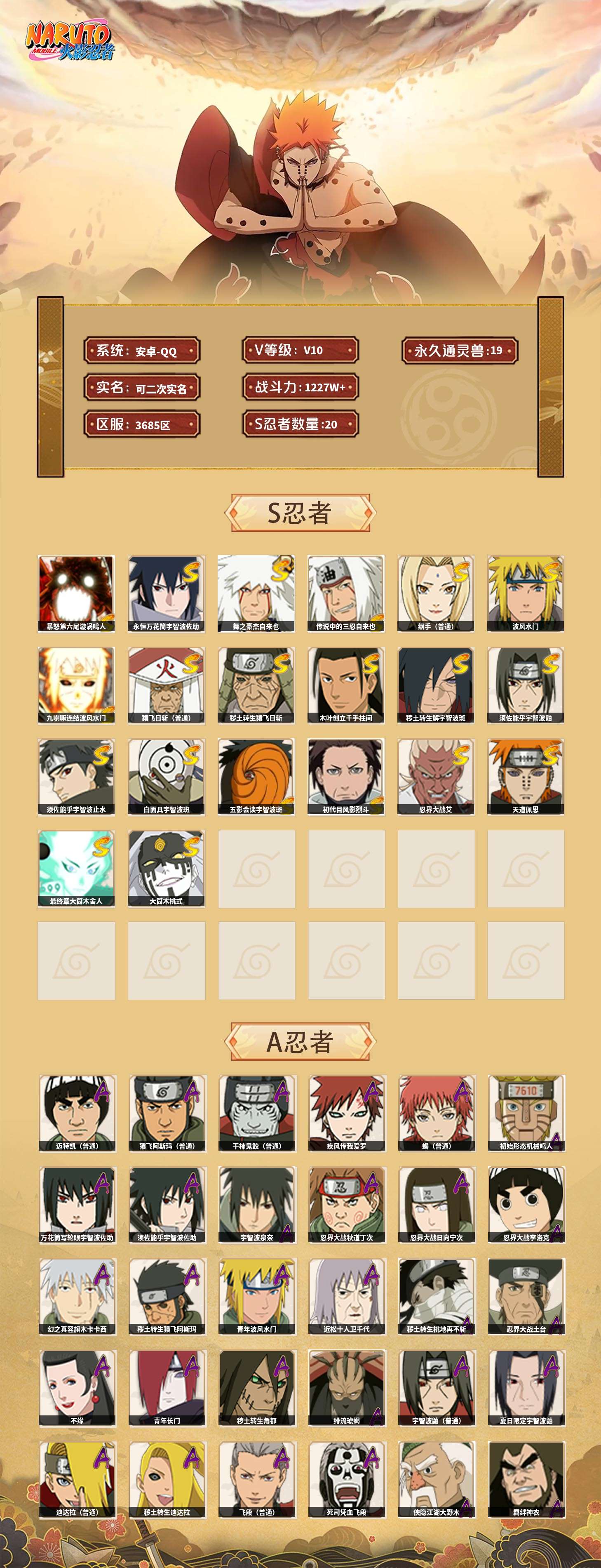 【火影忍者】【lyhy8892】战斗力:1227w;段位:上忍1阶;本服排名:57;vip:v10级;s忍:20个;a忍:31个;通灵兽:19个,s忍:暴怒第六尾漩涡鸣人|永恒万花筒宇智波佐助|舞之豪杰自来也|传说中的三忍自来也|纲手(普通)|波风水门|九喇嘛连结波风水门|猿飞日斩(普通)|秽土转生猿飞日斩|木叶创立千手柱间|秽土转生解宇智波斑|须佐能乎宇智波鼬|须佐能乎宇智波止水|白面具宇智波斑|五影会谈宇智波斑|初代目风影烈斗|忍界大战艾|天道佩恩|最终章大筒木舍人|大筒木桃式__a忍:迈特凯(普通) 5星|猿飞阿斯玛(普通) 5星|干柿鬼鲛(普通) 5星|疾风传我爱罗 3星|蝎(普通) 3星|初始形态机械鸣人|万花筒写轮眼宇智波佐助|须佐能乎宇智波佐助|宇智波泉奈|忍界大战秋道丁次|忍界大战日向宁次|忍界大战李洛克|幻之真容旗木卡卡西|秽土转生猿飞阿斯玛|青年波风水门|近松十人卫千代|秽土转生桃地再不斩|忍界大战土台|不缘|青年长门|秽土转生角都|绯流琥蝎|宇智波鼬(普通)|夏日限定宇智波鼬|迪达拉(普通)|秽土转生迪达拉|飞段(普通)|死司凭血飞段|侠隐江湖大野木|羁绊神农|桃式显现漩涡博人__通灵兽:忍犬(普通)|砂之守鹤|蓝蛇|蛤蟆吉|忍龟|镰鼬|猿魔|山椒鱼|蜃|蛤蟆仙人|鲛鲨|蛤蟆健|蛞蝓(普通)|辛牙|乌鸦(普通)|蛤蟆龙|蛤蟆广|怒鬼爪|梦貘
