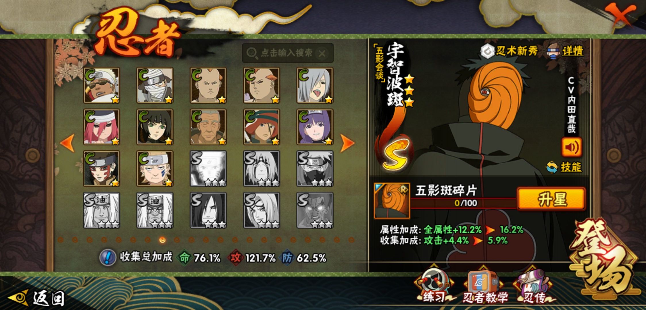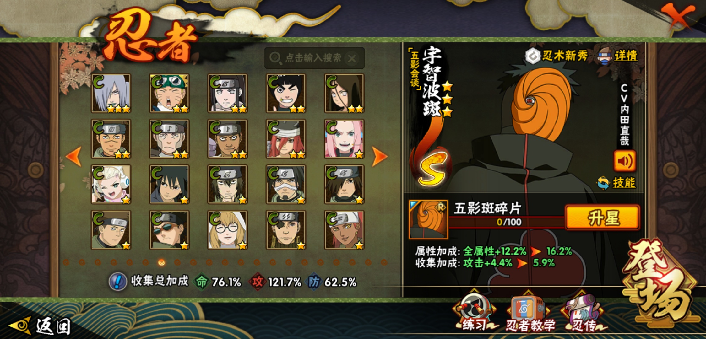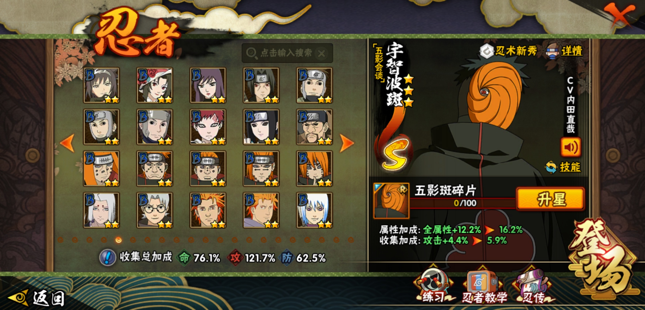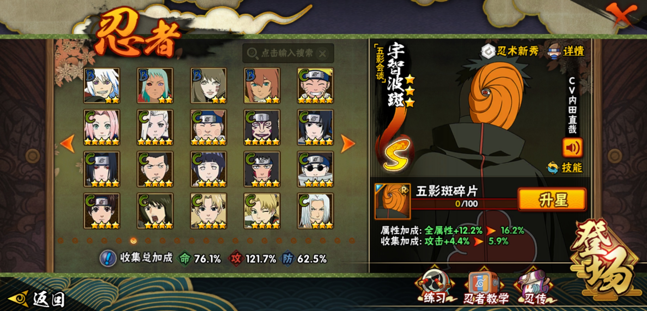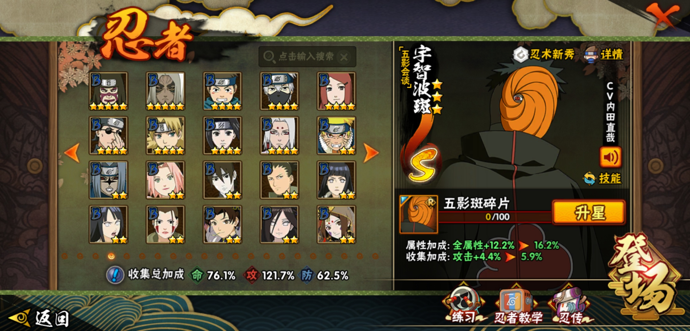 【火影忍者】【lyhy8892】战斗力:1227w;段位:上忍1阶;本服排名:57;vip:v10级;s忍:20个;a忍:31个;通灵兽:19个,s忍:暴怒第六尾漩涡鸣人|永恒万花筒宇智波佐助|舞之豪杰自来也|传说中的三忍自来也|纲手(普通)|波风水门|九喇嘛连结波风水门|猿飞日斩(普通)|秽土转生猿飞日斩|木叶创立千手柱间|秽土转生解宇智波斑|须佐能乎宇智波鼬|须佐能乎宇智波止水|白面具宇智波斑|五影会谈宇智波斑|初代目风影烈斗|忍界大战艾|天道佩恩|最终章大筒木舍人|大筒木桃式__a忍:迈特凯(普通) 5星|猿飞阿斯玛(普通) 5星|干柿鬼鲛(普通) 5星|疾风传我爱罗 3星|蝎(普通) 3星|初始形态机械鸣人|万花筒写轮眼宇智波佐助|须佐能乎宇智波佐助|宇智波泉奈|忍界大战秋道丁次|忍界大战日向宁次|忍界大战李洛克|幻之真容旗木卡卡西|秽土转生猿飞阿斯玛|青年波风水门|近松十人卫千代|秽土转生桃地再不斩|忍界大战土台|不缘|青年长门|秽土转生角都|绯流琥蝎|宇智波鼬(普通)|夏日限定宇智波鼬|迪达拉(普通)|秽土转生迪达拉|飞段(普通)|死司凭血飞段|侠隐江湖大野木|羁绊神农|桃式显现漩涡博人__通灵兽:忍犬(普通)|砂之守鹤|蓝蛇|蛤蟆吉|忍龟|镰鼬|猿魔|山椒鱼|蜃|蛤蟆仙人|鲛鲨|蛤蟆健|蛞蝓(普通)|辛牙|乌鸦(普通)|蛤蟆龙|蛤蟆广|怒鬼爪|梦貘