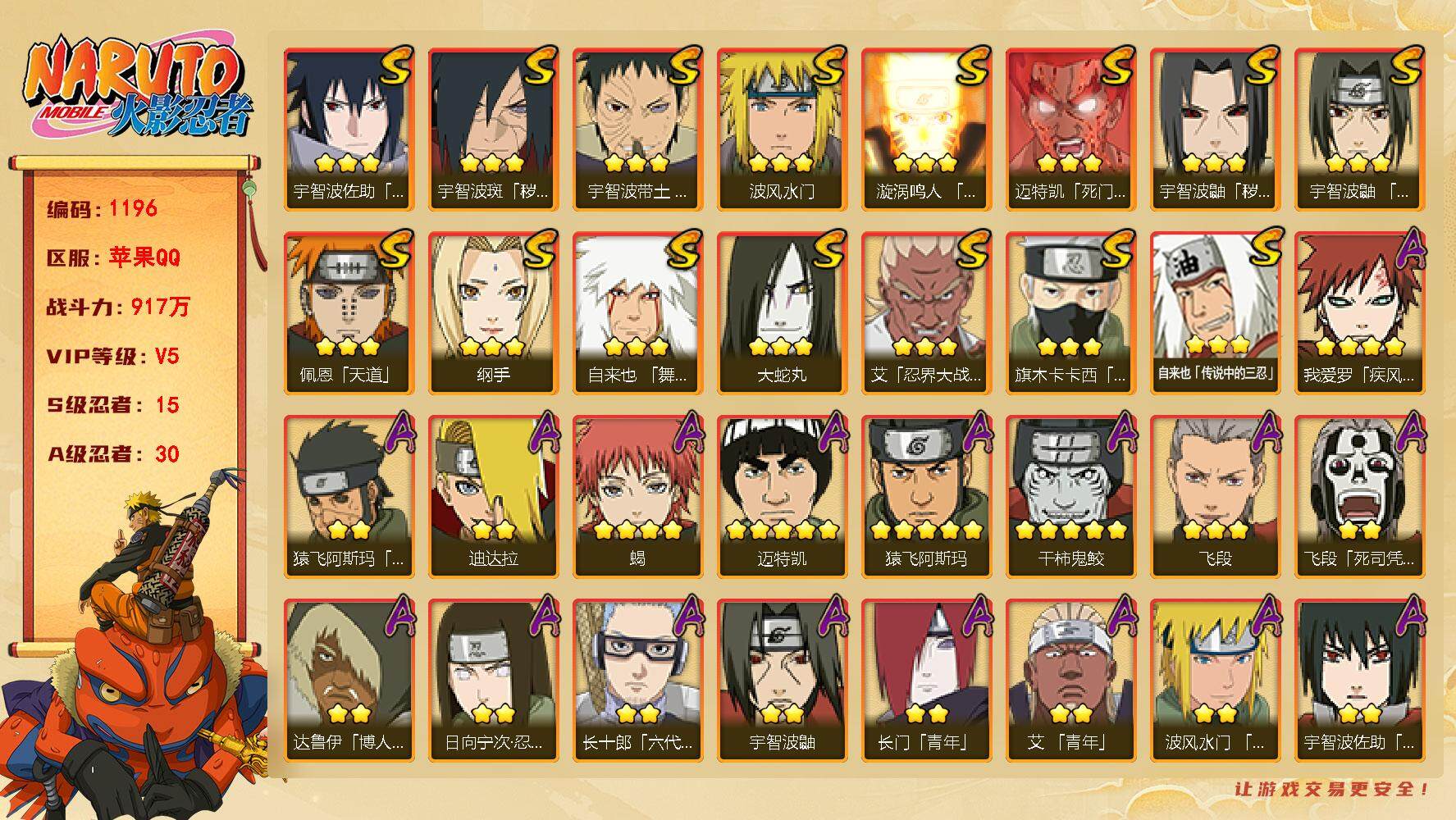 [14336210]v5 15s 30a 917w战力 自来也55片,日斩45片,秽土柱间47片,(王者连体133皮肤,1传说)yy1267 【s级忍者】:宇智波鼬「秽土转生」3星,宇智波斑「秽土转生·解」3星,宇智波带土「忍界大战」3星,艾「忍界大战」3星,宇智波鼬「须佐能乎」3星,旗木卡卡西「须佐能乎」3星,自来也「舞之豪杰」3星,大蛇丸3星,自来也「传说中的三忍」3星,纲手3星,波风水门3星,漩涡鸣人「九喇嘛连结」3星,迈特凯「死门」3星,佩恩「天道」3星,宇智波佐助「永恒万花筒」3星 【a级忍者】:艾「青年」2星,长门「青年」2星,波风水门「青年」2星,达鲁伊「博人传」2星,迪达拉2星,迪达拉「秽土转生」2星,奇拉比「忍界大战」2星,飞段3星,飞段「死司凭血」2星,干柿鬼鲛5星,漩涡博人「桃式显现」3星,漩涡鸣人「九尾查克拉」2星,迈特凯5星,我爱罗「疾风传」4星,蝎4星,蝎「绯流琥」2星,猿飞阿斯玛5星,猿飞阿斯玛「秽土转生」2星,宇智波鼬2星,宇智波佐助「须佐能乎」2星,宇智波佐助「万花筒写轮眼」2星,照美冥「五代目水影」2星,日向宁次「忍界大战」2星,日向雏田「最终章」2星,长十郎「六代目水影」2星,李洛克「忍界大战」2星,黑土「博人传」2星,秋道丁次「忍界大战」2星,千代「近松十人卫」2星,宇智波泉奈2星
