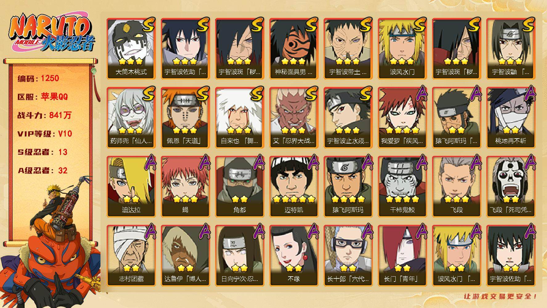 [14336317]v10 13s 32a 841w战力 须佐卡卡西碎片61 纲手碎片69 九水门碎片53 日斩碎片60 三代目雷影碎片87 yy1275 【s级忍者】:宇智波斑「秽土转生」3星,宇智波斑「秽土转生·解」3星,宇智波带土「忍界大战」3星,艾「忍界大战」3星,宇智波鼬「须佐能乎」3星,宇智波止水「须佐能乎」3星,自来也「舞之豪杰」3星,波风水门3星,药师兜「仙人模式」3星,神秘面具男「红夜之刃」3星,佩恩「天道」3星,宇智波佐助「永恒万花筒」3星,大筒木桃式3星 【a级忍者】:长门「青年」2星,波风水门「青年」2星,达鲁伊「博人传」2星,迪达拉2星,迪达拉「秽土转生」2星,飞段3星,飞段「死司凭血」2星,干柿鬼鲛4星,漩涡博人「桃式显现」2星,漩涡鸣人「九尾查克拉」2星,迈特凯5星,旗木卡卡西「幻之真容」2星,桃地再不斩2星,我爱罗「疾风传」4星,蝎3星,蝎「绯流琥」2星,角都2星,猿飞阿斯玛4星,猿飞阿斯玛「秽土转生」2星,宇智波佐助「须佐能乎」2星,宇智波佐助「万花筒写轮眼」2星,照美冥「五代目水影」2星,日向宁次「忍界大战」2星,长十郎「六代目水影」2星,李洛克「忍界大战」2星,黑土「博人传」2星,春野樱「百豪」2星,千代「近松十人卫」2星,不缘2星,宇智波泉奈2星,不动2星,志村团藏2星