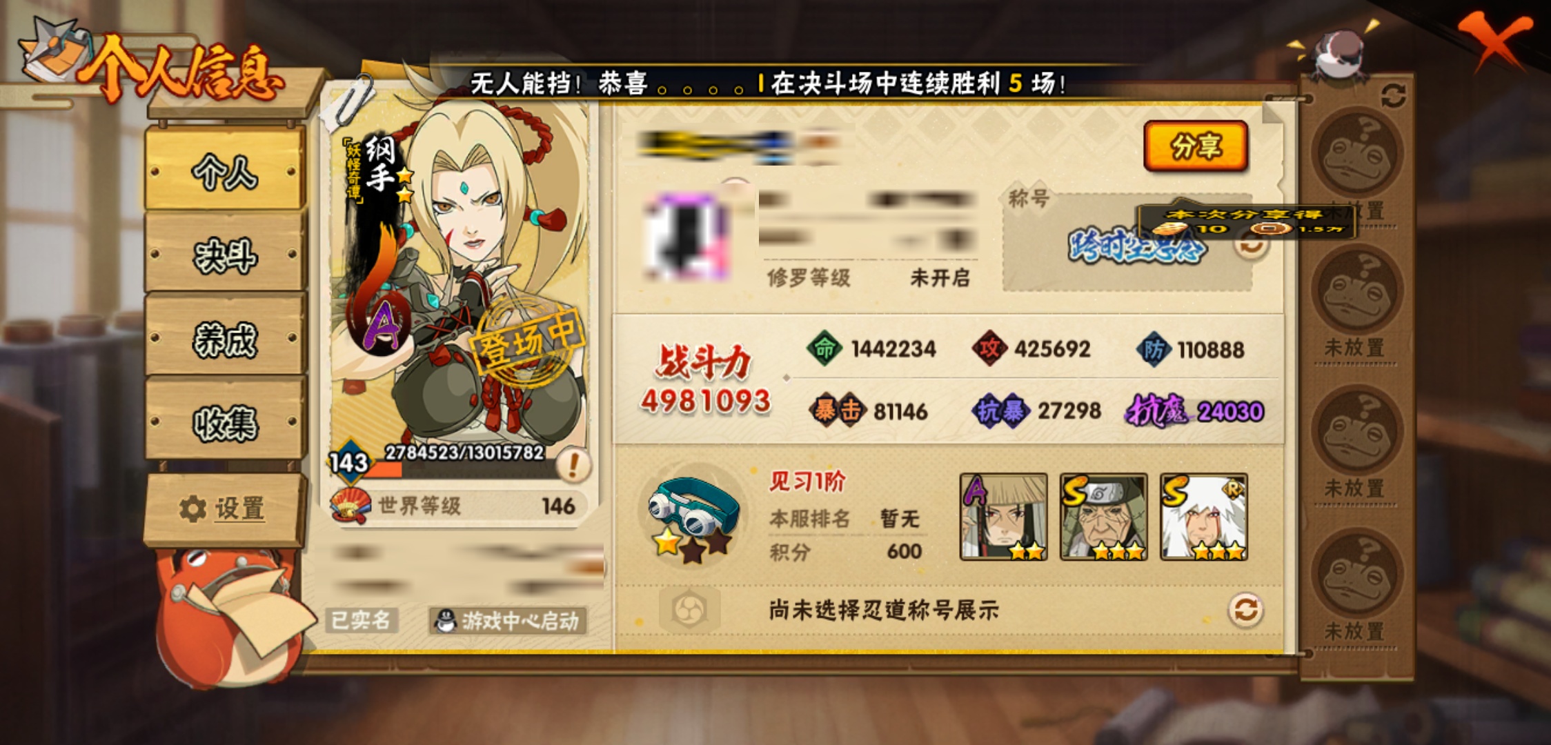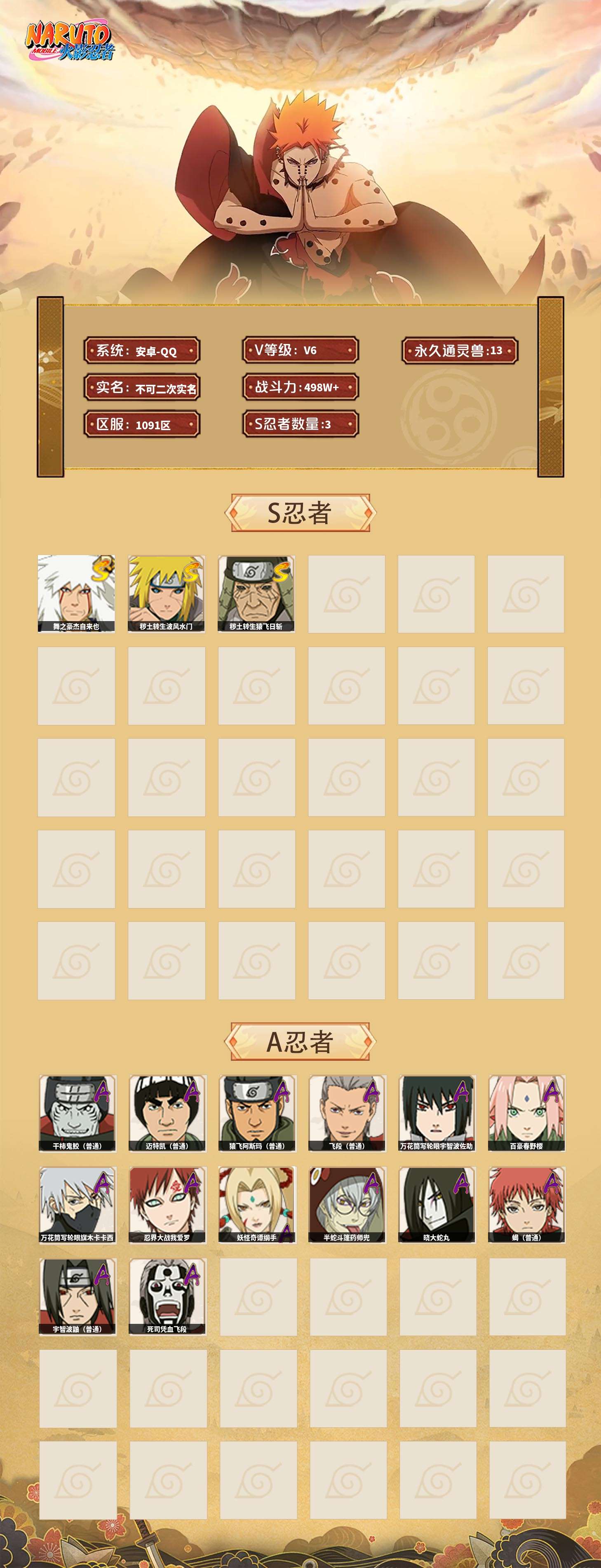 【火影忍者】【lyhy8971】战斗力:498w;段位:见习1阶;本服排名:2492;vip:v6级;s忍:3个;a忍:14个;通灵兽:13个,s忍:舞之豪杰自来也|秽土转生波风水门|秽土转生猿飞日斩__a忍:干柿鬼鲛(普通) 5星|迈特凯(普通) 3星|猿飞阿斯玛(普通) 3星|飞段(普通) 3星|万花筒写轮眼宇智波佐助|百豪春野樱|万花筒写轮眼旗木卡卡西|忍界大战我爱罗|妖怪奇谭纲手|半蛇斗篷药师兜|晓大蛇丸|蝎(普通)|宇智波鼬(普通)|死司凭血飞段__通灵兽:忍犬(普通)|蓝蛇|蛤蟆吉|忍龟|镰鼬|猿魔|山椒鱼|蜃|蛤蟆仙人|鲛鲨|蛤蟆健|乌鸦(普通)|蛤蟆龙