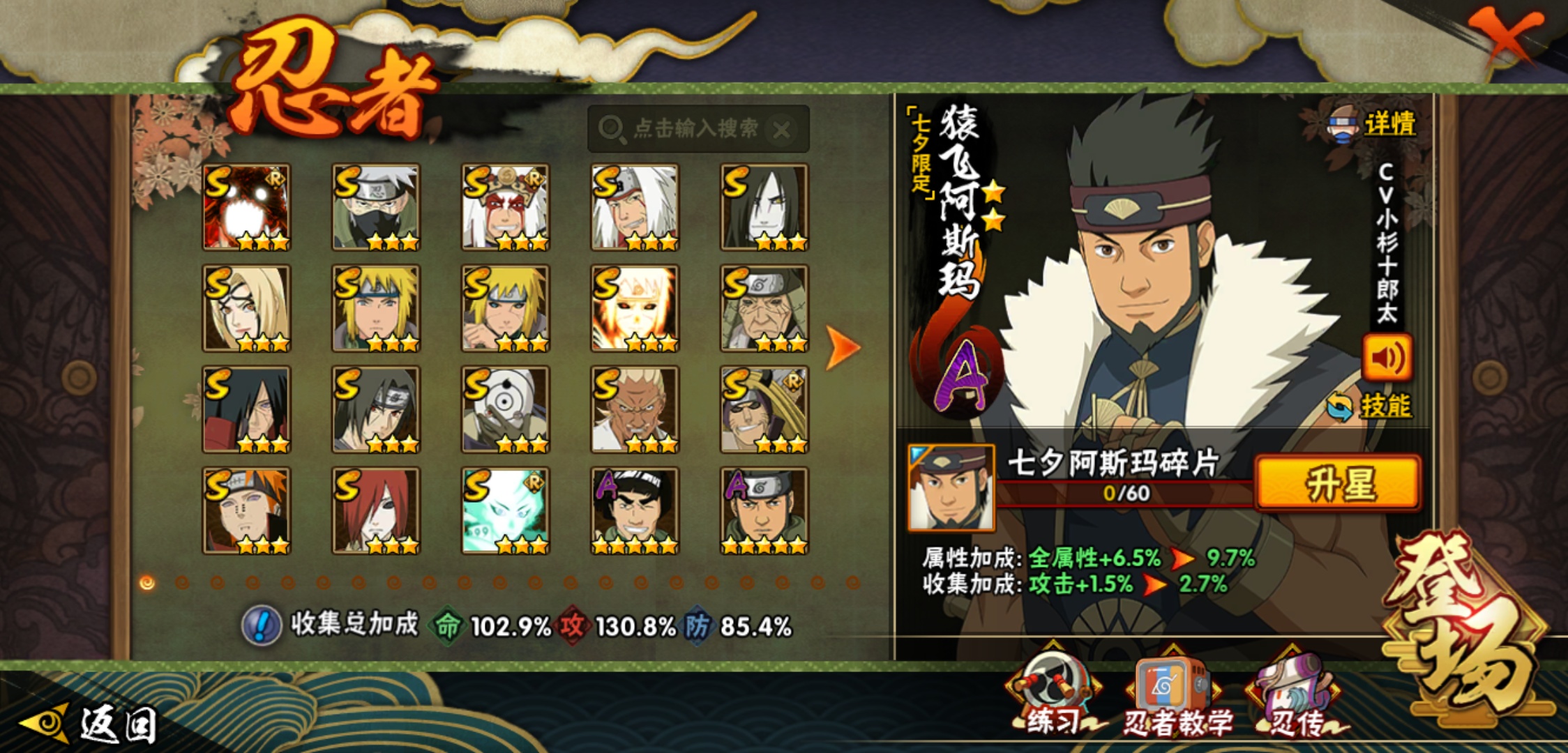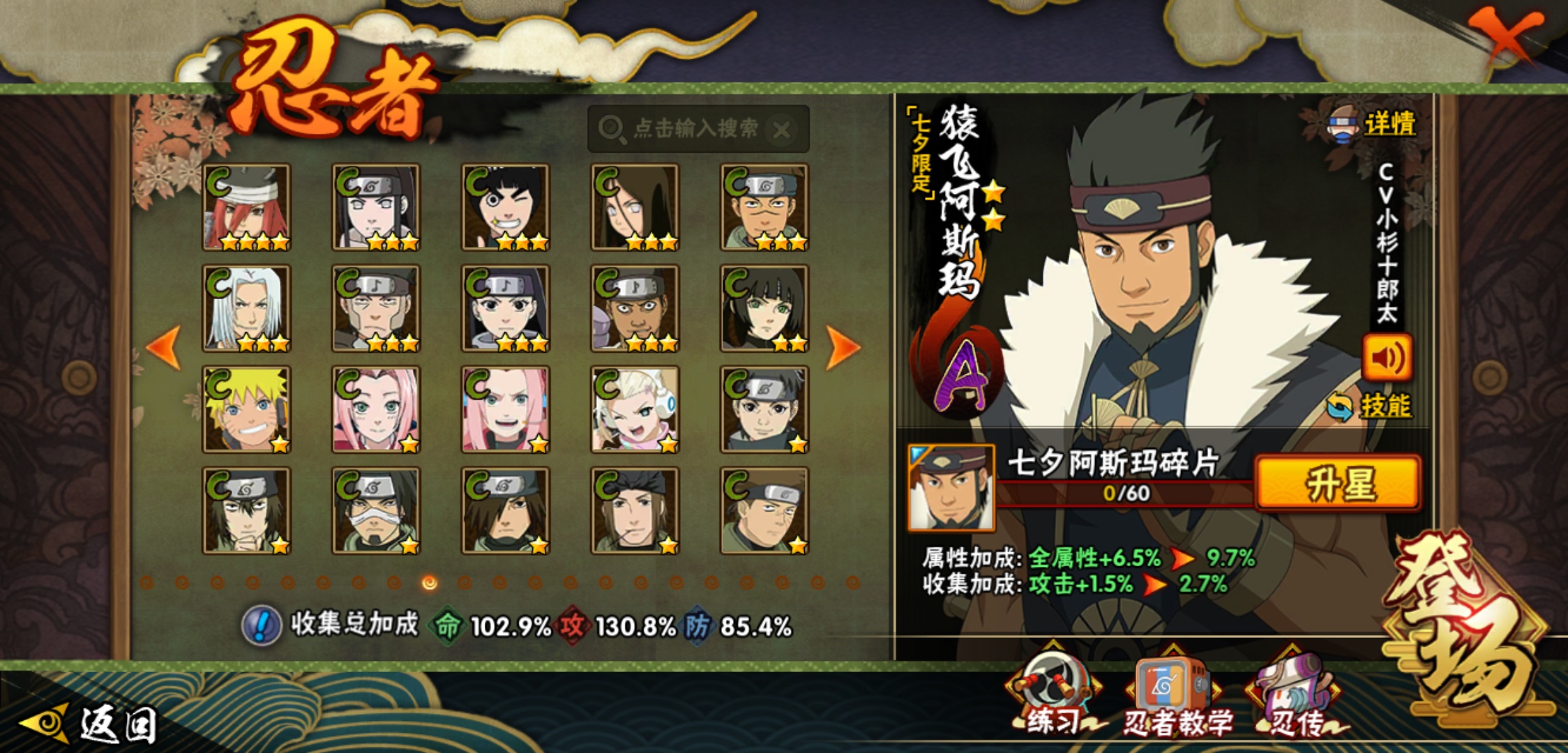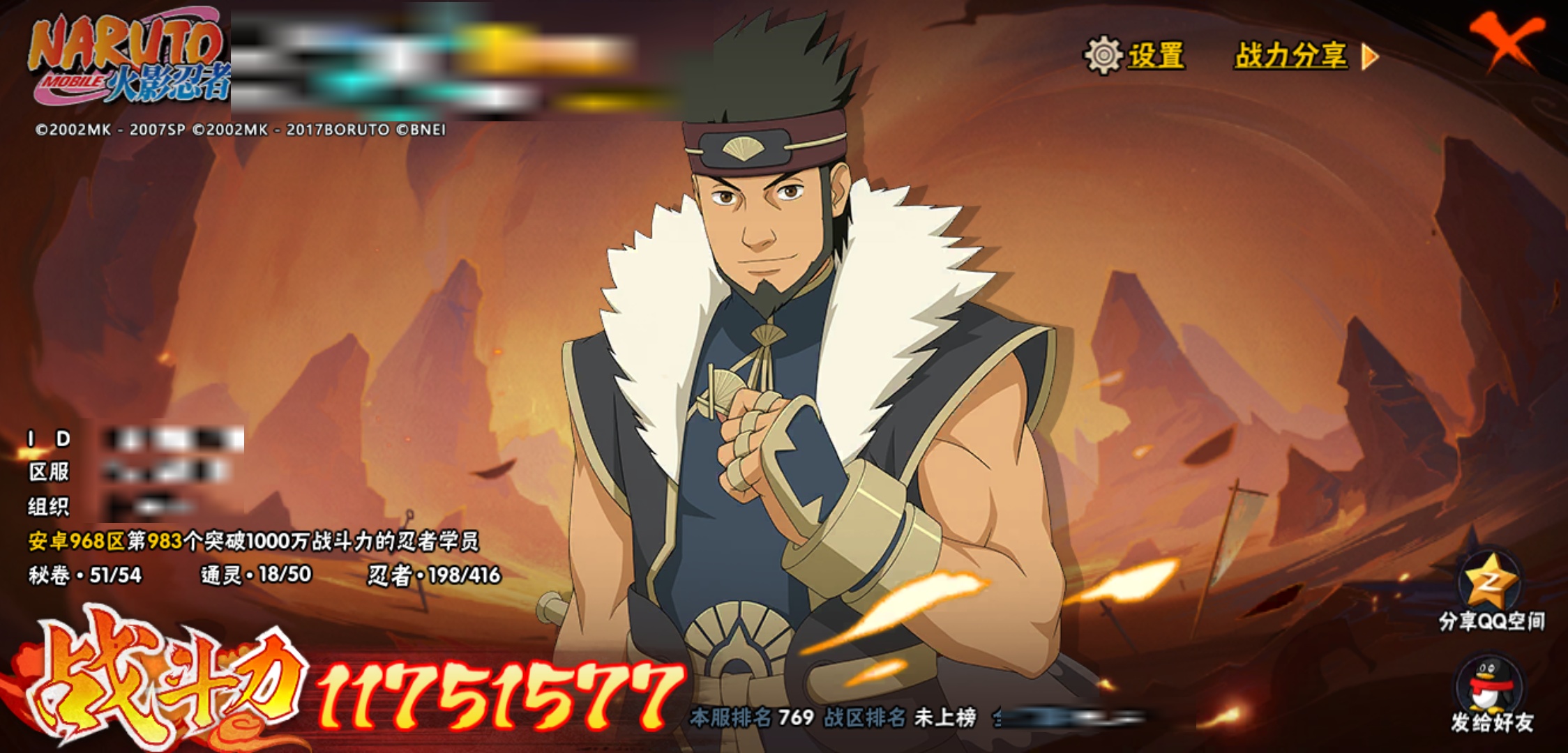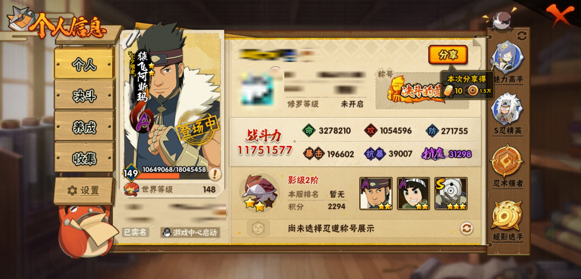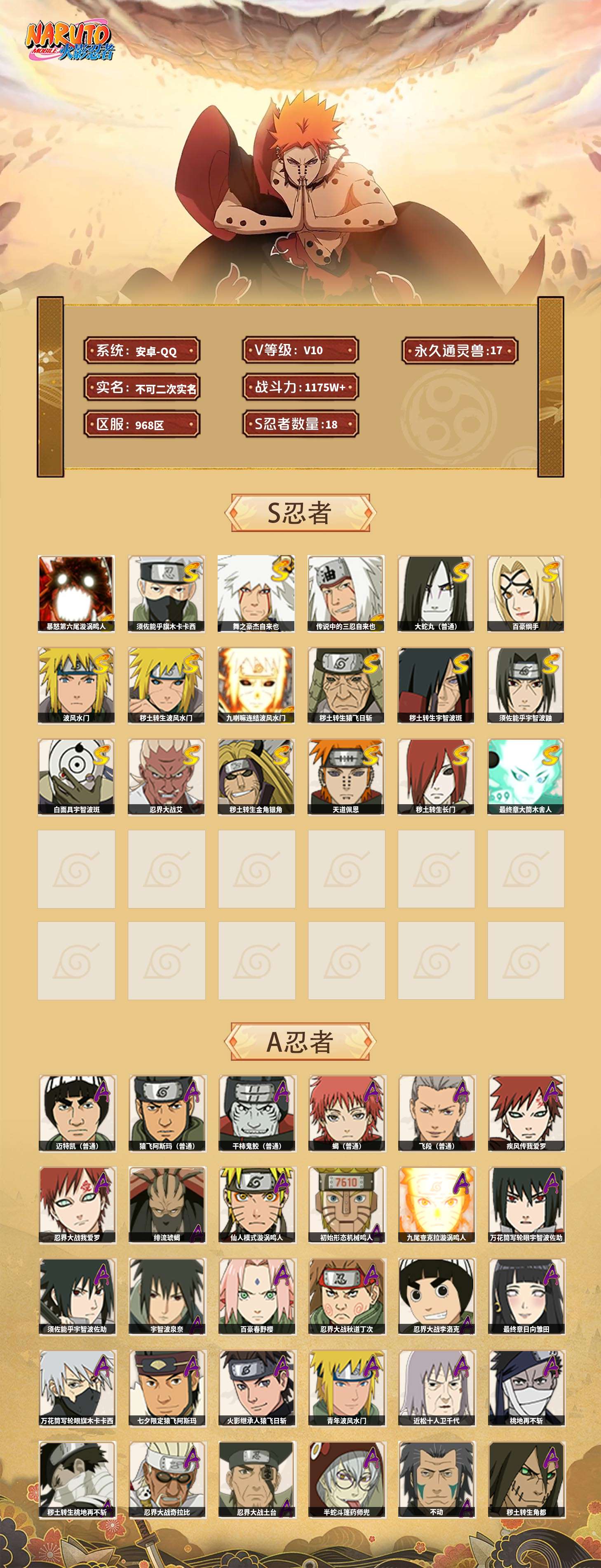 【火影忍者】【lyhy8965】战斗力:1175w;段位:影级2阶;本服排名:769;vip:v10级;s忍:18个;a忍:40个;通灵兽:17个,s忍:暴怒第六尾漩涡鸣人|须佐能乎旗木卡卡西|舞之豪杰自来也|传说中的三忍自来也|大蛇丸(普通)|百豪纲手|波风水门|秽土转生波风水门|九喇嘛连结波风水门|秽土转生猿飞日斩|秽土转生宇智波斑|须佐能乎宇智波鼬|白面具宇智波斑|忍界大战艾|秽土转生金角银角|天道佩恩|秽土转生长门|最终章大筒木舍人__a忍:迈特凯(普通) 5星|猿飞阿斯玛(普通) 5星|干柿鬼鲛(普通) 5星|蝎(普通) 4星|飞段(普通) 4星|疾风传我爱罗 3星|忍界大战我爱罗 3星|绯流琥蝎 3星|仙人模式漩涡鸣人|初始形态机械鸣人|九尾查克拉漩涡鸣人|万花筒写轮眼宇智波佐助|须佐能乎宇智波佐助|宇智波泉奈|百豪春野樱|忍界大战秋道丁次|忍界大战李洛克|最终章日向雏田|万花筒写轮眼旗木卡卡西|七夕限定猿飞阿斯玛|火影继承人猿飞日斩|青年波风水门|近松十人卫千代|桃地再不斩|秽土转生桃地再不斩|忍界大战奇拉比|忍界大战土台|半蛇斗篷药师兜|不动|秽土转生角都|晓大蛇丸|宇智波鼬(普通)|迪达拉(普通)|秽土转生迪达拉|死司凭血飞段|侠隐江湖大野木|羁绊神农|木叶上忍猿飞木叶丸|桃式显现漩涡博人|四代目土影黑土__通灵兽:忍犬(普通)|蓝蛇|蛤蟆吉|忍龟|镰鼬|猿魔|山椒鱼|蜃|蛤蟆仙人|鲛鲨|蛤蟆健|乌鸦(普通)|蛞蝓(普通)|蛤蟆龙|砂之守鹤|蛤蟆广|梦貘