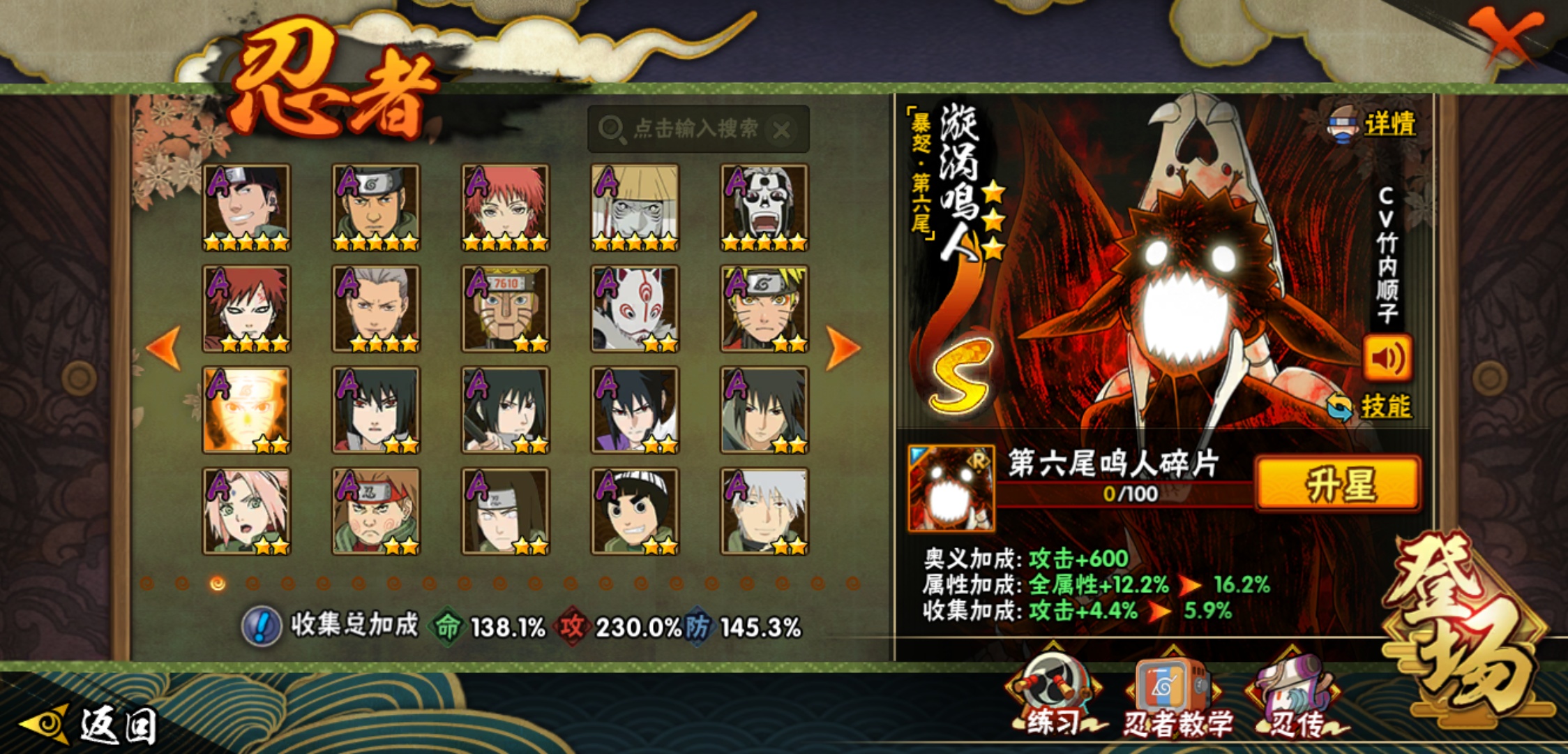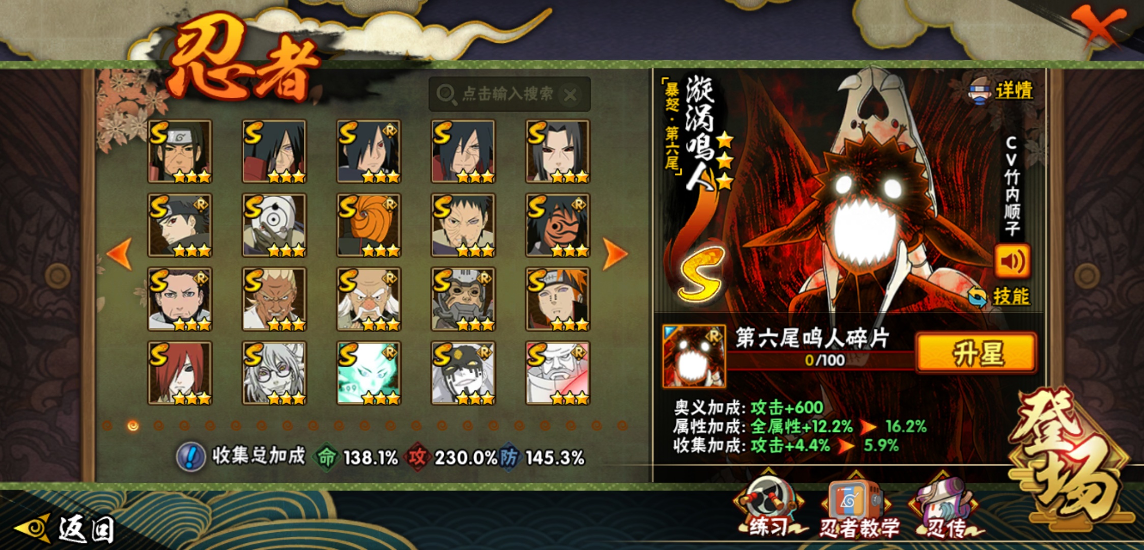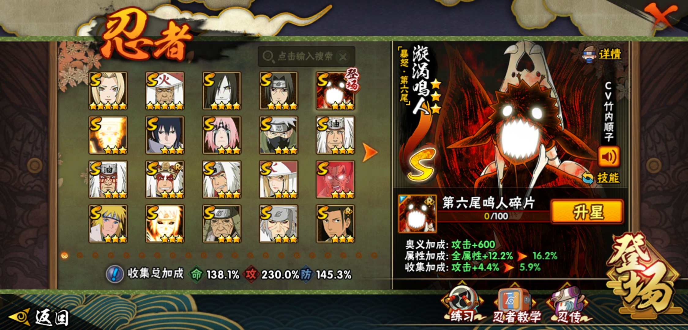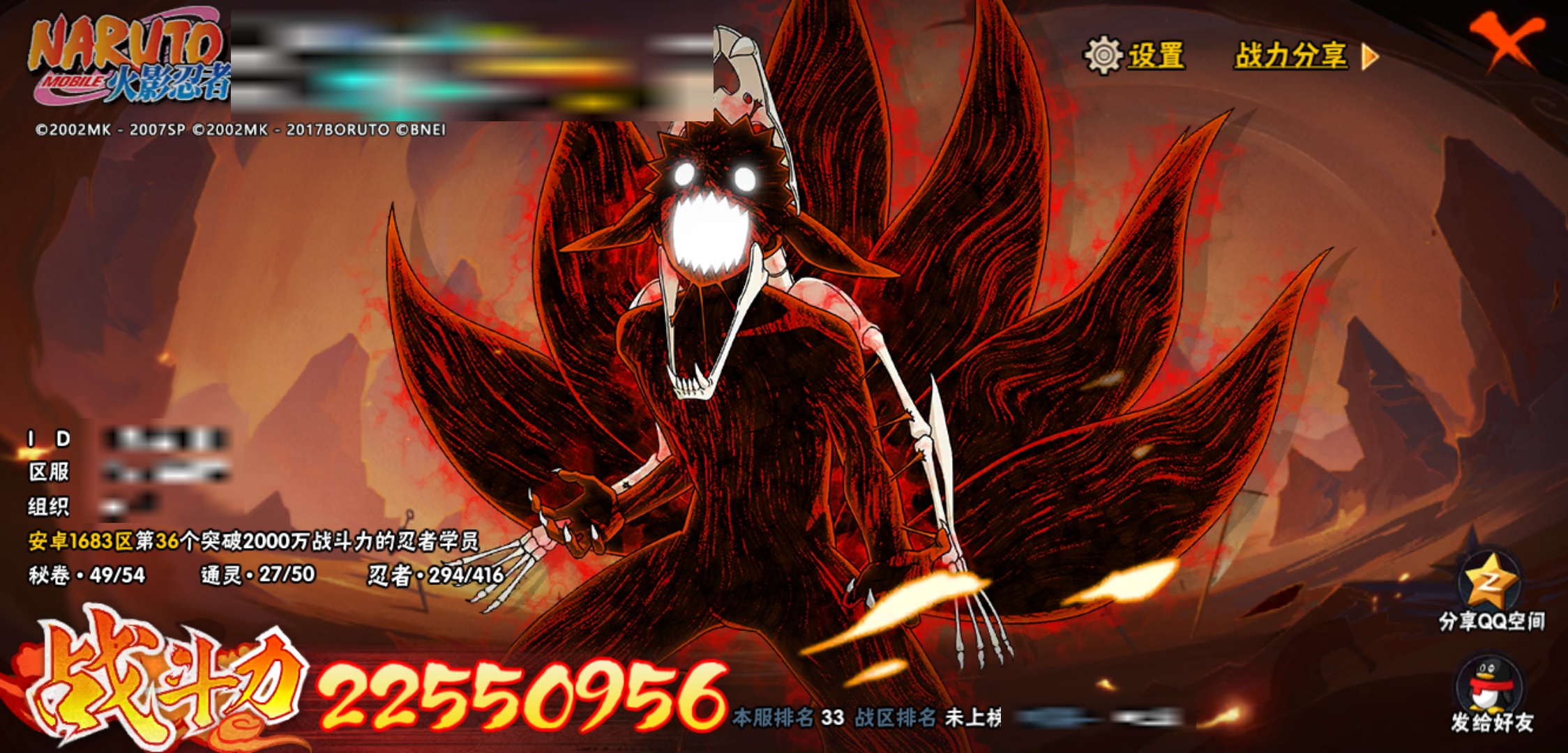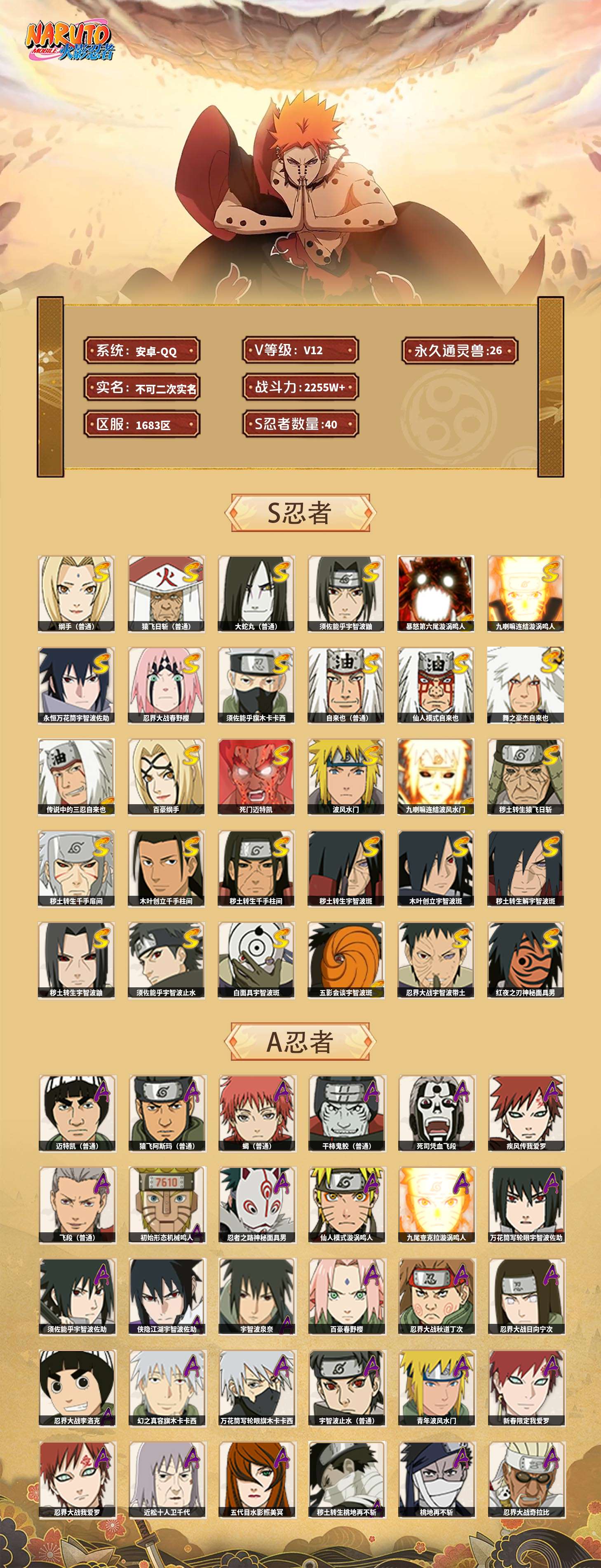 【火影忍者】【lyhy8964】战斗力:2255w;段位:上忍3阶;本服排名:33;vip:v12级;s忍:40个;a忍:57个;通灵兽:26个,s忍:纲手(普通) 5星|猿飞日斩(普通) 5星|大蛇丸(普通) 4星|须佐能乎宇智波鼬 4星|暴怒第六尾漩涡鸣人|九喇嘛连结漩涡鸣人|永恒万花筒宇智波佐助|忍界大战春野樱|须佐能乎旗木卡卡西|自来也(普通)|仙人模式自来也|舞之豪杰自来也|传说中的三忍自来也|百豪纲手|死门迈特凯|波风水门|九喇嘛连结波风水门|秽土转生猿飞日斩|秽土转生千手扉间|木叶创立千手柱间|秽土转生千手柱间|秽土转生宇智波斑|木叶创立宇智波斑|秽土转生解宇智波斑|秽土转生宇智波鼬|须佐能乎宇智波止水|白面具宇智波斑|五影会谈宇智波斑|忍界大战宇智波带土|红夜之刃神秘面具男|初代目风影烈斗|忍界大战艾|忍界大战大野木|秽土转生半藏|天道佩恩|秽土转生长门|仙人模式药师兜|最终章大筒木舍人|大筒木桃式|博人传大筒木金式__a忍:迈特凯(普通) 5星|猿飞阿斯玛(普通) 5星|蝎(普通) 5星|干柿鬼鲛(普通) 5星|死司凭血飞段 5星|疾风传我爱罗 4星|飞段(普通) 4星|初始形态机械鸣人|忍者之路神秘面具男|仙人模式漩涡鸣人|九尾查克拉漩涡鸣人|万花筒写轮眼宇智波佐助|须佐能乎宇智波佐助|侠隐江湖宇智波佐助|宇智波泉奈|百豪春野樱|忍界大战秋道丁次|忍界大战日向宁次|忍界大战李洛克|幻之真容旗木卡卡西|万花筒写轮眼旗木卡卡西|宇智波止水(普通)|青年波风水门|新春限定我爱罗|忍界大战我爱罗|近松十人卫千代|五代目水影照美冥|秽土转生桃地再不斩|桃地再不斩|忍界大战奇拉比|奇拉比(普通)|青年艾|忍界大战土台|半蛇斗篷药师兜|不风|不动|青年长门|小南(普通)|角都(普通)|地怨虞角都|秽土转生角都|新春限定大蛇丸|晓大蛇丸|绯流琥蝎|宇智波鼬(普通)|夏日限定宇智波鼬|迪达拉(普通)|秽土转生迪达拉|侠隐江湖大野木|羁绊神农|木叶上忍猿飞木叶丸|桃式显现漩涡博人|六代目水影长十郎|五代目雷影达鲁伊|仙人模式巳月|四代目土影黑土|夏日限定黑土__通灵兽:忍犬(普通)|蓝蛇|蛤蟆吉|忍龟|镰鼬|猿魔|山椒鱼|蜃|蛤蟆仙人|鲛鲨|蛤蟆健|乌鸦(普通)|蛞蝓(普通)|砂之守鹤|蛤蟆龙|蛤蟆广|怒鬼无臂|梦貘|怒鬼(普通)|鹰|怒鬼爪|蜘蛛|辛牙|熊猫|万蛇|乌鸦夏日限定