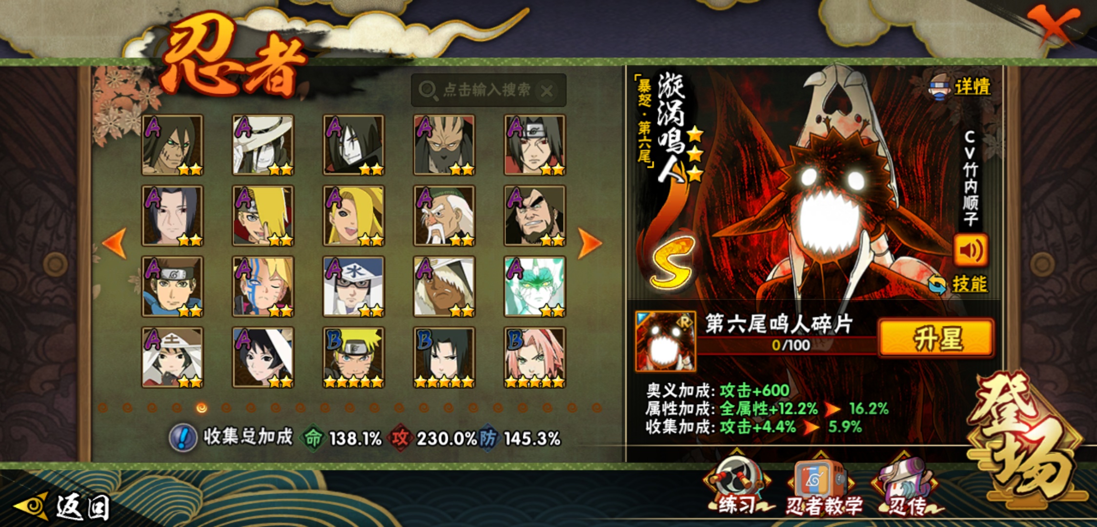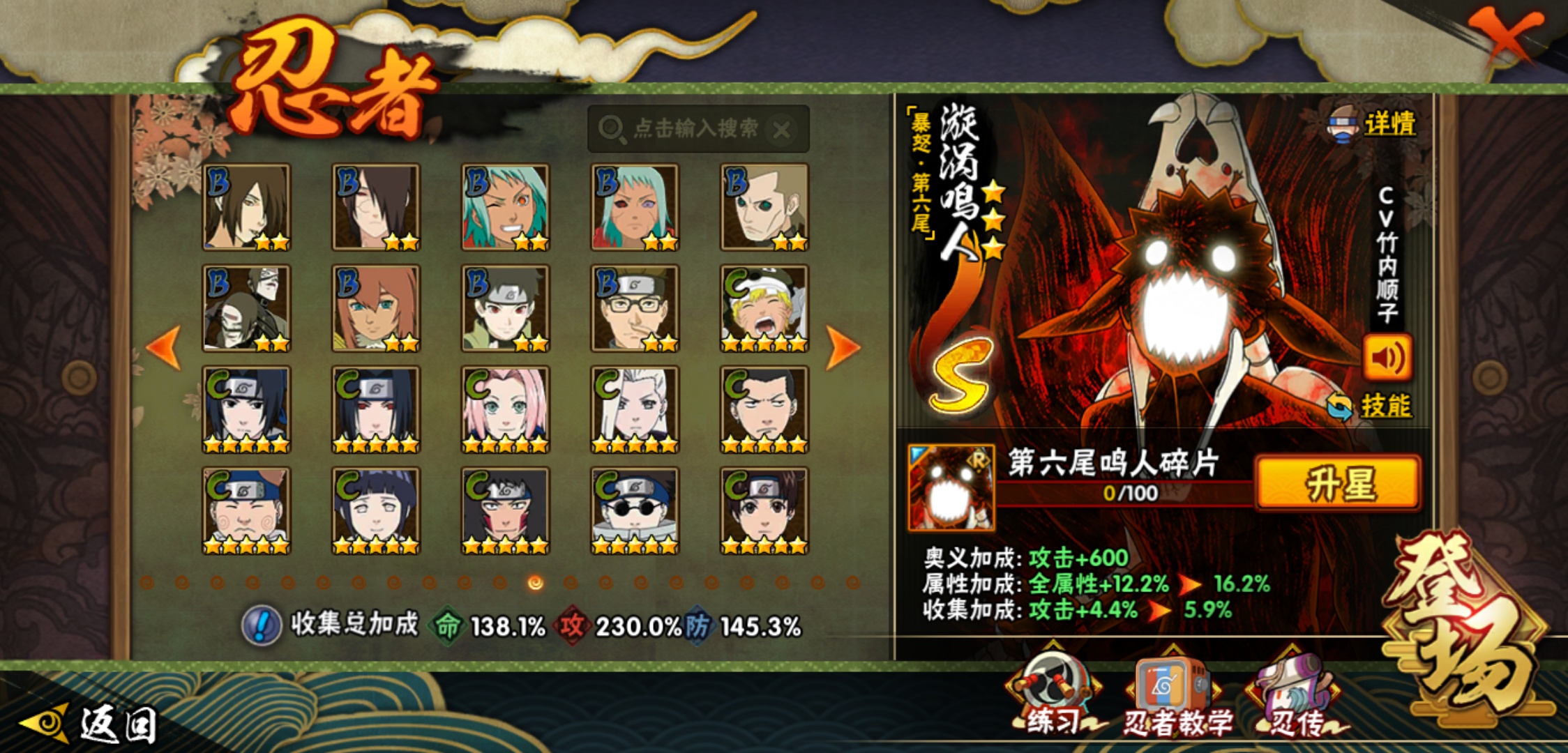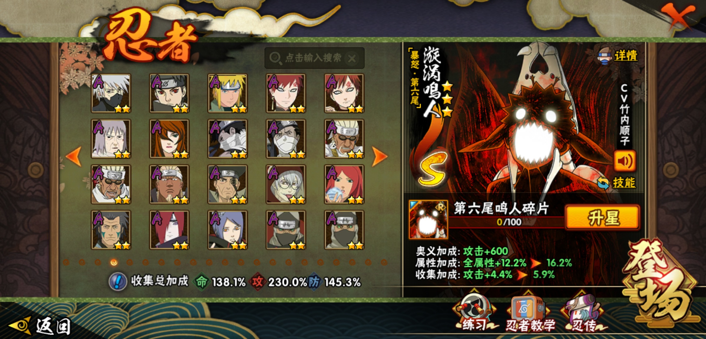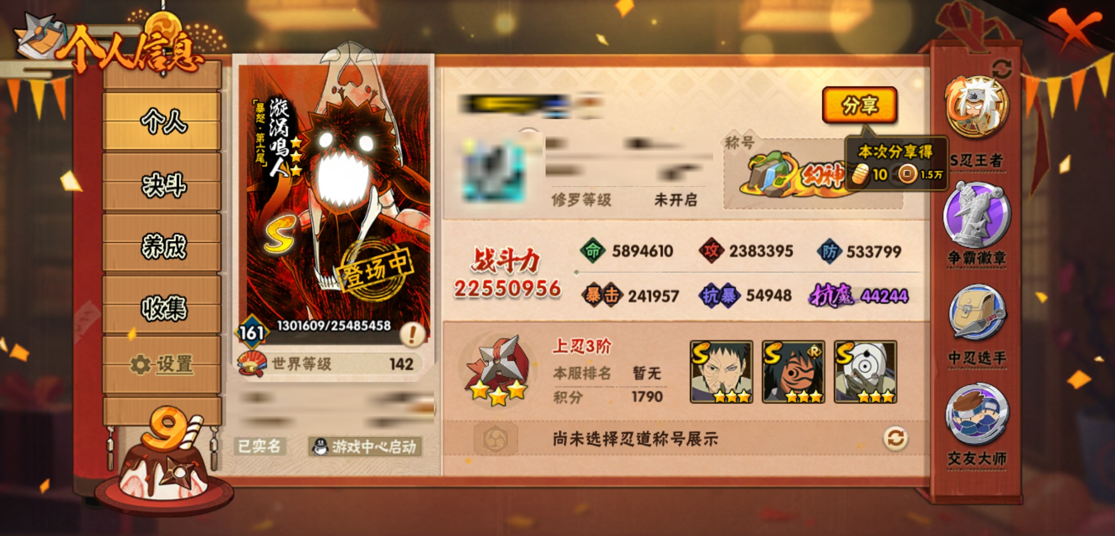 【火影忍者】【lyhy8964】战斗力:2255w;段位:上忍3阶;本服排名:33;vip:v12级;s忍:40个;a忍:57个;通灵兽:26个,s忍:纲手(普通) 5星|猿飞日斩(普通) 5星|大蛇丸(普通) 4星|须佐能乎宇智波鼬 4星|暴怒第六尾漩涡鸣人|九喇嘛连结漩涡鸣人|永恒万花筒宇智波佐助|忍界大战春野樱|须佐能乎旗木卡卡西|自来也(普通)|仙人模式自来也|舞之豪杰自来也|传说中的三忍自来也|百豪纲手|死门迈特凯|波风水门|九喇嘛连结波风水门|秽土转生猿飞日斩|秽土转生千手扉间|木叶创立千手柱间|秽土转生千手柱间|秽土转生宇智波斑|木叶创立宇智波斑|秽土转生解宇智波斑|秽土转生宇智波鼬|须佐能乎宇智波止水|白面具宇智波斑|五影会谈宇智波斑|忍界大战宇智波带土|红夜之刃神秘面具男|初代目风影烈斗|忍界大战艾|忍界大战大野木|秽土转生半藏|天道佩恩|秽土转生长门|仙人模式药师兜|最终章大筒木舍人|大筒木桃式|博人传大筒木金式__a忍:迈特凯(普通) 5星|猿飞阿斯玛(普通) 5星|蝎(普通) 5星|干柿鬼鲛(普通) 5星|死司凭血飞段 5星|疾风传我爱罗 4星|飞段(普通) 4星|初始形态机械鸣人|忍者之路神秘面具男|仙人模式漩涡鸣人|九尾查克拉漩涡鸣人|万花筒写轮眼宇智波佐助|须佐能乎宇智波佐助|侠隐江湖宇智波佐助|宇智波泉奈|百豪春野樱|忍界大战秋道丁次|忍界大战日向宁次|忍界大战李洛克|幻之真容旗木卡卡西|万花筒写轮眼旗木卡卡西|宇智波止水(普通)|青年波风水门|新春限定我爱罗|忍界大战我爱罗|近松十人卫千代|五代目水影照美冥|秽土转生桃地再不斩|桃地再不斩|忍界大战奇拉比|奇拉比(普通)|青年艾|忍界大战土台|半蛇斗篷药师兜|不风|不动|青年长门|小南(普通)|角都(普通)|地怨虞角都|秽土转生角都|新春限定大蛇丸|晓大蛇丸|绯流琥蝎|宇智波鼬(普通)|夏日限定宇智波鼬|迪达拉(普通)|秽土转生迪达拉|侠隐江湖大野木|羁绊神农|木叶上忍猿飞木叶丸|桃式显现漩涡博人|六代目水影长十郎|五代目雷影达鲁伊|仙人模式巳月|四代目土影黑土|夏日限定黑土__通灵兽:忍犬(普通)|蓝蛇|蛤蟆吉|忍龟|镰鼬|猿魔|山椒鱼|蜃|蛤蟆仙人|鲛鲨|蛤蟆健|乌鸦(普通)|蛞蝓(普通)|砂之守鹤|蛤蟆龙|蛤蟆广|怒鬼无臂|梦貘|怒鬼(普通)|鹰|怒鬼爪|蜘蛛|辛牙|熊猫|万蛇|乌鸦夏日限定