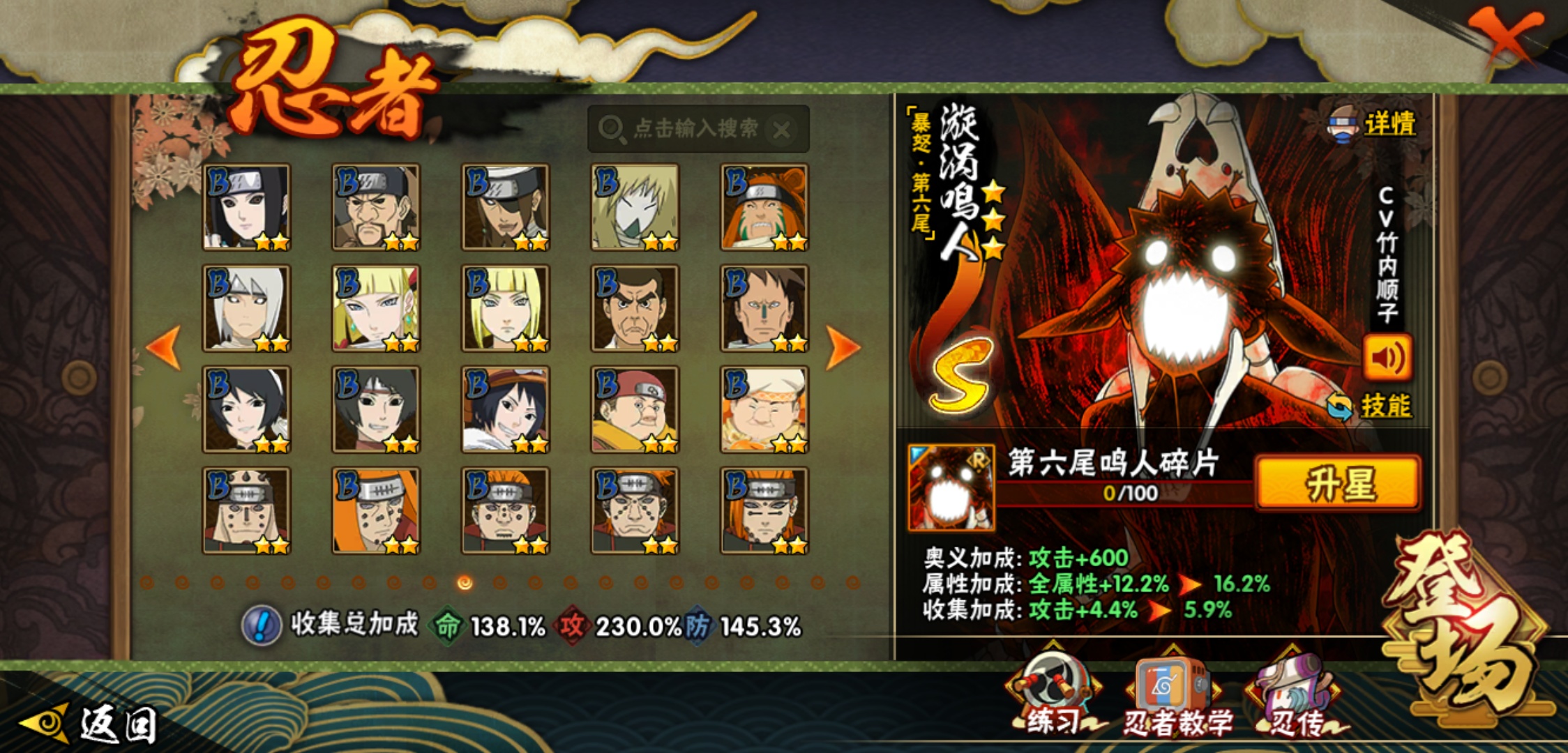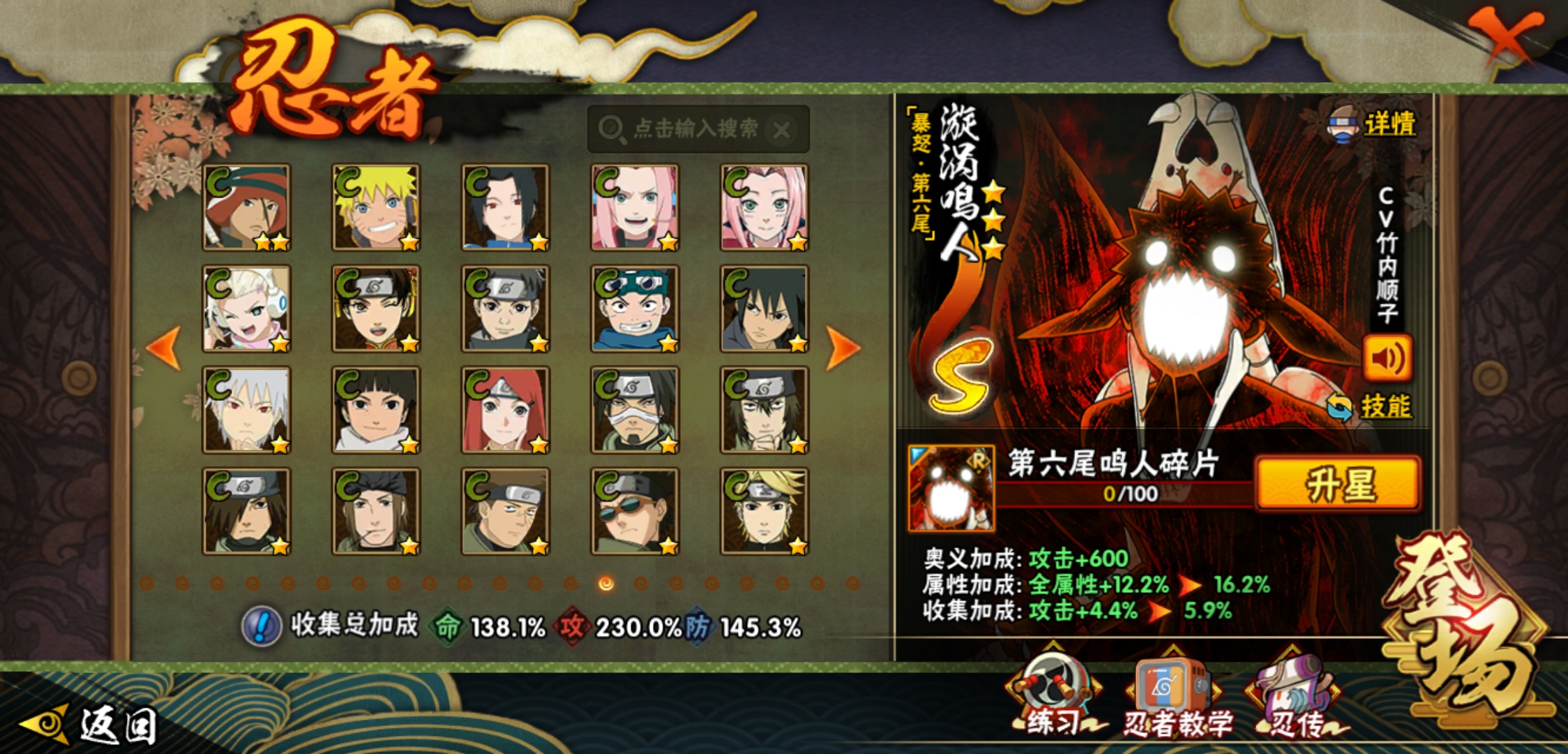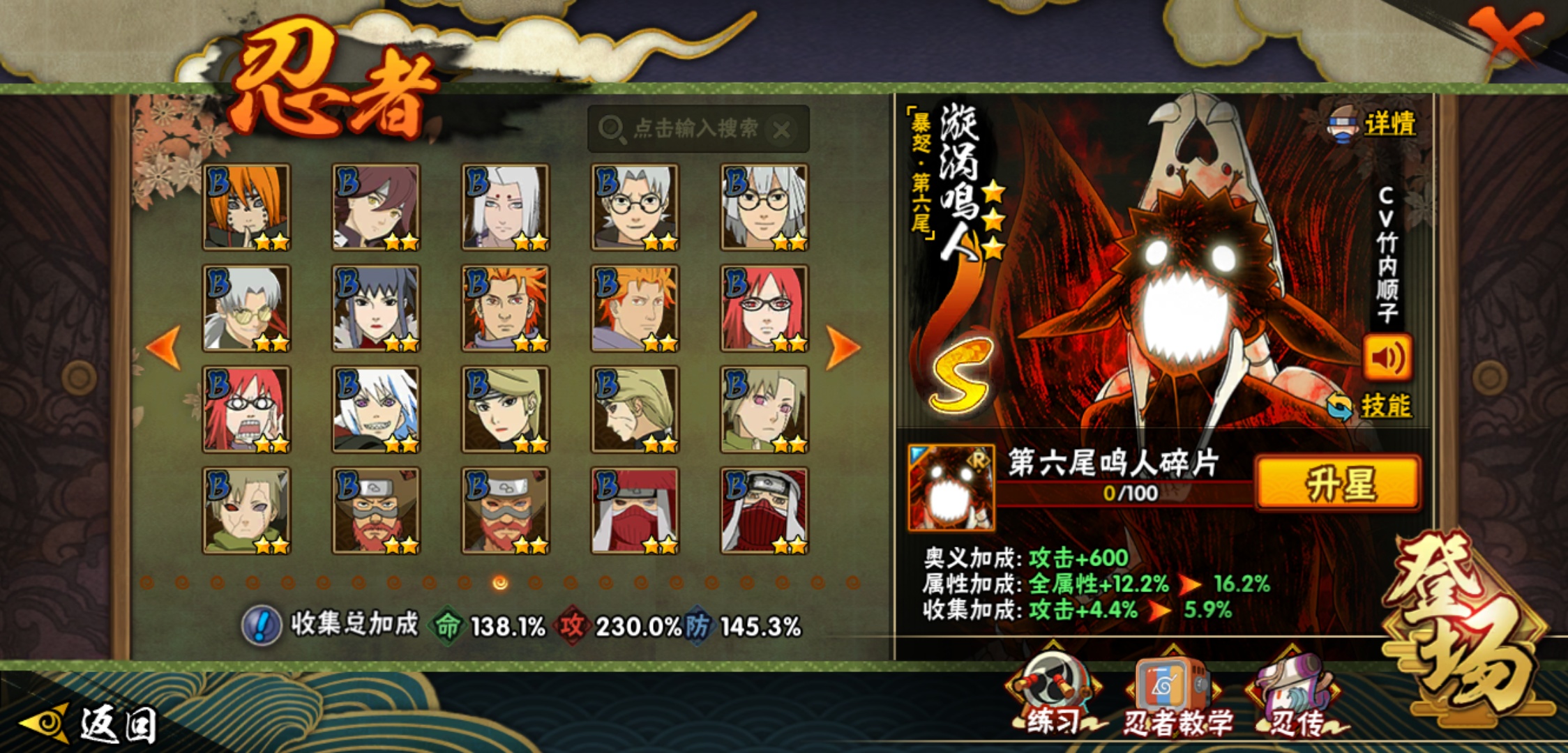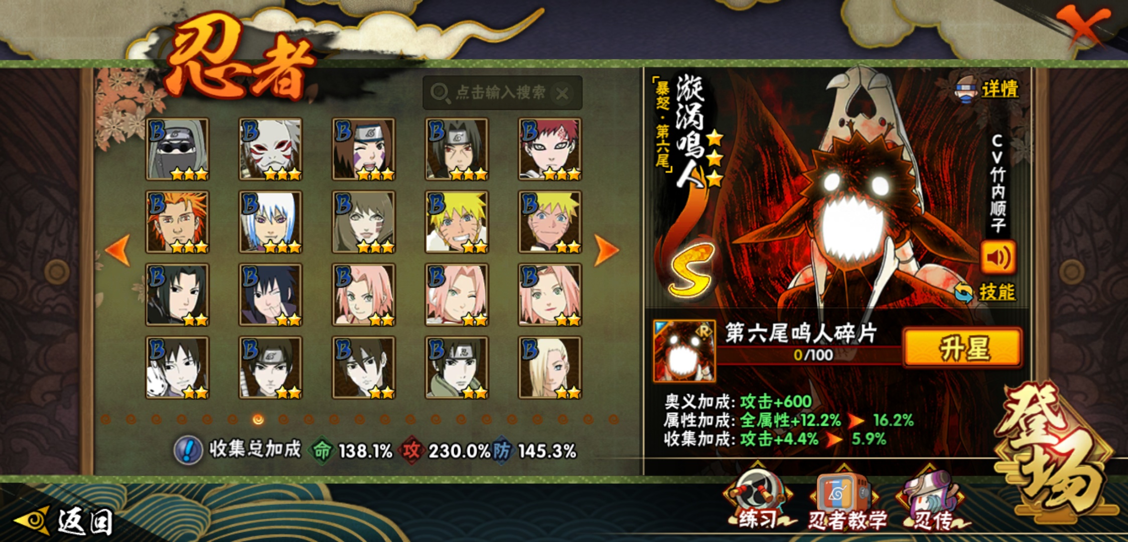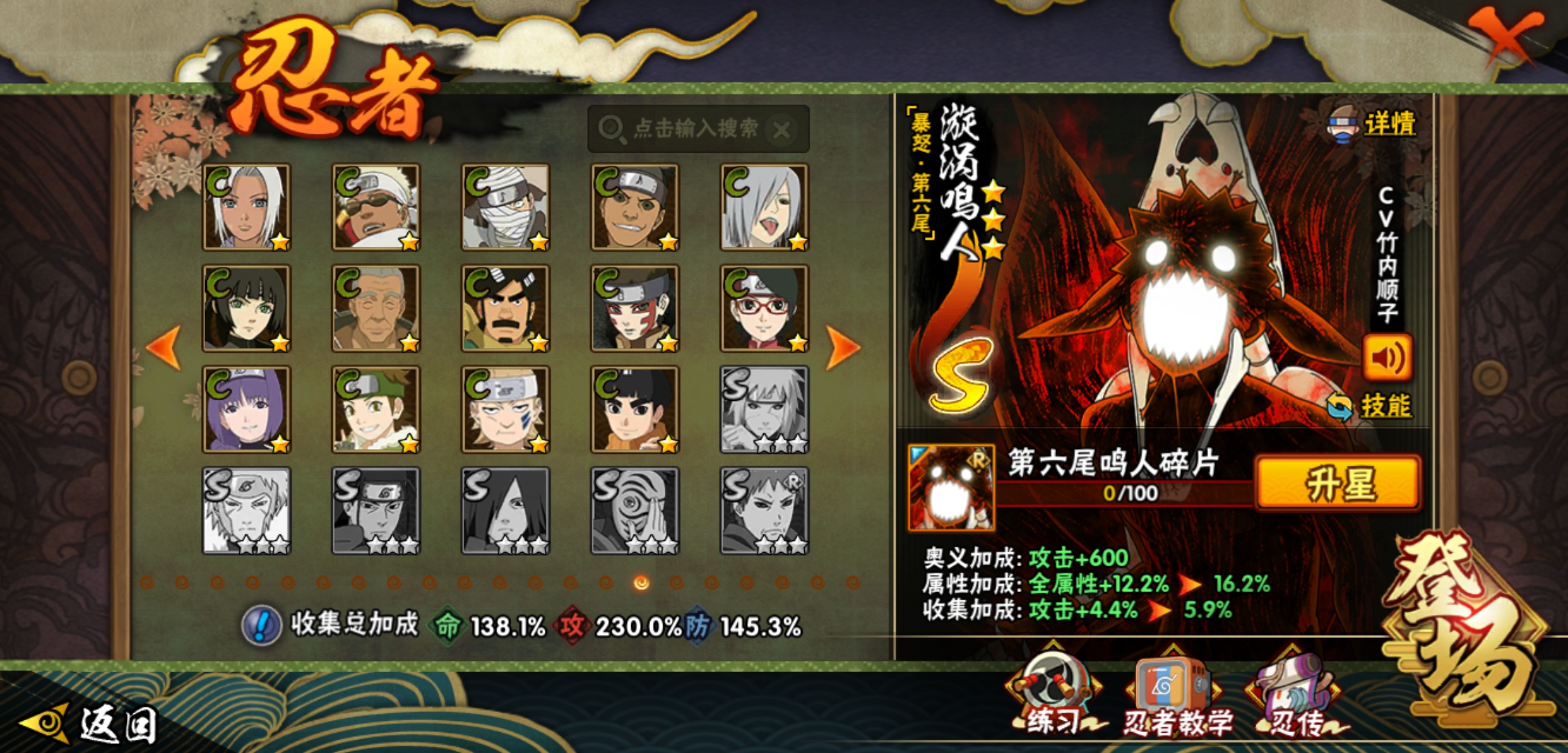 【火影忍者】【lyhy8964】战斗力:2255w;段位:上忍3阶;本服排名:33;vip:v12级;s忍:40个;a忍:57个;通灵兽:26个,s忍:纲手(普通) 5星|猿飞日斩(普通) 5星|大蛇丸(普通) 4星|须佐能乎宇智波鼬 4星|暴怒第六尾漩涡鸣人|九喇嘛连结漩涡鸣人|永恒万花筒宇智波佐助|忍界大战春野樱|须佐能乎旗木卡卡西|自来也(普通)|仙人模式自来也|舞之豪杰自来也|传说中的三忍自来也|百豪纲手|死门迈特凯|波风水门|九喇嘛连结波风水门|秽土转生猿飞日斩|秽土转生千手扉间|木叶创立千手柱间|秽土转生千手柱间|秽土转生宇智波斑|木叶创立宇智波斑|秽土转生解宇智波斑|秽土转生宇智波鼬|须佐能乎宇智波止水|白面具宇智波斑|五影会谈宇智波斑|忍界大战宇智波带土|红夜之刃神秘面具男|初代目风影烈斗|忍界大战艾|忍界大战大野木|秽土转生半藏|天道佩恩|秽土转生长门|仙人模式药师兜|最终章大筒木舍人|大筒木桃式|博人传大筒木金式__a忍:迈特凯(普通) 5星|猿飞阿斯玛(普通) 5星|蝎(普通) 5星|干柿鬼鲛(普通) 5星|死司凭血飞段 5星|疾风传我爱罗 4星|飞段(普通) 4星|初始形态机械鸣人|忍者之路神秘面具男|仙人模式漩涡鸣人|九尾查克拉漩涡鸣人|万花筒写轮眼宇智波佐助|须佐能乎宇智波佐助|侠隐江湖宇智波佐助|宇智波泉奈|百豪春野樱|忍界大战秋道丁次|忍界大战日向宁次|忍界大战李洛克|幻之真容旗木卡卡西|万花筒写轮眼旗木卡卡西|宇智波止水(普通)|青年波风水门|新春限定我爱罗|忍界大战我爱罗|近松十人卫千代|五代目水影照美冥|秽土转生桃地再不斩|桃地再不斩|忍界大战奇拉比|奇拉比(普通)|青年艾|忍界大战土台|半蛇斗篷药师兜|不风|不动|青年长门|小南(普通)|角都(普通)|地怨虞角都|秽土转生角都|新春限定大蛇丸|晓大蛇丸|绯流琥蝎|宇智波鼬(普通)|夏日限定宇智波鼬|迪达拉(普通)|秽土转生迪达拉|侠隐江湖大野木|羁绊神农|木叶上忍猿飞木叶丸|桃式显现漩涡博人|六代目水影长十郎|五代目雷影达鲁伊|仙人模式巳月|四代目土影黑土|夏日限定黑土__通灵兽:忍犬(普通)|蓝蛇|蛤蟆吉|忍龟|镰鼬|猿魔|山椒鱼|蜃|蛤蟆仙人|鲛鲨|蛤蟆健|乌鸦(普通)|蛞蝓(普通)|砂之守鹤|蛤蟆龙|蛤蟆广|怒鬼无臂|梦貘|怒鬼(普通)|鹰|怒鬼爪|蜘蛛|辛牙|熊猫|万蛇|乌鸦夏日限定