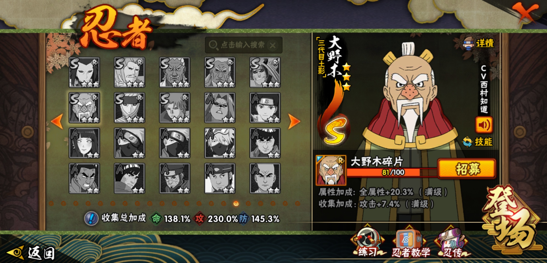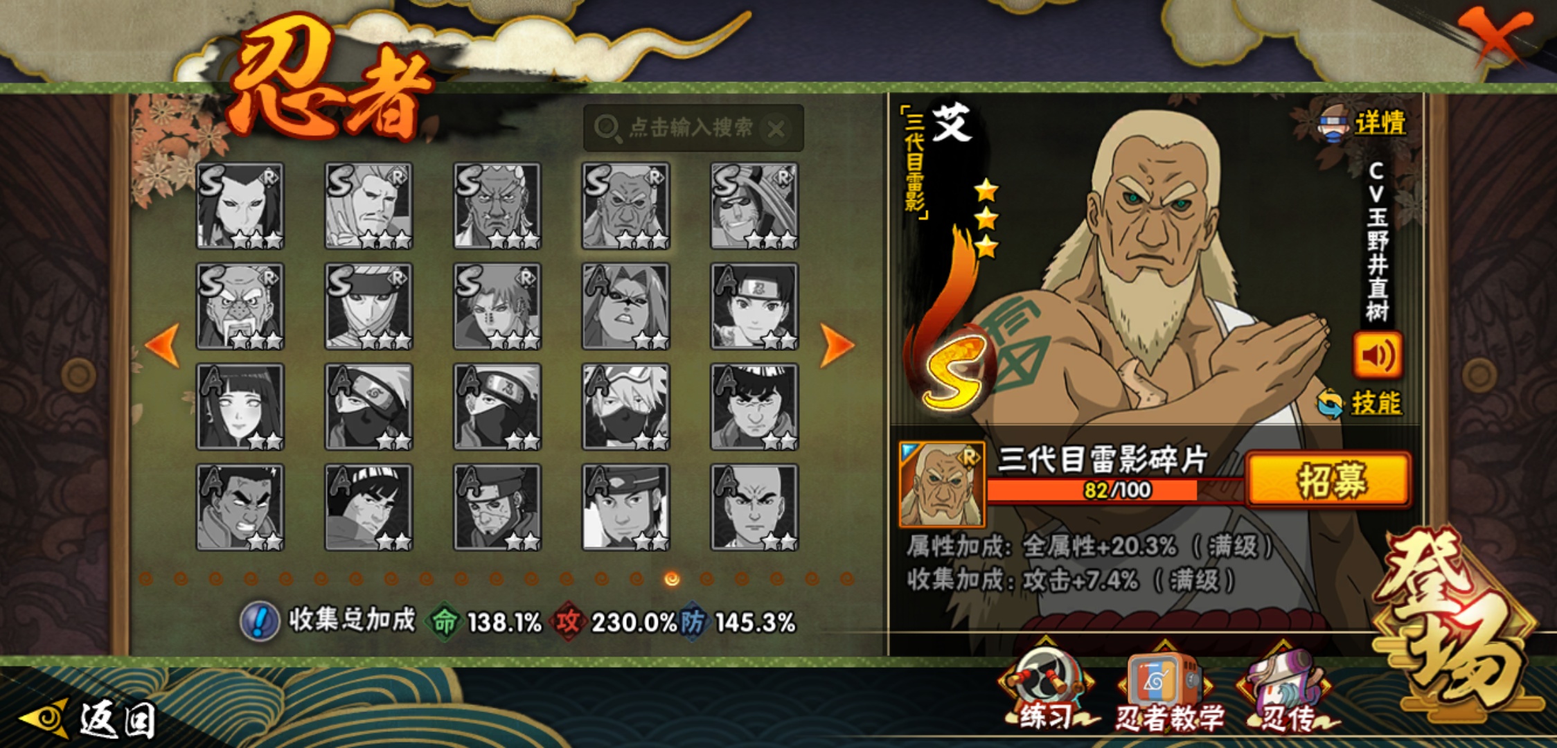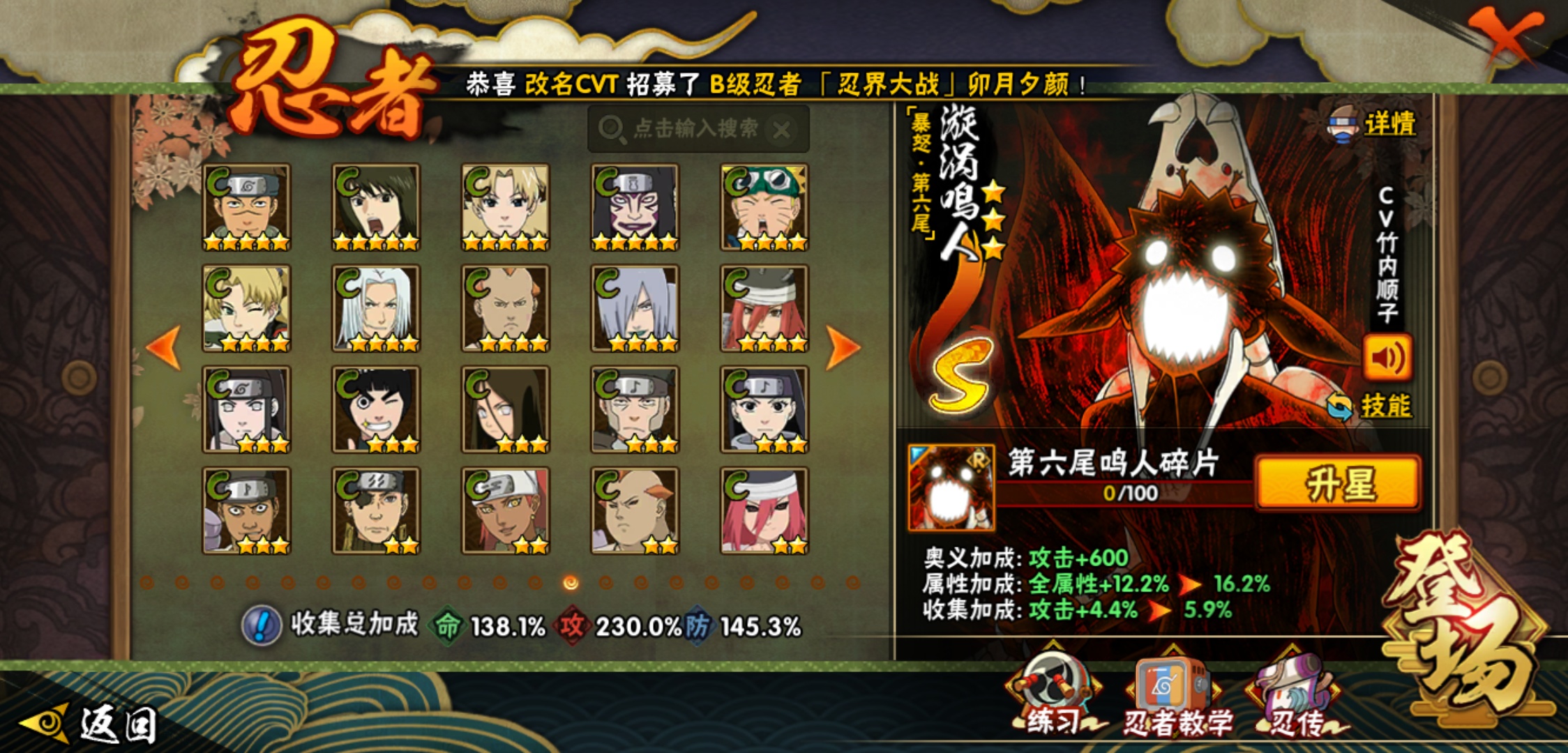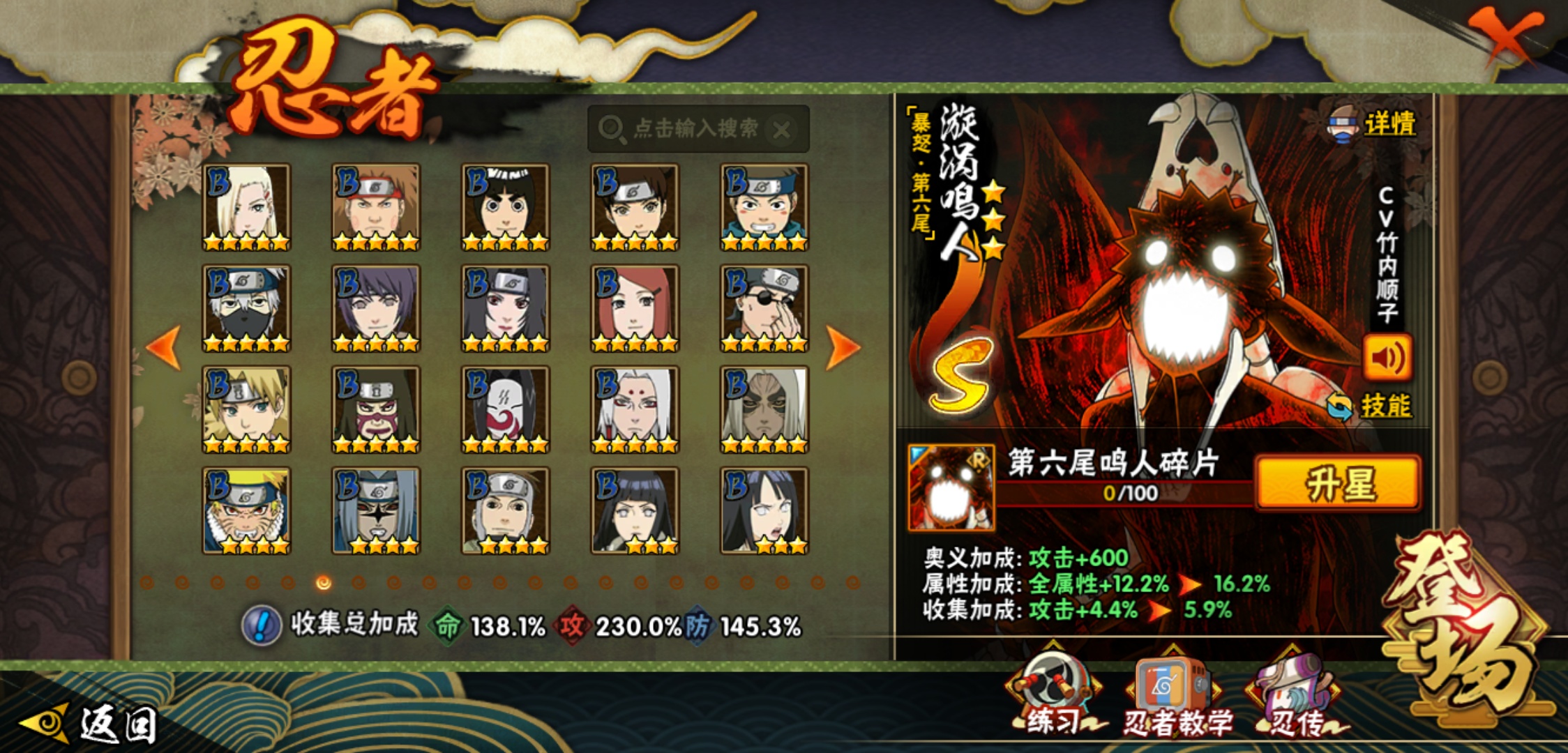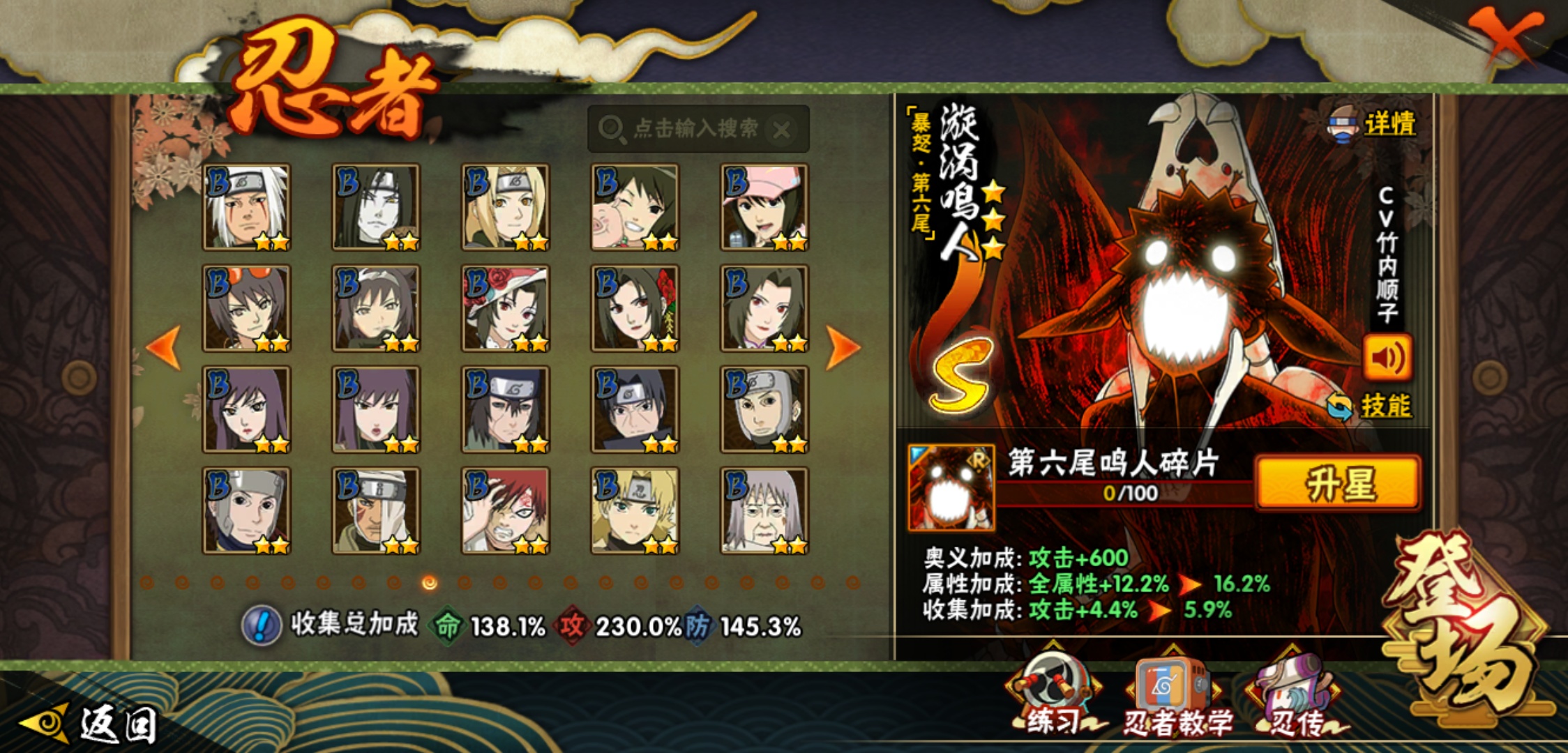 【火影忍者】【lyhy8964】战斗力:2255w;段位:上忍3阶;本服排名:33;vip:v12级;s忍:40个;a忍:57个;通灵兽:26个,s忍:纲手(普通) 5星|猿飞日斩(普通) 5星|大蛇丸(普通) 4星|须佐能乎宇智波鼬 4星|暴怒第六尾漩涡鸣人|九喇嘛连结漩涡鸣人|永恒万花筒宇智波佐助|忍界大战春野樱|须佐能乎旗木卡卡西|自来也(普通)|仙人模式自来也|舞之豪杰自来也|传说中的三忍自来也|百豪纲手|死门迈特凯|波风水门|九喇嘛连结波风水门|秽土转生猿飞日斩|秽土转生千手扉间|木叶创立千手柱间|秽土转生千手柱间|秽土转生宇智波斑|木叶创立宇智波斑|秽土转生解宇智波斑|秽土转生宇智波鼬|须佐能乎宇智波止水|白面具宇智波斑|五影会谈宇智波斑|忍界大战宇智波带土|红夜之刃神秘面具男|初代目风影烈斗|忍界大战艾|忍界大战大野木|秽土转生半藏|天道佩恩|秽土转生长门|仙人模式药师兜|最终章大筒木舍人|大筒木桃式|博人传大筒木金式__a忍:迈特凯(普通) 5星|猿飞阿斯玛(普通) 5星|蝎(普通) 5星|干柿鬼鲛(普通) 5星|死司凭血飞段 5星|疾风传我爱罗 4星|飞段(普通) 4星|初始形态机械鸣人|忍者之路神秘面具男|仙人模式漩涡鸣人|九尾查克拉漩涡鸣人|万花筒写轮眼宇智波佐助|须佐能乎宇智波佐助|侠隐江湖宇智波佐助|宇智波泉奈|百豪春野樱|忍界大战秋道丁次|忍界大战日向宁次|忍界大战李洛克|幻之真容旗木卡卡西|万花筒写轮眼旗木卡卡西|宇智波止水(普通)|青年波风水门|新春限定我爱罗|忍界大战我爱罗|近松十人卫千代|五代目水影照美冥|秽土转生桃地再不斩|桃地再不斩|忍界大战奇拉比|奇拉比(普通)|青年艾|忍界大战土台|半蛇斗篷药师兜|不风|不动|青年长门|小南(普通)|角都(普通)|地怨虞角都|秽土转生角都|新春限定大蛇丸|晓大蛇丸|绯流琥蝎|宇智波鼬(普通)|夏日限定宇智波鼬|迪达拉(普通)|秽土转生迪达拉|侠隐江湖大野木|羁绊神农|木叶上忍猿飞木叶丸|桃式显现漩涡博人|六代目水影长十郎|五代目雷影达鲁伊|仙人模式巳月|四代目土影黑土|夏日限定黑土__通灵兽:忍犬(普通)|蓝蛇|蛤蟆吉|忍龟|镰鼬|猿魔|山椒鱼|蜃|蛤蟆仙人|鲛鲨|蛤蟆健|乌鸦(普通)|蛞蝓(普通)|砂之守鹤|蛤蟆龙|蛤蟆广|怒鬼无臂|梦貘|怒鬼(普通)|鹰|怒鬼爪|蜘蛛|辛牙|熊猫|万蛇|乌鸦夏日限定