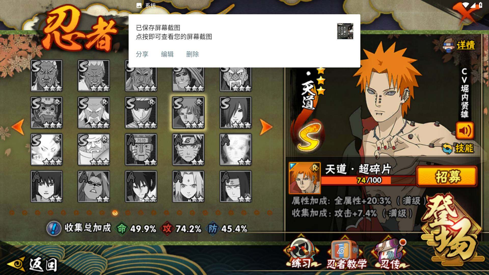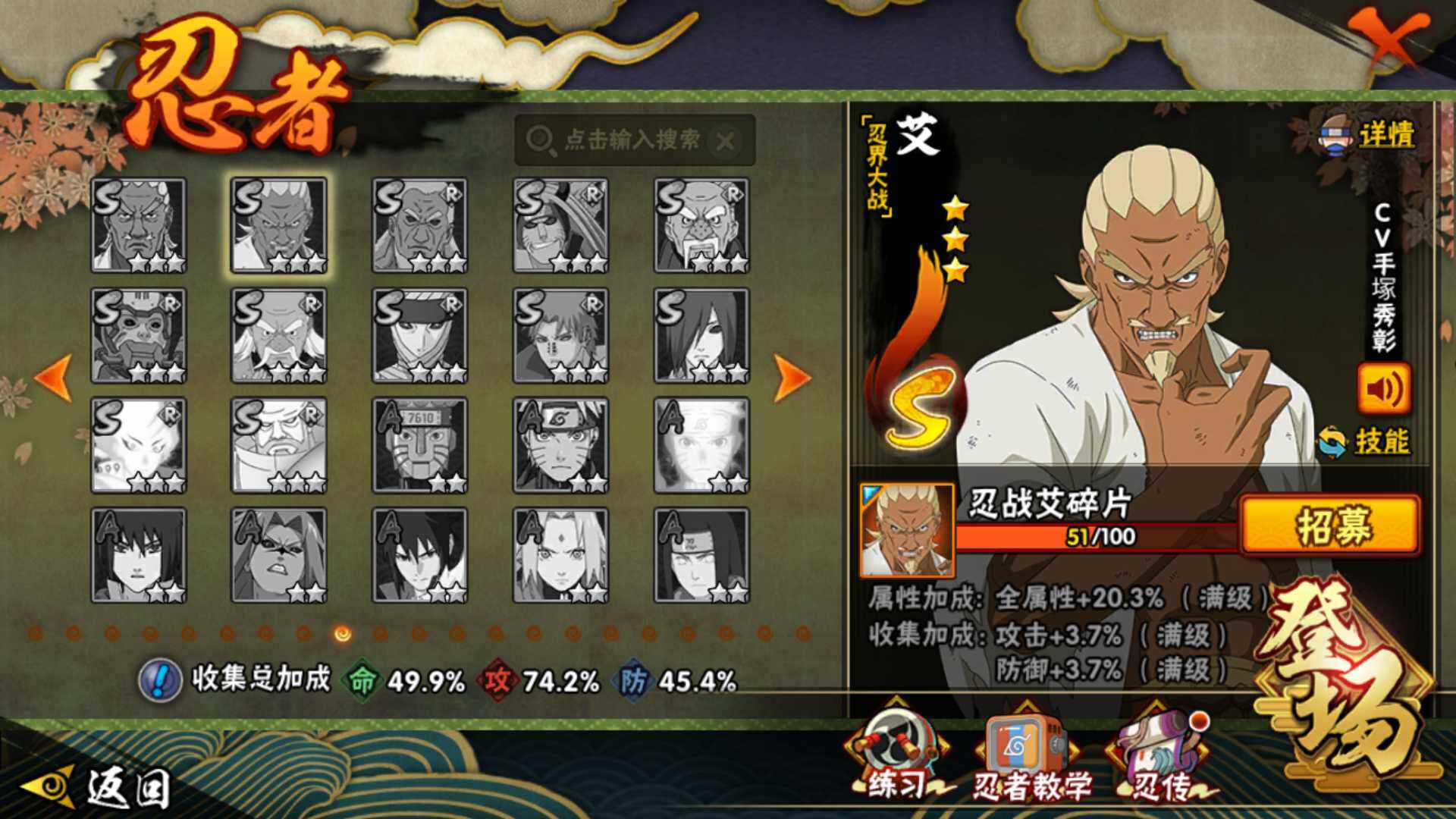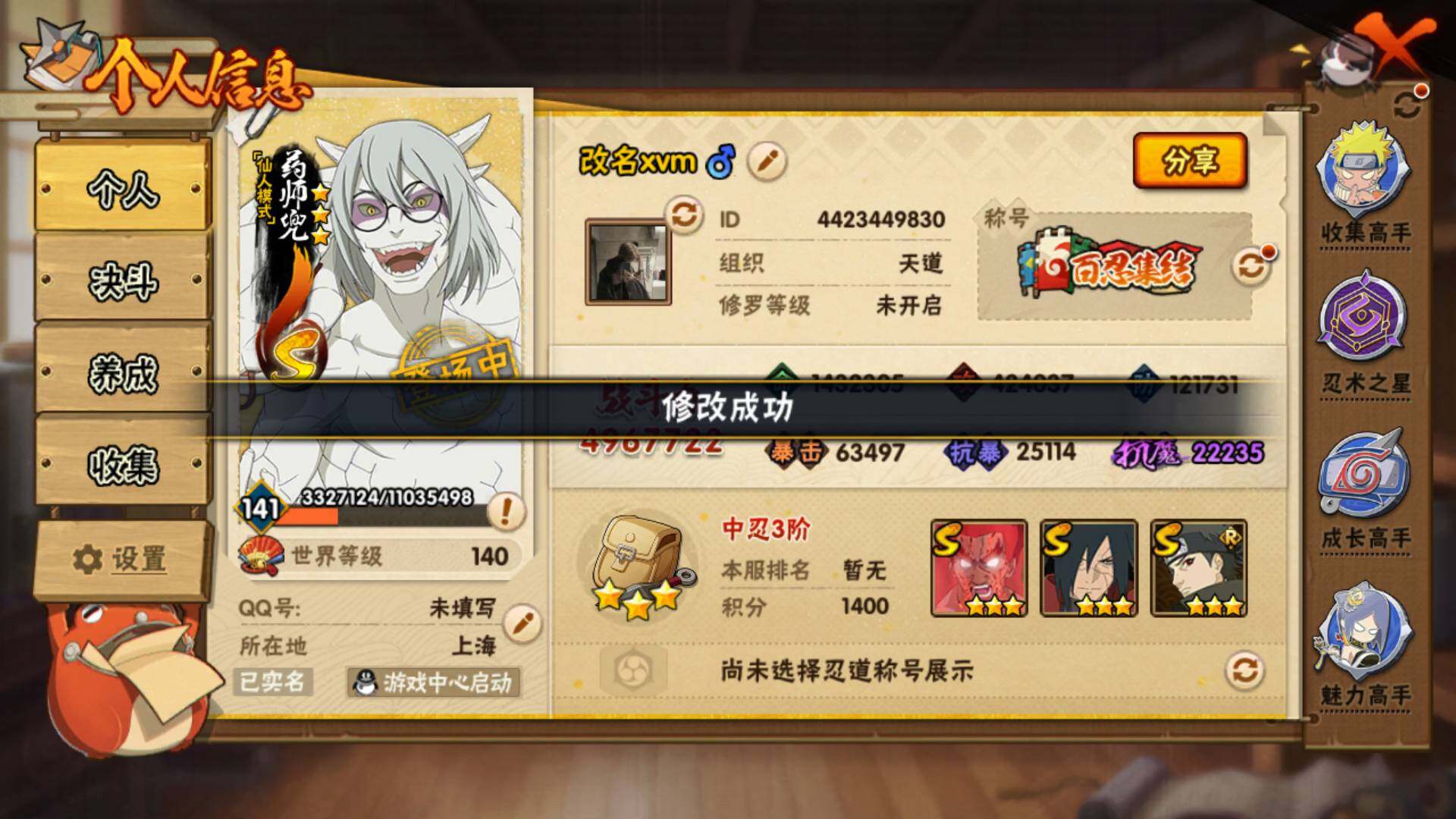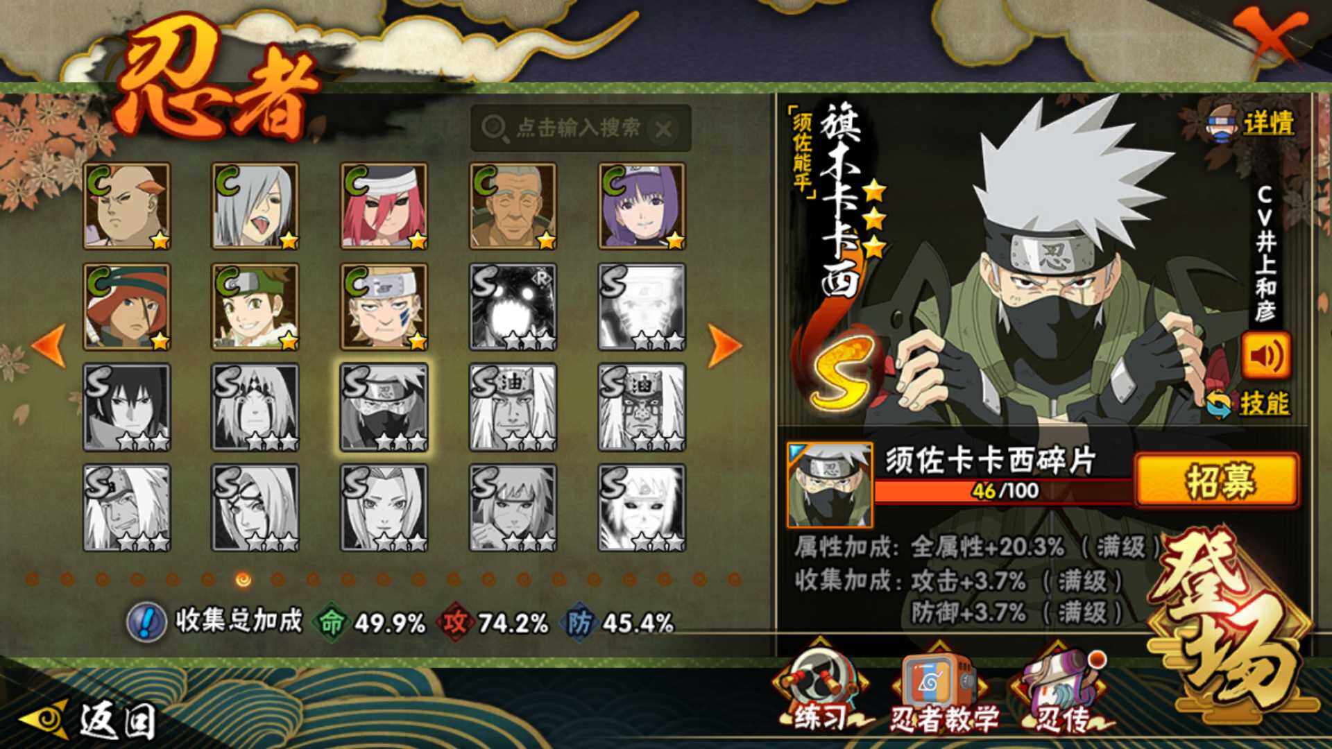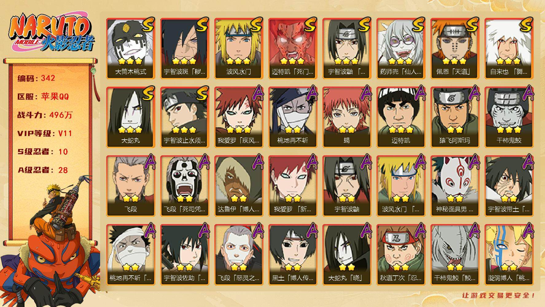 [14340251]v11 10s 28a 496万战力 天道超74片 忍战艾51片 卡卡西46片 zp3282 【s级忍者】:宇智波斑「秽土转生·解」3星,宇智波鼬「须佐能乎」3星,宇智波止水「须佐能乎」3星,自来也「舞之豪杰」3星,大蛇丸3星,波风水门3星,药师兜「仙人模式」3星,迈特凯「死门」3星,佩恩「天道」3星,大筒木桃式3星 【a级忍者】:波风水门「青年」2星,达鲁伊「博人传」2星,大蛇丸「晓」2星,飞段2星,飞段「死司凭血」2星,飞段「恶灵之影」2星,干柿鬼鲛3星,干柿鬼鲛「鲛肌融合」2星,漩涡博人「桃式显现」2星,迈特凯3星,桃地再不斩2星,桃地再不斩「漂泊武士」2星,我爱罗「疾风传」3星,我爱罗「新春限定」2星,蝎2星,蝎「绯流琥」2星,猿飞阿斯玛2星,宇智波鼬2星,宇智波佐助「须佐能乎」2星,药师兜「侠影江湖」2星,宇智波带土「暴怒」2星,神秘面具男「忍者之路」2星,李洛克「忍界大战」2星,黑土「博人传」2星,秋道丁次「忍界大战」2星,神农「羁绊」2星,宇智波泉奈2星,大野木「侠隐江湖」2星