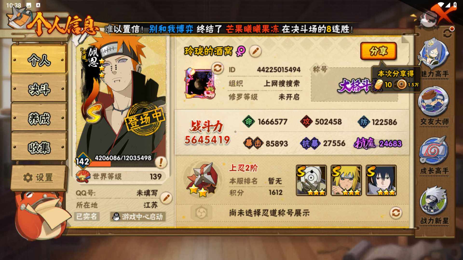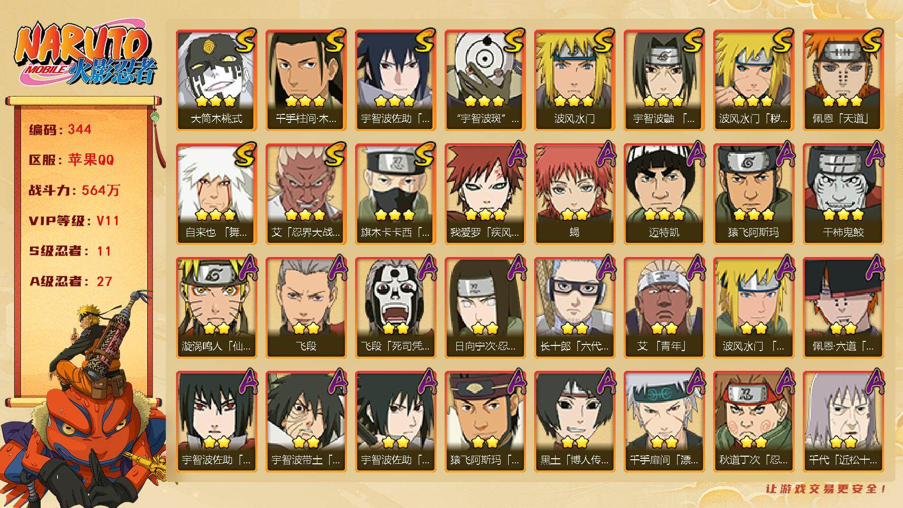 [14342077]v11 11s 27a 564万战力 zp3283 【s级忍者】:波风水门「秽土转生」3星,艾「忍界大战」3星,宇智波鼬「须佐能乎」3星,旗木卡卡西「须佐能乎」3星,千手柱间「木叶创立」3星,自来也「舞之豪杰」3星,波风水门3星,佩恩「天道」3星,宇智波佐助「永恒万花筒」3星,宇智波斑 「白面具」3星宇智波斑「白面具」,大筒木桃式3星 【a级忍者】:艾「青年」2星,波风水门「青年」2星,飞段2星,飞段「死司凭血」2星,干柿鬼鲛3星,漩涡博人「桃式显现」2星,漩涡鸣人「仙人模式」2星,迈特凯3星,我爱罗「疾风传」3星,蝎2星,小南「漂泊浪客」2星,猿飞阿斯玛3星,猿飞阿斯玛「七夕限定」2星,宇智波鼬「夏日限定」2星,宇智波佐助「须佐能乎」2星,宇智波佐助「万花筒写轮眼」2星,日向宁次「忍界大战」2星,宇智波带土「暴怒」2星,长十郎「六代目水影」2星,佩恩·六道「漂泊浪客」2星,李洛克「忍界大战」2星,黑土「博人传」2星,千手扉间「漂泊武士」2星,秋道丁次「忍界大战」2星,千代「近松十人卫」2星,宇智波泉奈2星,大野木「侠隐江湖」2星