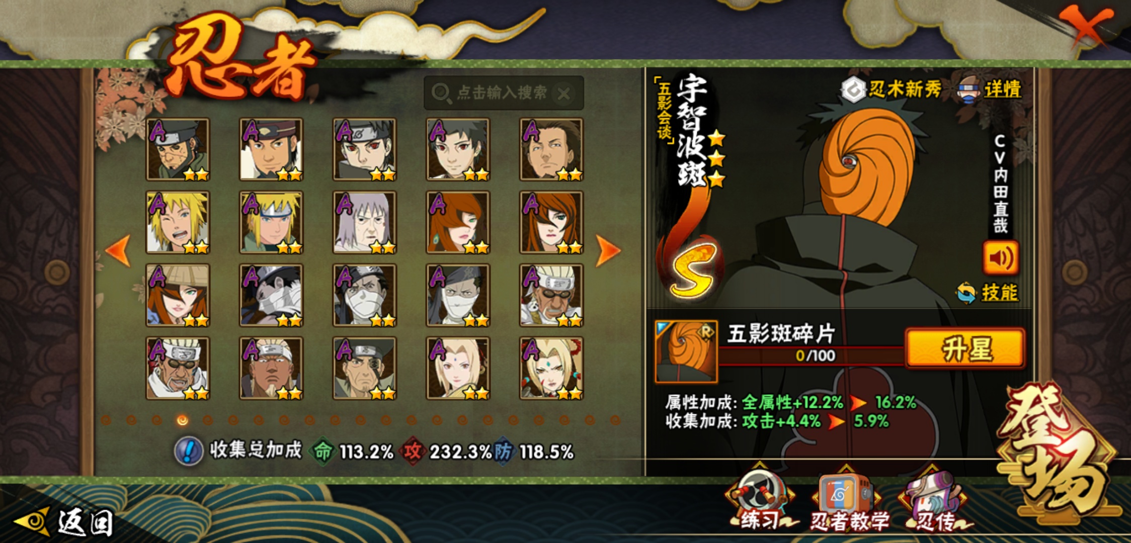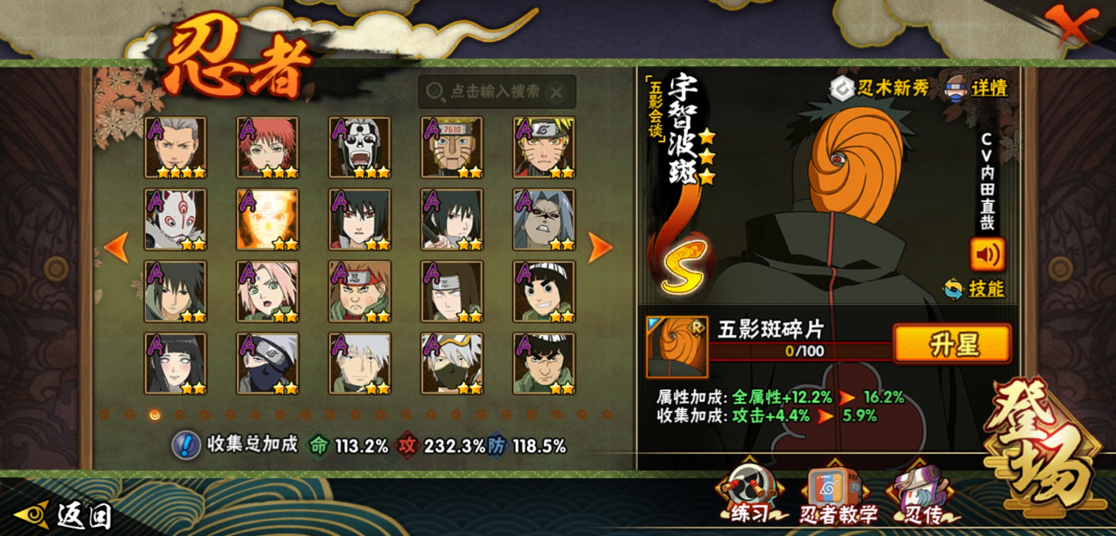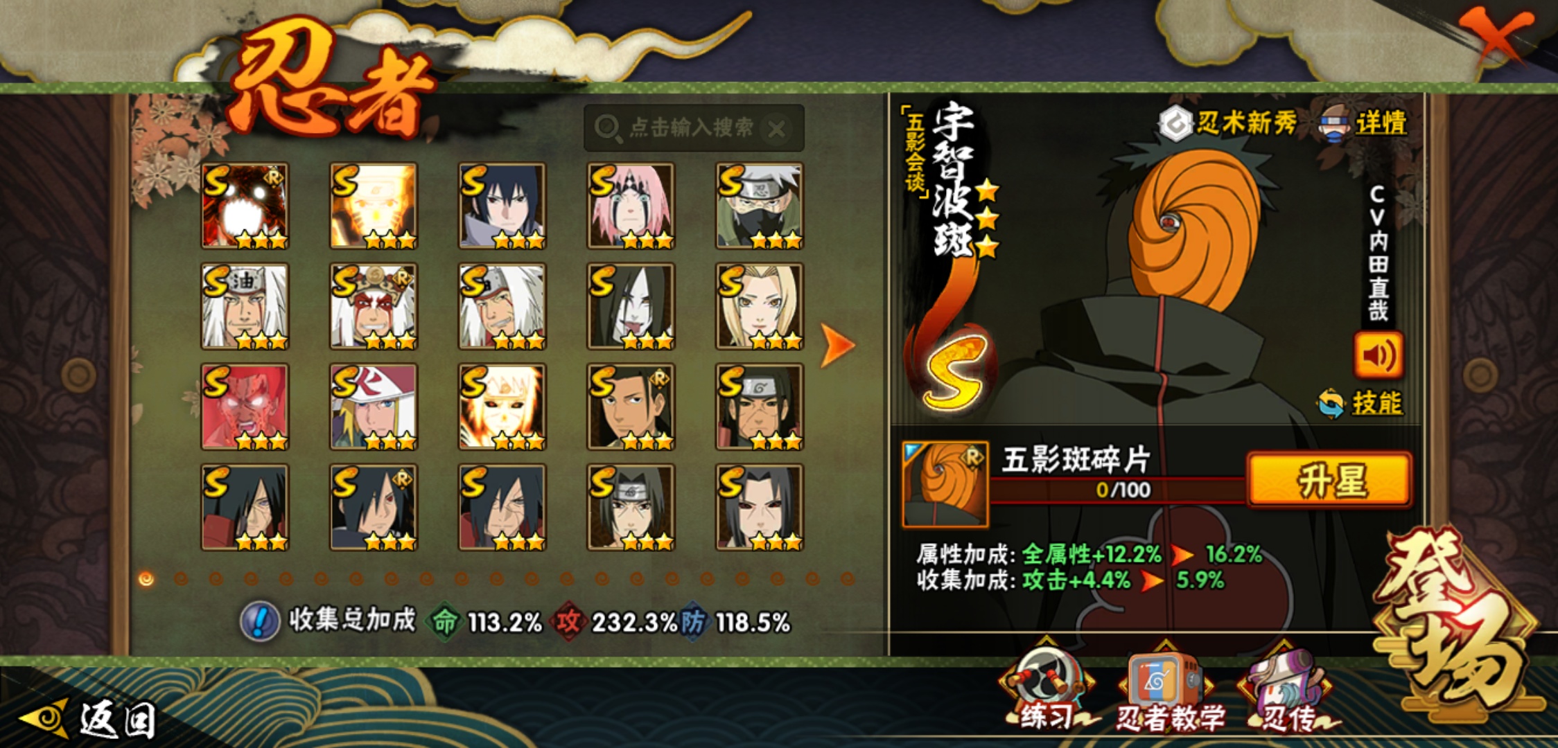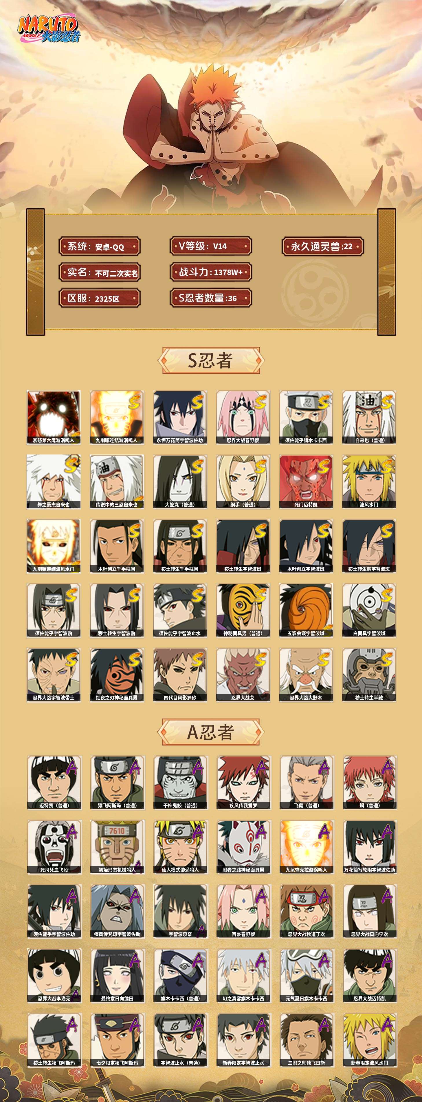 【火影忍者】【lyhy8975】战斗力:1378w;段位:上忍2阶;本服排名:238;vip:v14级;s忍:36个;a忍:74个;通灵兽:22个,s忍:暴怒第六尾漩涡鸣人|九喇嘛连结漩涡鸣人|永恒万花筒宇智波佐助|忍界大战春野樱|须佐能乎旗木卡卡西|自来也(普通)|舞之豪杰自来也|传说中的三忍自来也|大蛇丸(普通)|纲手(普通)|死门迈特凯|波风水门|九喇嘛连结波风水门|木叶创立千手柱间|秽土转生千手柱间|秽土转生宇智波斑|木叶创立宇智波斑|秽土转生解宇智波斑|须佐能乎宇智波鼬|秽土转生宇智波鼬|须佐能乎宇智波止水|神秘面具男(普通)|五影会谈宇智波斑|白面具宇智波斑|忍界大战宇智波带土|红夜之刃神秘面具男|四代目风影罗砂|忍界大战艾|忍界大战大野木|秽土转生半藏|天道佩恩|超佩恩天道|仙人模式药师兜|最终章大筒木舍人|大筒木桃式|博人传大筒木金式__a忍:迈特凯(普通) 5星|猿飞阿斯玛(普通) 5星|干柿鬼鲛(普通) 5星|疾风传我爱罗 4星|飞段(普通) 4星|蝎(普通) 3星|死司凭血飞段 3星|初始形态机械鸣人|仙人模式漩涡鸣人|忍者之路神秘面具男|九尾查克拉漩涡鸣人|万花筒写轮眼宇智波佐助|须佐能乎宇智波佐助|疾风传咒印宇智波佐助|宇智波泉奈|百豪春野樱|忍界大战秋道丁次|忍界大战日向宁次|忍界大战李洛克|最终章日向雏田|旗木卡卡西(普通)|幻之真容旗木卡卡西|元气夏日旗木卡卡西|忍界大战迈特凯|秽土转生猿飞阿斯玛|七夕限定猿飞阿斯玛|宇智波止水(普通)|新春限定宇智波止水|三忍之师猿飞日斩|新春限定波风水门|青年波风水门|近松十人卫千代|夏日泳装照美冥|五代目水影照美冥|侠隐江湖照美冥|秽土转生桃地再不斩|桃地再不斩|漂泊武士桃地再不斩|忍界大战奇拉比|奇拉比(普通)|青年艾|忍界大战土台|侠隐江湖纲手|妖怪奇谭纲手|漂泊武士千手扉间|侠隐江湖药师兜|半蛇斗篷药师兜|不缘|青年长门|漂泊浪客佩恩六道|小南(普通)|漂泊浪客小南|黑绝|地怨虞角都|秽土转生角都|新春限定大蛇丸|晓大蛇丸|绯流琥蝎|宇智波鼬(普通)|新春限定宇智波鼬|夏日限定宇智波鼬|迪达拉(普通)|恶灵之影飞段|晓创生飞段|暴怒宇智波带土|漂泊浪客宇智波带土|侠隐江湖大野木|火之意志继承者卑留呼|羁绊神农|桃式显现漩涡博人|六代目水影长十郎|五代目雷影达鲁伊|四代目土影黑土|夏日限定黑土__通灵兽:忍犬(普通)|蓝蛇|砂之守鹤|蛤蟆吉|忍龟|镰鼬|猿魔|山椒鱼|蛞蝓(普通)|蜃|蛤蟆仙人|鲛鲨|蛤蟆健|熊猫|乌鸦(普通)|蛤蟆龙|怒鬼无臂|蛤蟆广|蛞蝓侠隐江湖|梦貘|万蛇|鹰
