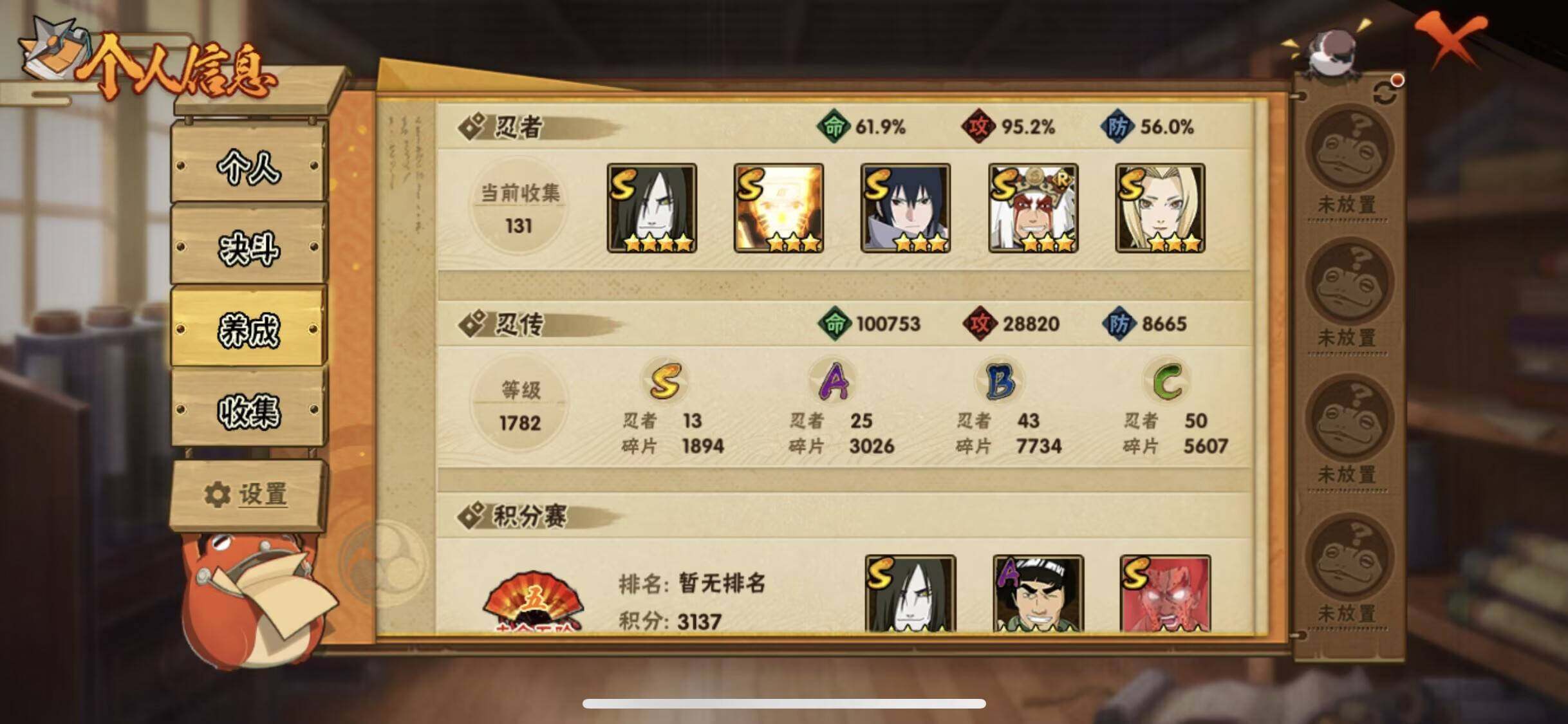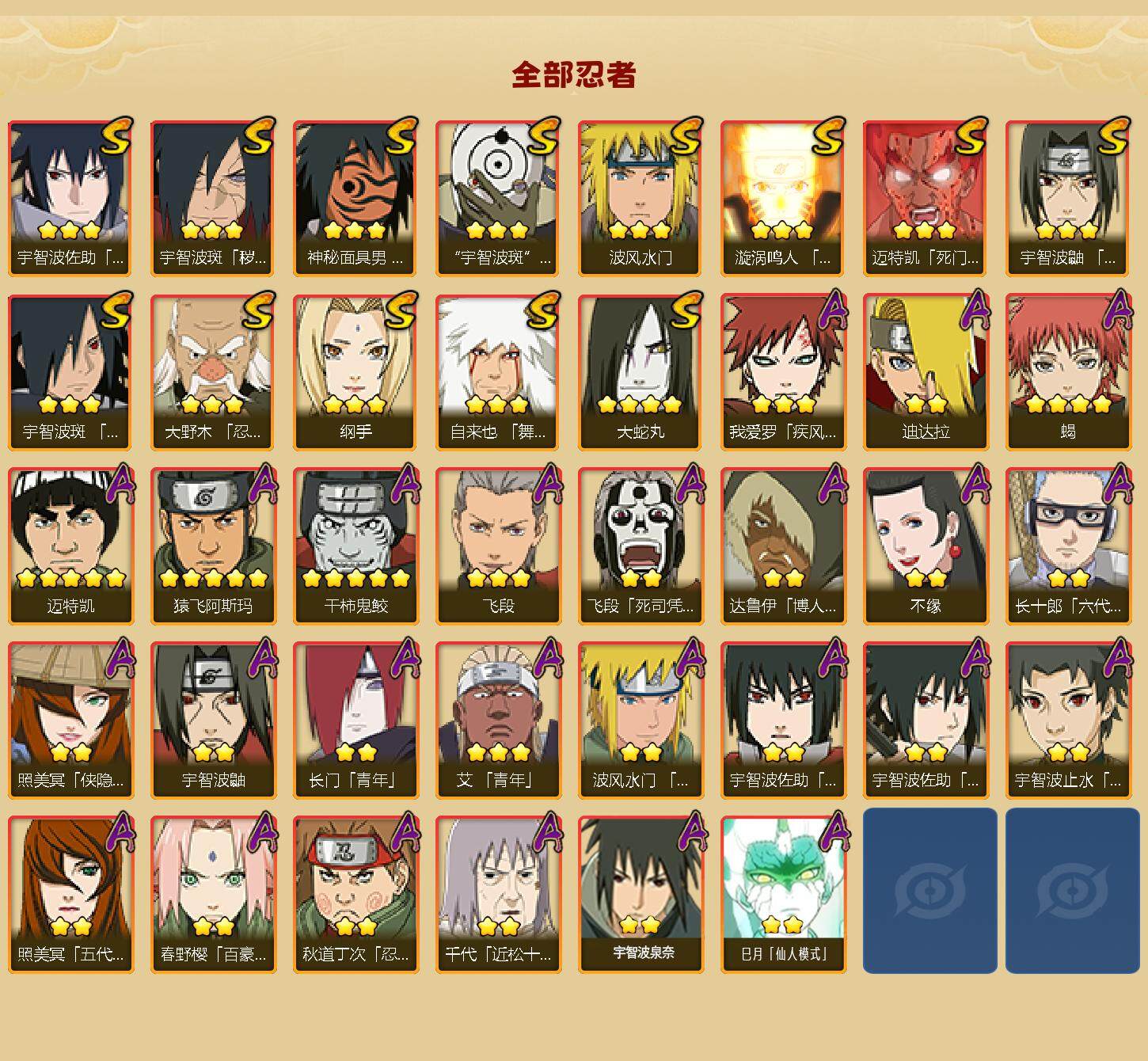 【h3476】v11/s忍13/a忍25/纲手/达鲁伊/死司飞段/宇智波鼬/4星大蛇丸/永恒万花筒佐助/5星猿飞阿斯玛/2星长门「青年」/3星飞段/4星蝎/照美冥/波风水门/九喇嘛鸣人/忍战丁次/5星迈特凯/3星我爱罗「疾风传」/3星艾「青年」/长十郎/青年水门/豪杰自来也/百豪樱/白面具/死门凯/3星神秘面具男「红夜之刃」/宇智波泉奈/新春止水/迪达拉/2星巳月「仙人模式」/创立斑/秽土