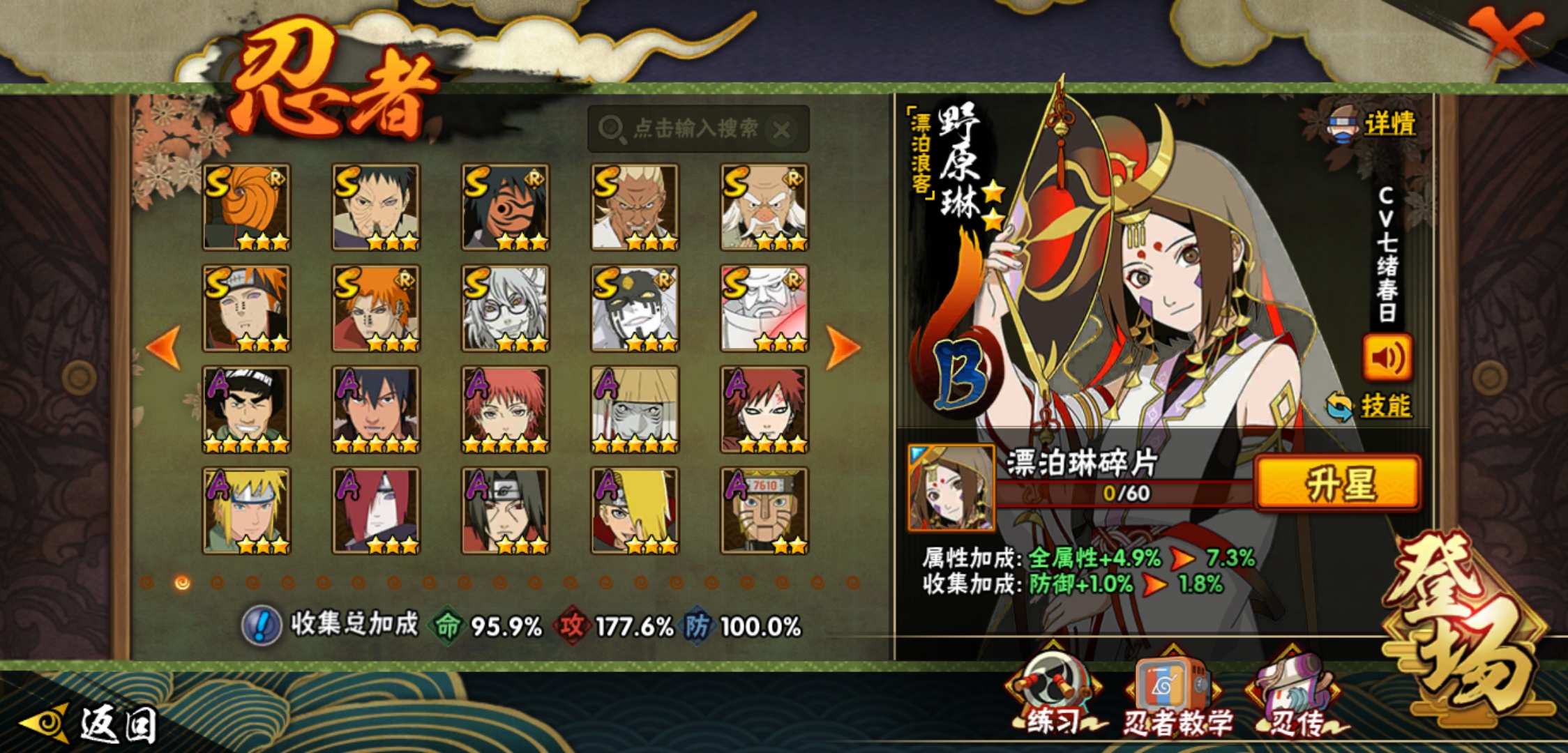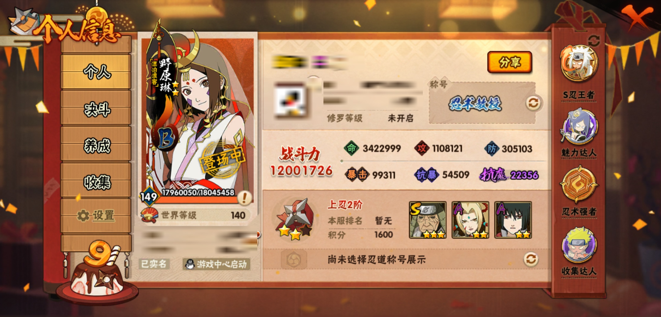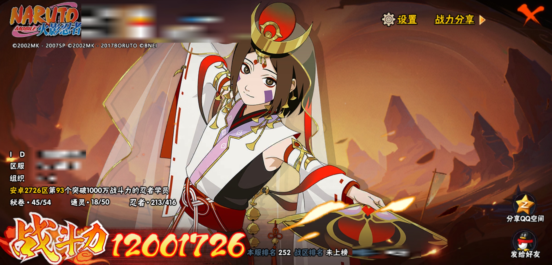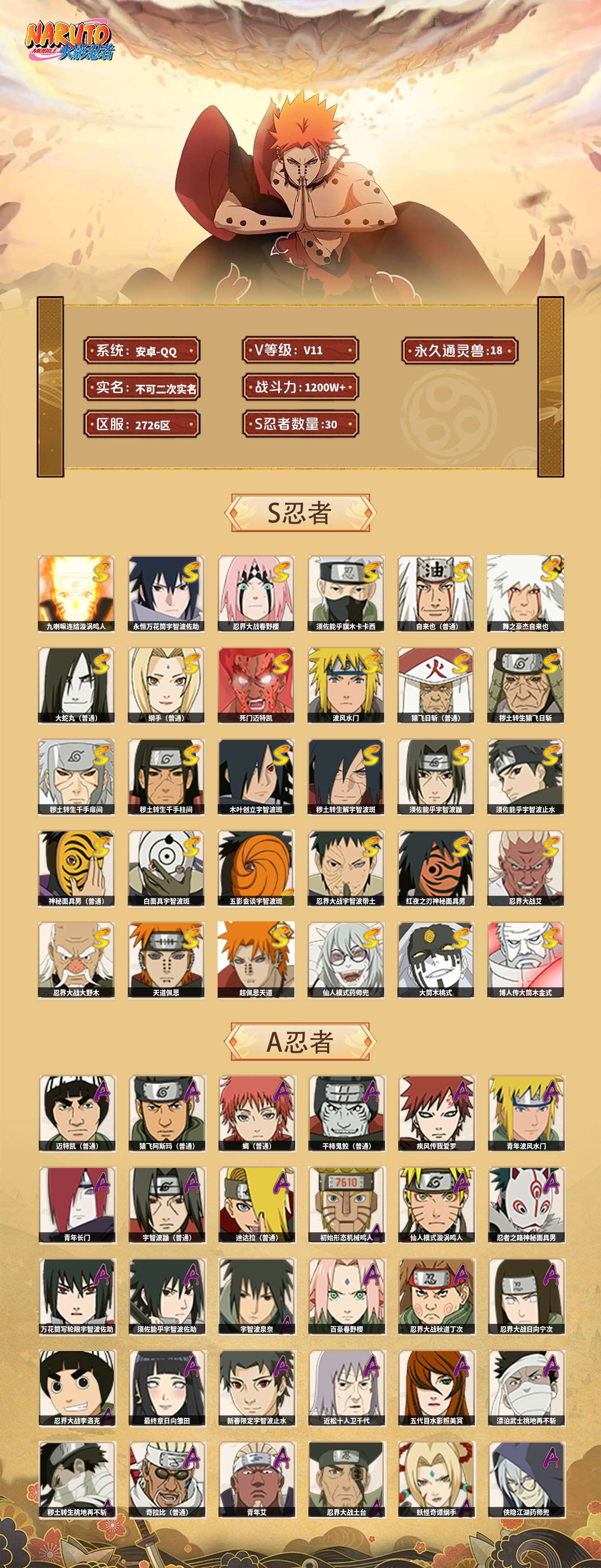 【火影忍者】【lyhy8985】战斗力:1200w;段位:上忍2阶;本服排名:252;vip:v11级;s忍:30个;a忍:40个;通灵兽:18个,s忍:九喇嘛连结漩涡鸣人|永恒万花筒宇智波佐助|忍界大战春野樱|须佐能乎旗木卡卡西|自来也(普通)|舞之豪杰自来也|大蛇丸(普通)|纲手(普通)|死门迈特凯|波风水门|猿飞日斩(普通)|秽土转生猿飞日斩|秽土转生千手扉间|秽土转生千手柱间|木叶创立宇智波斑|秽土转生解宇智波斑|须佐能乎宇智波鼬|须佐能乎宇智波止水|神秘面具男(普通)|白面具宇智波斑|五影会谈宇智波斑|忍界大战宇智波带土|红夜之刃神秘面具男|忍界大战艾|忍界大战大野木|天道佩恩|超佩恩天道|仙人模式药师兜|大筒木桃式|博人传大筒木金式__a忍:迈特凯(普通) 5星|猿飞阿斯玛(普通) 5星|蝎(普通) 5星|干柿鬼鲛(普通) 5星|疾风传我爱罗 4星|青年波风水门 3星|青年长门 3星|宇智波鼬(普通) 3星|迪达拉(普通) 3星|初始形态机械鸣人|仙人模式漩涡鸣人|忍者之路神秘面具男|万花筒写轮眼宇智波佐助|须佐能乎宇智波佐助|宇智波泉奈|百豪春野樱|忍界大战秋道丁次|忍界大战日向宁次|忍界大战李洛克|最终章日向雏田|新春限定宇智波止水|近松十人卫千代|五代目水影照美冥|漂泊武士桃地再不斩|秽土转生桃地再不斩|奇拉比(普通)|青年艾|忍界大战土台|妖怪奇谭纲手|侠隐江湖药师兜|漂泊浪客小南|晓大蛇丸|飞段(普通)|死司凭血飞段|侠隐江湖大野木|木叶上忍猿飞木叶丸|桃式显现漩涡博人|六代目水影长十郎|五代目雷影达鲁伊|四代目土影黑土__通灵兽:忍犬(普通)|蓝蛇|砂之守鹤|蛤蟆吉|忍龟|镰鼬|猿魔|山椒鱼|蜃|蛤蟆仙人|鲛鲨|蛤蟆健|蛞蝓(普通)|乌鸦(普通)|蛤蟆龙|蛤蟆广|梦貘|鹰