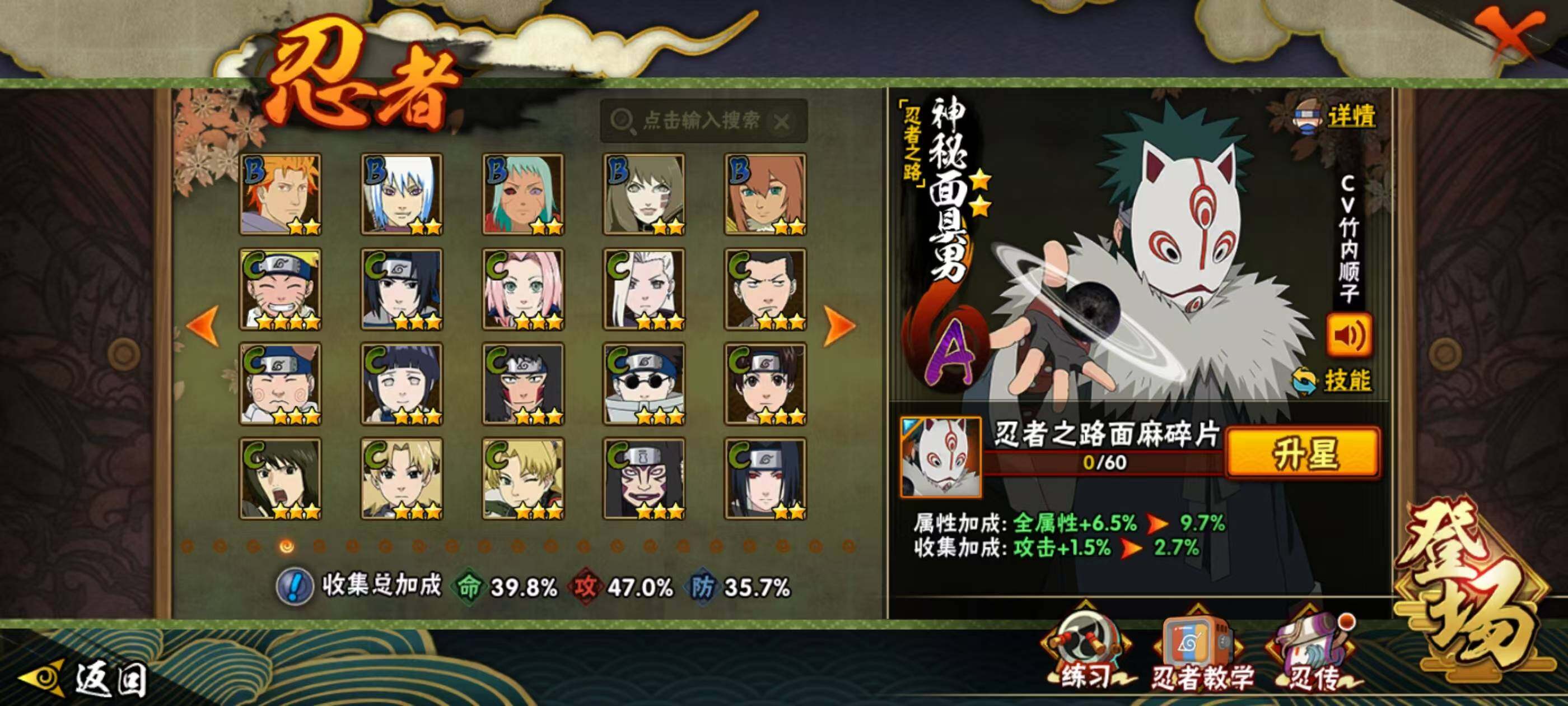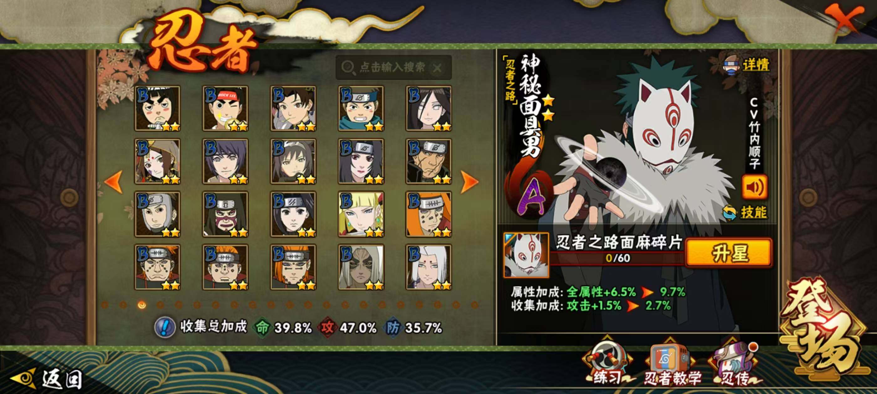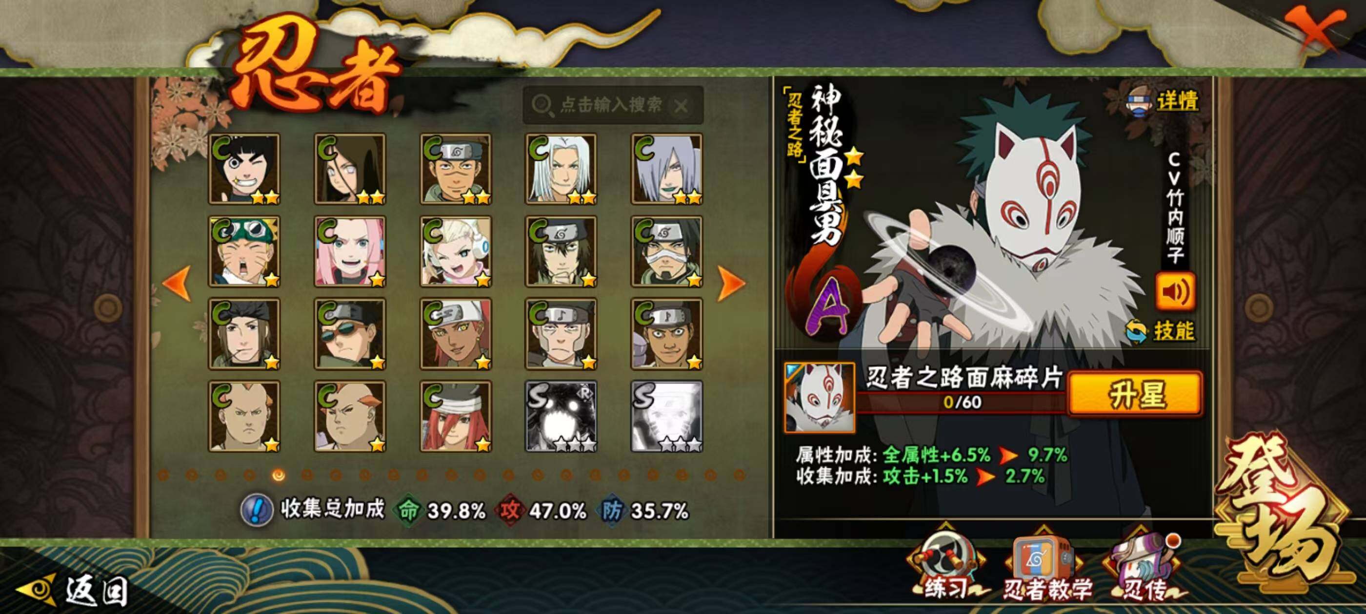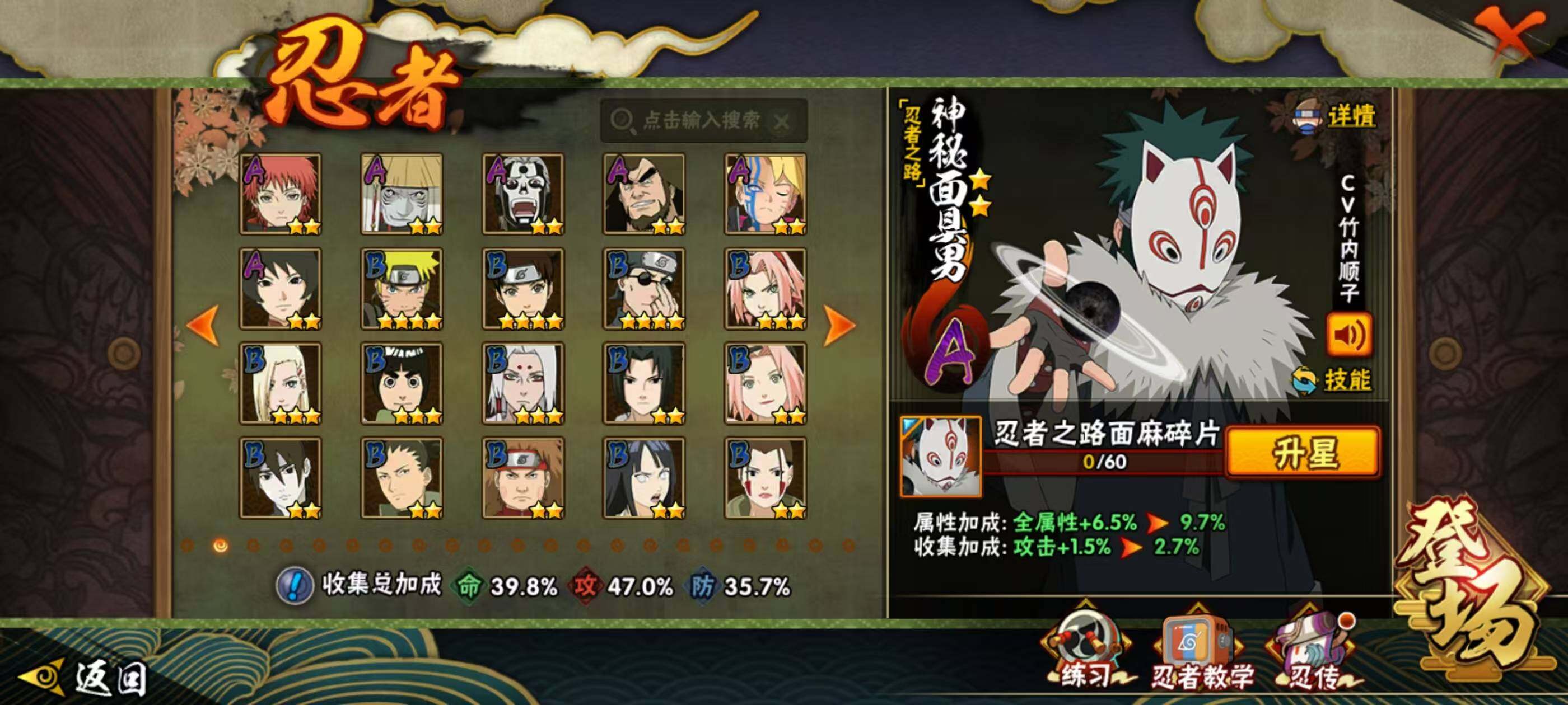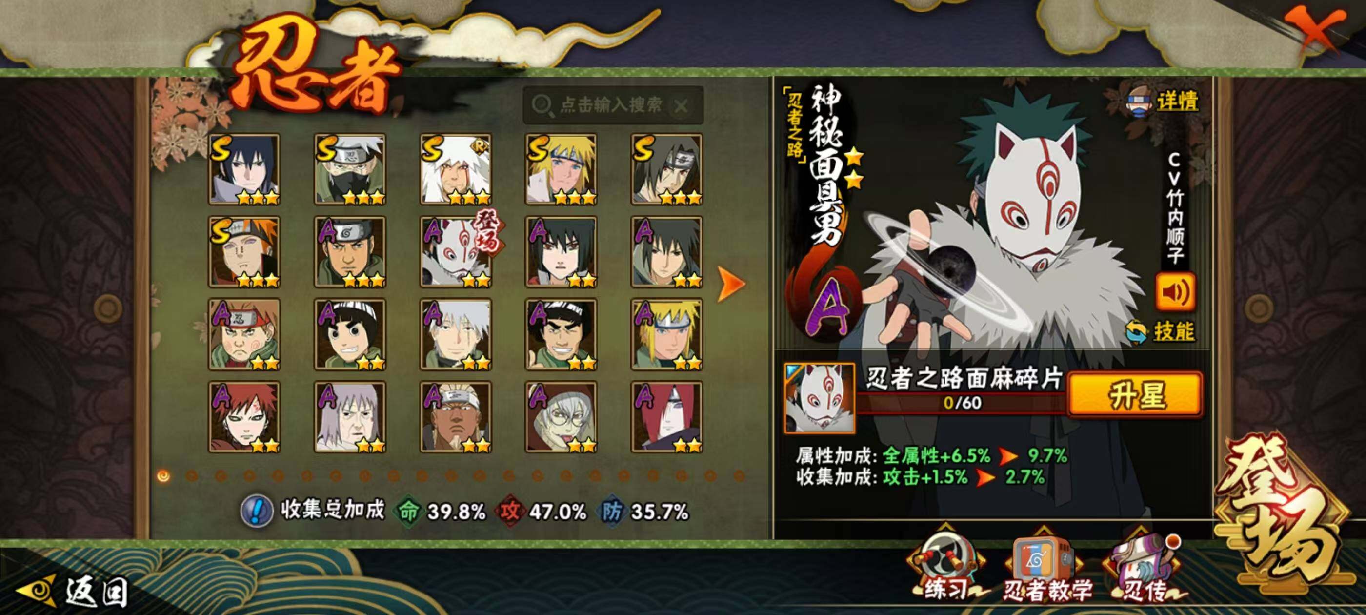 1724576 6s级忍者数-20a级忍者数 【s级忍者】:宇智波鼬「须佐能乎」3星,旗木卡卡西「须佐能乎」3星,自来也「舞之豪杰」3星,波风水门3星,佩恩「天道」3星,宇智波佐助「永恒万花筒」3星 【a级忍者】:艾「青年」2星,长门「青年」2星,波风水门「青年」2星,飞段「死司凭血」2星,干柿鬼鲛2星,漩涡博人「桃式显现」2星,迈特凯2星,