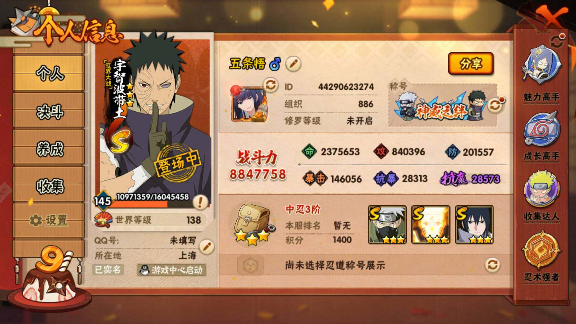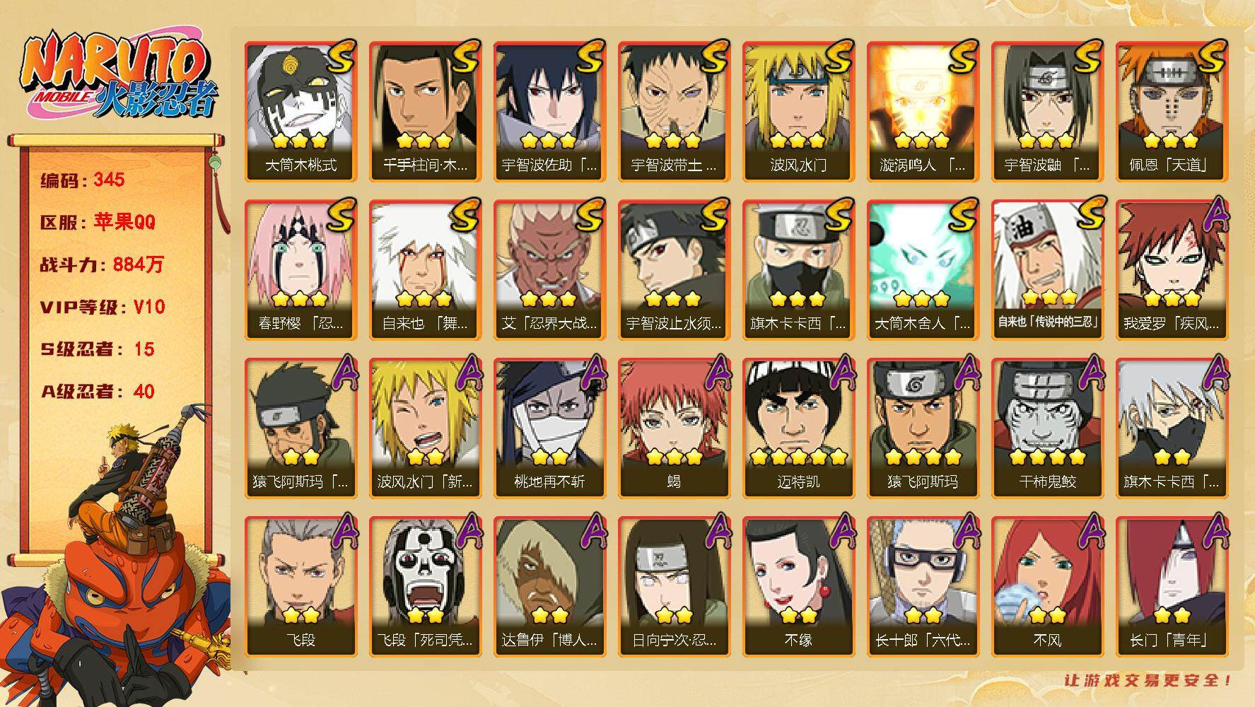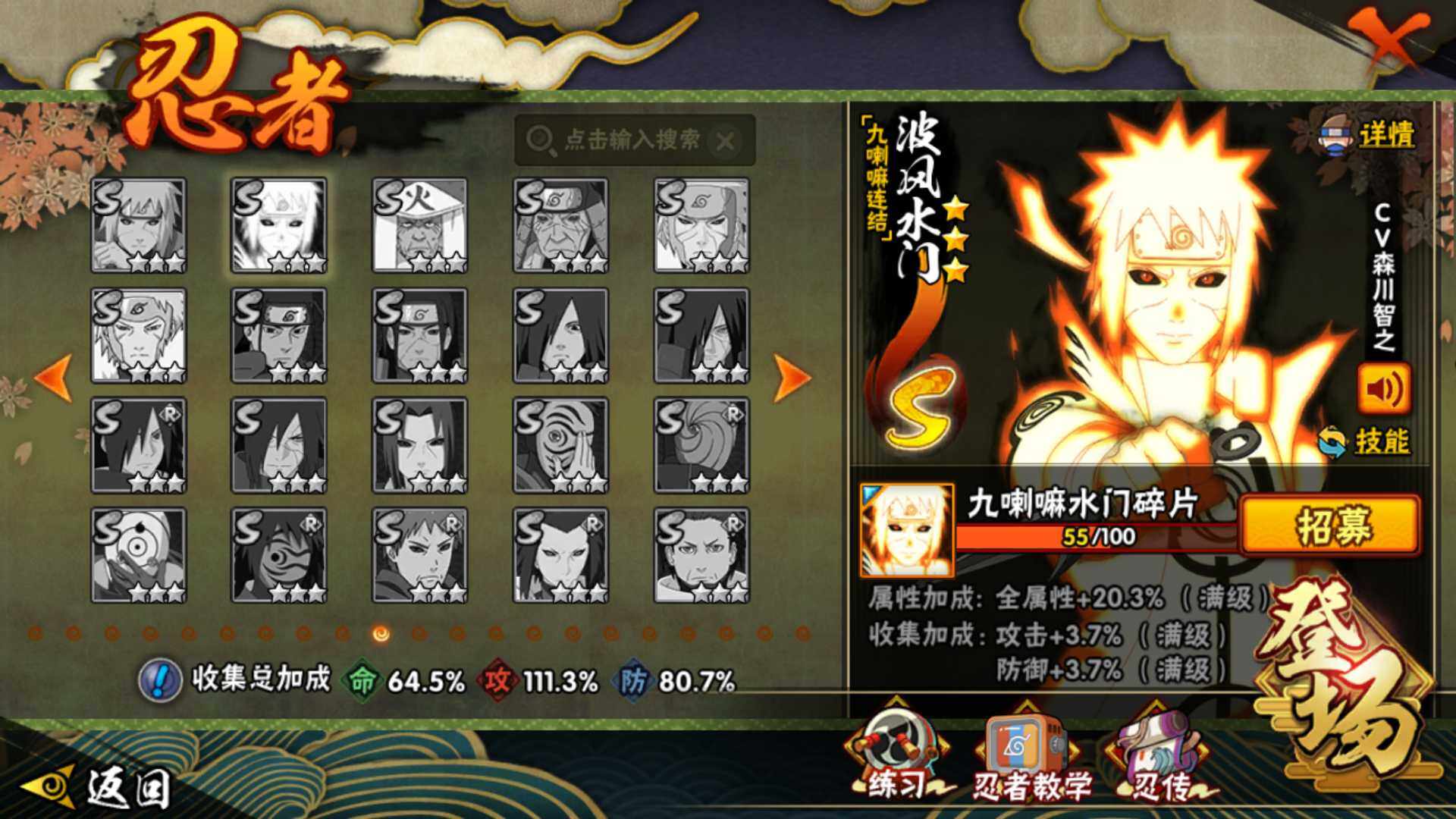 [14353014]v10 15s 39a 884万战力 九水门54片 主场景博人转 九水门55片 zp3284 【s级忍者】:春野樱「忍界大战」3星,宇智波带土「忍界大战」3星,艾「忍界大战」3星,宇智波鼬「须佐能乎」3星,宇智波止水「须佐能乎」3星,旗木卡卡西「须佐能乎」3星,千手柱间「木叶创立」3星,自来也「舞之豪杰」3星,自来也「传说中的三忍」3星,波风水门3星,漩涡鸣人「九喇嘛连结」3星,佩恩「天道」3星,宇智波佐助「永恒万花筒」3星,大筒木桃式3星,大筒木舍人「最终章」3星 【a级忍者】:长门「青年」2星,波风水门「青年」2星,波风水门「新春限定」2星,达鲁伊「博人传」2星,迪达拉「秽土转生」2星,奇拉比2星,飞段2星,飞段「死司凭血」2星,干柿鬼鲛4星,漩涡博人「桃式显现」2星,机械鸣人「初始形态」2星,迈特凯5星,旗木卡卡西「万花筒写轮眼」2星,旗木卡卡西「幻之真容」2星,桃地再不斩2星,我爱罗「疾风传」3星,蝎3星,蝎「绯流琥」3星,角都「秽土转生」2星,猿飞阿斯玛4星,猿飞阿斯玛「秽土转生」2星,宇智波鼬「夏日限定」2星,宇智波佐助「须佐能乎」2星,宇智波佐助「疾风传咒印」2星,宇智波佐助「万花筒写轮眼」2星,药师兜「半蛇斗篷」2星,日向宁次「忍界大战」2星,日向雏田「最终章」2星,长十郎「六代目水影」2星,神秘面具男「忍者之路」2星,李洛克「忍界大战」2星,黑土「博人传」2星,秋道丁次「忍界大战」2星,千代「近松十人卫」2星,神农「羁绊」2星,土台「忍界大战」2星,不缘2星,不风2星,加藤断2星,宇智波泉奈2星
