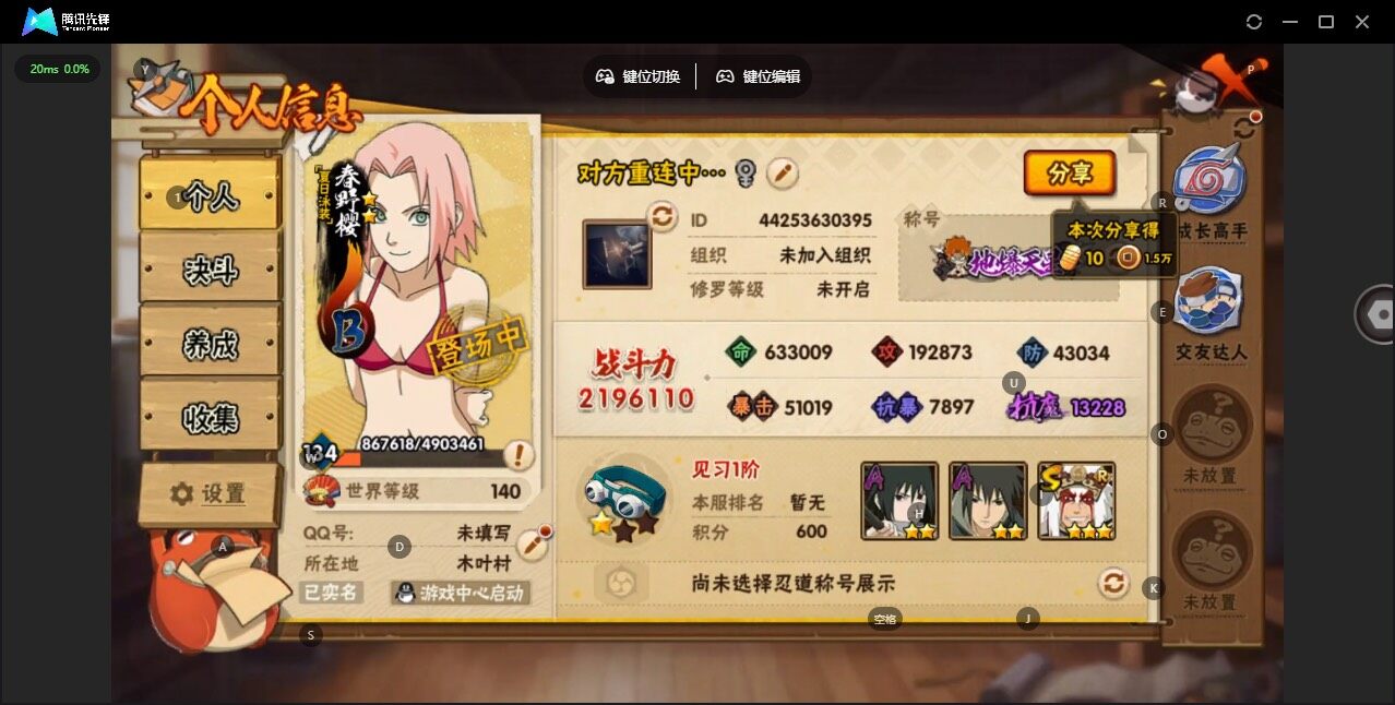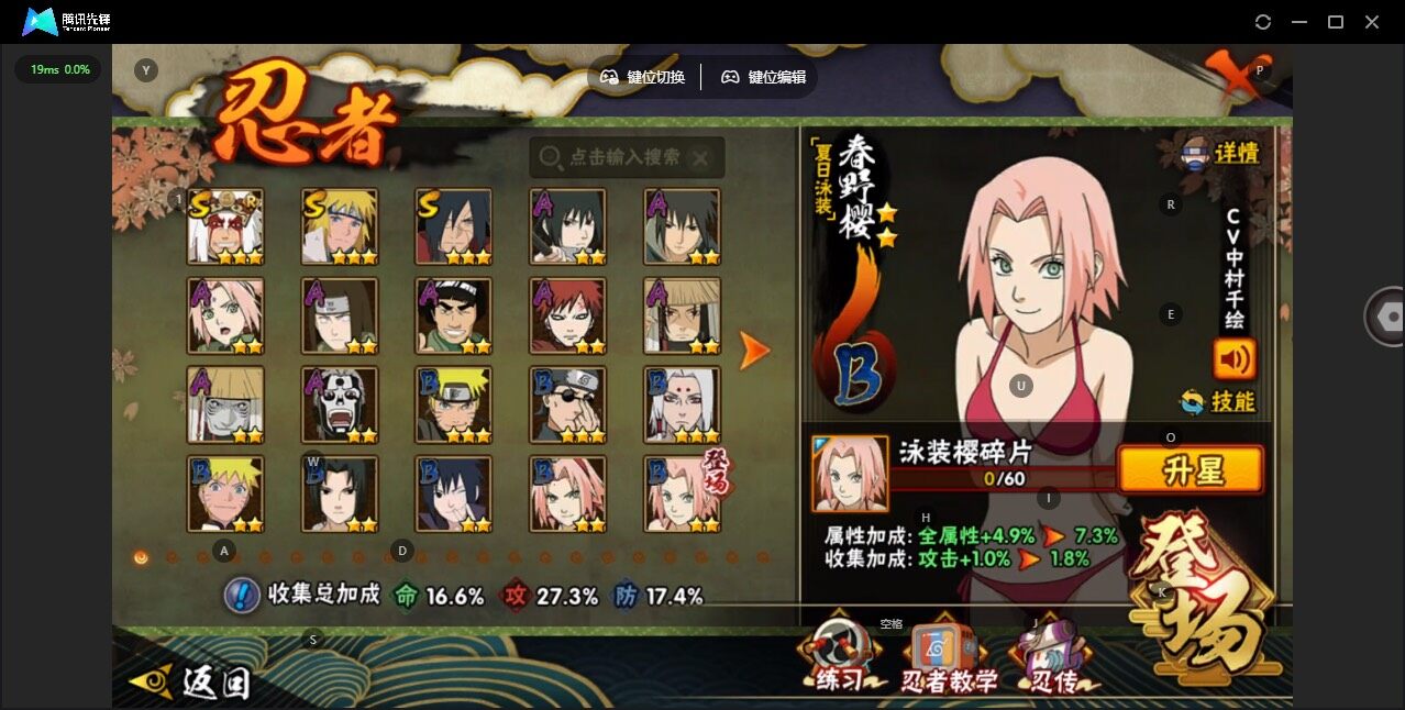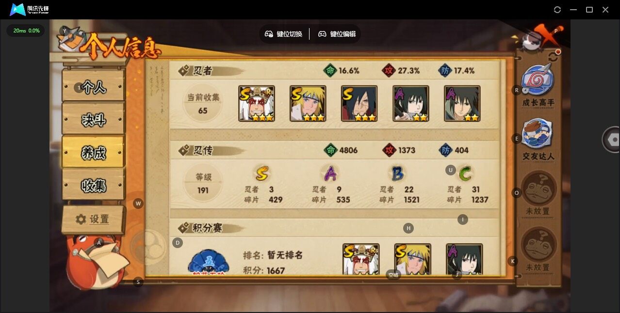 v7/战力182w/s忍3/a忍9/3星自来也「舞之豪杰」/2星春野樱「百豪」/2星宇智波泉奈/2星日向宁次「忍界大战」/2星我爱罗「疾风传」/2星飞段「死司凭血」/2星干柿鬼鲛/2星宇智波鼬/3星宇智波斑「秽土转生·解」/2星迈特凯/2星宇智波佐助「须佐能乎」/3星波风水门