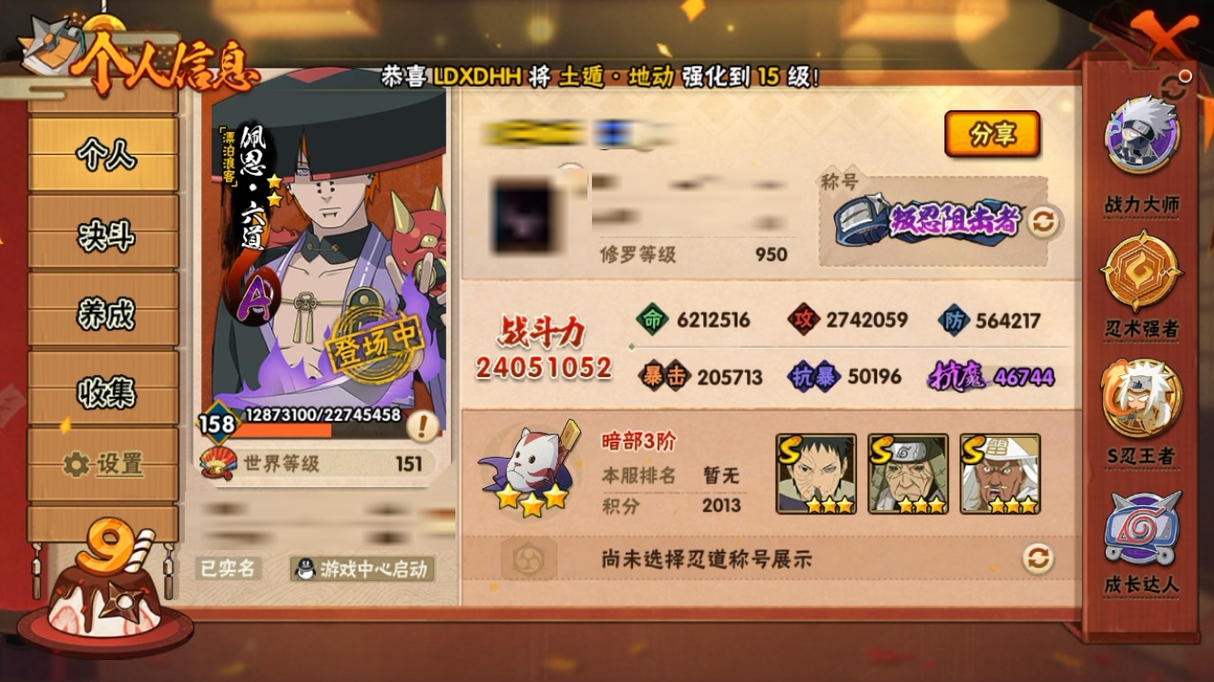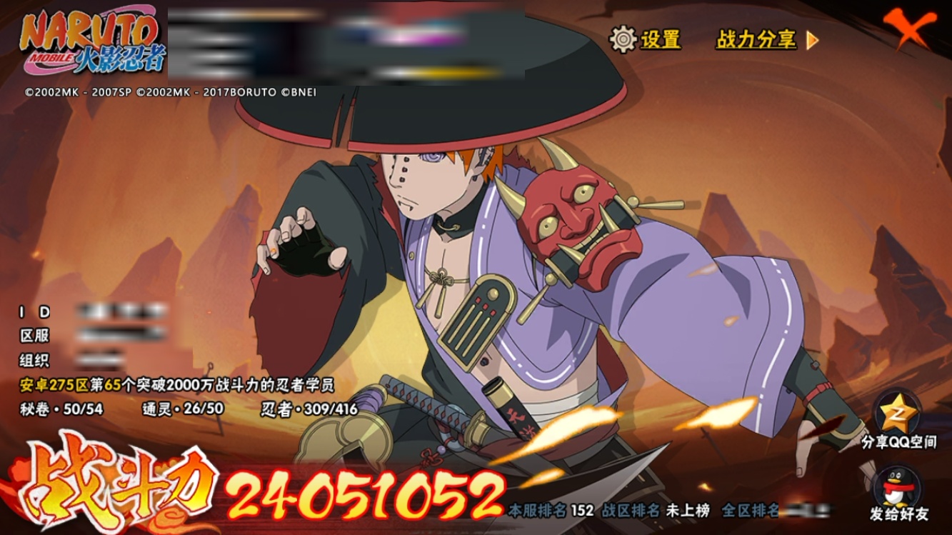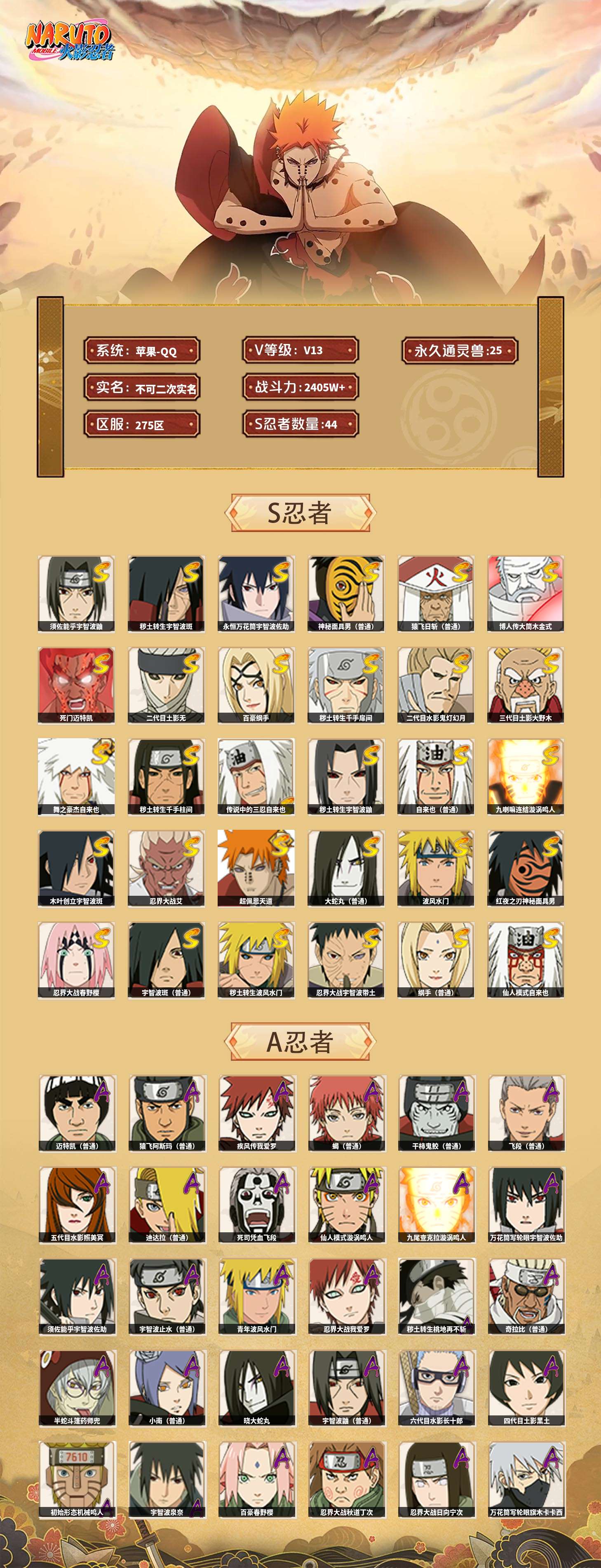 【火影忍者】【lyhy8997】战斗力:2405w;段位:暗部3阶;本服排名:152;vip:v13级;s忍:44个;a忍:54个;通灵兽:25个,s忍:须佐能乎宇智波鼬|秽土转生宇智波斑|永恒万花筒宇智波佐助|神秘面具男(普通)|猿飞日斩(普通)|博人传大筒木金式|死门迈特凯|二代目土影无|百豪纲手|秽土转生千手扉间|二代目水影鬼灯幻月|三代目土影大野木|舞之豪杰自来也|秽土转生千手柱间|传说中的三忍自来也|秽土转生宇智波鼬|自来也(普通)|九喇嘛连结漩涡鸣人|木叶创立宇智波斑|忍界大战艾|超佩恩天道|大蛇丸(普通)|波风水门|红夜之刃神秘面具男|忍界大战春野樱|宇智波斑(普通)|秽土转生波风水门|忍界大战宇智波带土|纲手(普通)|仙人模式自来也|秽土转生猿飞日斩|三代目雷影艾|四代目风影罗砂|白面具宇智波斑|天道佩恩|千手扉间(普通)|秽土转生长门|四代目雷影艾|九喇嘛连结波风水门|千手柱间(普通)|忍界大战大野木|秽土转生半藏|秽土转生金角银角|仙人模式药师兜__a忍:迈特凯(普通)|猿飞阿斯玛(普通)|疾风传我爱罗|蝎(普通)|干柿鬼鲛(普通)|飞段(普通)|五代目水影照美冥|迪达拉(普通)|死司凭血飞段|仙人模式漩涡鸣人|九尾查克拉漩涡鸣人|万花筒写轮眼宇智波佐助|须佐能乎宇智波佐助|宇智波止水(普通)|青年波风水门|忍界大战我爱罗|秽土转生桃地再不斩|奇拉比(普通)|半蛇斗篷药师兜|小南(普通)|晓大蛇丸|宇智波鼬(普通)|六代目水影长十郎|四代目土影黑土|初始形态机械鸣人|宇智波泉奈|百豪春野樱|忍界大战秋道丁次|忍界大战日向宁次|万花筒写轮眼旗木卡卡西|秽土转生猿飞阿斯玛|志村团藏|火影继承人猿飞日斩|近松十人卫千代|夏日泳装照美冥|忍界大战奇拉比|青年艾|达鲁伊(普通)|忍界大战土台|不风|不缘|青年长门|漂泊浪客佩恩六道|角都(普通)|晓创生角都|地怨虞角都|新春限定宇智波鼬|夏日限定宇智波鼬|秽土转生迪达拉|加藤断|侠隐江湖大野木|木叶上忍猿飞木叶丸|桃式显现漩涡博人|五代目雷影达鲁伊__通灵兽:忍犬(普通)|蓝蛇|蛤蟆吉|忍龟|镰鼬|猿魔|山椒鱼|蜃|蛤蟆仙人|鲛鲨|蛤蟆健|蛞蝓(普通)|乌鸦(普通)|蛤蟆龙|蛤蟆广|梦貘|怒鬼(普通)|熊猫|蜘蛛|砂之守鹤|怒鬼无臂|怒鬼爪|万蛇|六尾犀犬|螃蟹