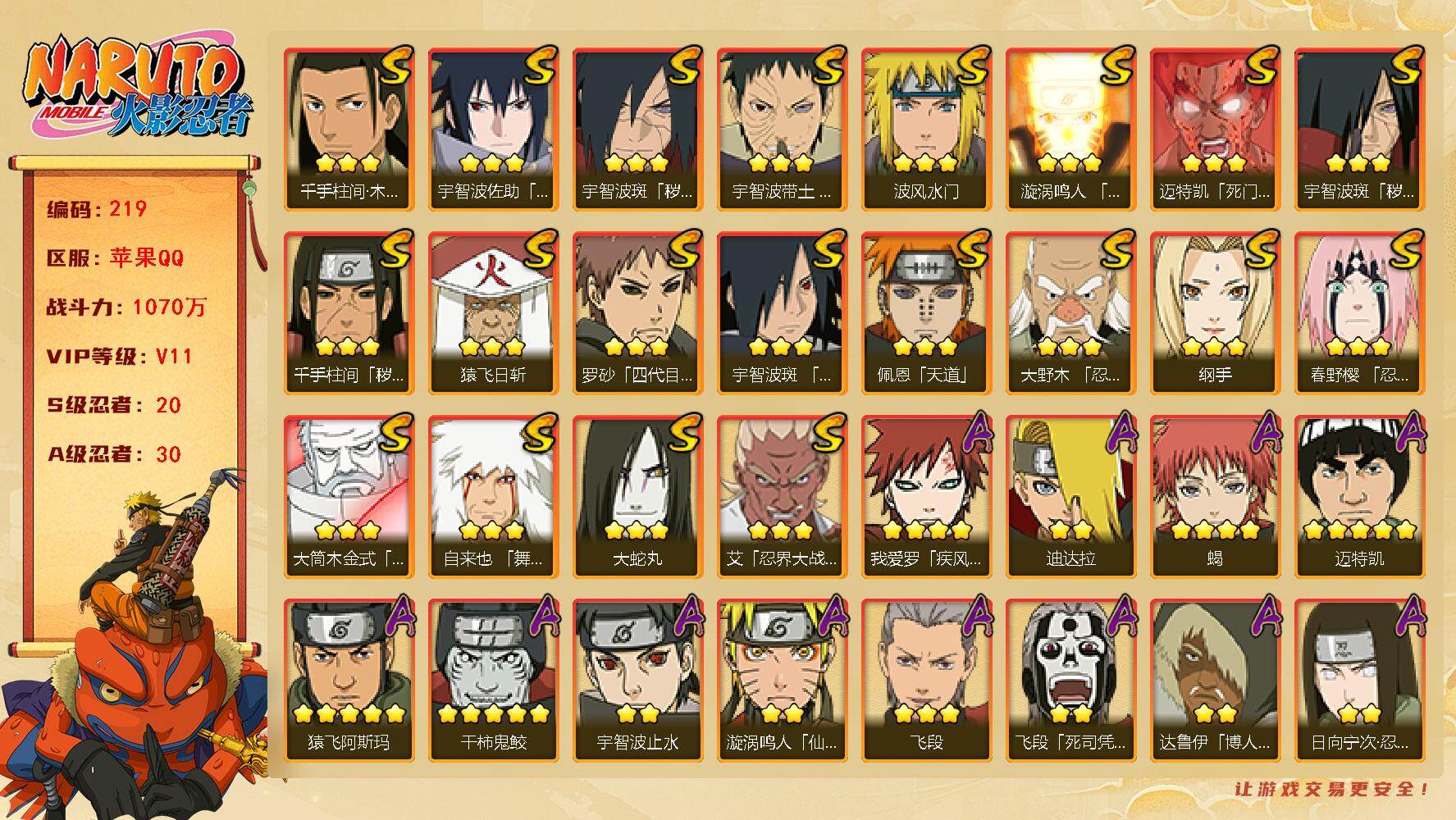 [14364500]v11 1070w战力 20s忍 30a忍战力1074万 有熊猫 自来也56片 秽土鼬60片 止水80片 天道超81片 桃式80片 ll3944 【s级忍者】:千手柱间「秽土转生」3星,宇智波斑「秽土转生」3星,宇智波斑「秽土转生·解」3星,大野木「忍界大战」3星,春野樱「忍界大战」3星,宇智波带土「忍界大战」3星,艾「忍界大战」3星,宇智波斑「木叶创立」3星,千手柱间「木叶创立」3星,罗砂「四代目风影」3星,自来也「舞之豪杰」3星,大蛇丸3星,纲手3星,猿飞日斩3星,波风水门3星,漩涡鸣人「九喇嘛连结」3星,迈特凯「死门」3星,佩恩「天道」3星,宇智波佐助「永恒万花筒」3星,大筒木金式3星 【a级忍者】:艾「青年」2星,长门「青年」2星,波风水门「青年」2星,达鲁伊「博人传」2星,迪达拉2星,奇拉比「忍界大战」2星,飞段3星,飞段「死司凭血」2星,干柿鬼鲛5星,漩涡博人「桃式显现」2星,漩涡鸣人「仙人模式」2星,漩涡鸣人「九尾查克拉」2星,迈特凯5星,我爱罗「疾风传」4星,我爱罗「忍界大战」2星,蝎4星,猿飞阿斯玛5星,宇智波止水2星,宇智波鼬2星,宇智波佐助「须佐能乎」2星,宇智波佐助「万花筒写轮眼」2星,照美冥「五代目水影」2星,日向宁次「忍界大战」2星,日向雏田「最终章」2星,长十郎「六代目水影」2星,黑土「博人传」2星,千手扉间「漂泊武士」2星,秋道丁次「忍界大战」2星,千代「近松十人卫」2星,不缘2星