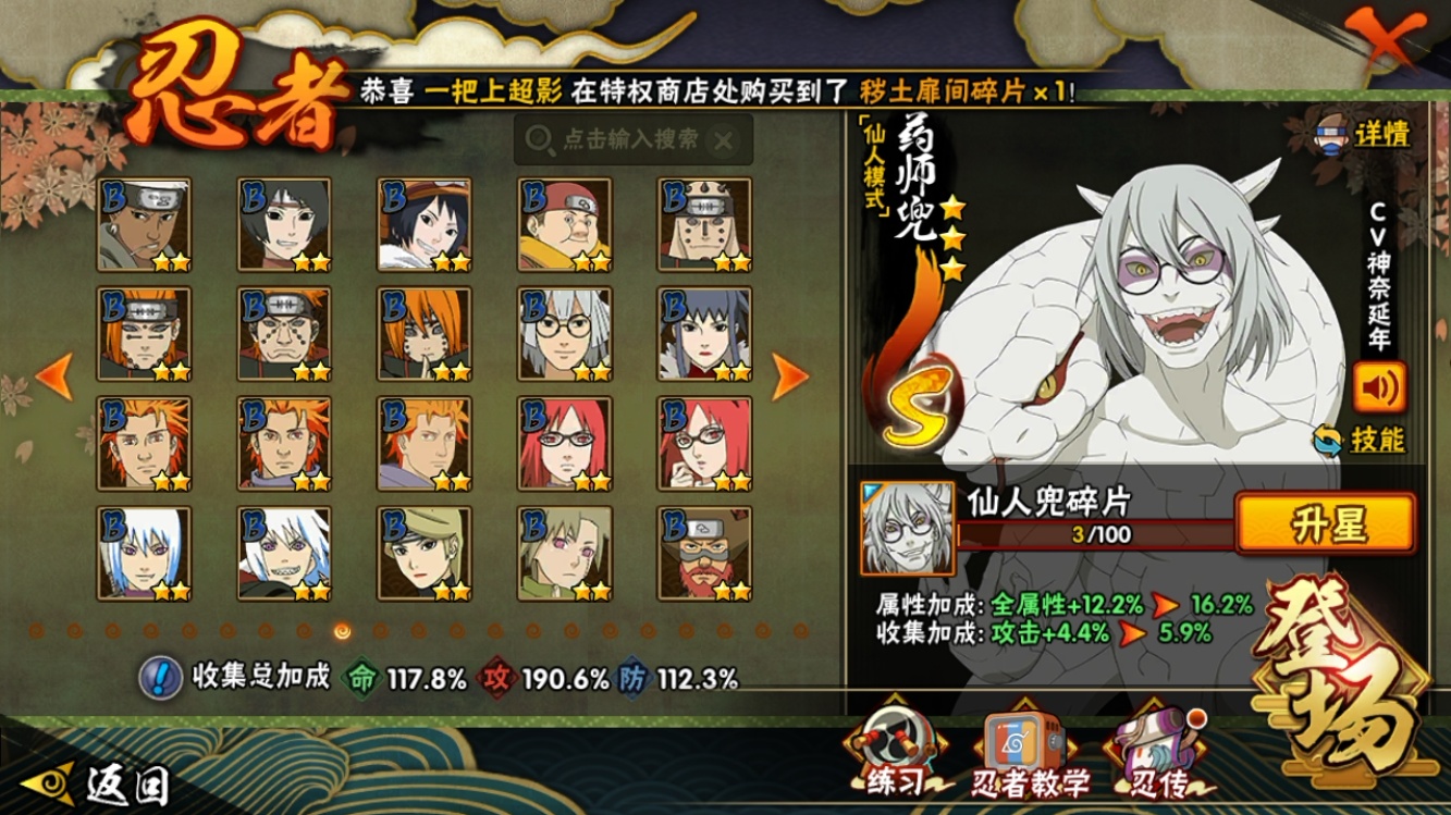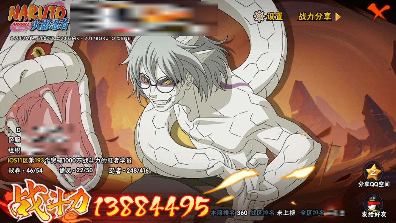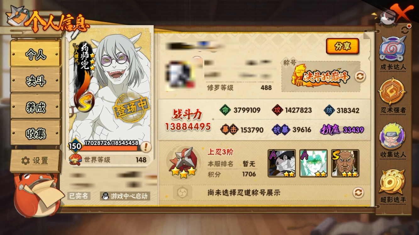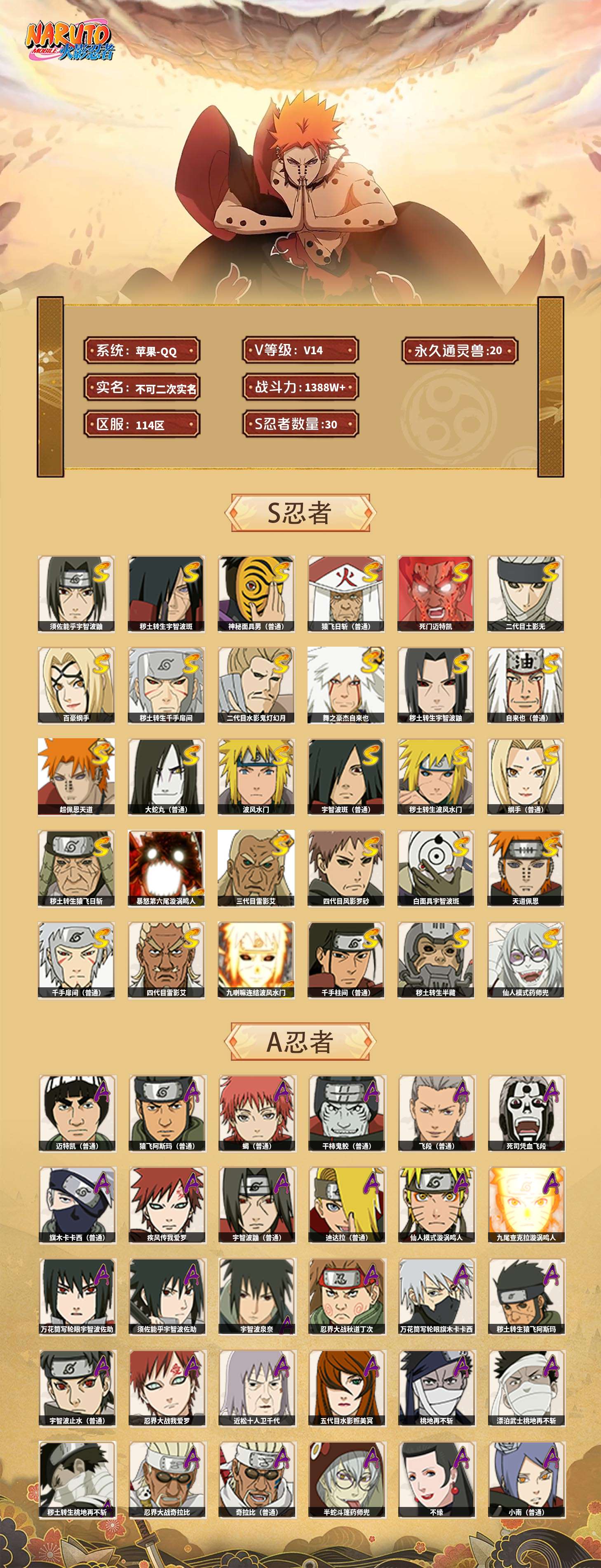 【火影忍者】【lyhy8995】战斗力:1388w;段位:上忍3阶;本服排名:360;vip:v14级;s忍:30个;a忍:42个;通灵兽:20个,s忍:须佐能乎宇智波鼬|秽土转生宇智波斑|神秘面具男(普通)|猿飞日斩(普通)|死门迈特凯|二代目土影无|百豪纲手|秽土转生千手扉间|二代目水影鬼灯幻月|舞之豪杰自来也|秽土转生宇智波鼬|自来也(普通)|超佩恩天道|大蛇丸(普通)|波风水门|宇智波斑(普通)|秽土转生波风水门|纲手(普通)|秽土转生猿飞日斩|暴怒第六尾漩涡鸣人|三代目雷影艾|四代目风影罗砂|白面具宇智波斑|天道佩恩|千手扉间(普通)|四代目雷影艾|九喇嘛连结波风水门|千手柱间(普通)|秽土转生半藏|仙人模式药师兜__a忍:迈特凯(普通)|猿飞阿斯玛(普通)|蝎(普通)|干柿鬼鲛(普通)|飞段(普通)|死司凭血飞段|旗木卡卡西(普通)|疾风传我爱罗|宇智波鼬(普通)|迪达拉(普通)|仙人模式漩涡鸣人|九尾查克拉漩涡鸣人|万花筒写轮眼宇智波佐助|须佐能乎宇智波佐助|宇智波泉奈|忍界大战秋道丁次|万花筒写轮眼旗木卡卡西|秽土转生猿飞阿斯玛|宇智波止水(普通)|忍界大战我爱罗|近松十人卫千代|五代目水影照美冥|桃地再不斩|漂泊武士桃地再不斩|秽土转生桃地再不斩|忍界大战奇拉比|奇拉比(普通)|半蛇斗篷药师兜|不缘|小南(普通)|绝|角都(普通)|地怨虞角都|晓大蛇丸|百机操演蝎|秽土转生迪达拉|阿飞|侠隐江湖大野木|羁绊神农|木叶上忍猿飞木叶丸|仙人模式巳月|四代目土影黑土__通灵兽:忍犬(普通)|蓝蛇|蛤蟆吉|忍龟|镰鼬|猿魔|蛞蝓(普通)|山椒鱼|蜃|蛤蟆仙人|鲛鲨|螃蟹|蛤蟆健|乌鸦(普通)|蛤蟆龙|蛤蟆广|梦貘|熊猫|砂之守鹤|蜘蛛