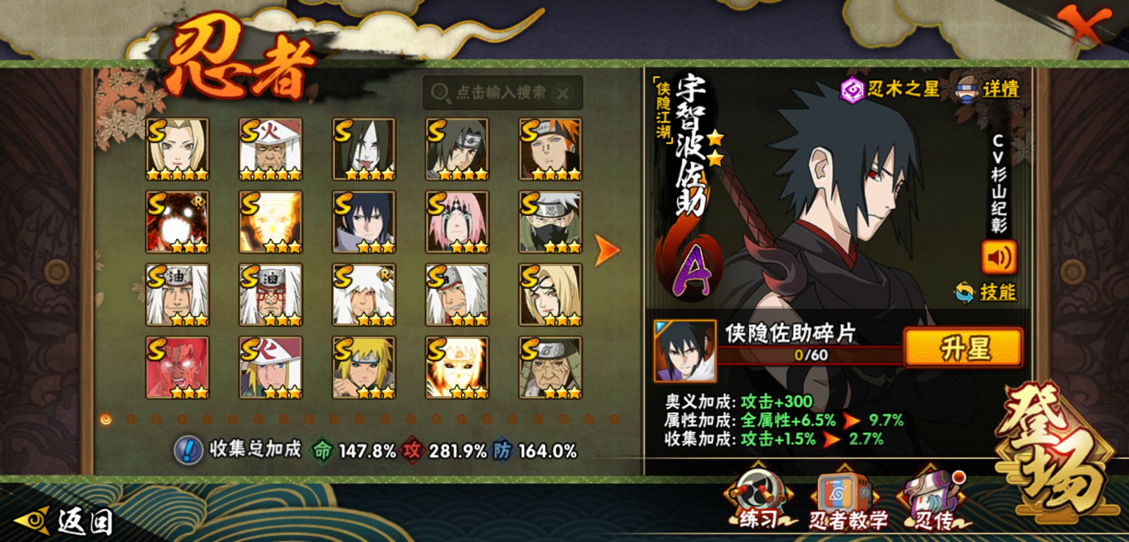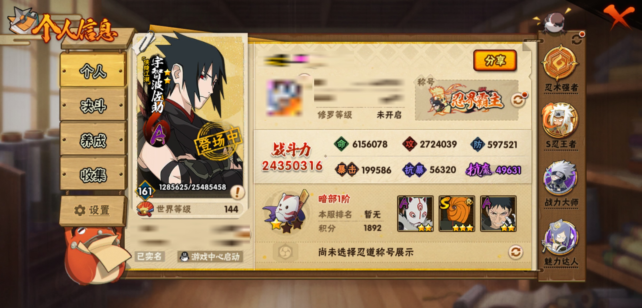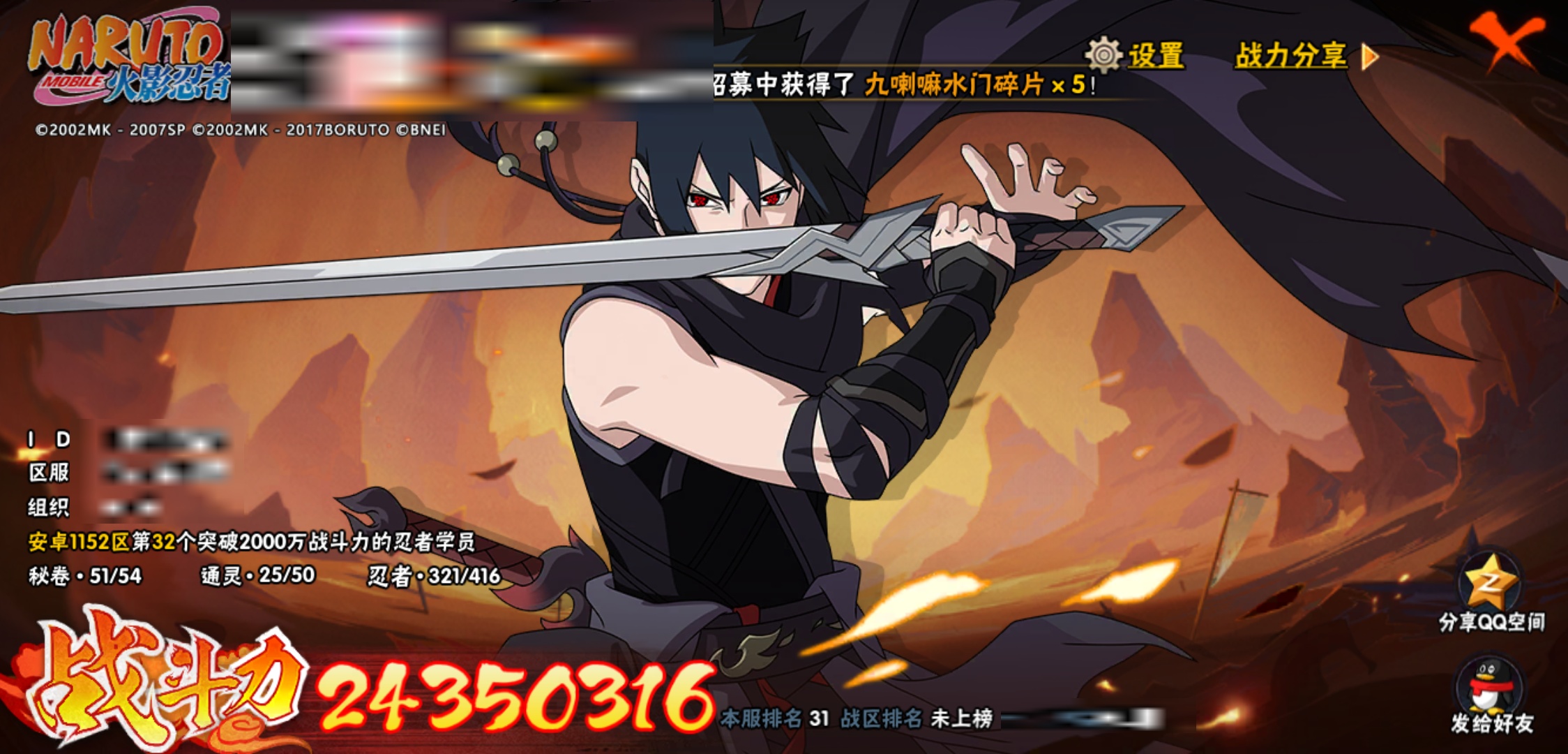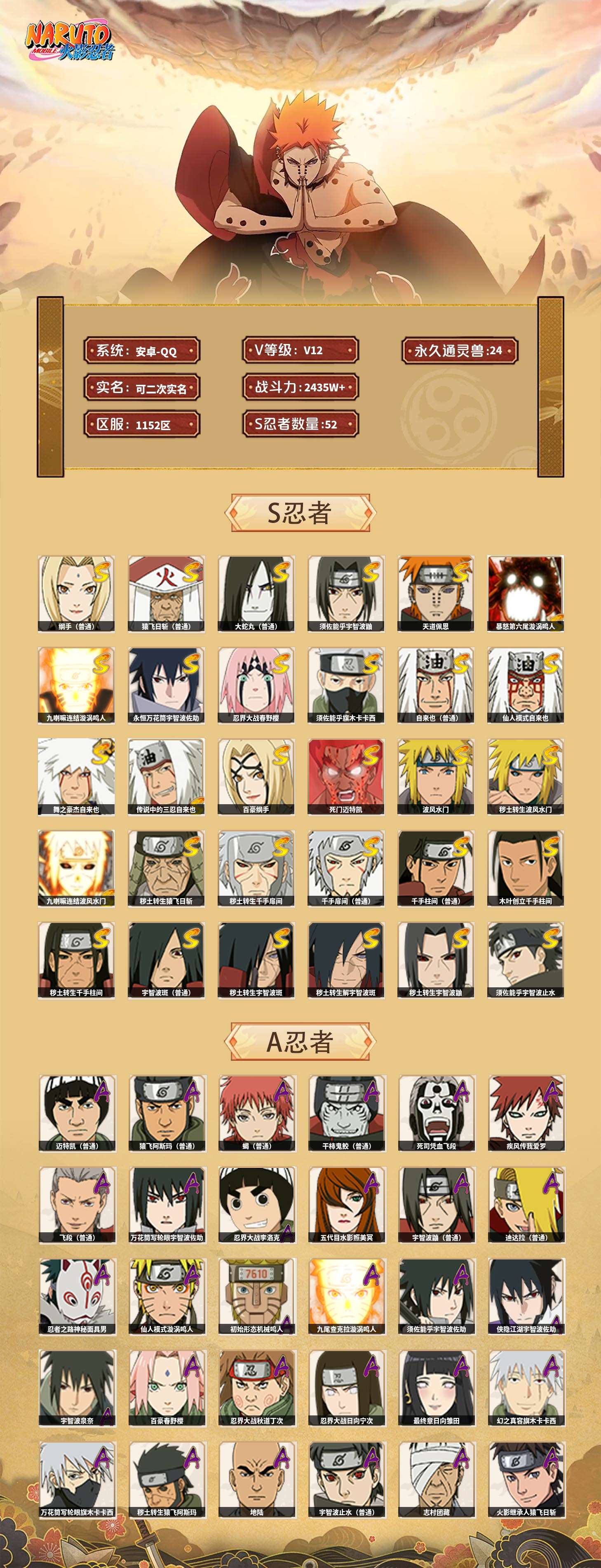 【火影忍者】【lyhy9020】战斗力:2435w;段位:暗部1阶;本服排名:31;vip:v12级;s忍:52个;a忍:65个;通灵兽:24个,s忍:纲手(普通) 5星|猿飞日斩(普通) 5星|大蛇丸(普通) 4星|须佐能乎宇智波鼬 4星|天道佩恩 4星|暴怒第六尾漩涡鸣人|九喇嘛连结漩涡鸣人|永恒万花筒宇智波佐助|忍界大战春野樱|须佐能乎旗木卡卡西|自来也(普通)|仙人模式自来也|舞之豪杰自来也|传说中的三忍自来也|百豪纲手|死门迈特凯|波风水门|秽土转生波风水门|九喇嘛连结波风水门|秽土转生猿飞日斩|秽土转生千手扉间|千手扉间(普通)|千手柱间(普通)|木叶创立千手柱间|秽土转生千手柱间|宇智波斑(普通)|秽土转生宇智波斑|秽土转生解宇智波斑|秽土转生宇智波鼬|须佐能乎宇智波止水|神秘面具男(普通)|五影会谈宇智波斑|白面具宇智波斑|忍界大战宇智波带土|红夜之刃神秘面具男|四代目风影罗砂|初代目风影烈斗|二代目水影鬼灯幻月|四代目雷影艾|忍界大战艾|三代目雷影艾|秽土转生金角银角|三代目土影大野木|忍界大战大野木|秽土转生半藏|二代目土影无|超佩恩天道|秽土转生长门|仙人模式药师兜|最终章大筒木舍人|大筒木桃式|博人传大筒木金式__a忍:迈特凯(普通) 5星|猿飞阿斯玛(普通) 5星|蝎(普通) 5星|干柿鬼鲛(普通) 5星|死司凭血飞段 5星|疾风传我爱罗 4星|飞段(普通) 4星|万花筒写轮眼宇智波佐助 3星|忍界大战李洛克 3星|五代目水影照美冥 3星|宇智波鼬(普通) 3星|迪达拉(普通) 3星|忍者之路神秘面具男|仙人模式漩涡鸣人|初始形态机械鸣人|九尾查克拉漩涡鸣人|须佐能乎宇智波佐助|侠隐江湖宇智波佐助|宇智波泉奈|百豪春野樱|忍界大战秋道丁次|忍界大战日向宁次|最终章日向雏田|幻之真容旗木卡卡西|万花筒写轮眼旗木卡卡西|秽土转生猿飞阿斯玛|地陆|宇智波止水(普通)|志村团藏|火影继承人猿飞日斩|新春限定波风水门|青年波风水门|忍界大战我爱罗|忍界大战勘九郎|近松十人卫千代|秽土转生桃地再不斩|桃地再不斩|奇拉比(普通)|忍界大战奇拉比|青年艾|忍界大战土台|半蛇斗篷药师兜|不风|不缘|不动|青年长门|小南(普通)|晓创生角都|角都(普通)|地怨虞角都|秽土转生角都|晓大蛇丸|绯流琥蝎|新春限定宇智波鼬|夏日限定宇智波鼬|秽土转生迪达拉|漂泊浪客宇智波带土|加藤断|侠隐江湖大野木|羁绊神农|木叶上忍猿飞木叶丸|六代目水影长十郎|五代目雷影达鲁伊|桃式显现漩涡博人|四代目土影黑土__通灵兽:忍犬(普通)|蓝蛇|蛤蟆吉|忍龟|镰鼬|猿魔|山椒鱼|蜃|蛤蟆仙人|鲛鲨|蛤蟆健|乌鸦(普通)|蛞蝓(普通)|蛤蟆龙|蛤蟆广|砂之守鹤|梦貘|鹰|蜘蛛|熊猫|怒鬼爪|怒鬼无臂|辛牙|怒鬼(普通)