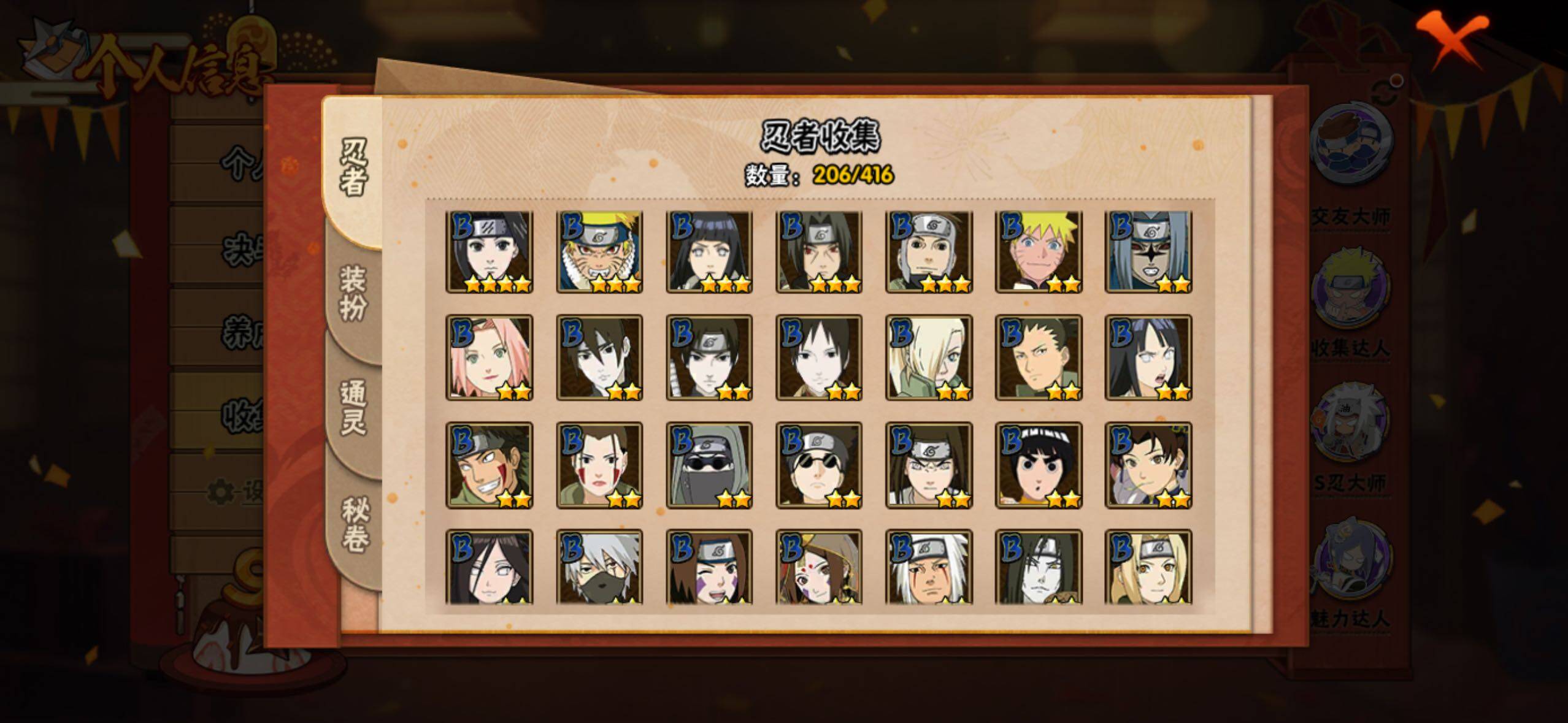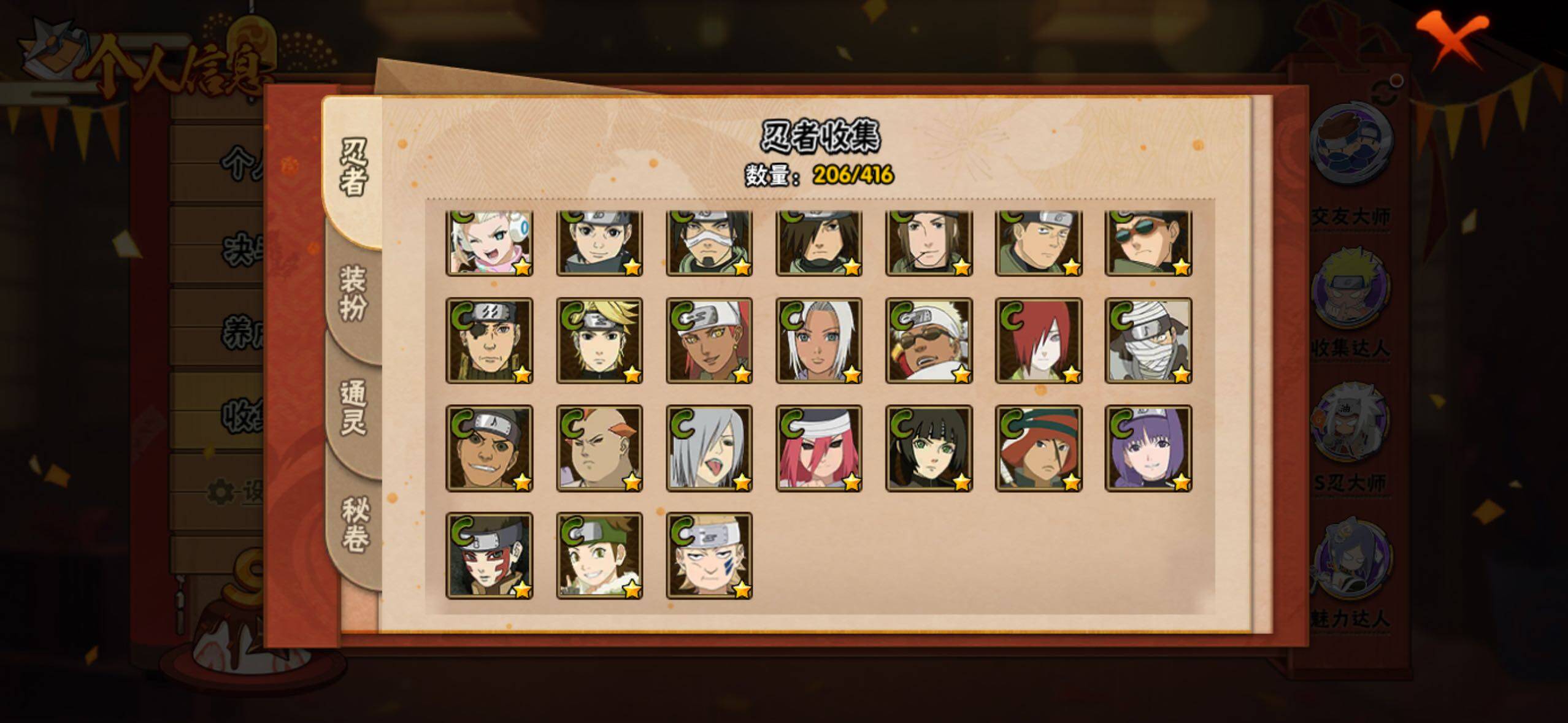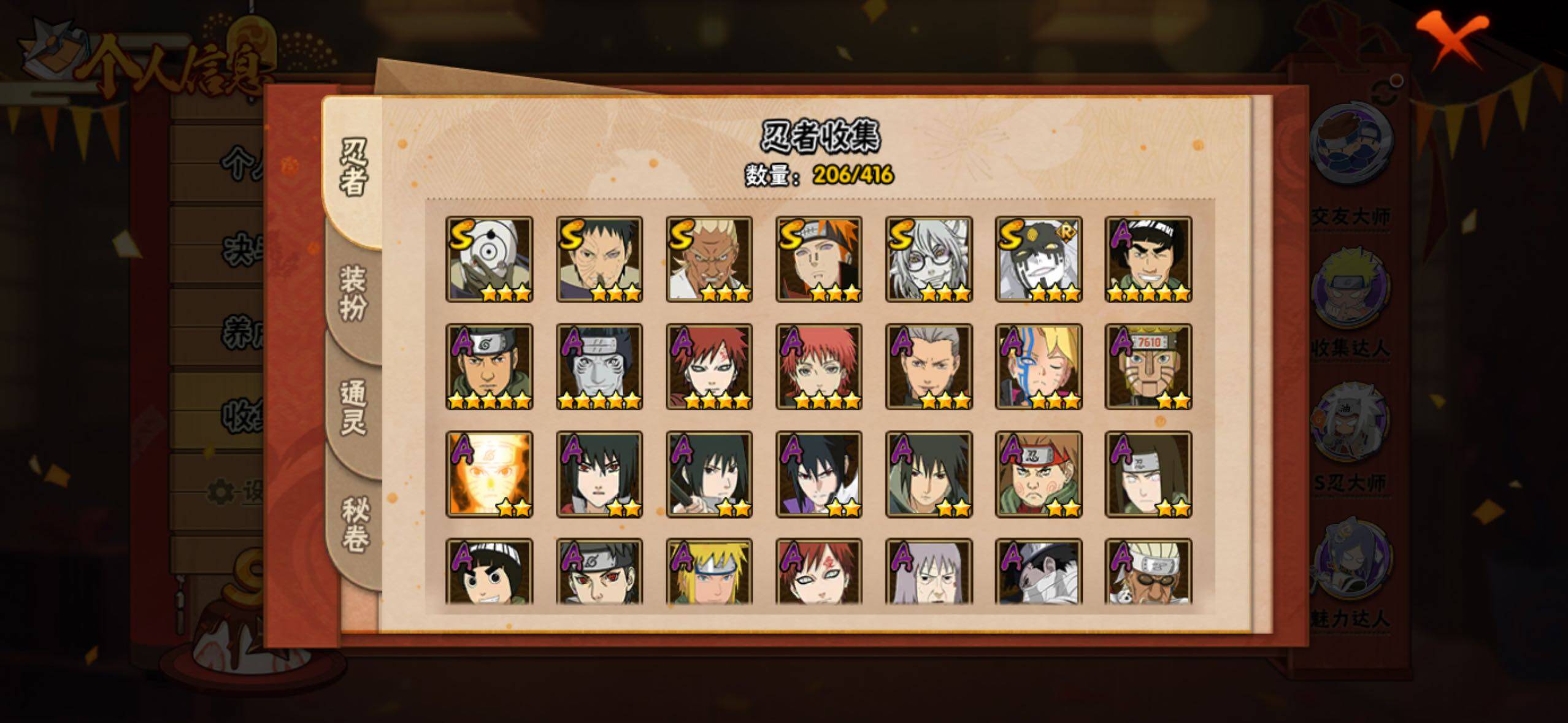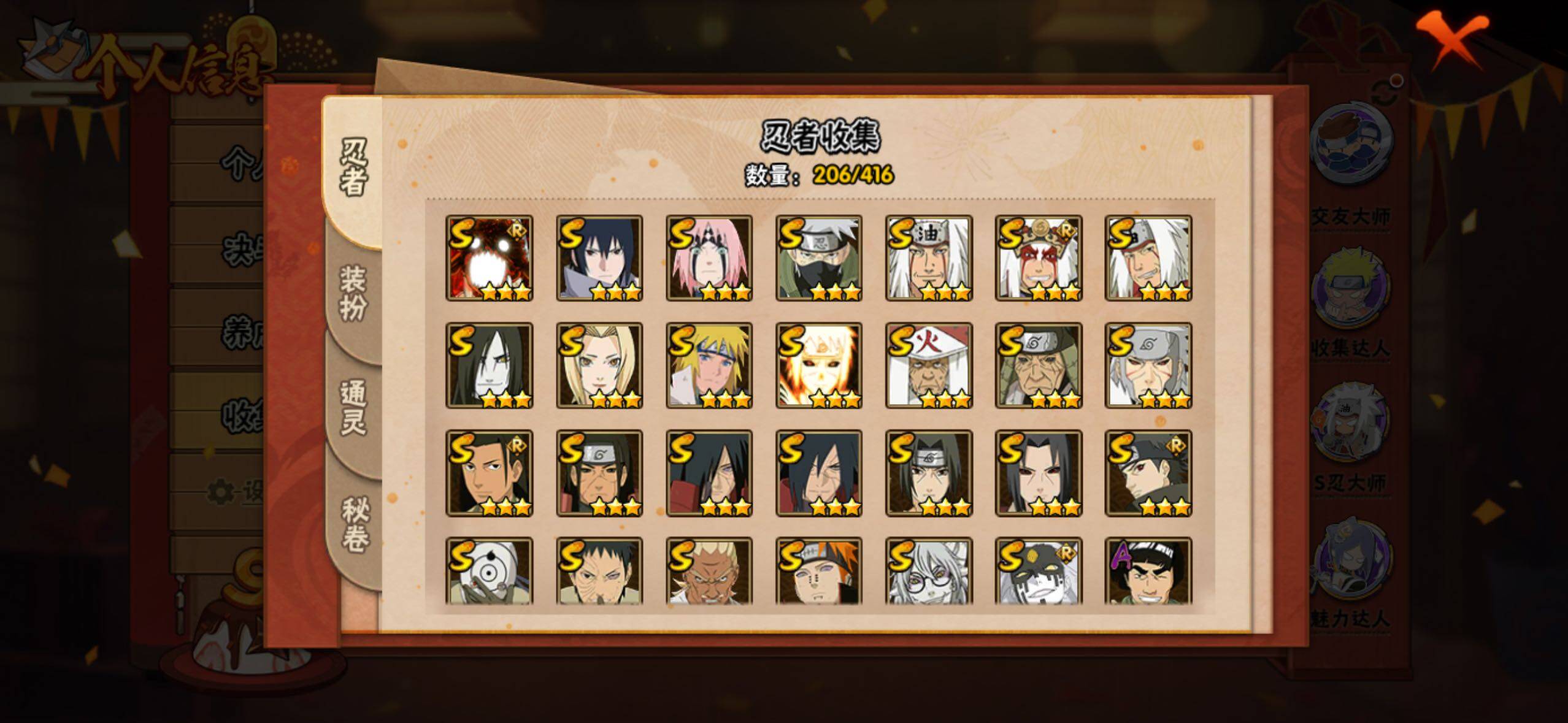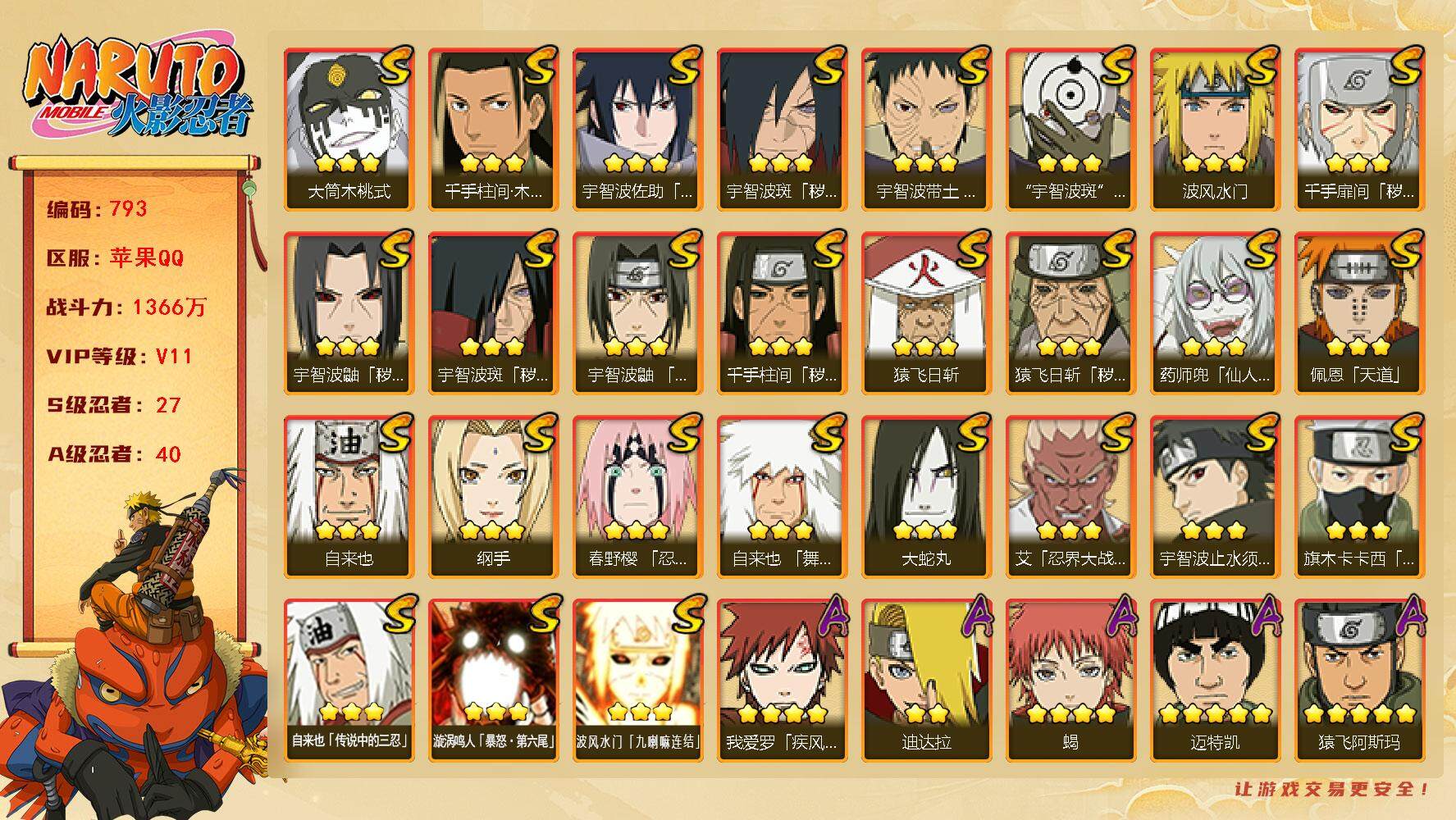 [14371385]v11 27s 40a 1366w战力 死门凯53片 罗砂72片 三代目雷影65片 最终章舍人93片 两个主场景:博人传 木叶周年庆 3307金币 yy1563 【s级忍者】:猿飞日斩「秽土转生」3星,千手扉间「秽土转生」3星,千手柱间「秽土转生」3星,宇智波鼬「秽土转生」3星,宇智波斑「秽土转生」3星,宇智波斑「秽土转生·解」3星,春野樱「忍界大战」3星,宇智波带土「忍界大战」3星,艾「忍界大战」3星,宇智波鼬「须佐能乎」3星,宇智波止水「须佐能乎」3星,旗木卡卡西「须佐能乎」3星,千手柱间「木叶创立」3星,自来也3星,自来也「舞之豪杰」3星,大蛇丸3星,自来也「传说中的三忍」3星,纲手3星,猿飞日斩3星,波风水门3星,药师兜「仙人模式」3星,佩恩「天道」3星,宇智波佐助「永恒万花筒」3星,宇智波斑 「白面具」3星宇智波斑「白面具」,大筒木桃式3星,漩涡鸣人「暴怒·第六尾」3星,波风水门「九喇嘛连结」3星 【a级忍者】:波风水门「青年」2星,达鲁伊「博人传」2星,迪达拉2星,迪达拉「秽土转生」2星,大蛇丸「晓」2星,奇拉比「忍界大战」2星,飞段3星,飞段「死司凭血」2星,干柿鬼鲛5星,漩涡博人「桃式显现」3星,漩涡鸣人「九尾查克拉」2星,机械鸣人「初始形态」2星,迈特凯5星,桃地再不斩「秽土转生」2星,我爱罗「疾风传」4星,我爱罗「忍界大战」2星,蝎4星,蝎「绯流琥」2星,小南2星,角都「地怨虞」2星,角都「秽土转生」2星,猿飞阿斯玛5星,宇智波止水2星,宇智波鼬2星,宇智波鼬「新春限定」2星,宇智波佐助「须佐能乎」2星,宇智波佐助「万花筒写轮眼」2星,宇智波佐助「侠隐江湖」2星,药师兜「半蛇斗篷」2星,日向宁次「忍界大战」2星,长十郎「六代目水影」2星,卑留呼「火之意志继承者」2星,李洛克「忍界大战」2星,黑土「博人传」2星,秋道丁次「忍界大战」2星,千代「近松十人卫」2星,神农「羁绊」2星,土台「忍界大战」2星,不缘2星,宇智波泉奈2星